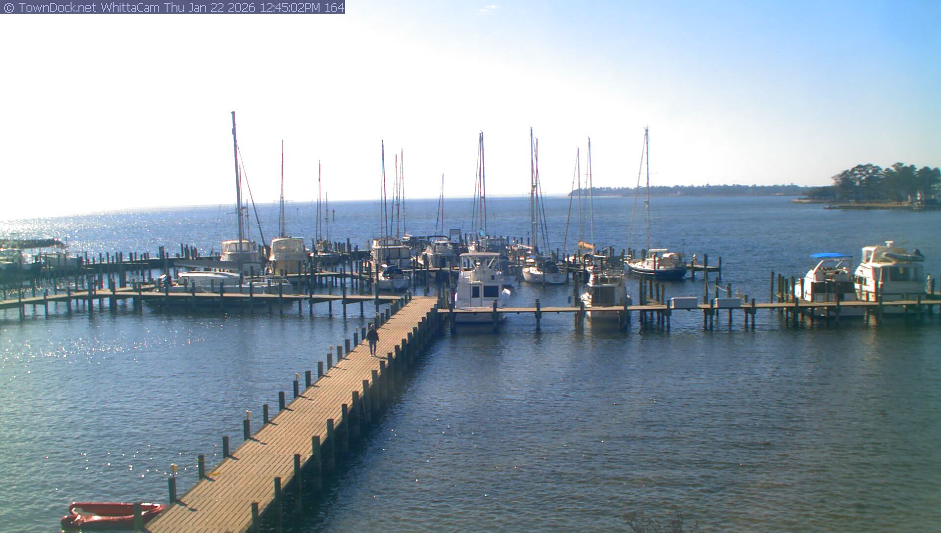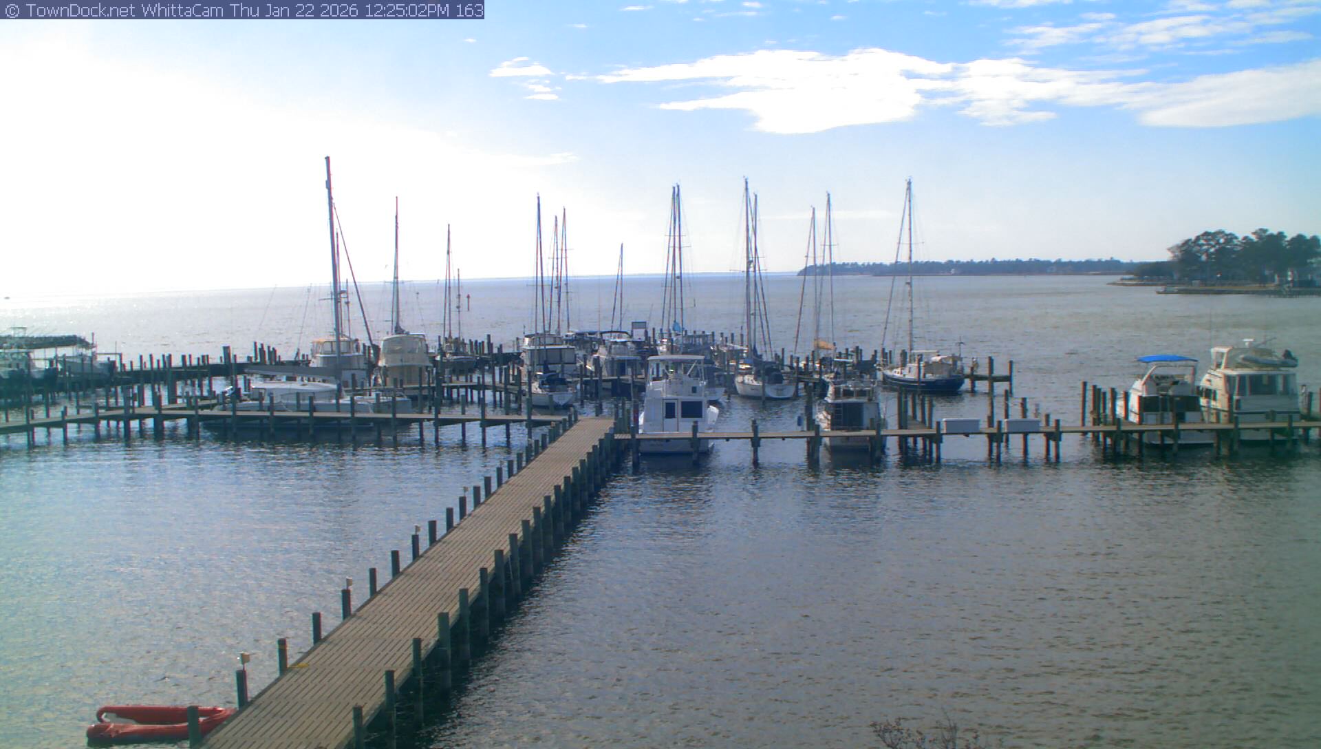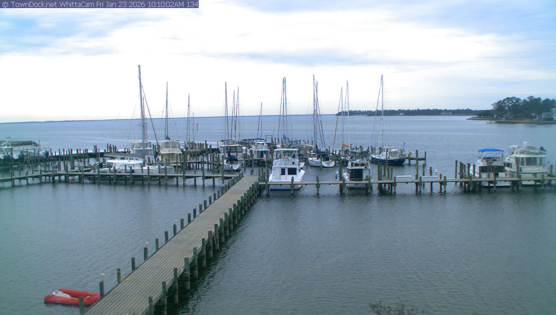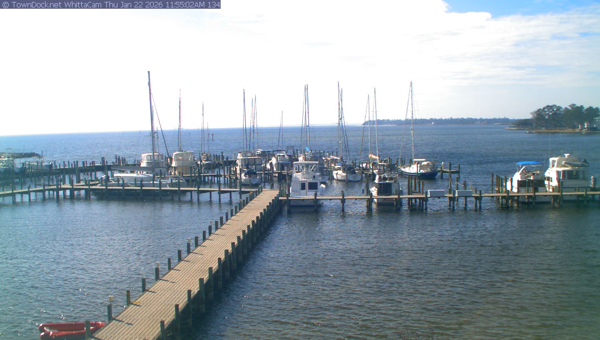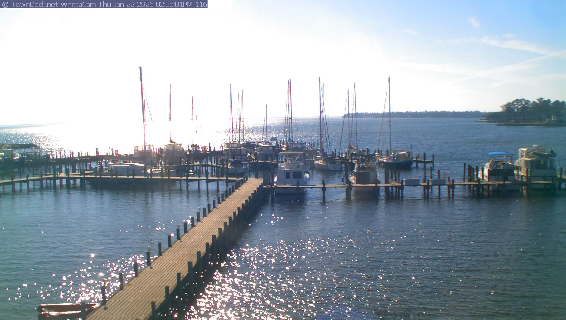 shows Whittaker Pointe Marina and the Whittaker Creek Channel entrance, with the Neuse River in the background. WhittaCam takes a new picture every five minutes from dawn til just before dusk. Click on the image to see a larger version. Once you see that larger version, you can click (see arrow at right) to go back in time and see recent photos. Harbor Cam currently takes photos from 6:00am to 5:00pm.