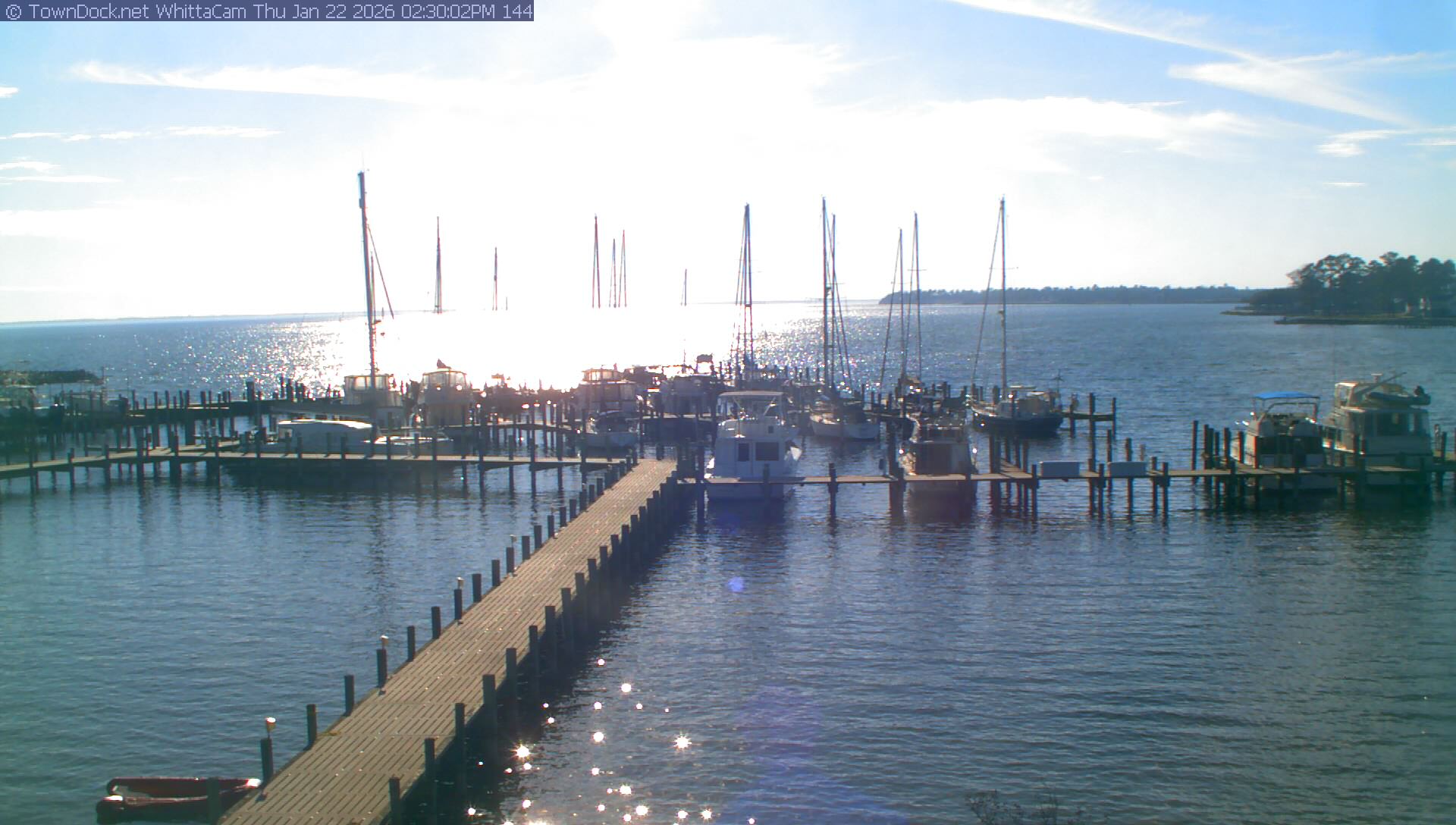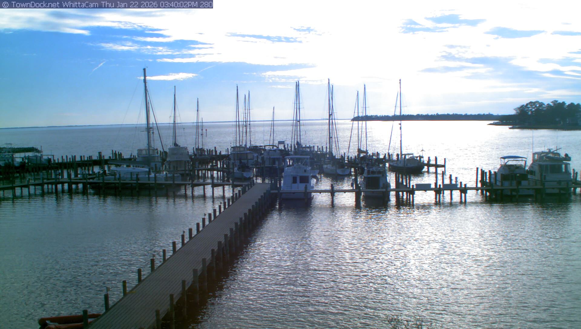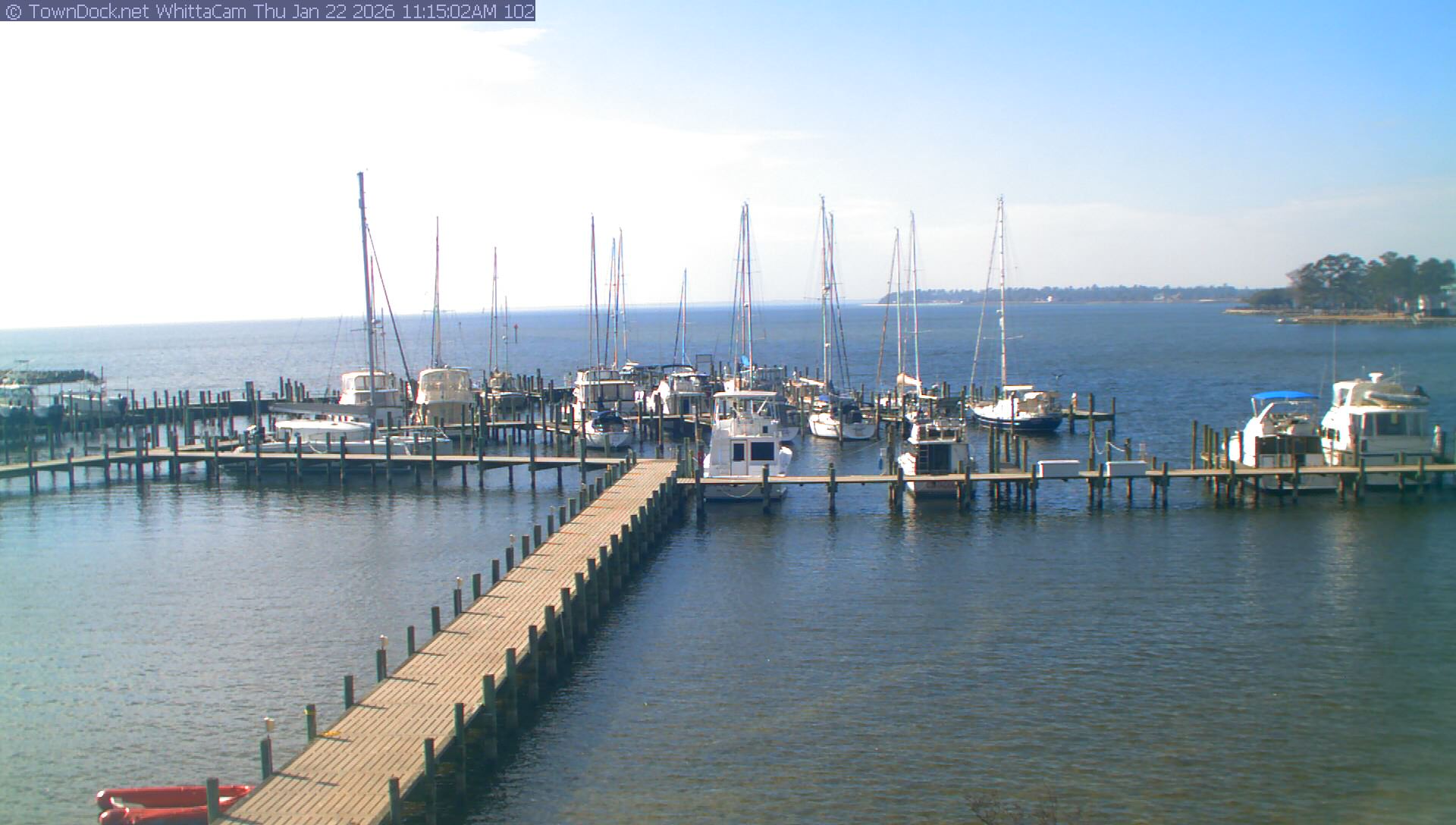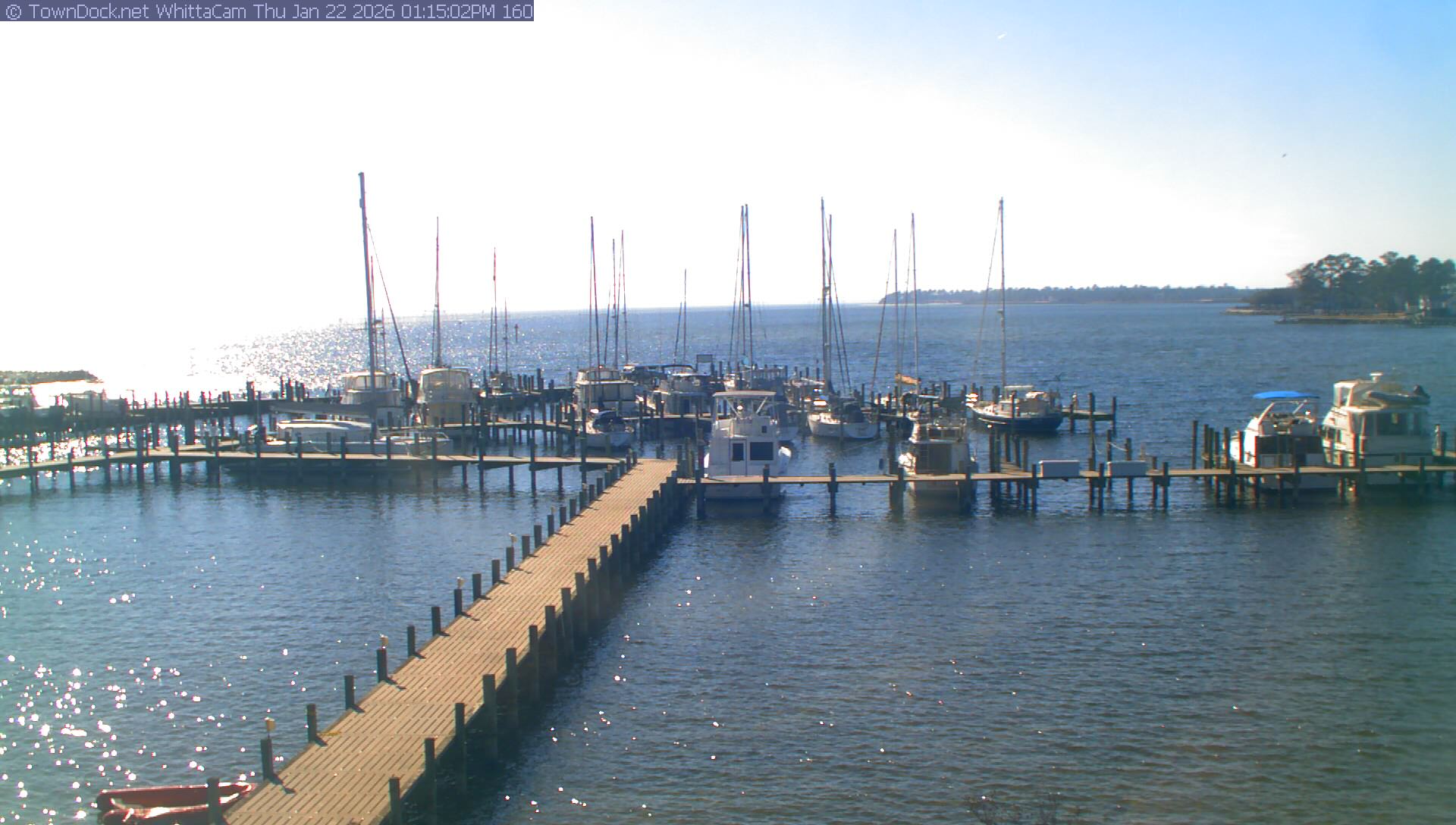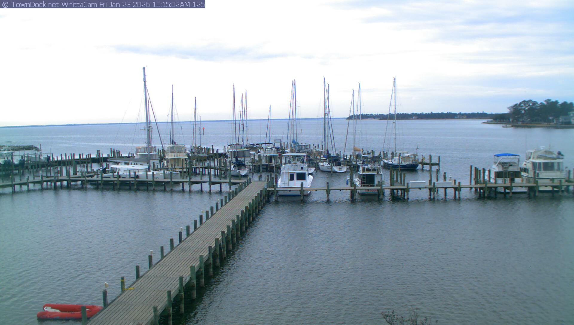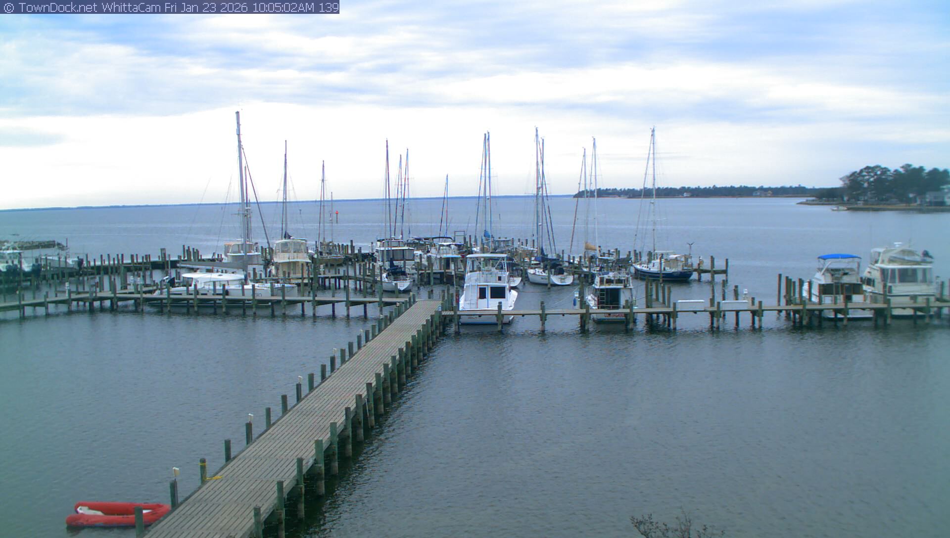 shows Whittaker Pointe Marina and the Whittaker Creek Channel entrance, with the Neuse River in the background. WhittaCam takes a new picture every five minutes from dawn til just before dusk. Click on the image to see a larger version. Once you see that larger version, you can click (see arrow at right) to go back in time and see recent photos. Harbor Cam currently takes photos from 6:00am to 5:00pm.