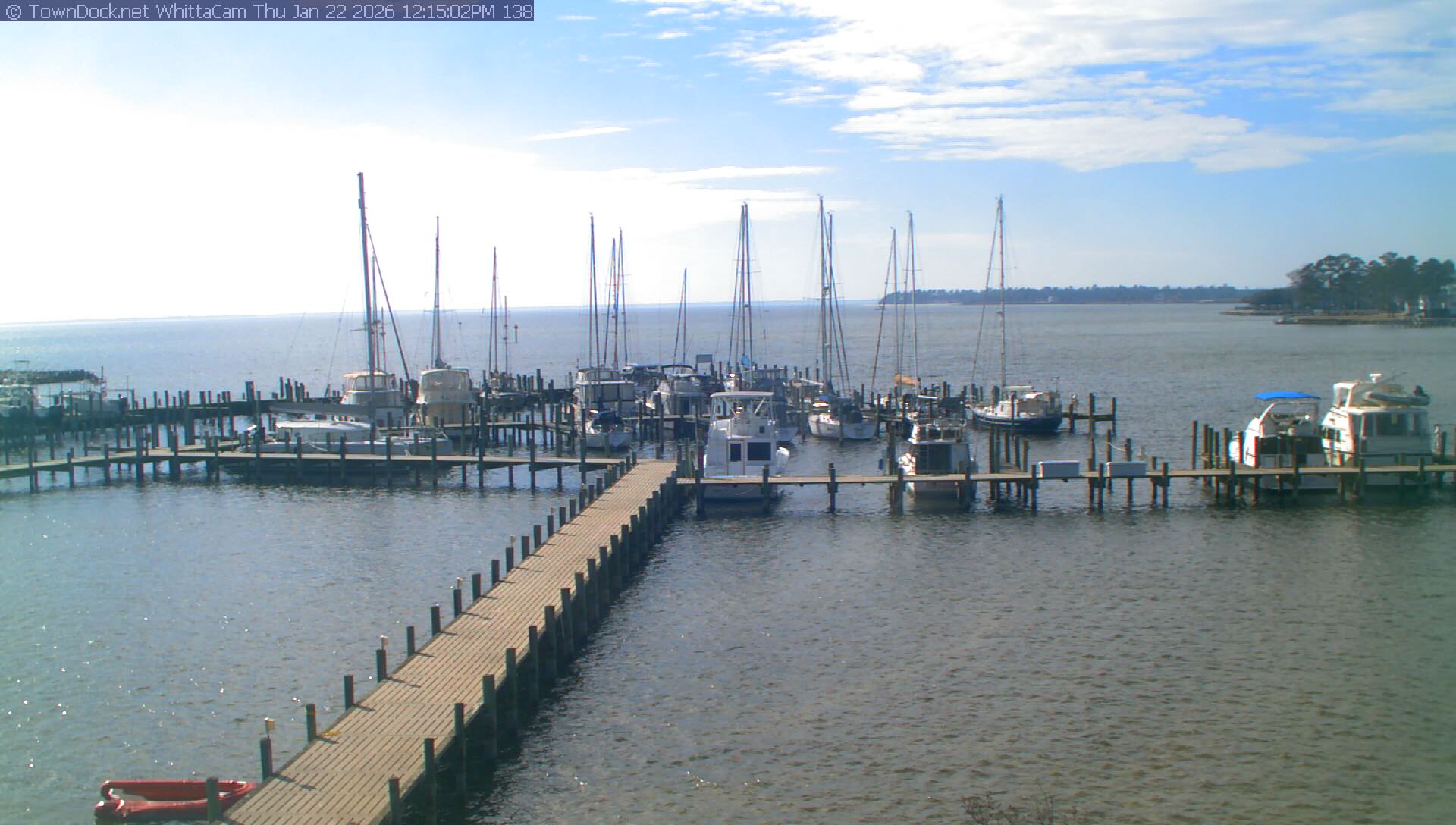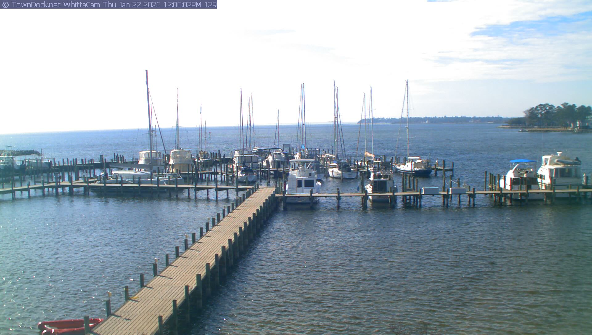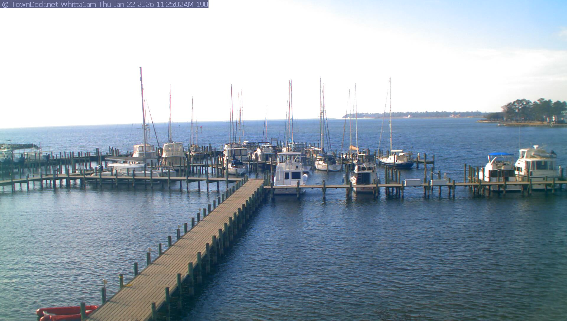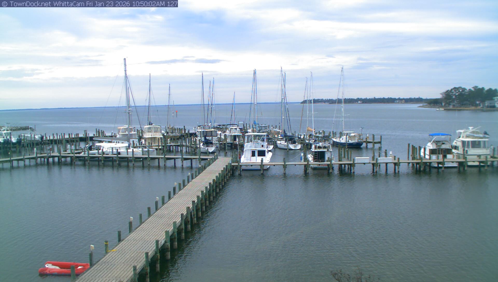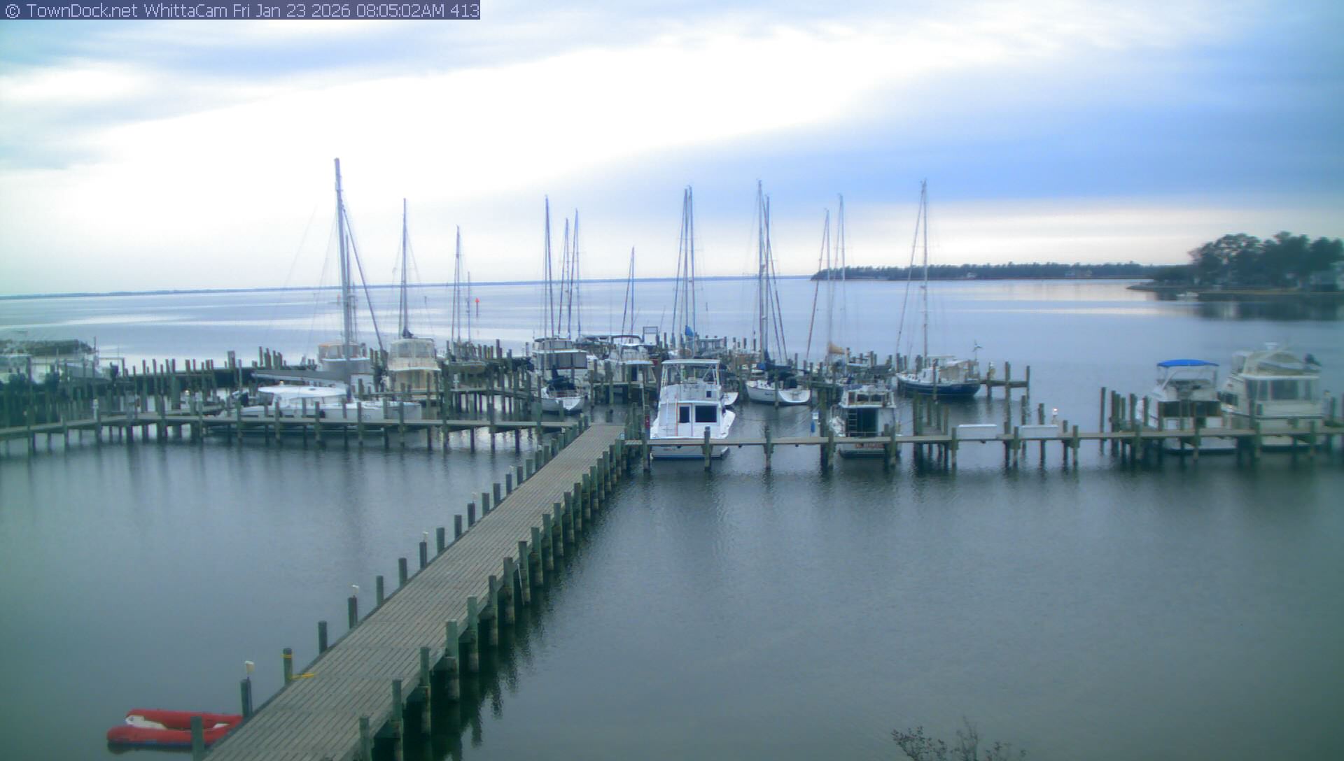 shows Whittaker Pointe Marina and the Whittaker Creek Channel entrance, with the Neuse River in the background. WhittaCam takes a new picture every five minutes from dawn til just before dusk. Click on the image to see a larger version. Once you see that larger version, you can click (see arrow at right) to go back in time and see recent photos. Harbor Cam currently takes photos from 6:00am to 5:00pm.