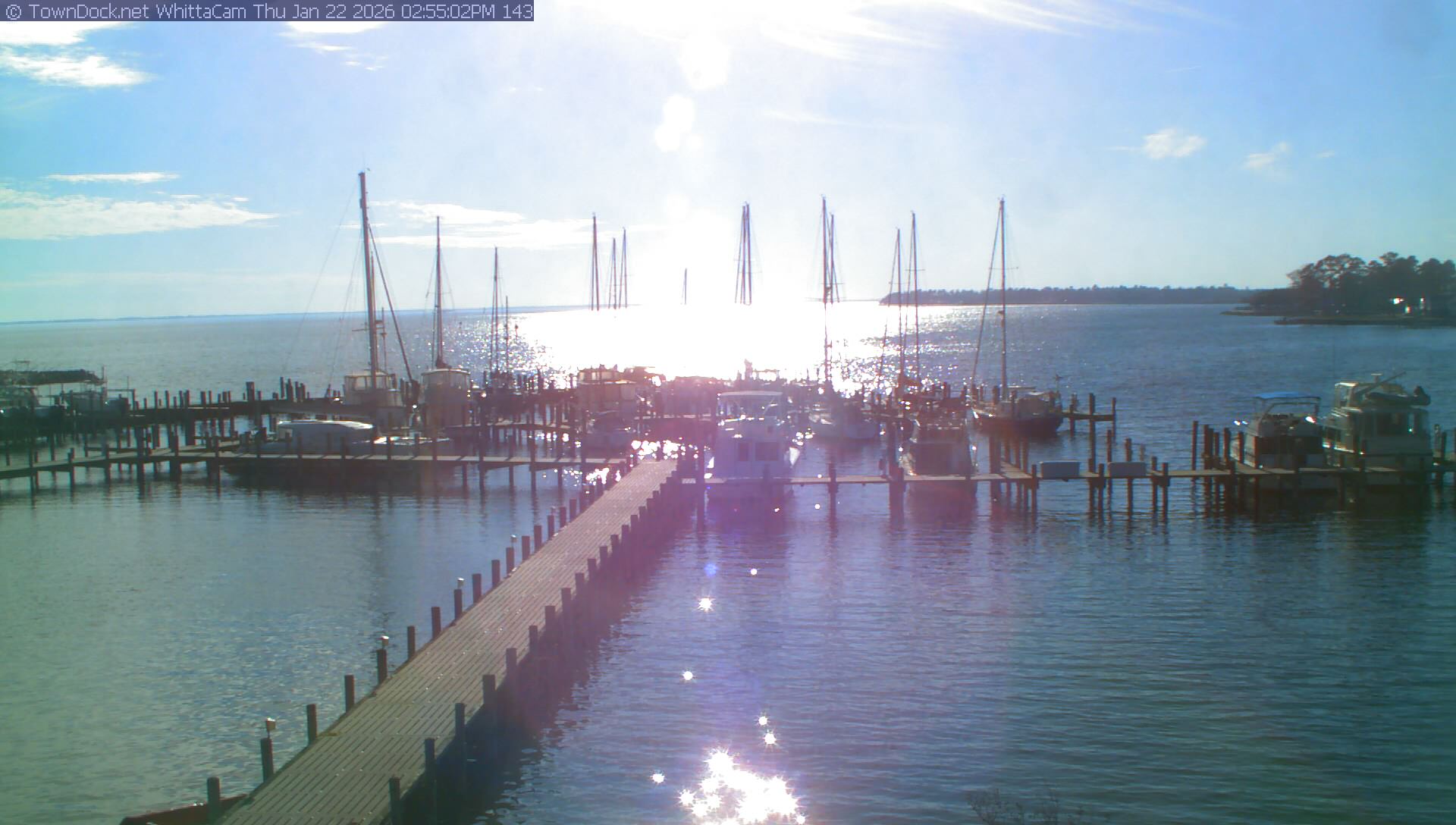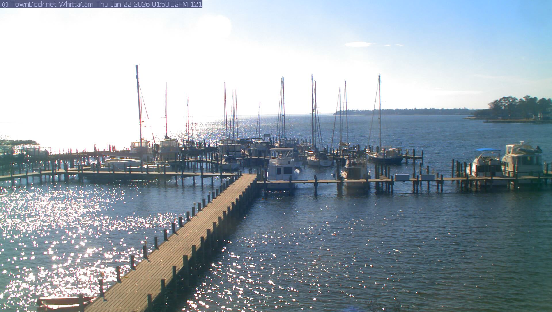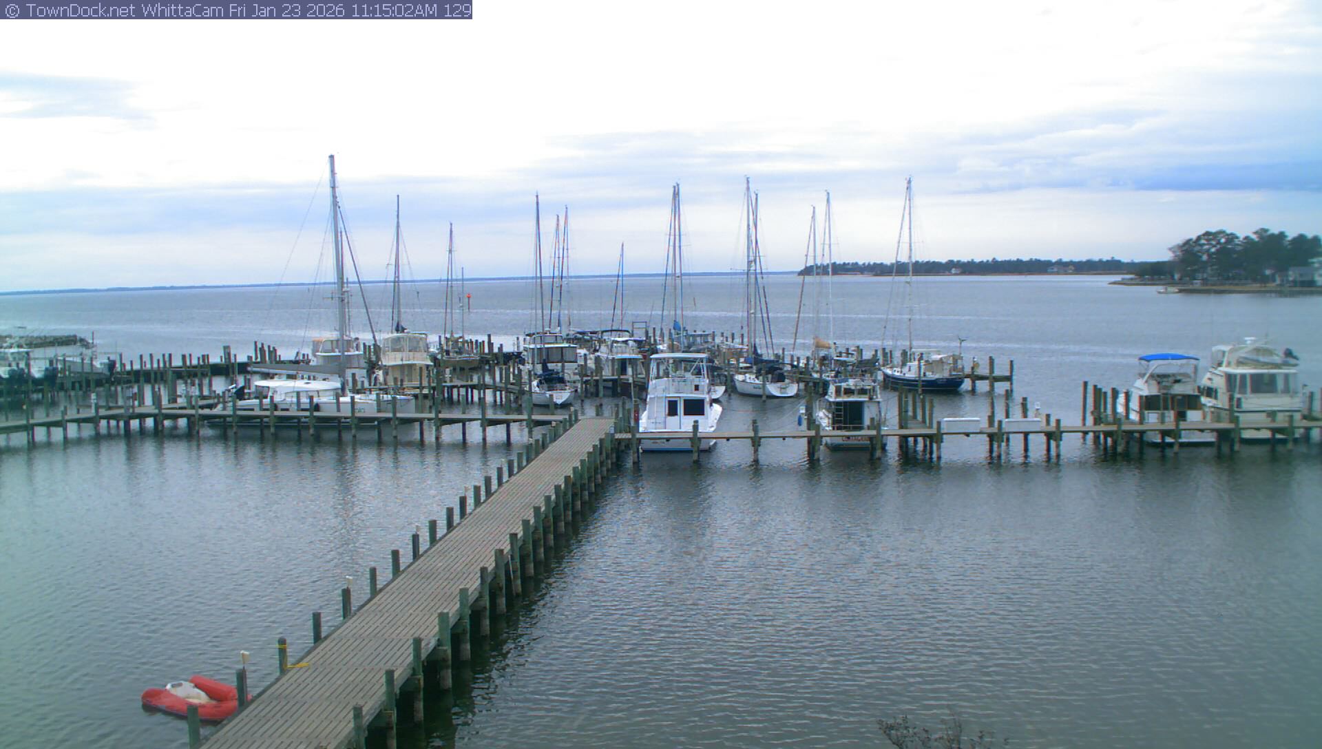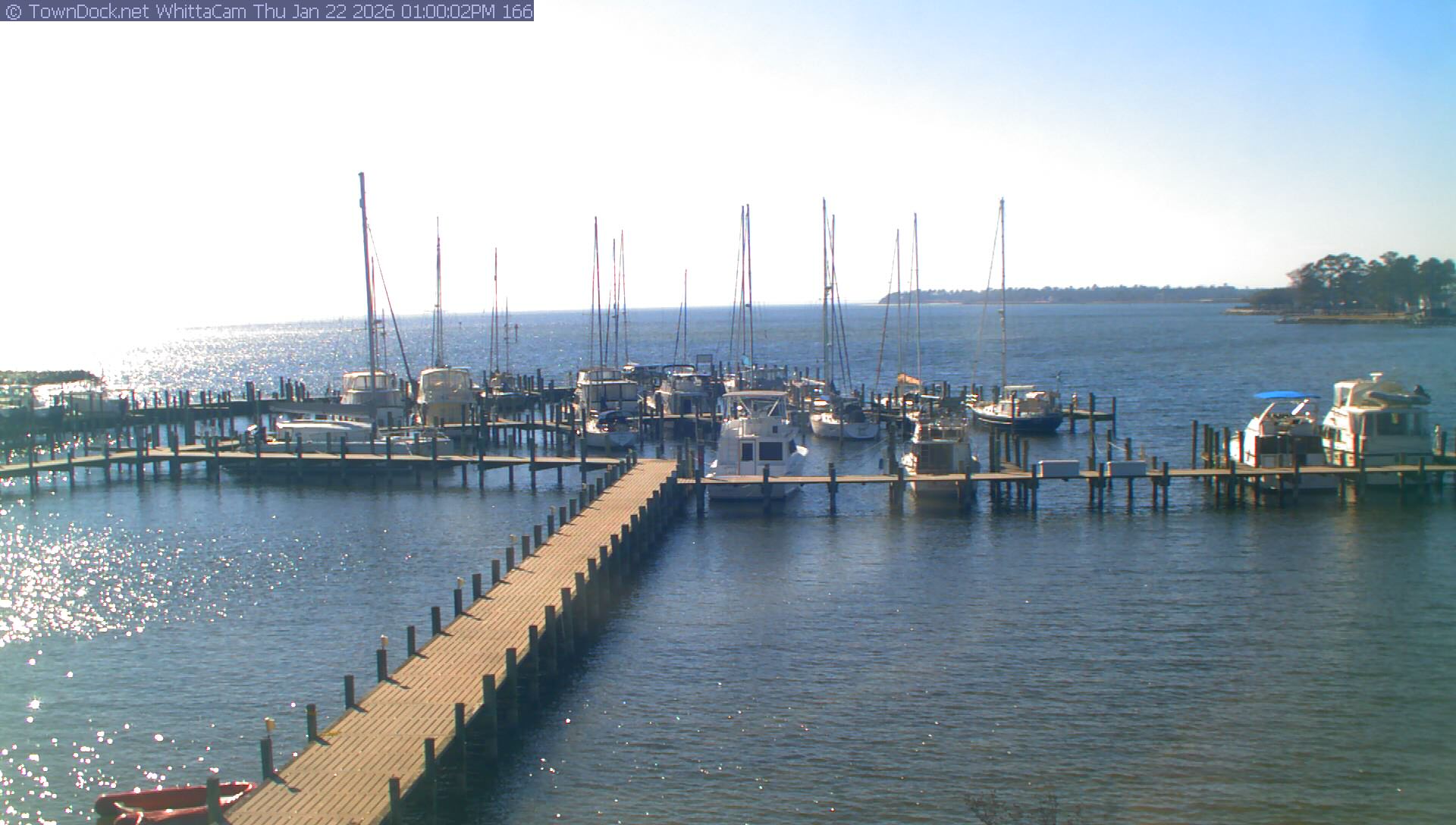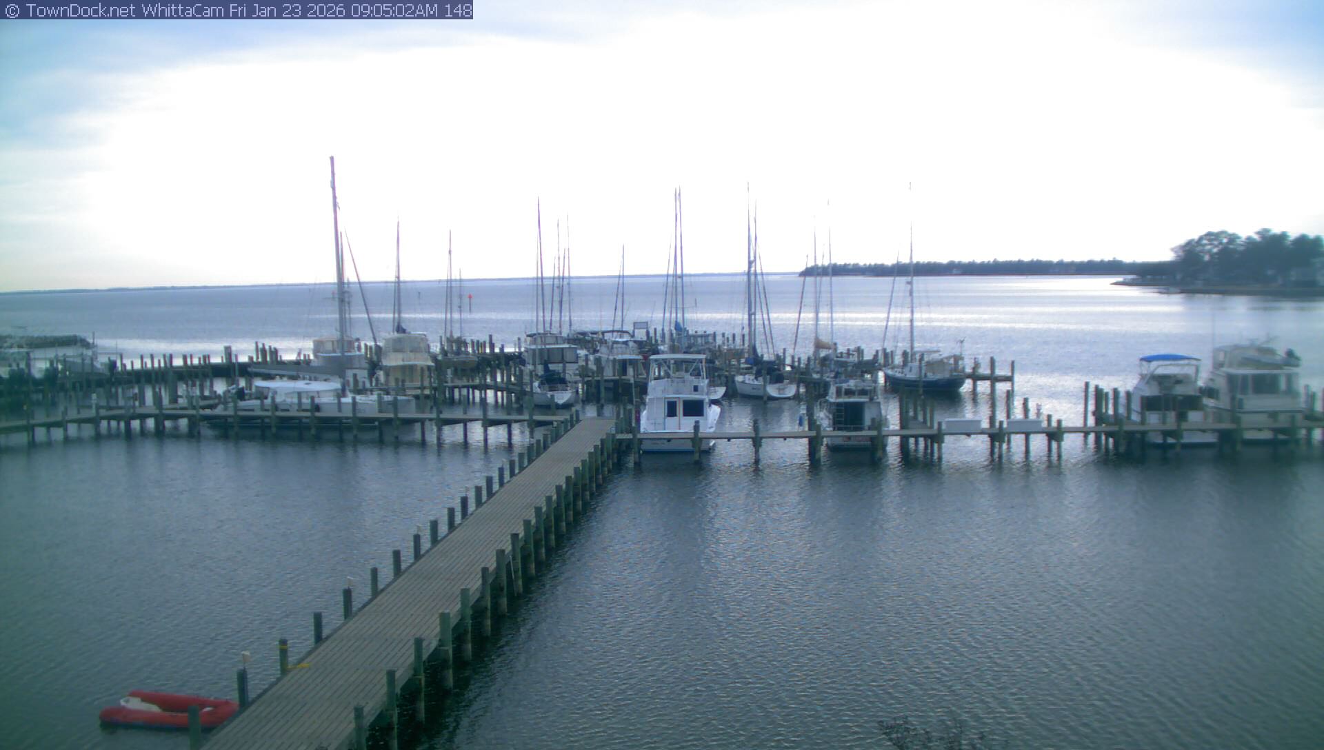 shows Whittaker Pointe Marina and the Whittaker Creek Channel entrance, with the Neuse River in the background. WhittaCam takes a new picture every five minutes from dawn til just before dusk. Click on the image to see a larger version. Once you see that larger version, you can click (see arrow at right) to go back in time and see recent photos. Harbor Cam currently takes photos from 6:00am to 5:00pm.
