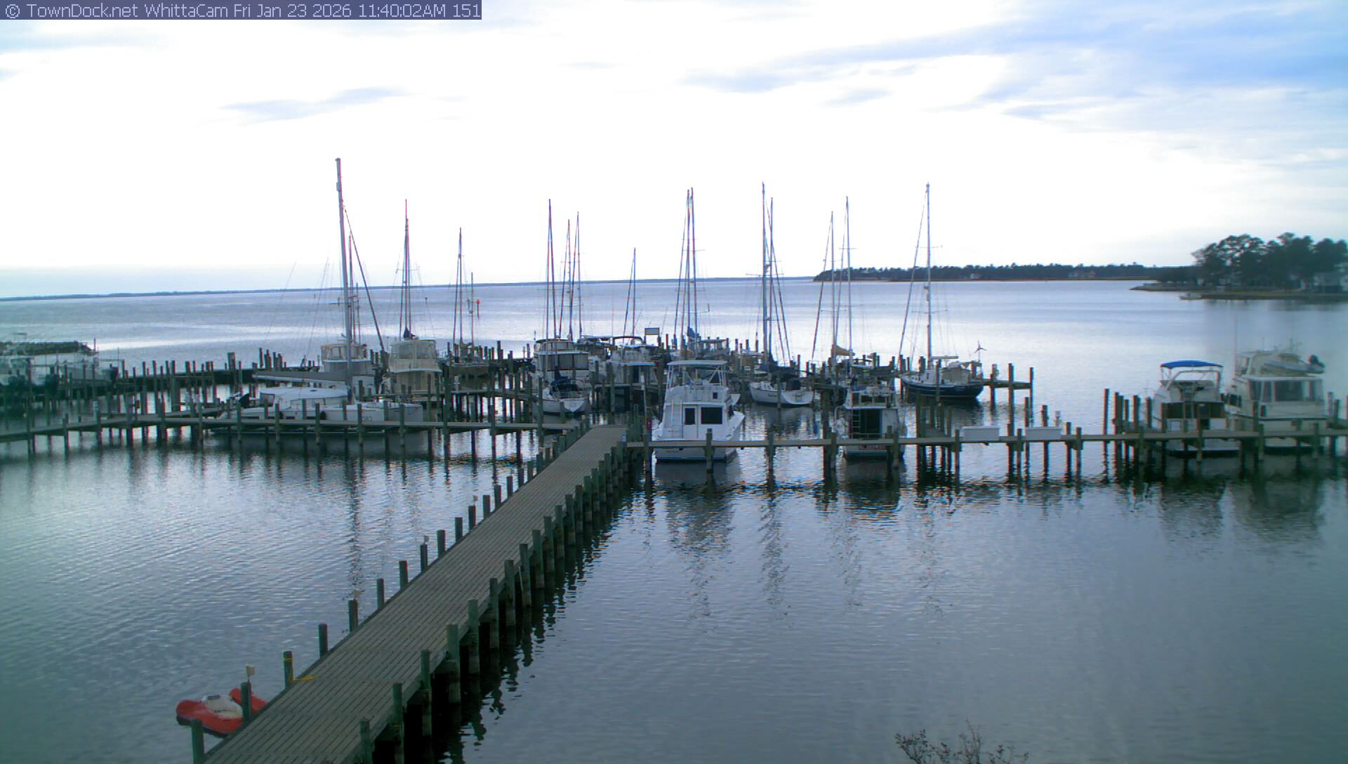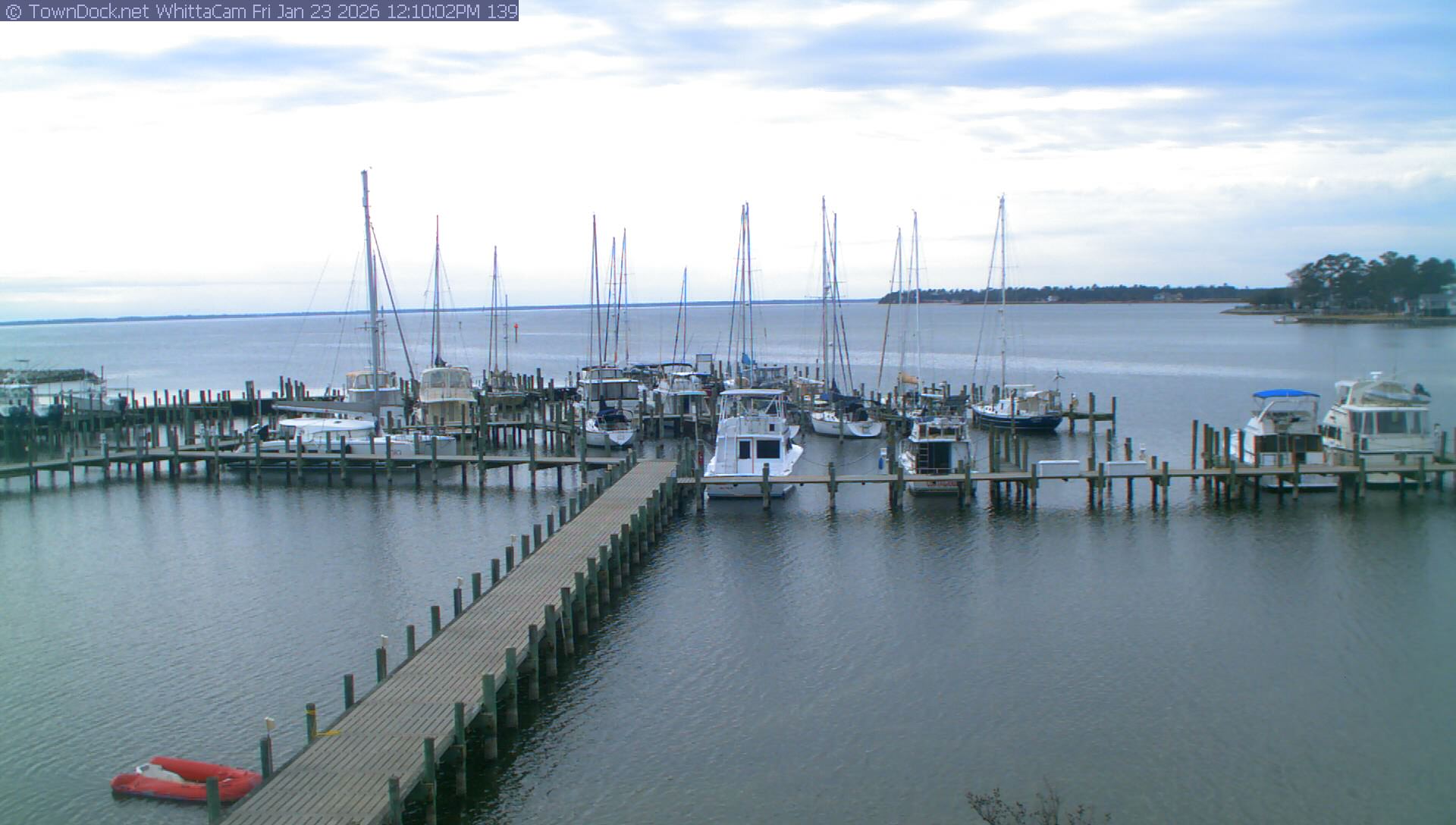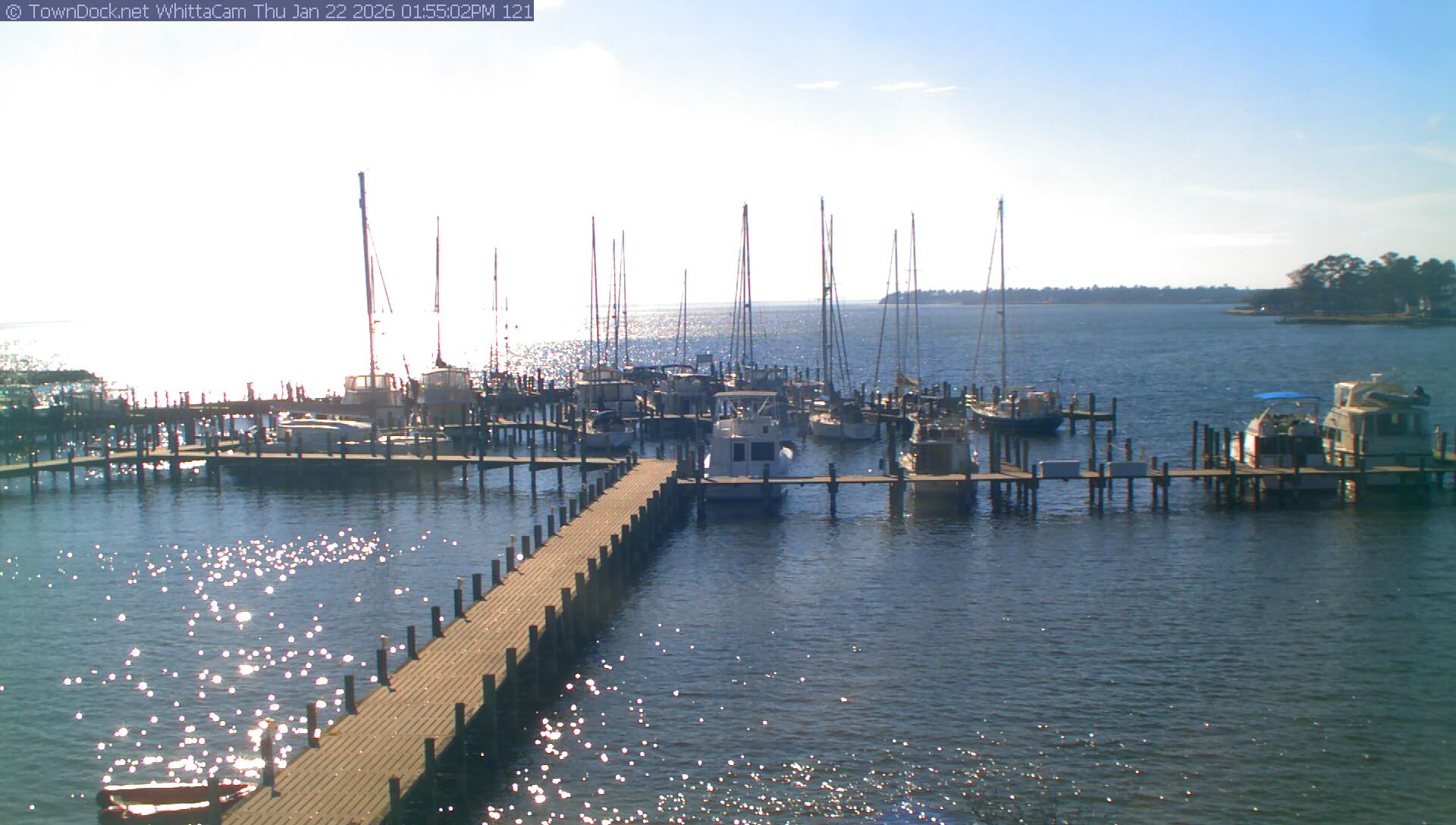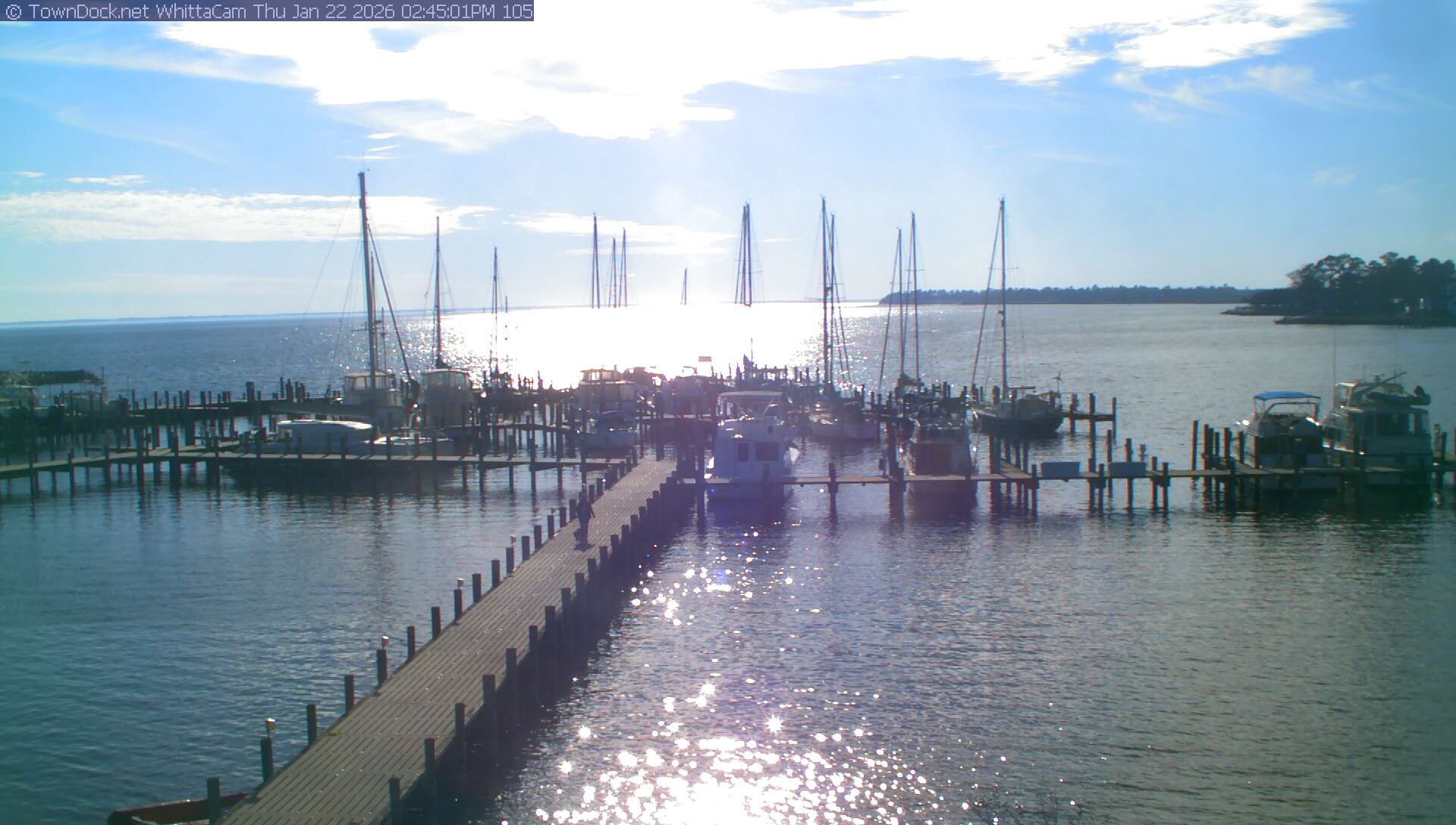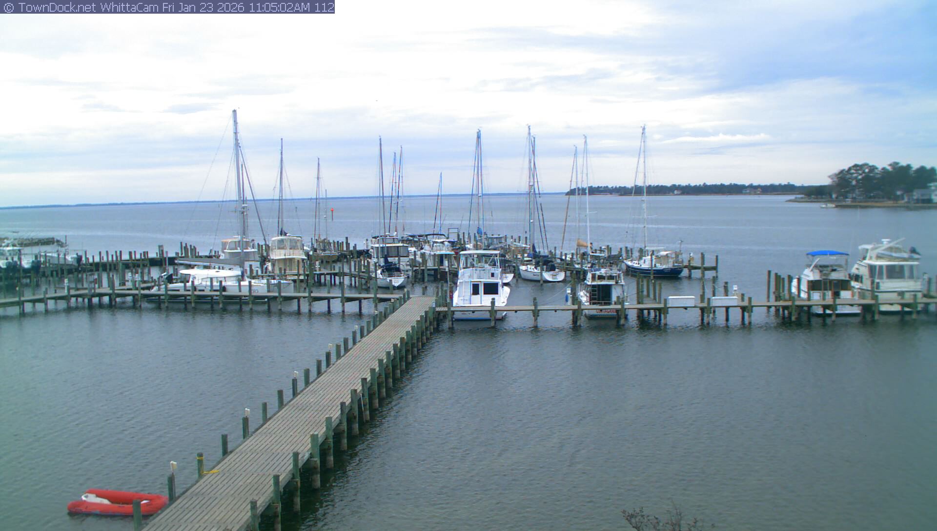 shows Whittaker Pointe Marina and the Whittaker Creek Channel entrance, with the Neuse River in the background. WhittaCam takes a new picture every five minutes from dawn til just before dusk. Click on the image to see a larger version. Once you see that larger version, you can click (see arrow at right) to go back in time and see recent photos. Harbor Cam currently takes photos from 6:00am to 5:00pm.