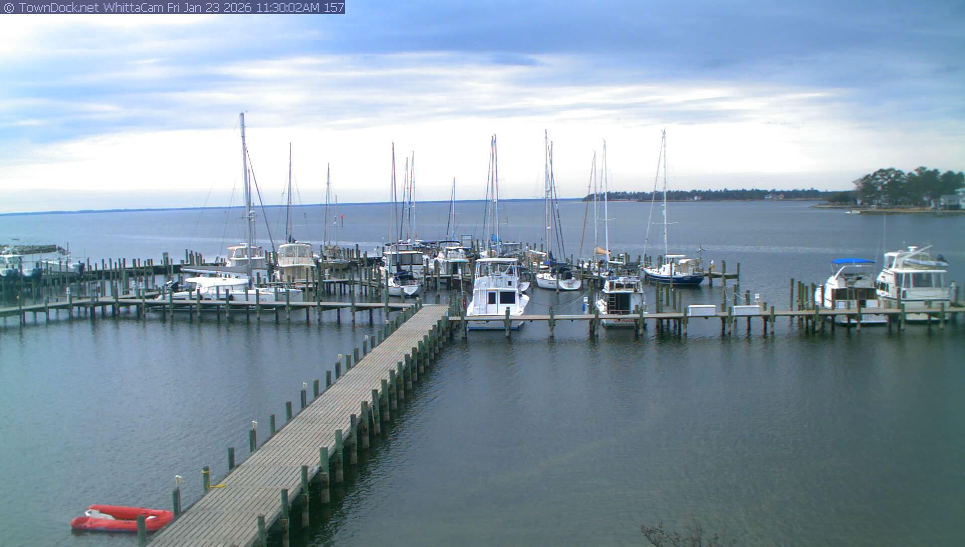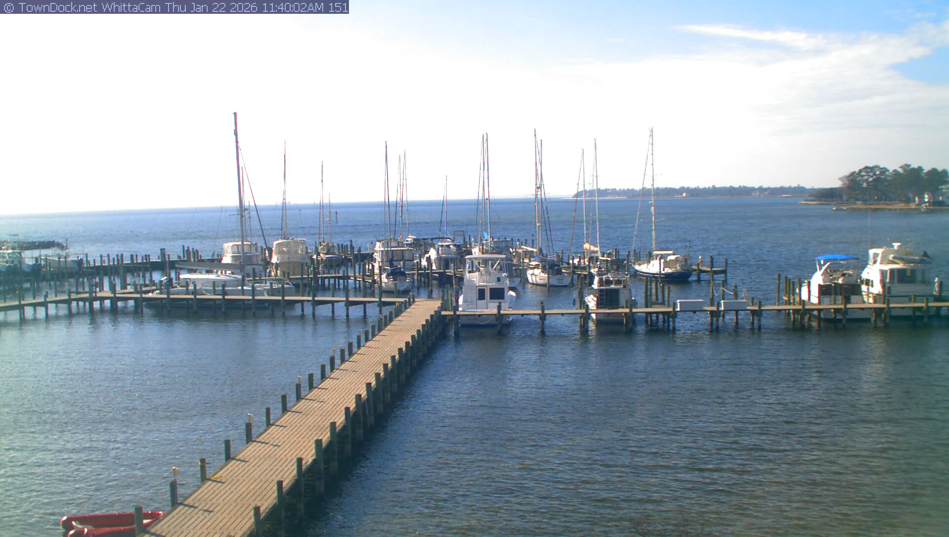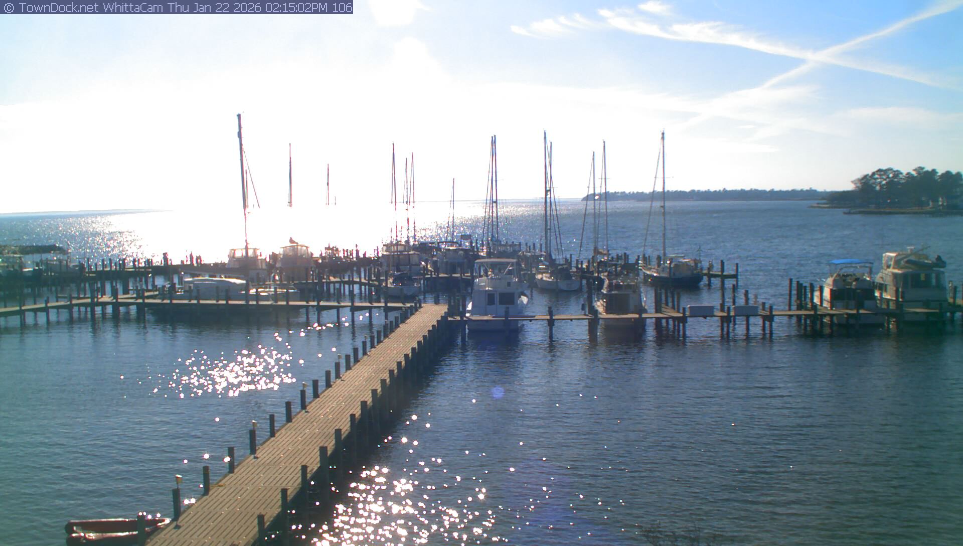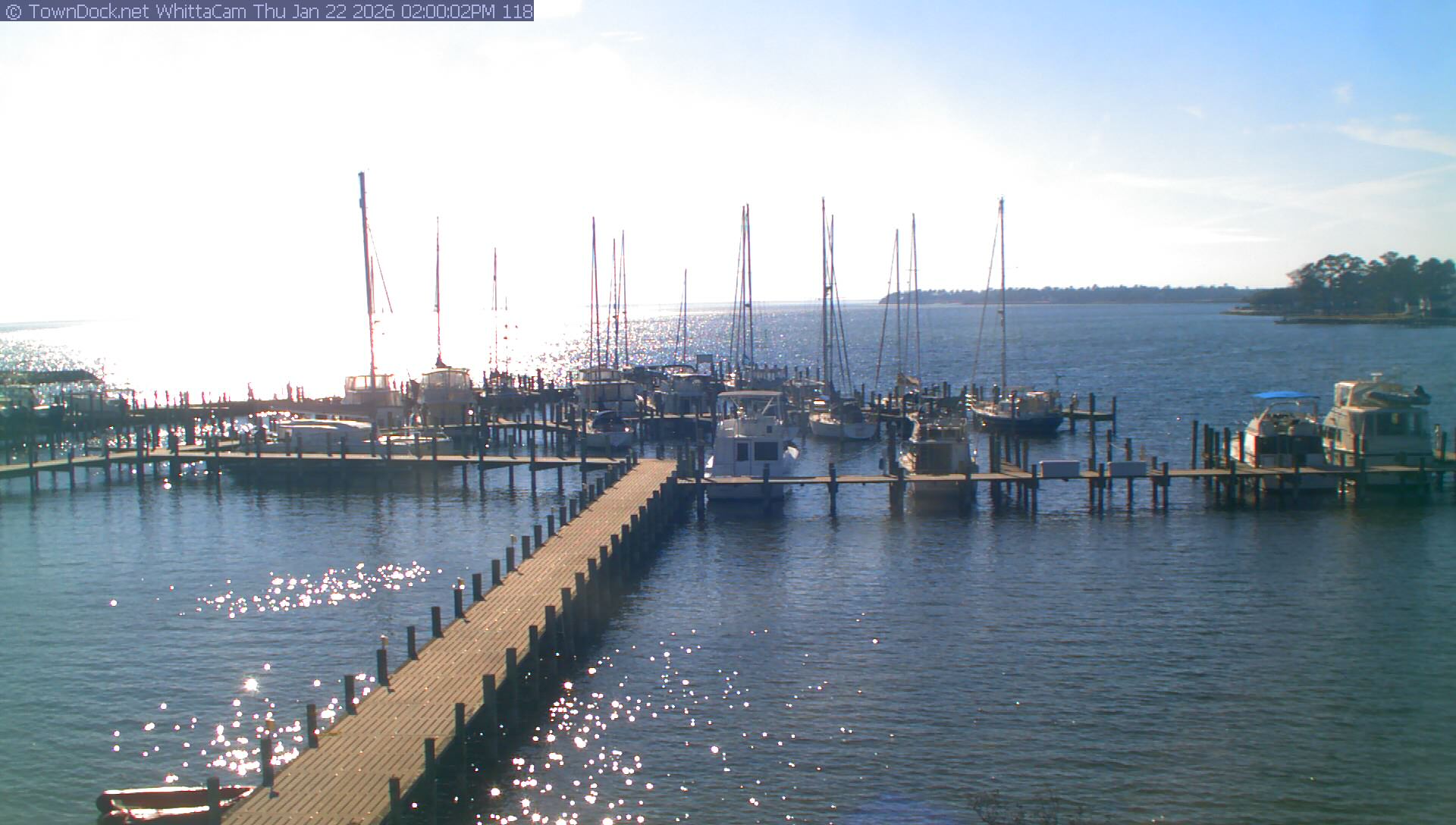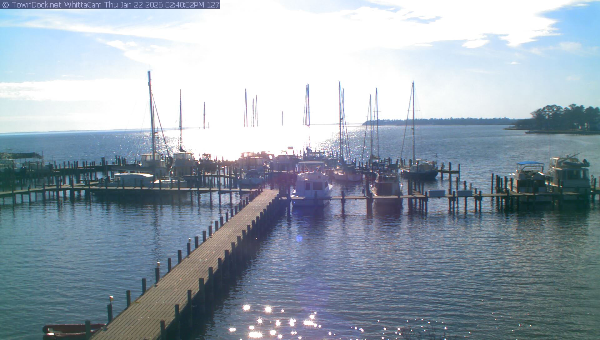 shows Whittaker Pointe Marina and the Whittaker Creek Channel entrance, with the Neuse River in the background. WhittaCam takes a new picture every five minutes from dawn til just before dusk. Click on the image to see a larger version. Once you see that larger version, you can click (see arrow at right) to go back in time and see recent photos. Harbor Cam currently takes photos from 6:00am to 5:00pm.