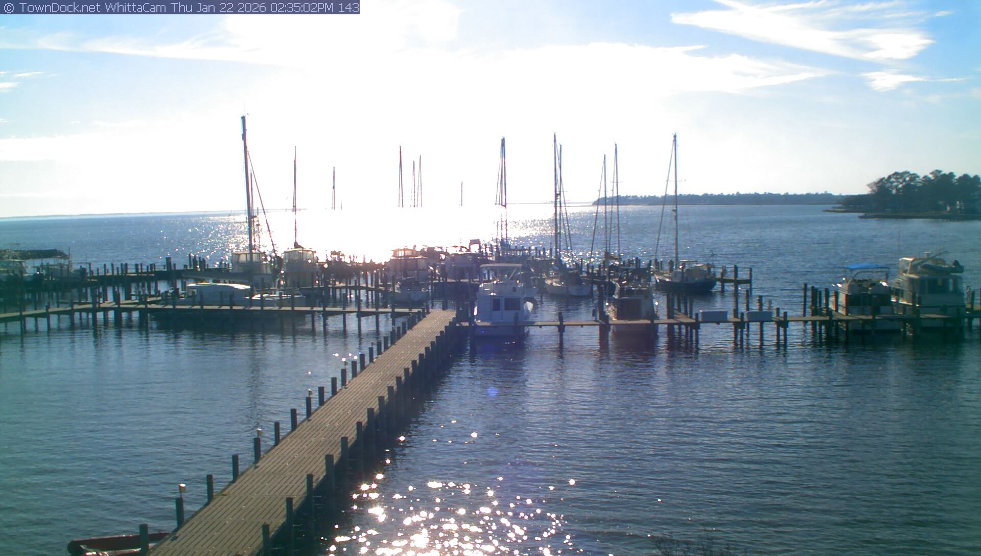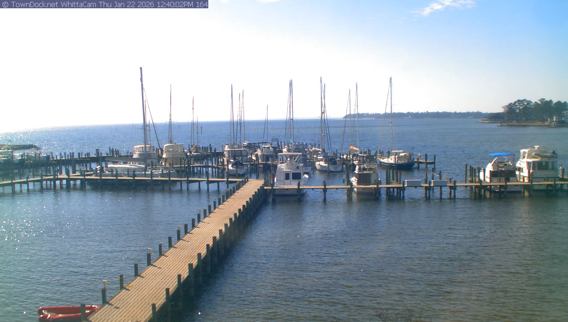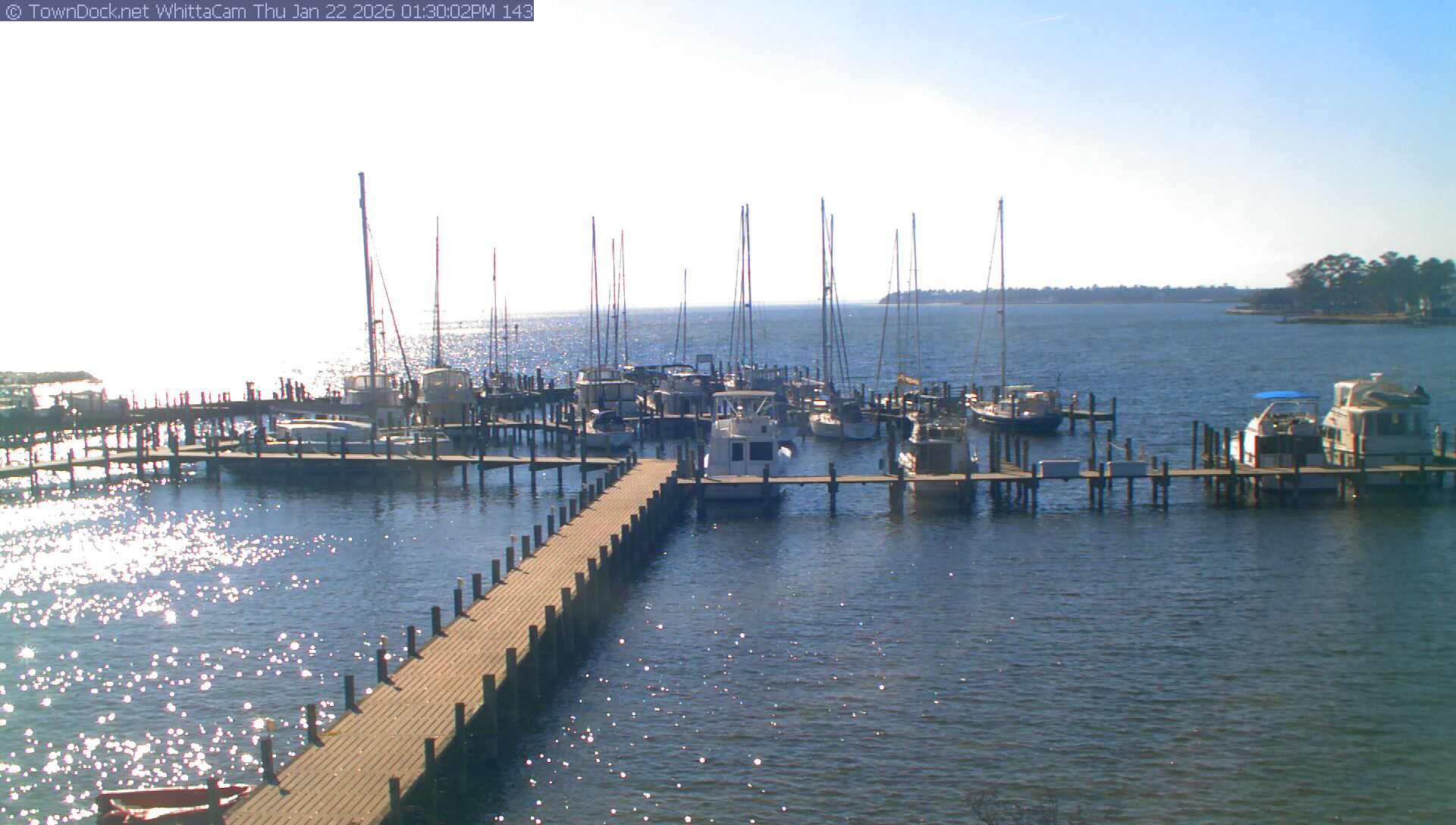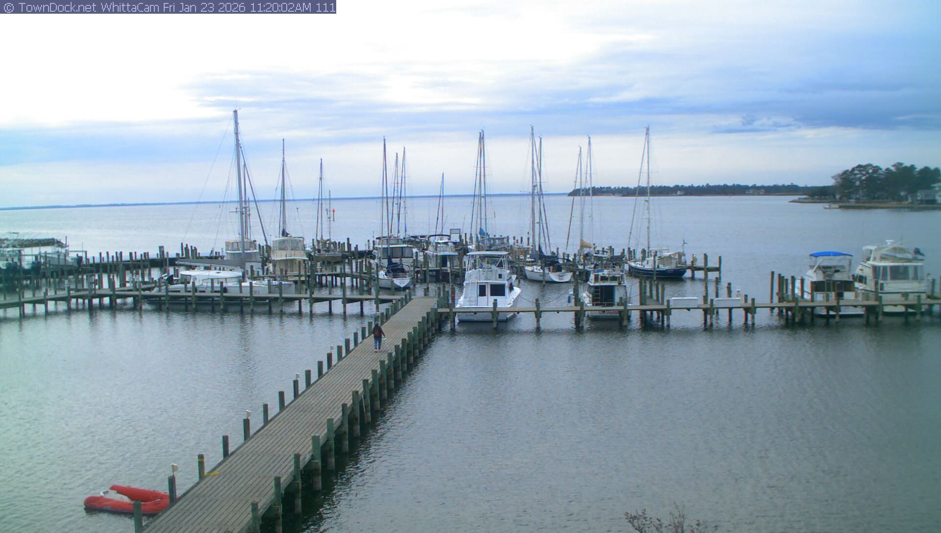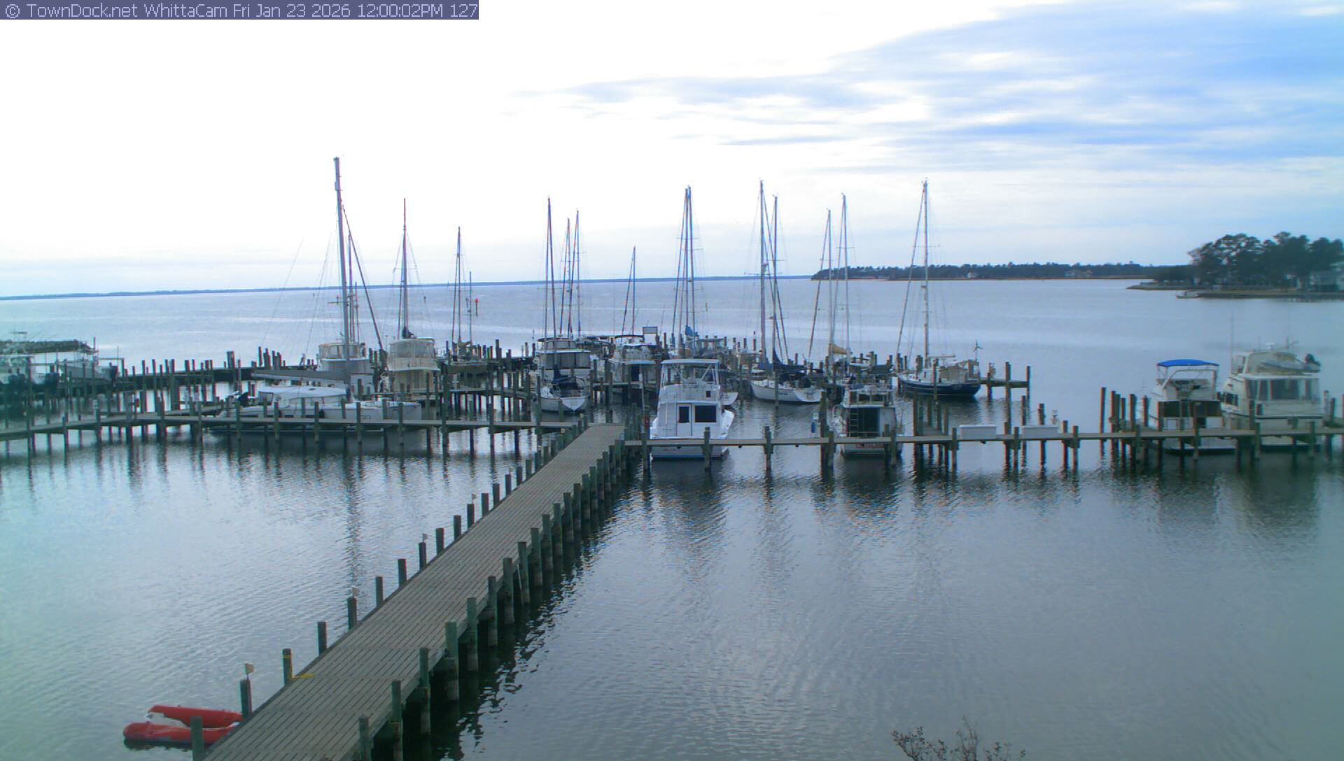 shows Whittaker Pointe Marina and the Whittaker Creek Channel entrance, with the Neuse River in the background. WhittaCam takes a new picture every five minutes from dawn til just before dusk. Click on the image to see a larger version. Once you see that larger version, you can click (see arrow at right) to go back in time and see recent photos. Harbor Cam currently takes photos from 6:00am to 5:00pm.