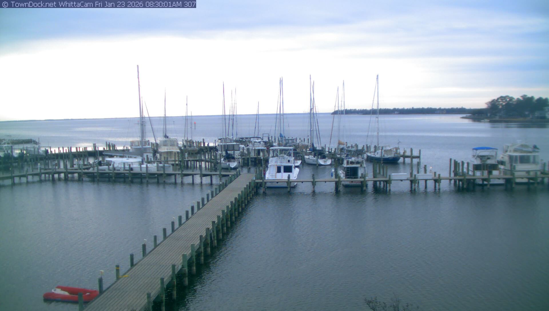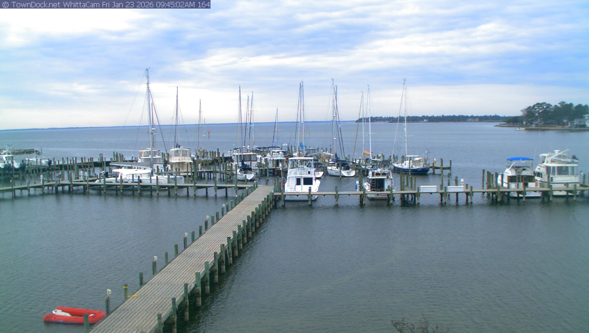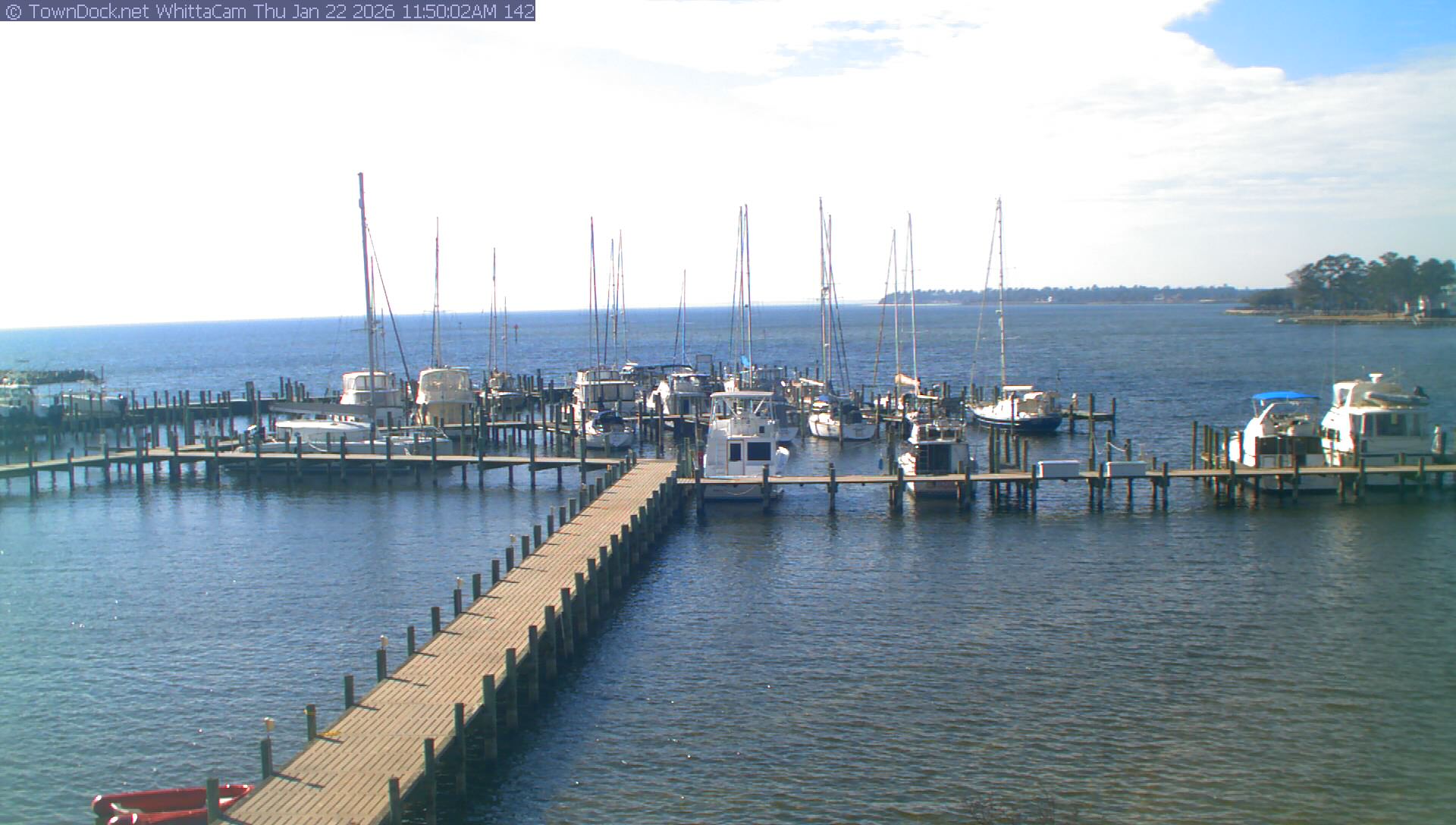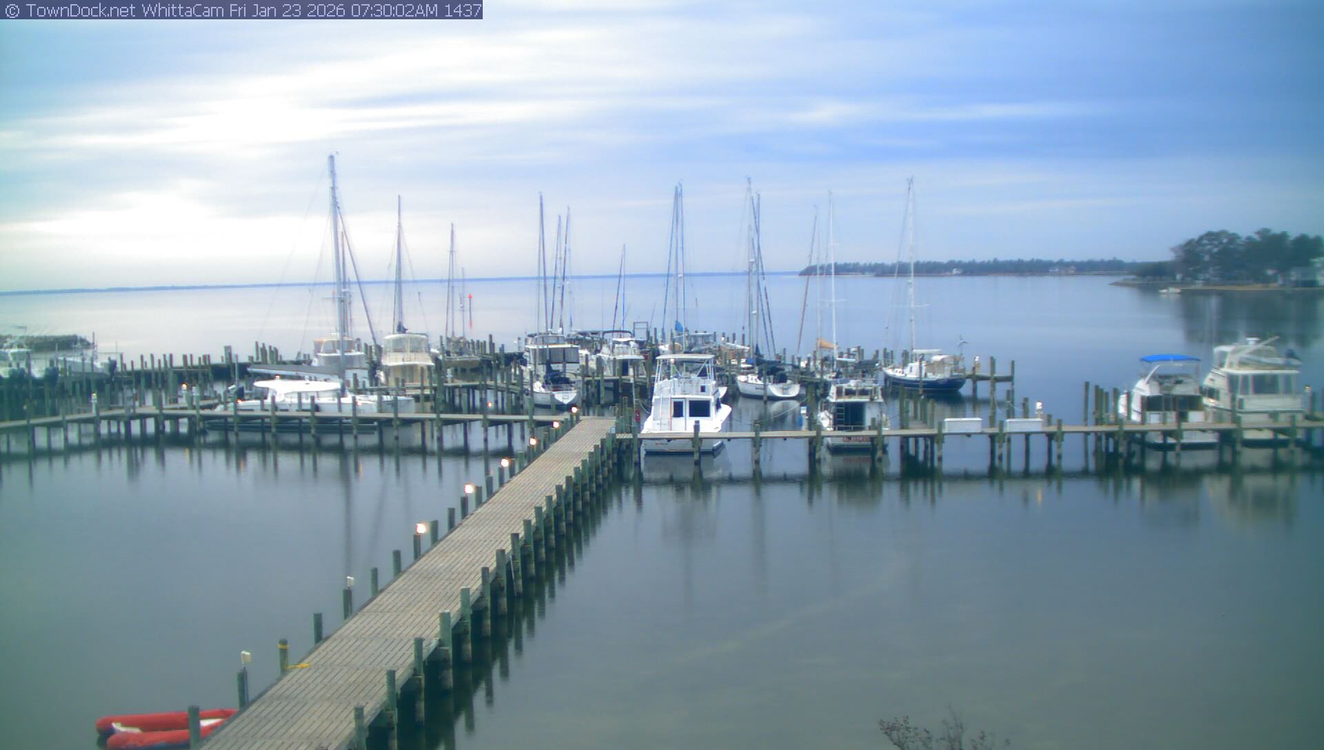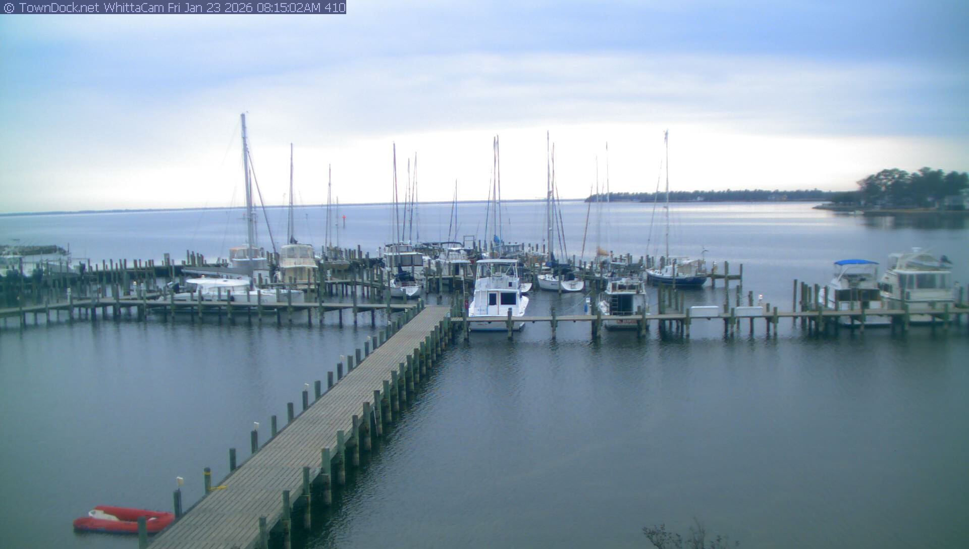shows Whittaker Pointe Marina and the Whittaker Creek Channel entrance, with the Neuse River in the background. WhittaCam takes a new picture every five minutes from dawn til just before dusk. Click on the image to see a larger version. Once you see that larger version, you can click (see arrow at right) to go back in time and see recent photos. Harbor Cam currently takes photos from 6:00am to 5:00pm.