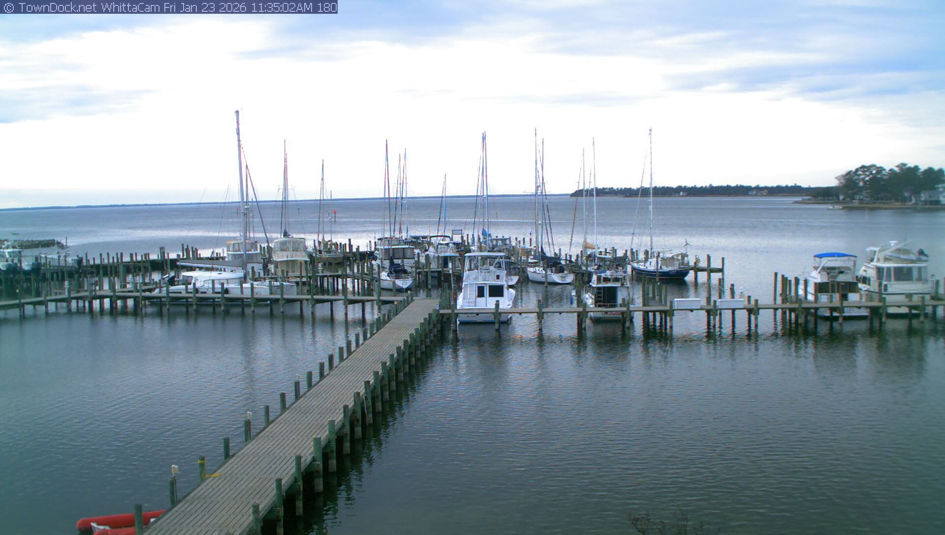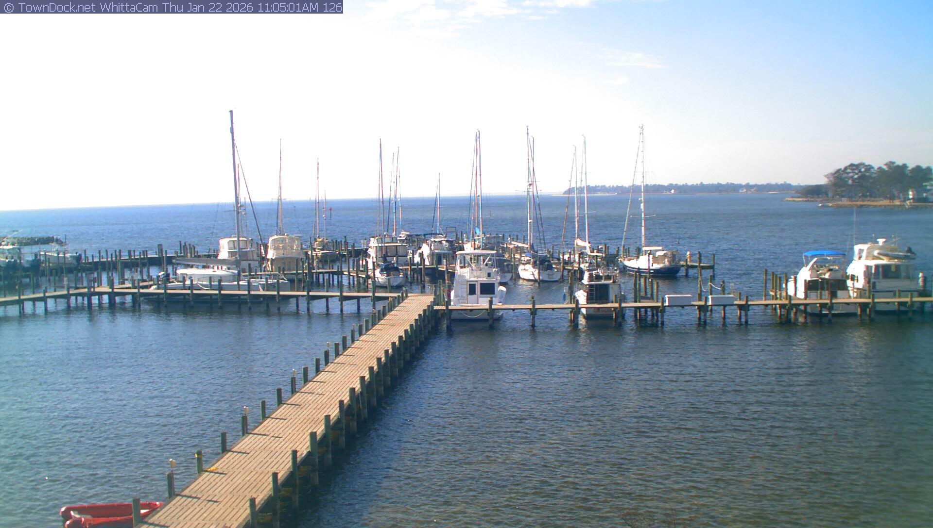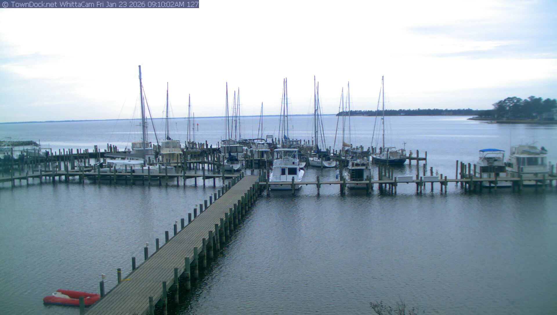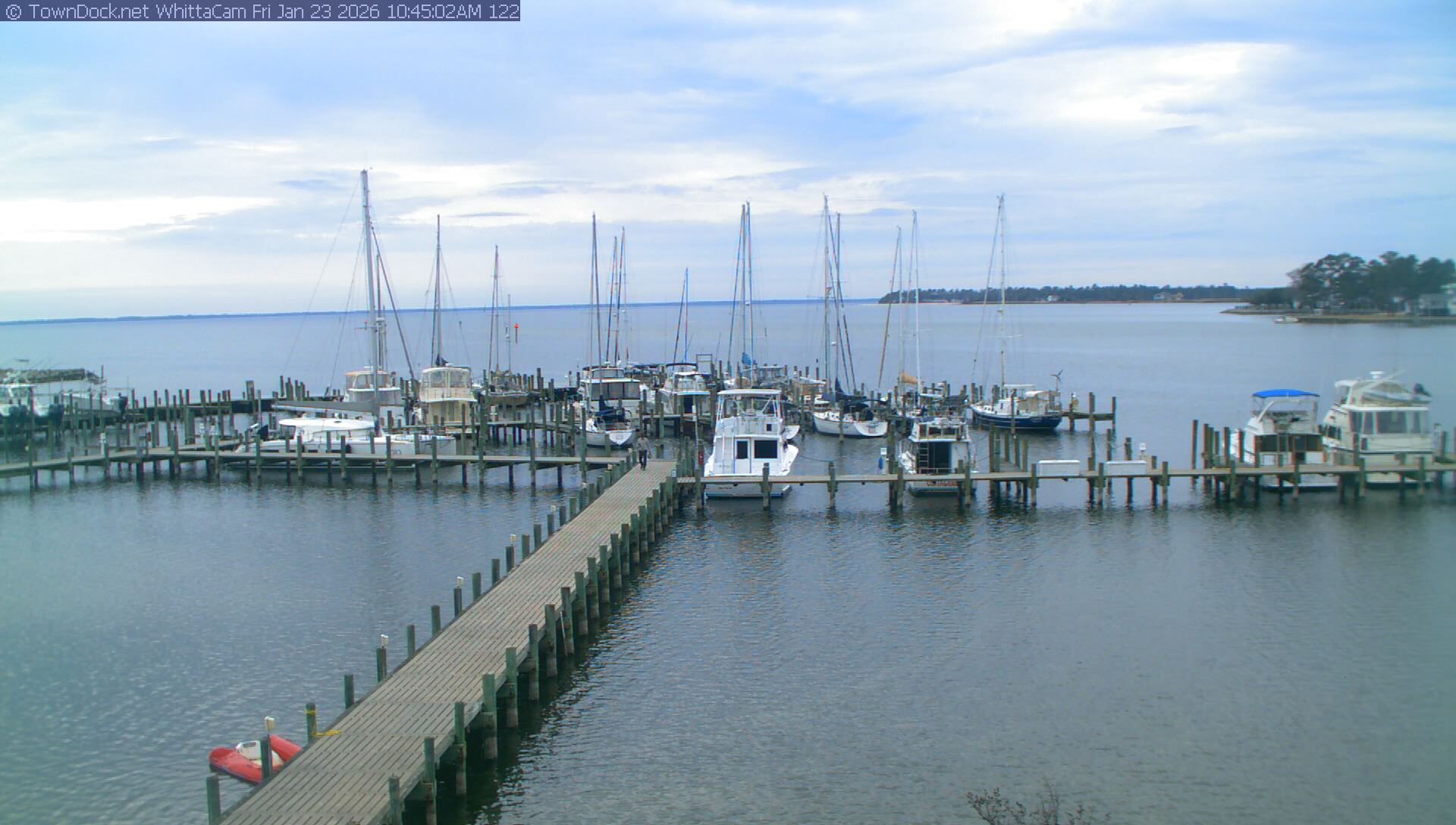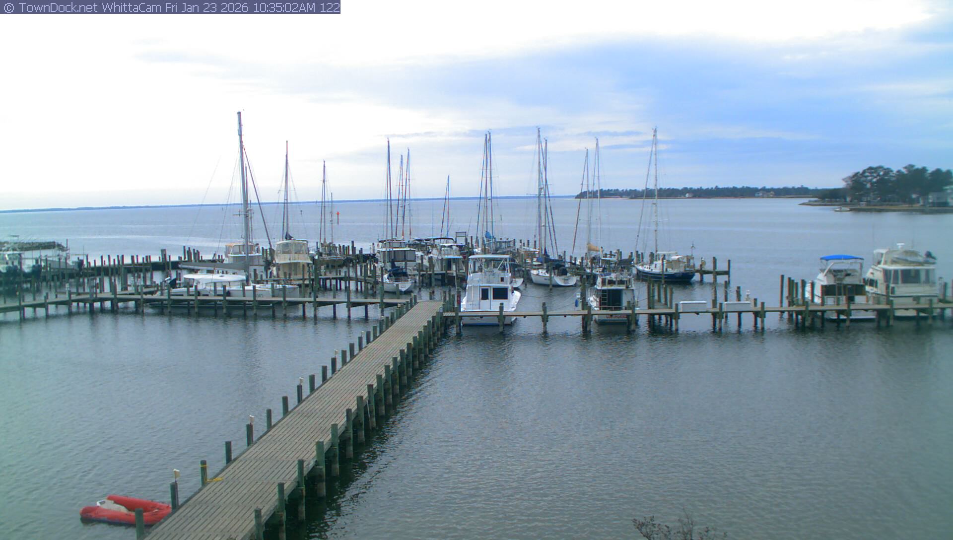 shows Whittaker Pointe Marina and the Whittaker Creek Channel entrance, with the Neuse River in the background. WhittaCam takes a new picture every five minutes from dawn til just before dusk. Click on the image to see a larger version. Once you see that larger version, you can click (see arrow at right) to go back in time and see recent photos. Harbor Cam currently takes photos from 6:00am to 5:00pm.