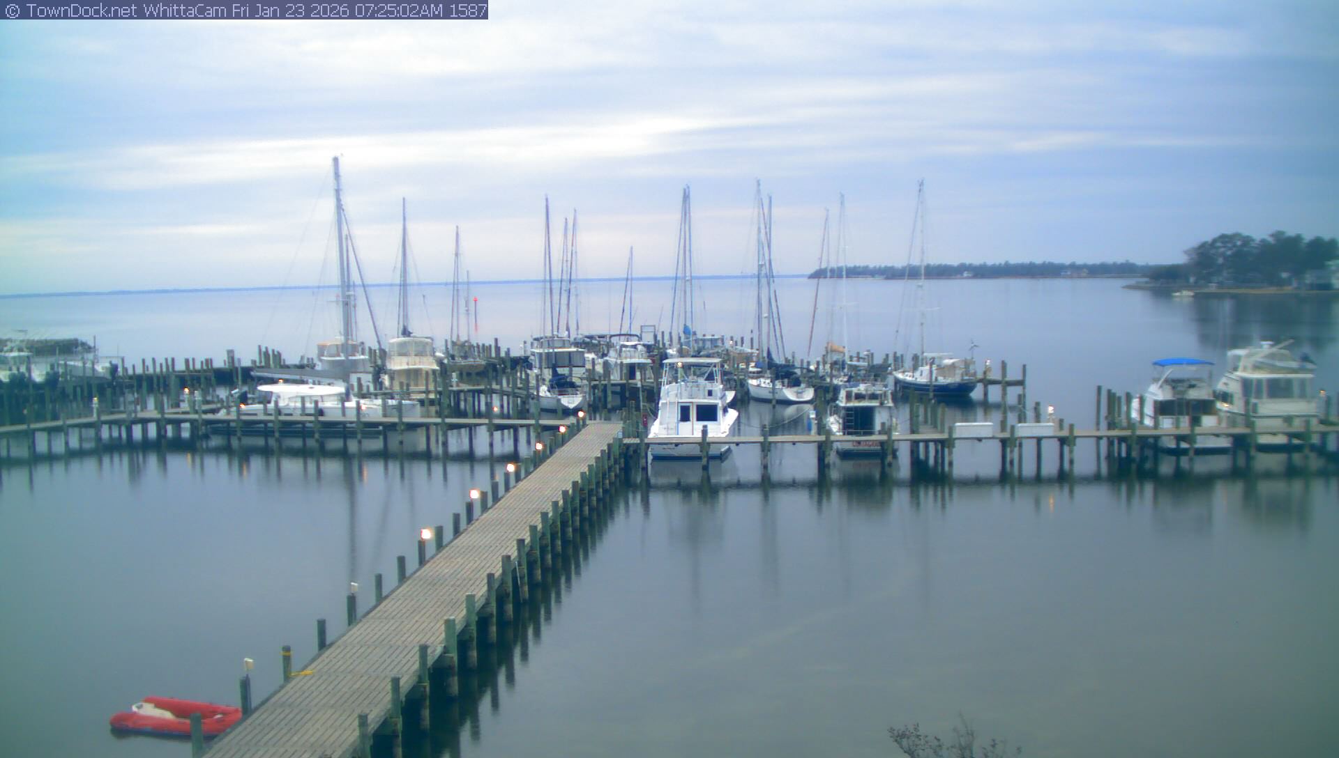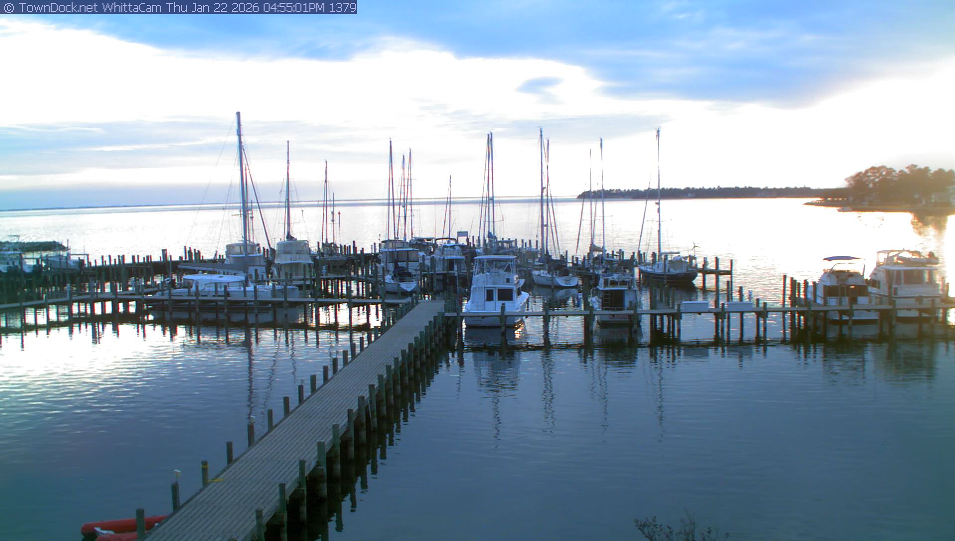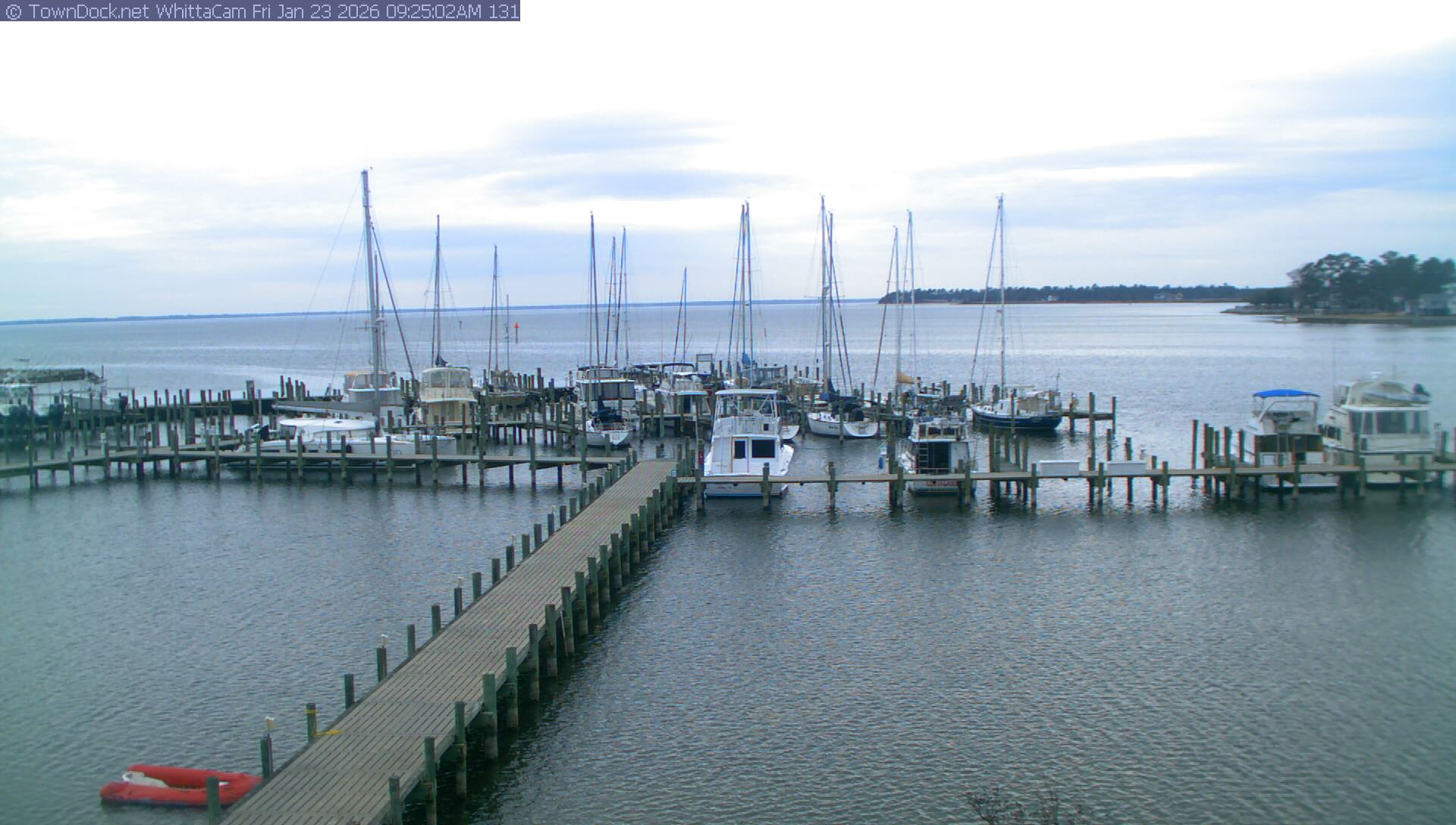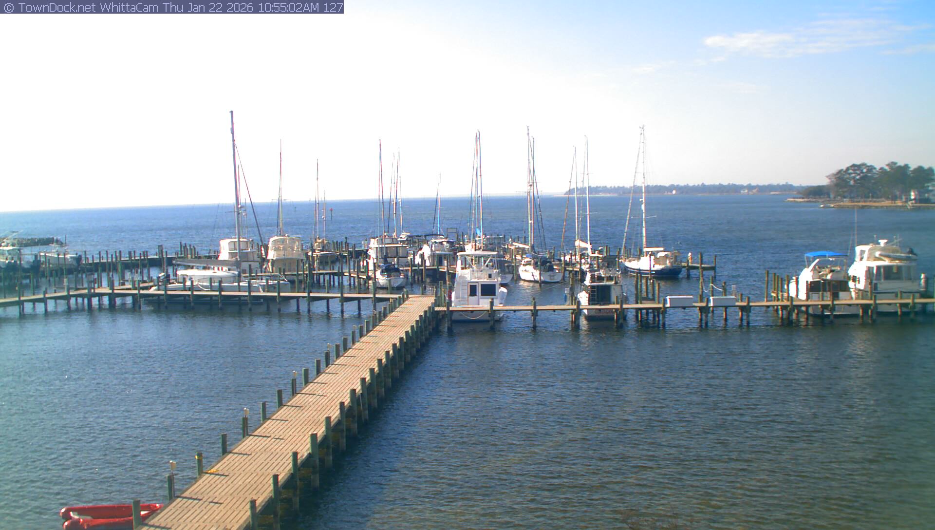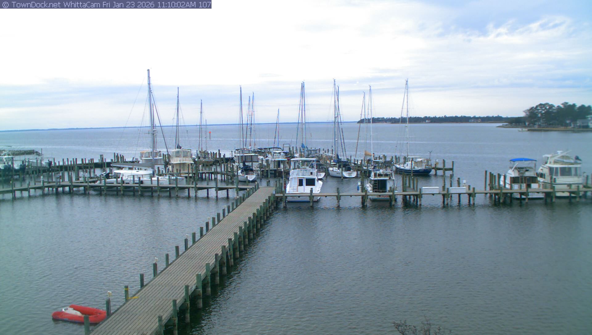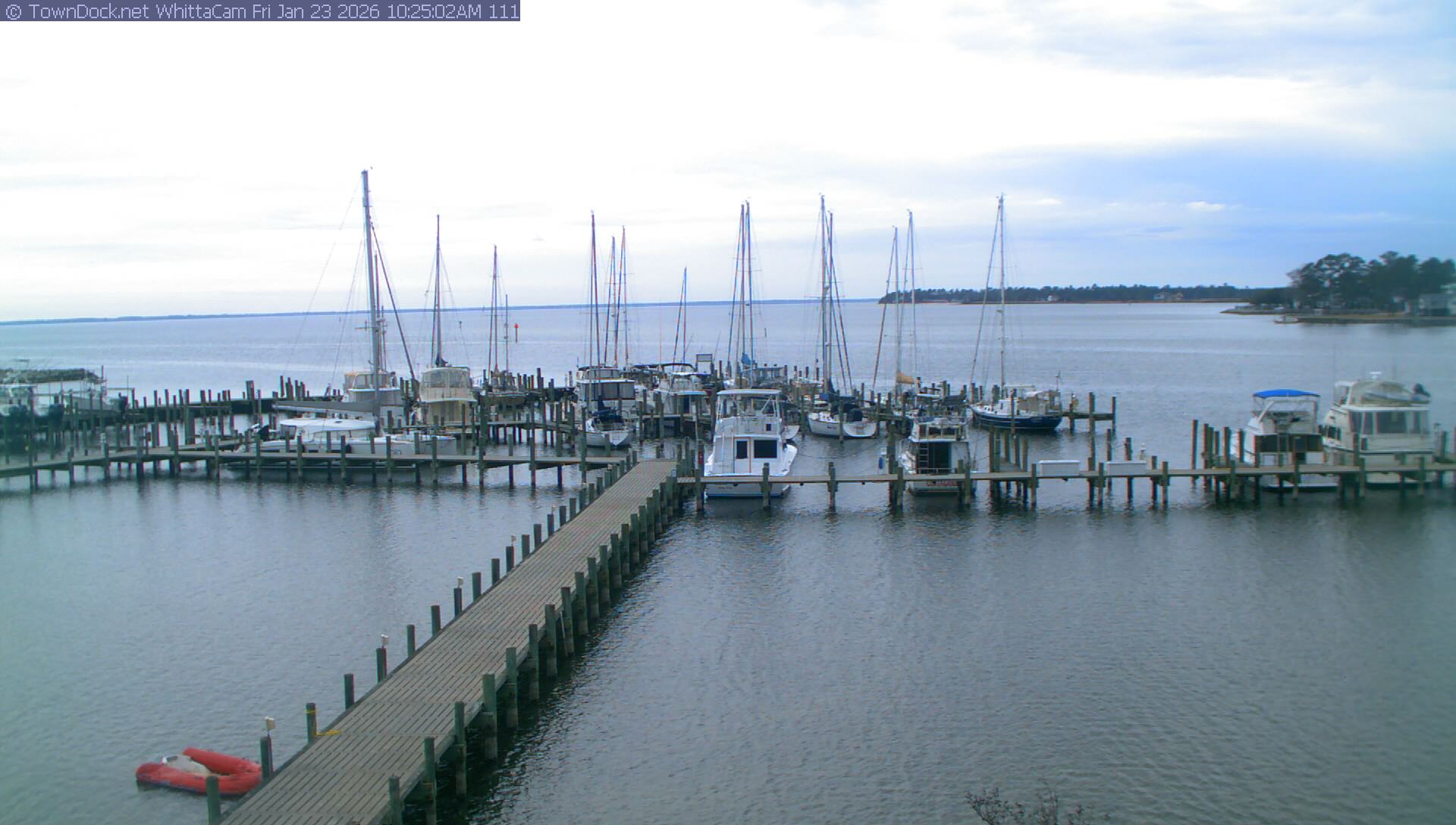 shows Whittaker Pointe Marina and the Whittaker Creek Channel entrance, with the Neuse River in the background. WhittaCam takes a new picture every five minutes from dawn til just before dusk. Click on the image to see a larger version. Once you see that larger version, you can click (see arrow at right) to go back in time and see recent photos. Harbor Cam currently takes photos from 6:00am to 5:00pm.