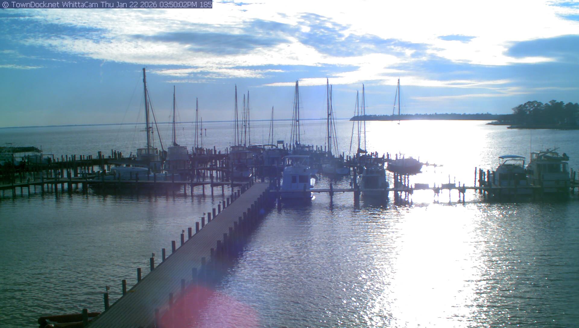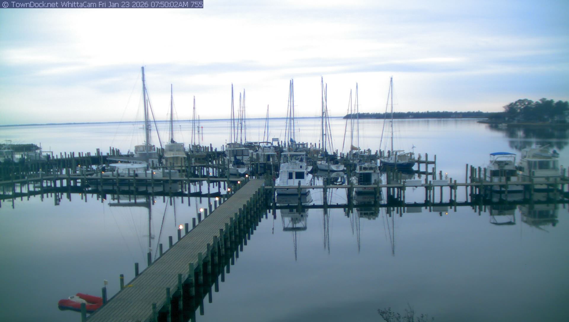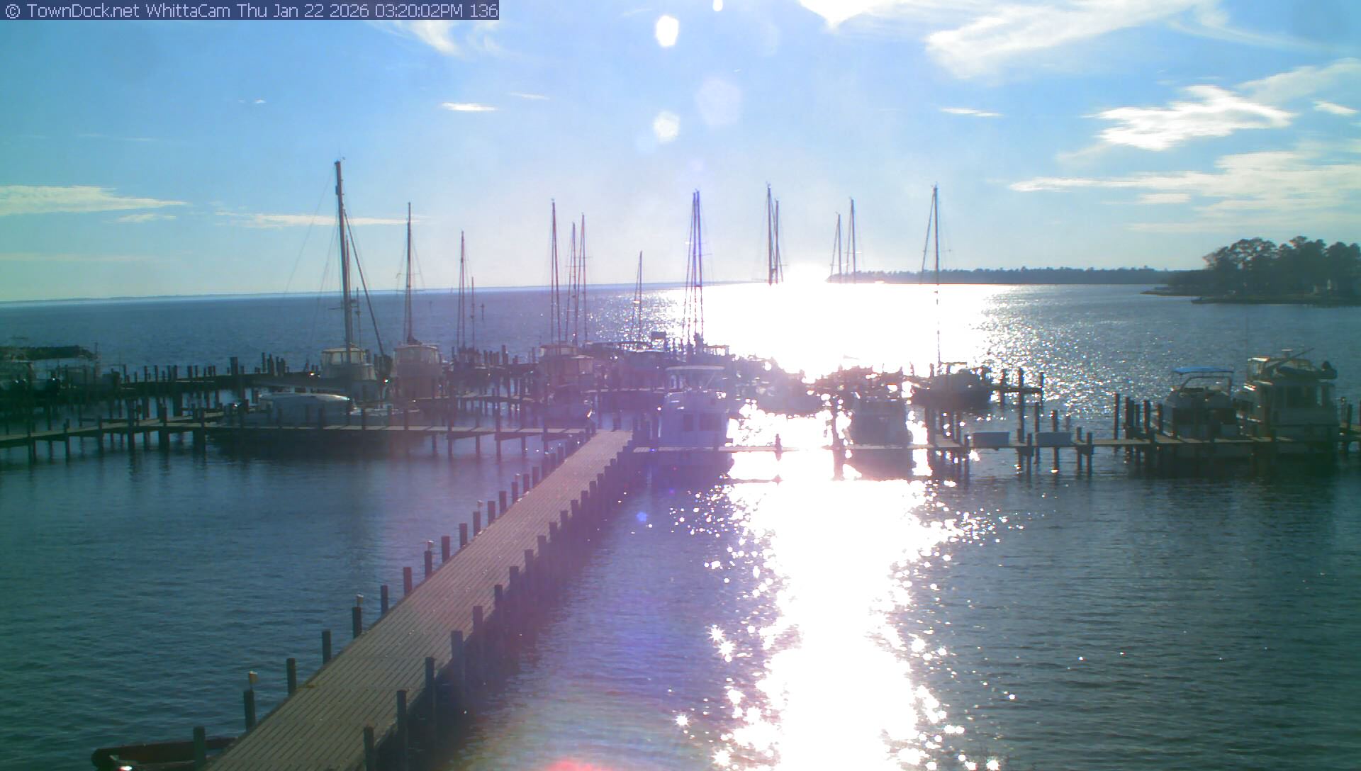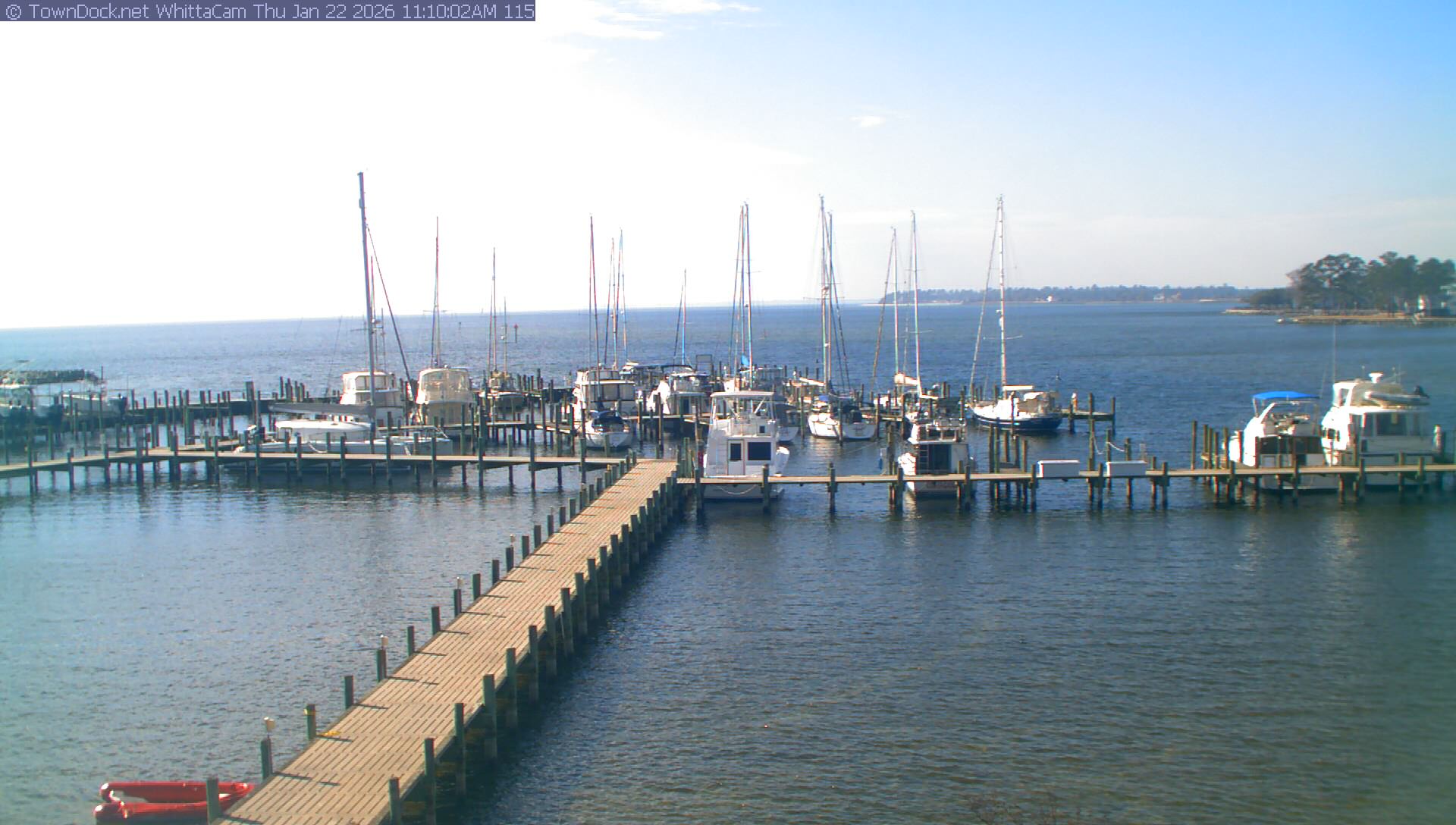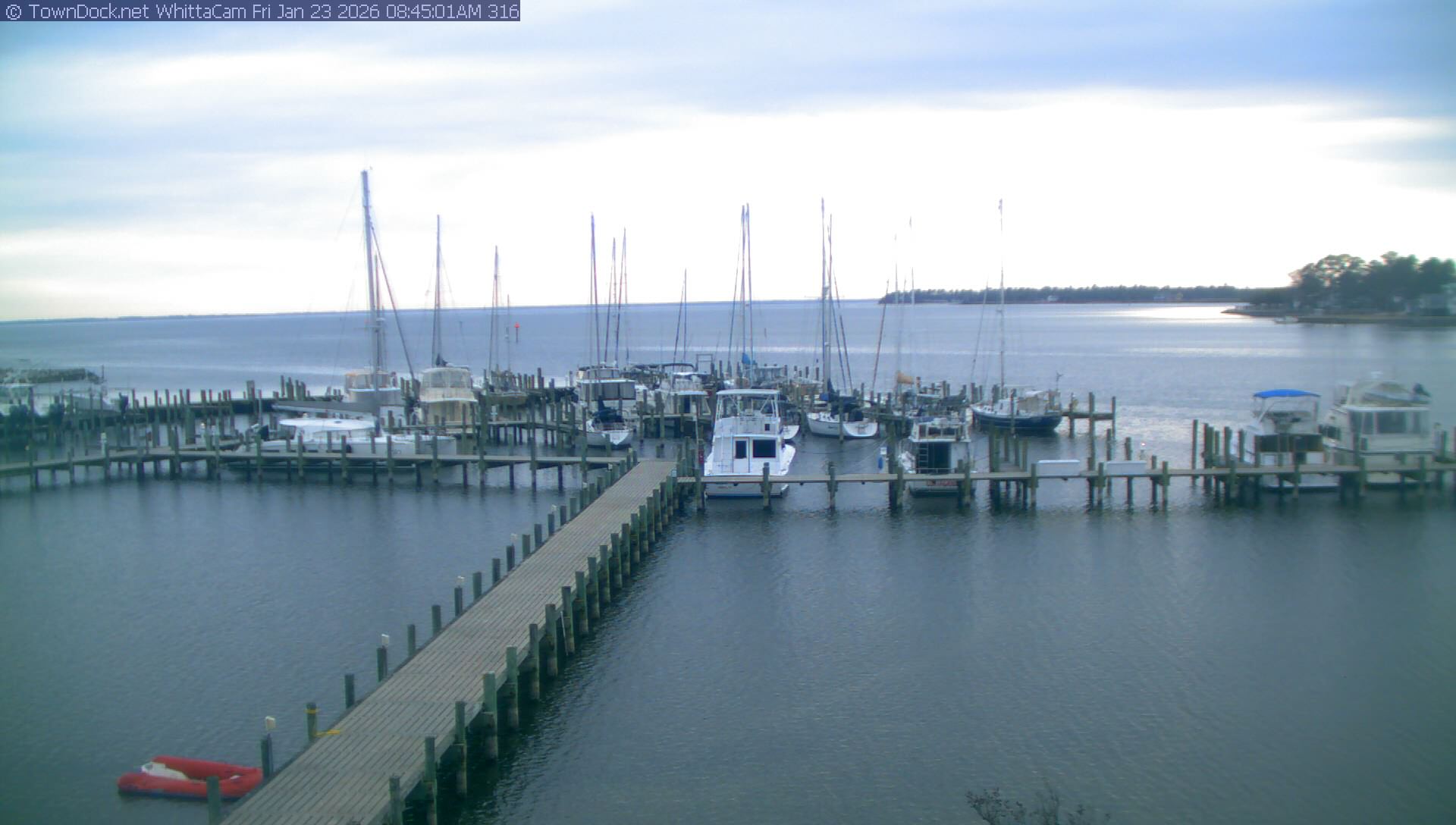 shows Whittaker Pointe Marina and the Whittaker Creek Channel entrance, with the Neuse River in the background. WhittaCam takes a new picture every five minutes from dawn til just before dusk. Click on the image to see a larger version. Once you see that larger version, you can click (see arrow at right) to go back in time and see recent photos. Harbor Cam currently takes photos from 6:00am to 5:00pm.