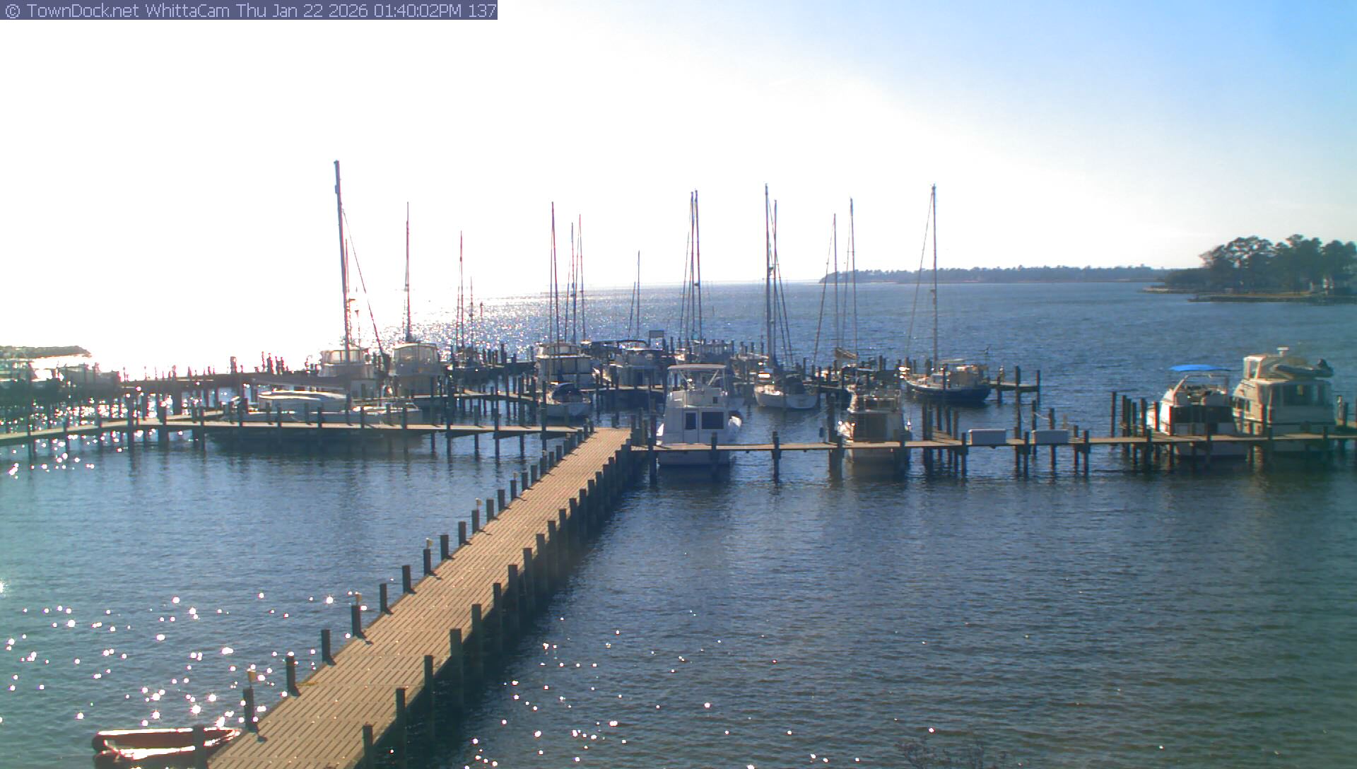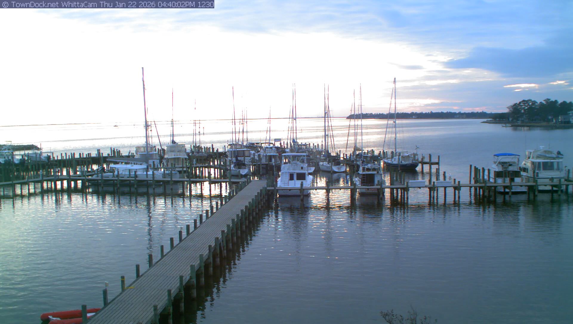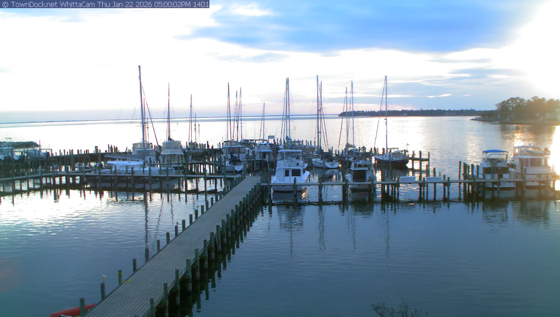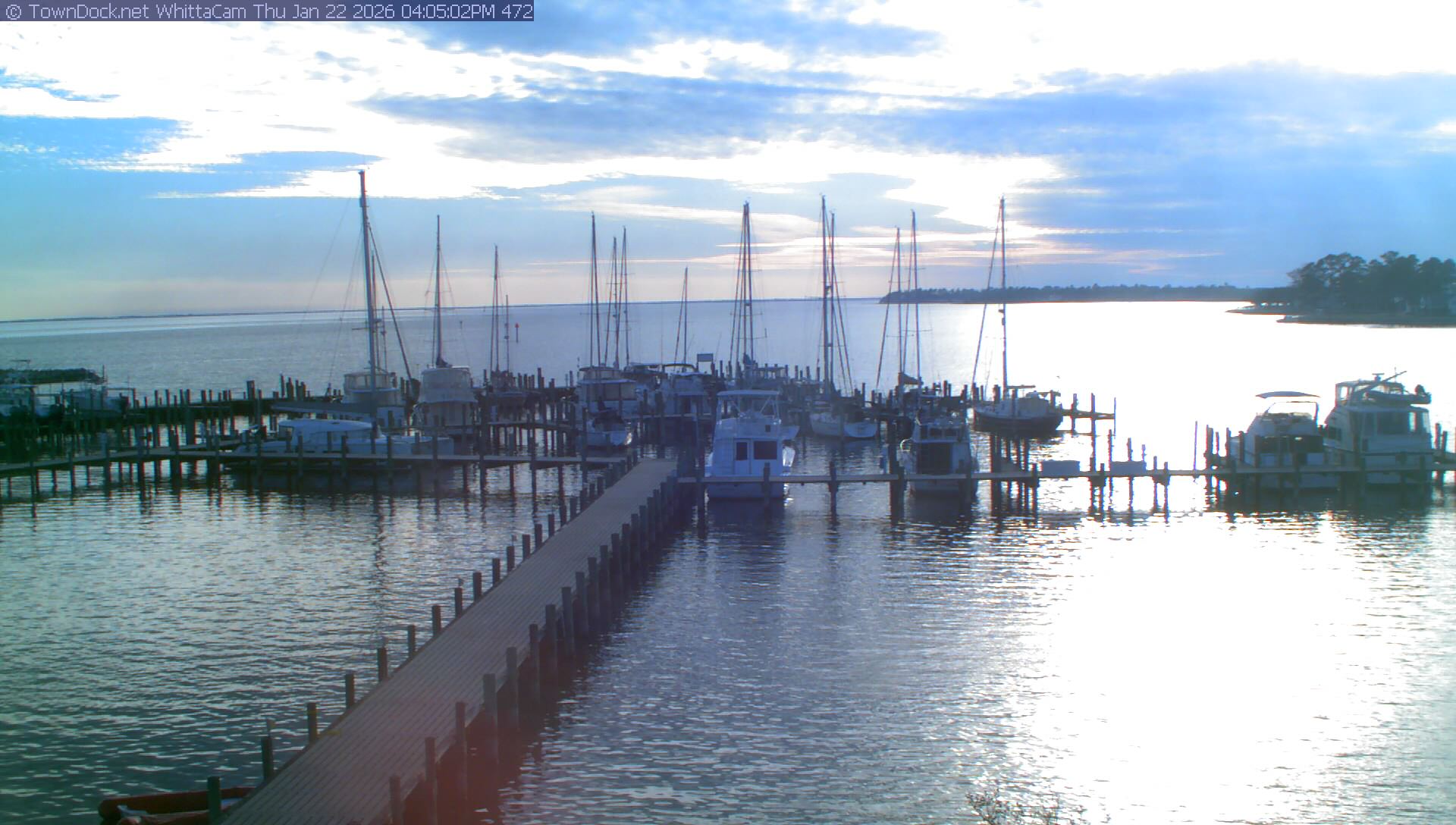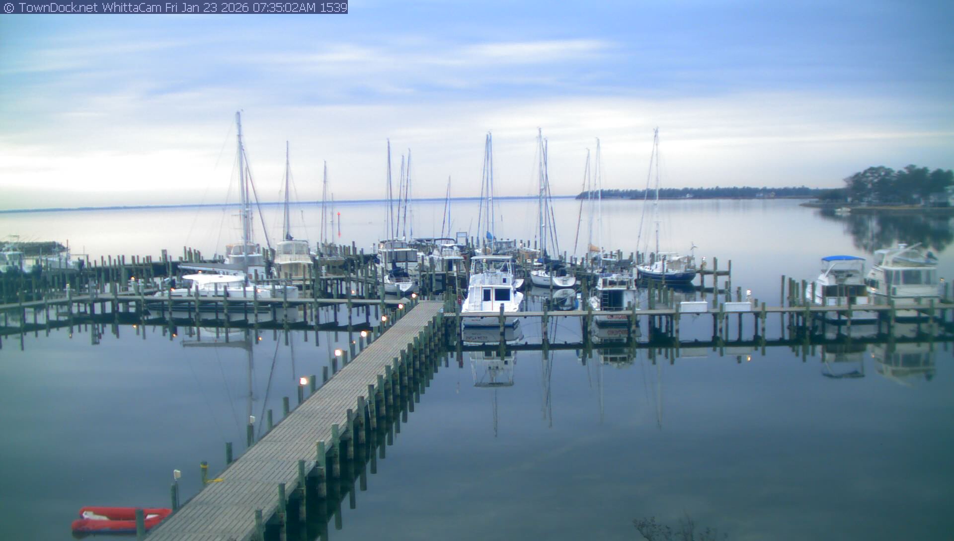 shows Whittaker Pointe Marina and the Whittaker Creek Channel entrance, with the Neuse River in the background. WhittaCam takes a new picture every five minutes from dawn til just before dusk. Click on the image to see a larger version. Once you see that larger version, you can click (see arrow at right) to go back in time and see recent photos. Harbor Cam currently takes photos from 6:00am to 5:00pm.
