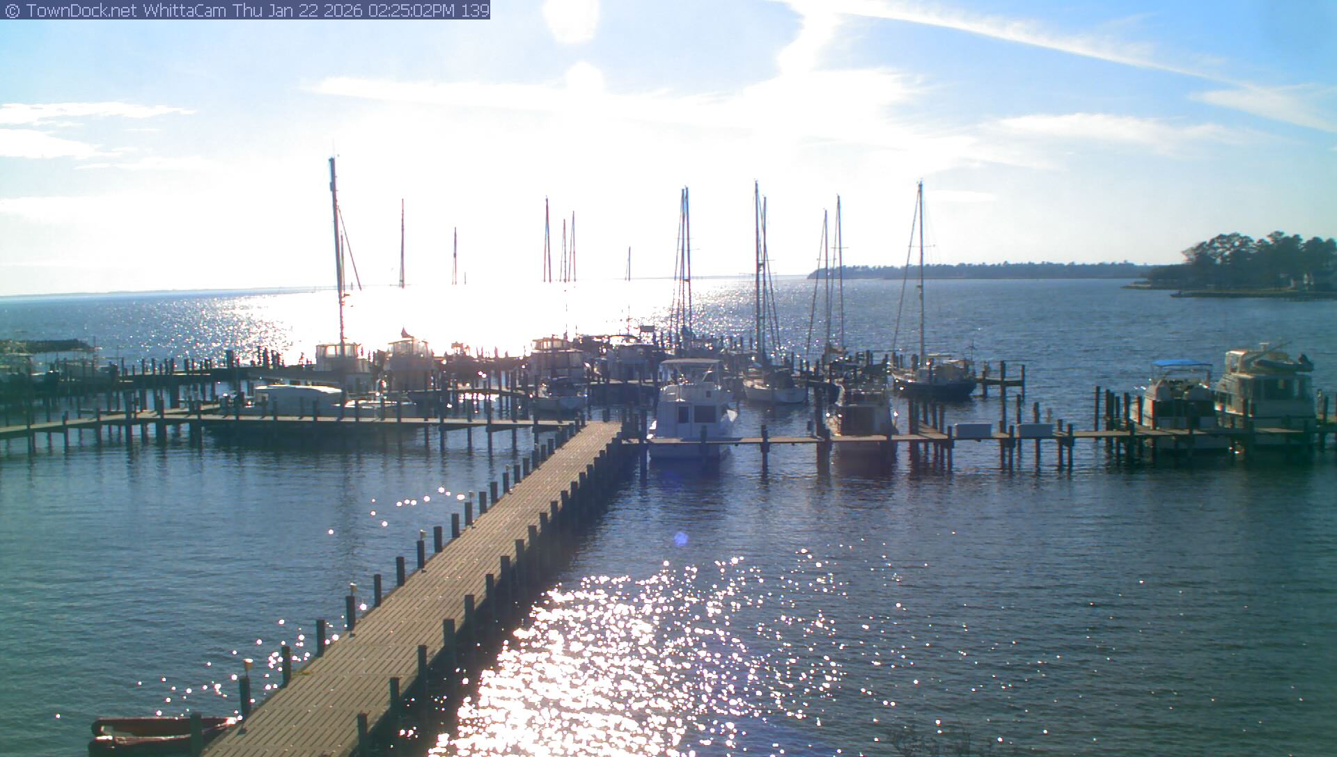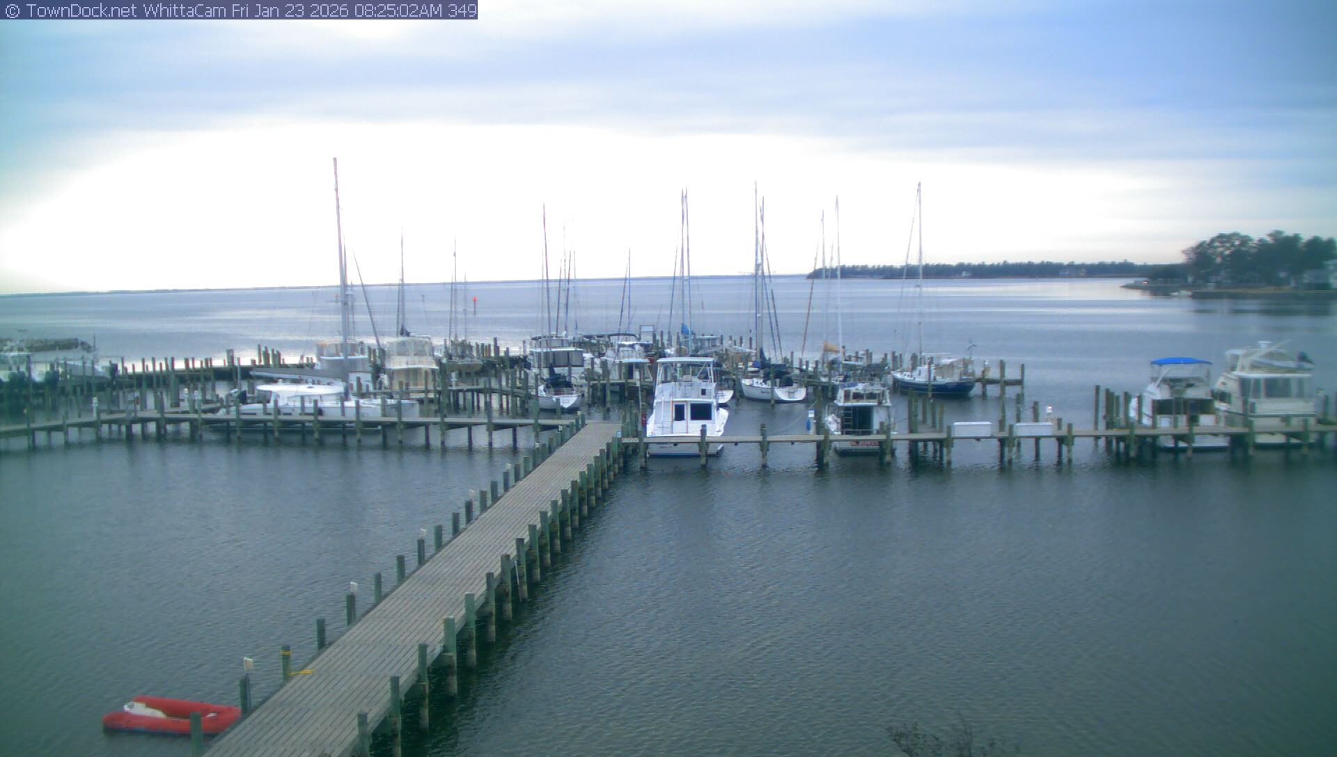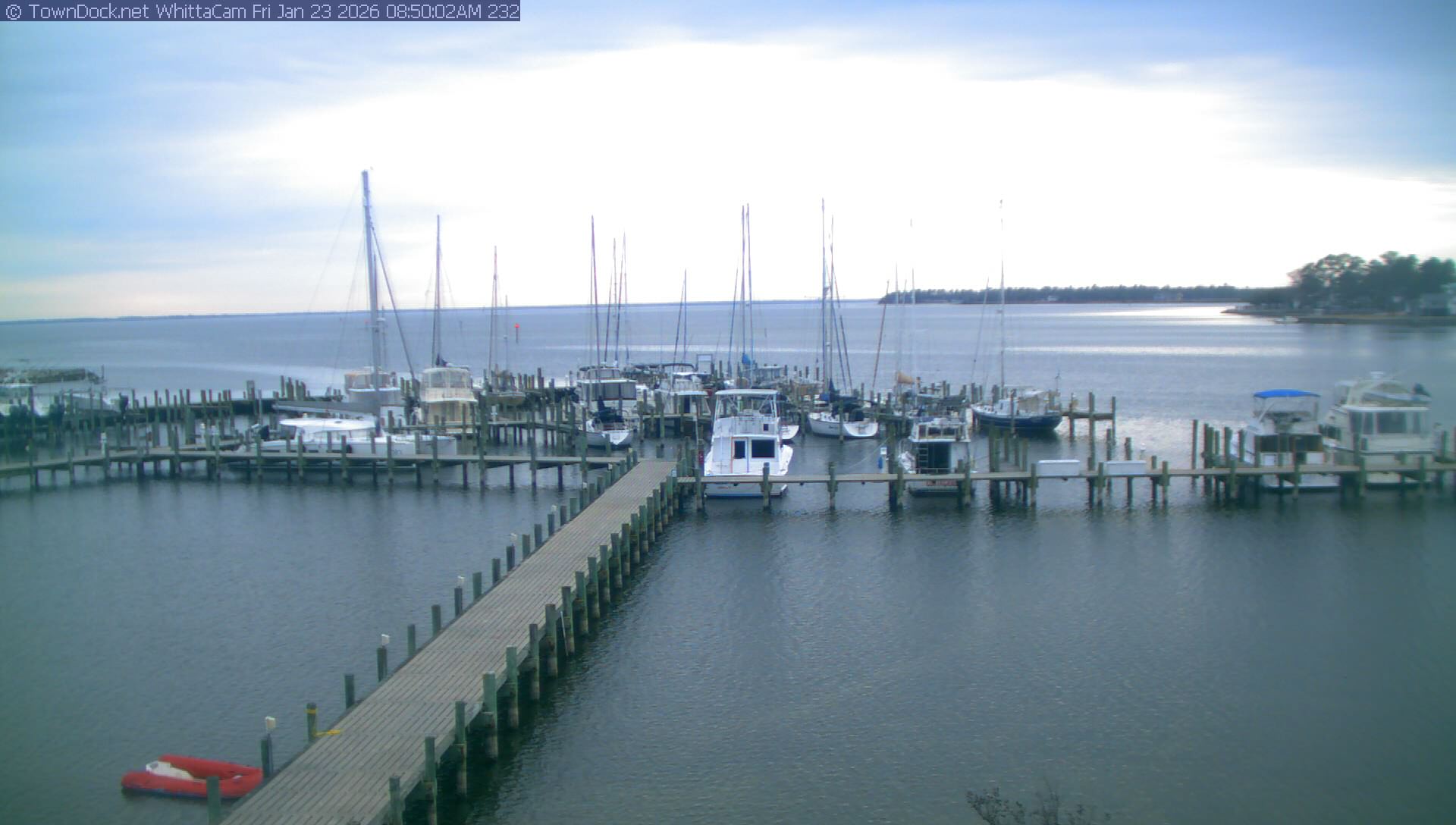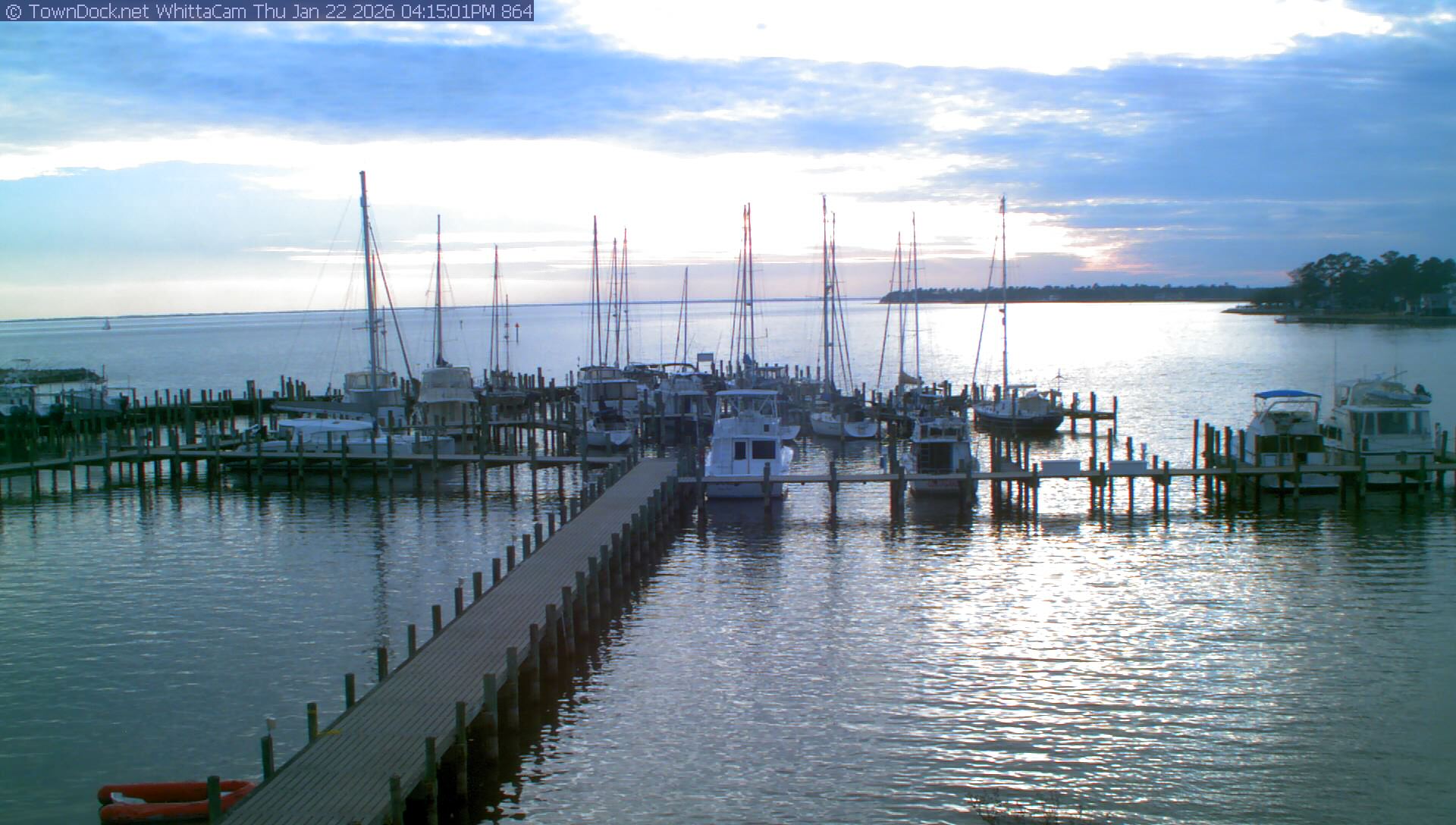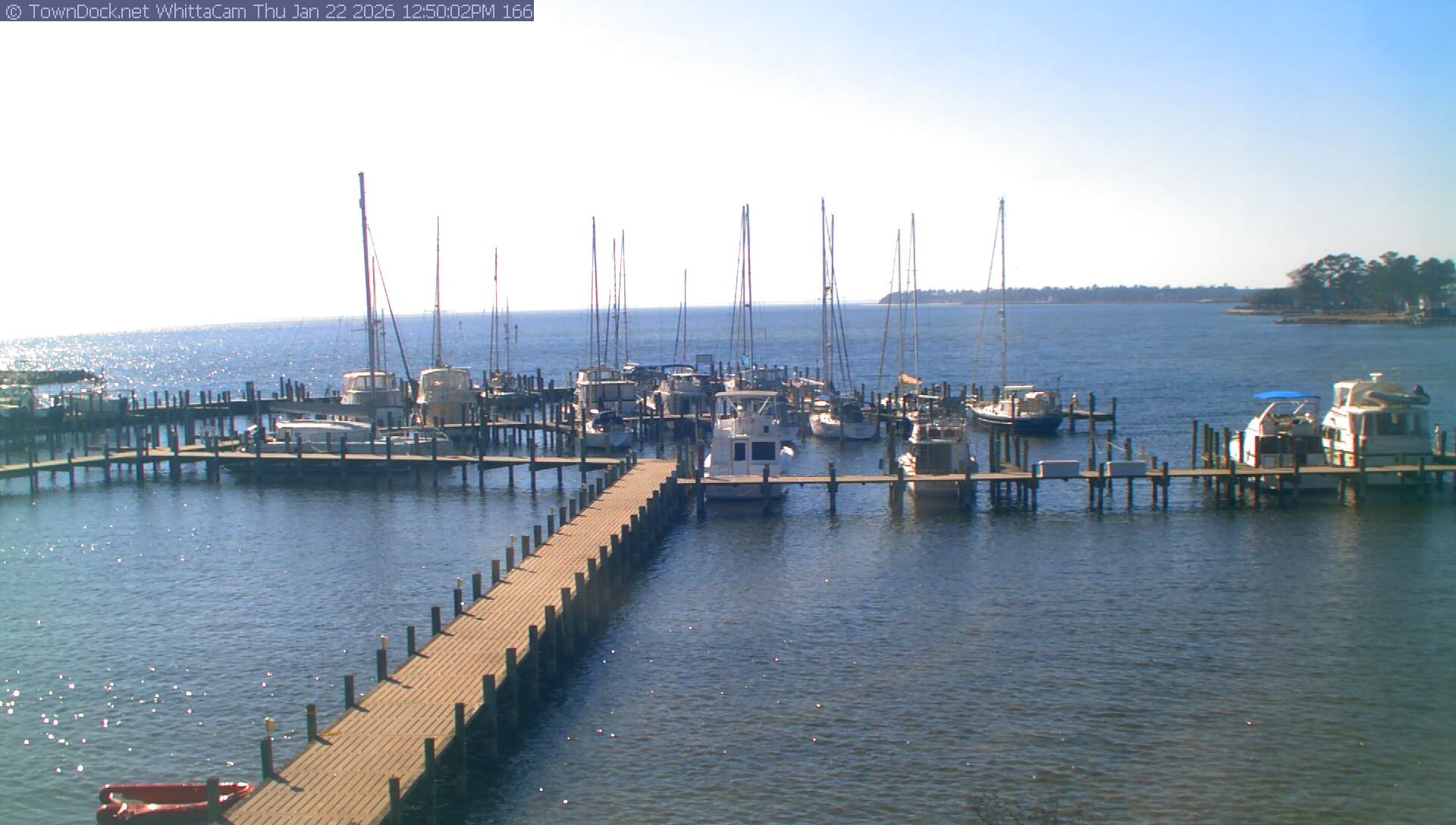 shows Whittaker Pointe Marina and the Whittaker Creek Channel entrance, with the Neuse River in the background. WhittaCam takes a new picture every five minutes from dawn til just before dusk. Click on the image to see a larger version. Once you see that larger version, you can click (see arrow at right) to go back in time and see recent photos. Harbor Cam currently takes photos from 6:00am to 5:00pm.