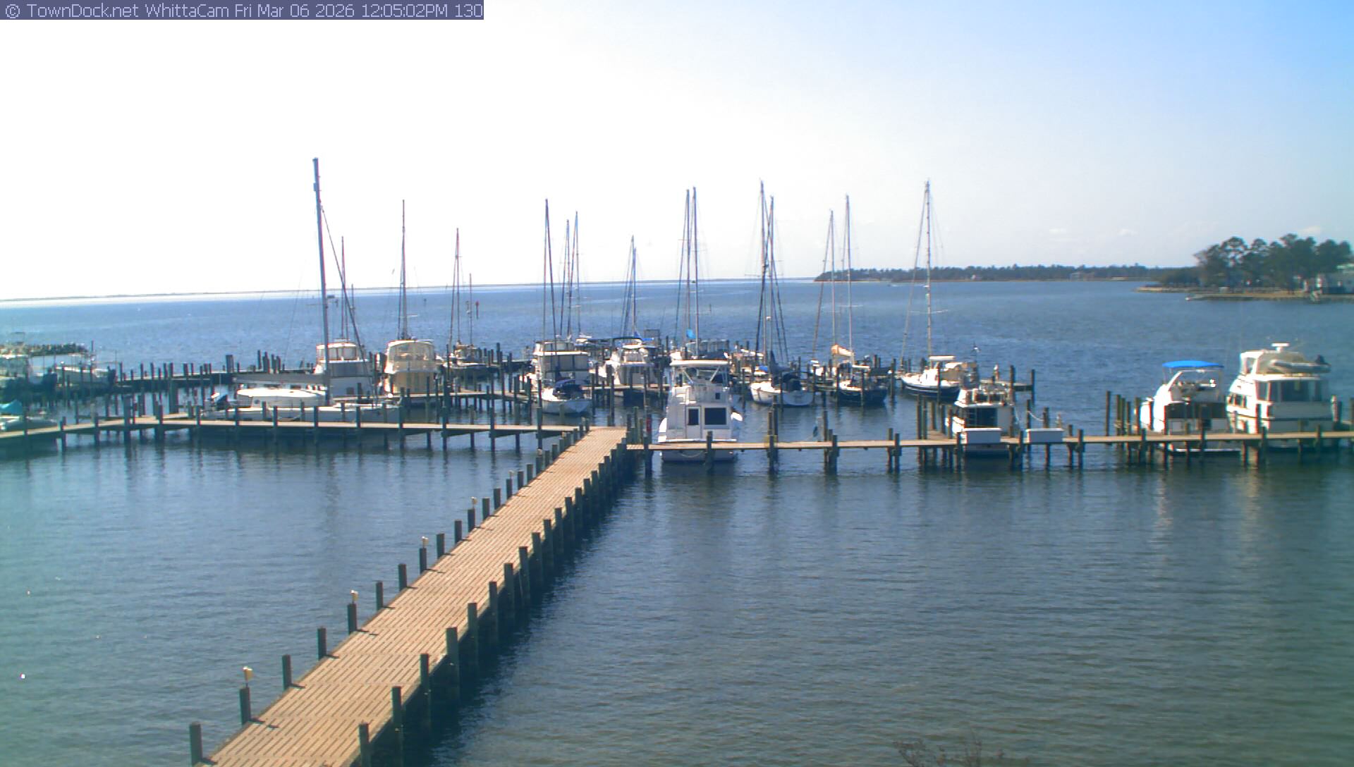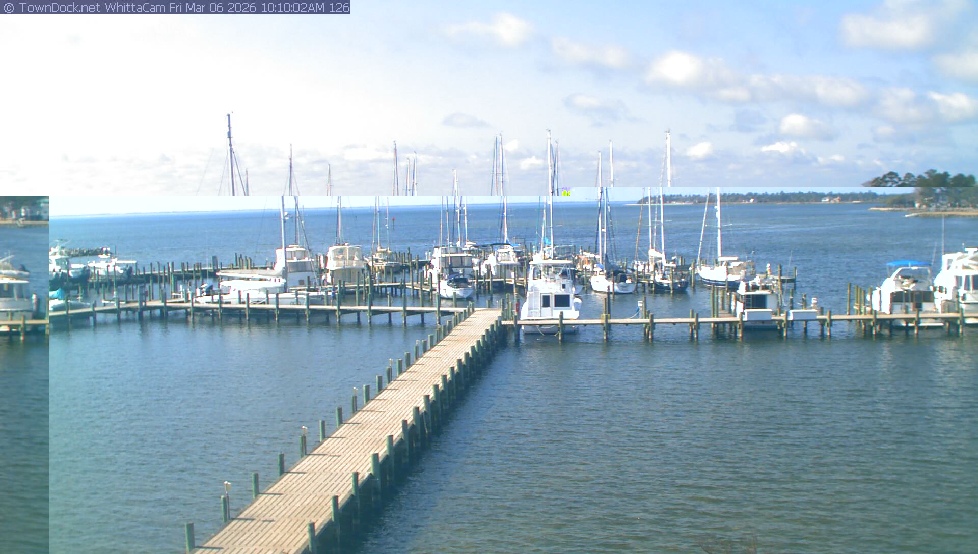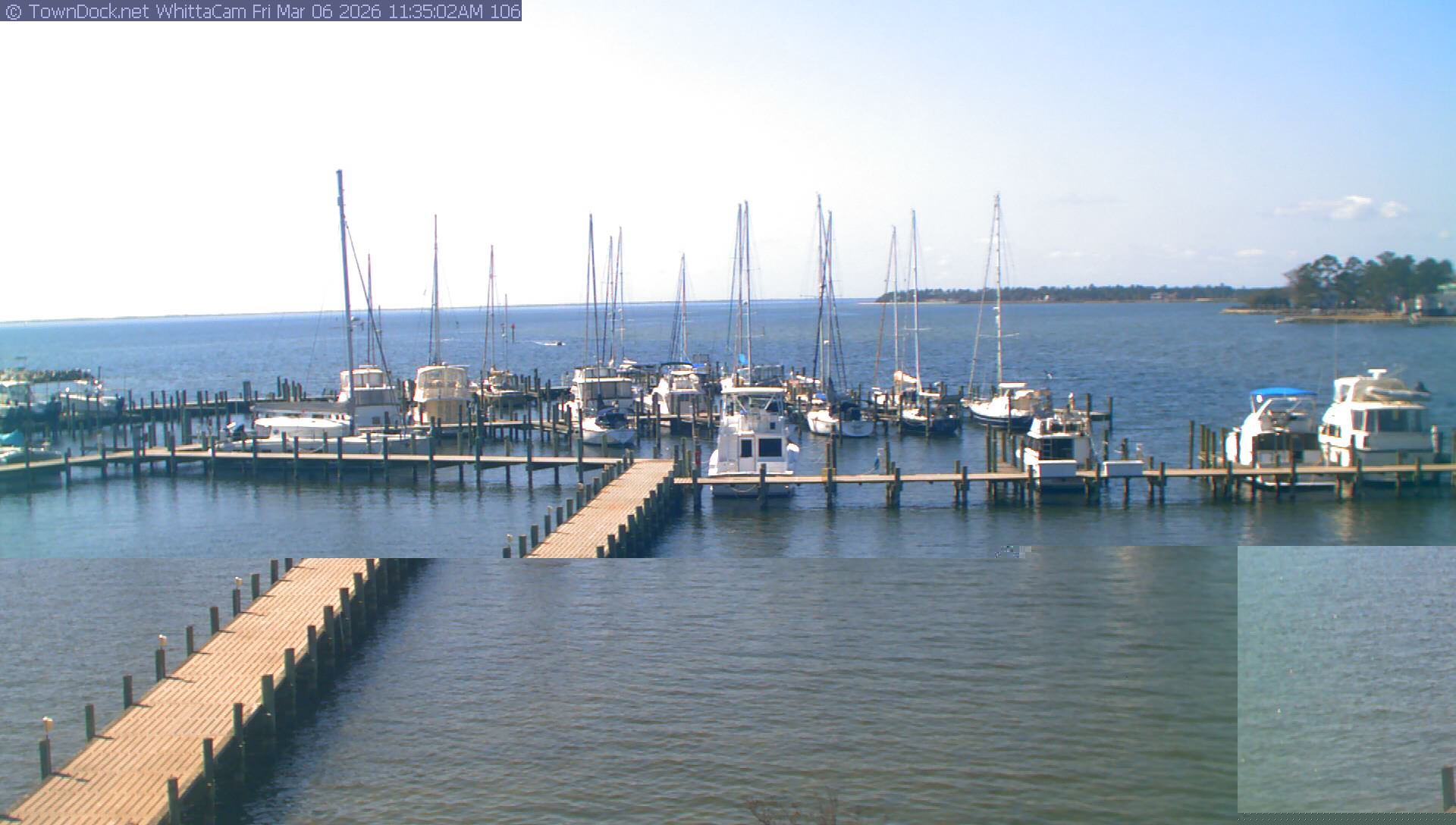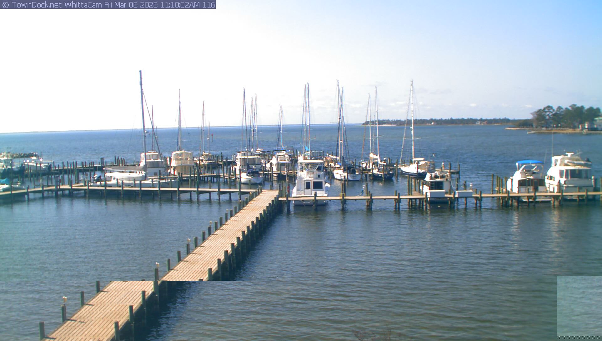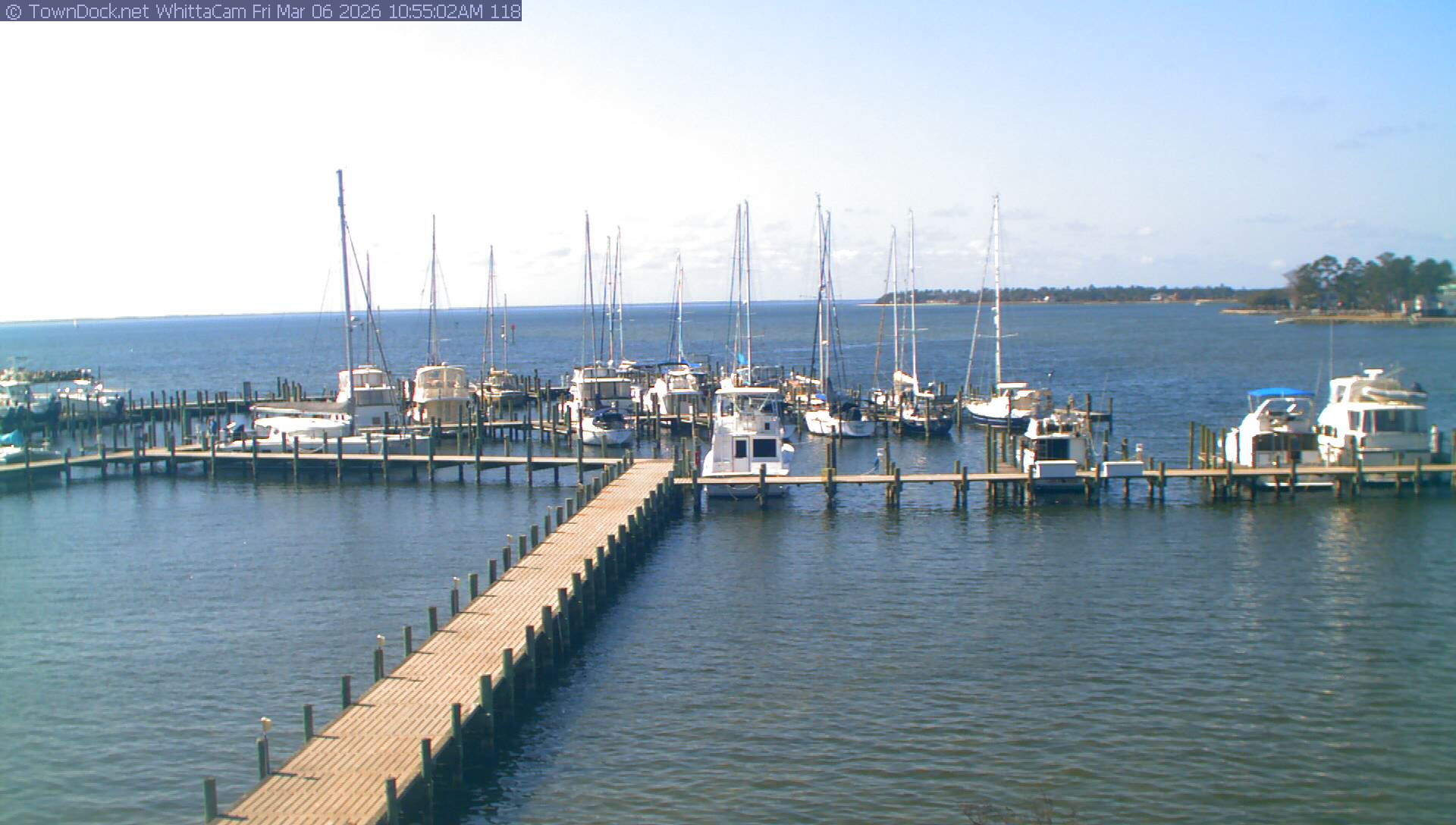 shows Whittaker Pointe Marina and the Whittaker Creek Channel entrance, with the Neuse River in the background. WhittaCam takes a new picture every five minutes from dawn til just before dusk. Click on the image to see a larger version. Once you see that larger version, you can click (see arrow at right) to go back in time and see recent photos. Harbor Cam currently takes photos from 6:30am to 5:30pm.