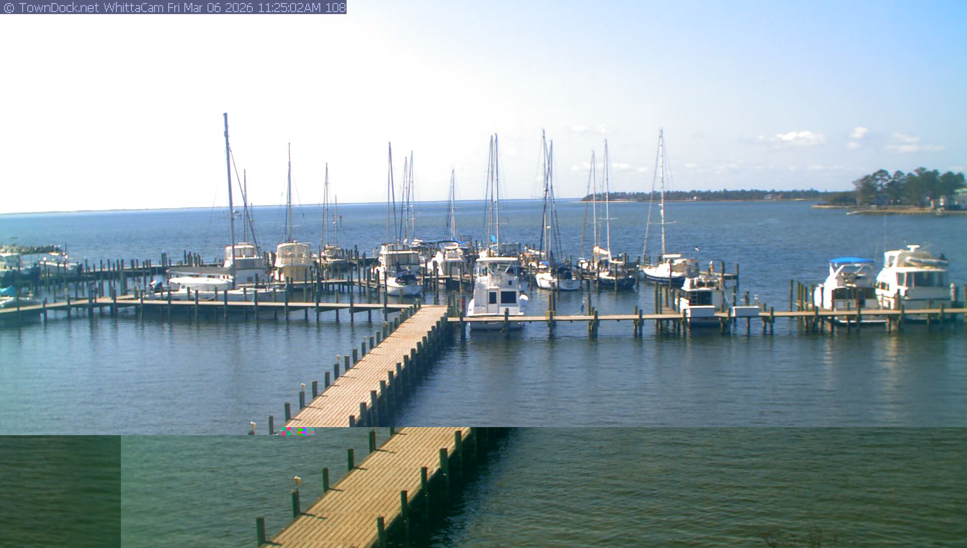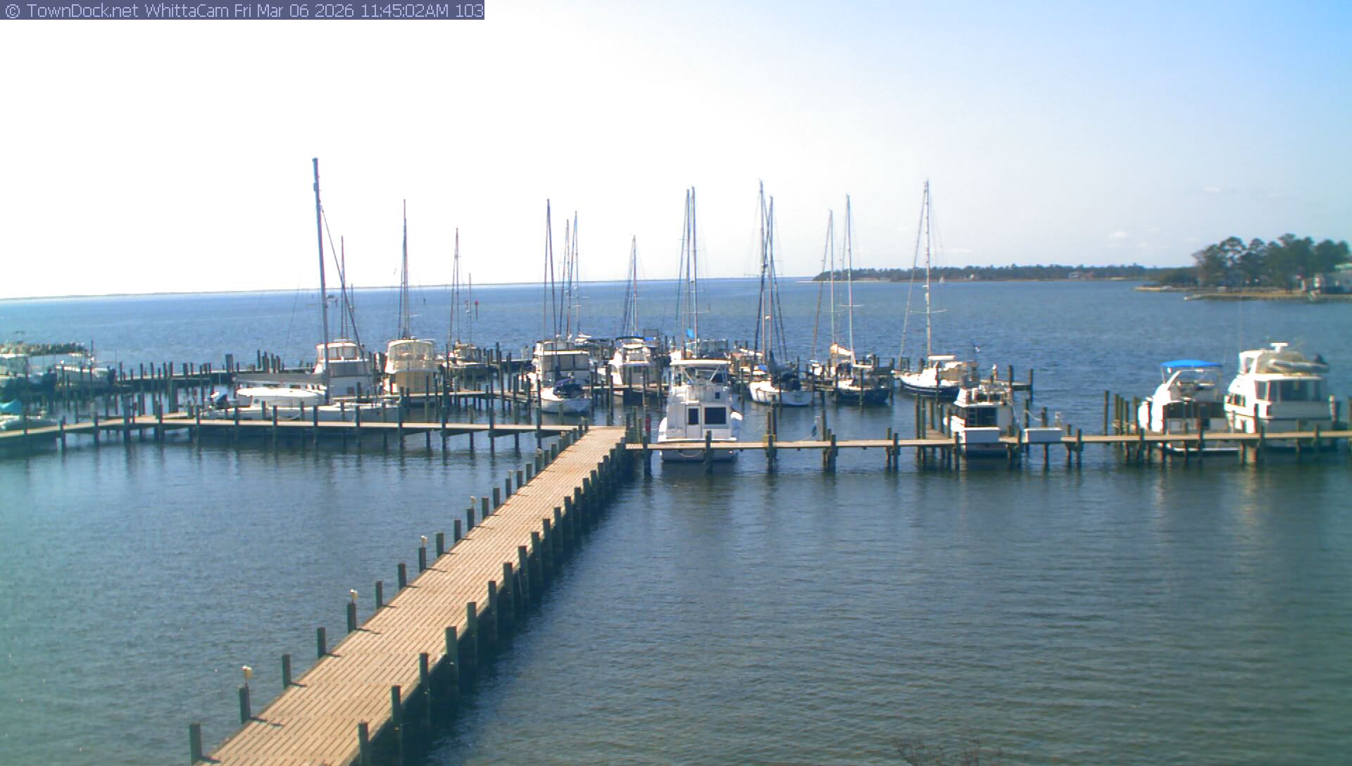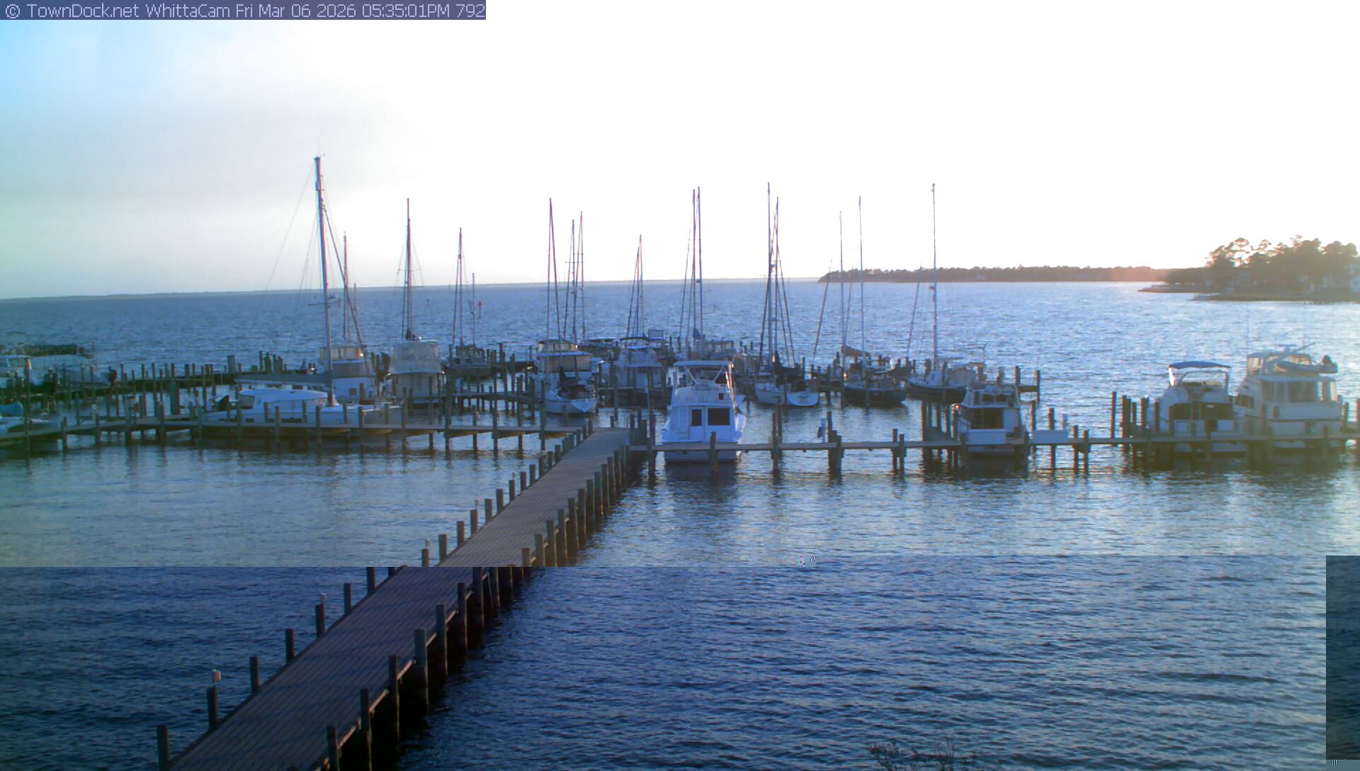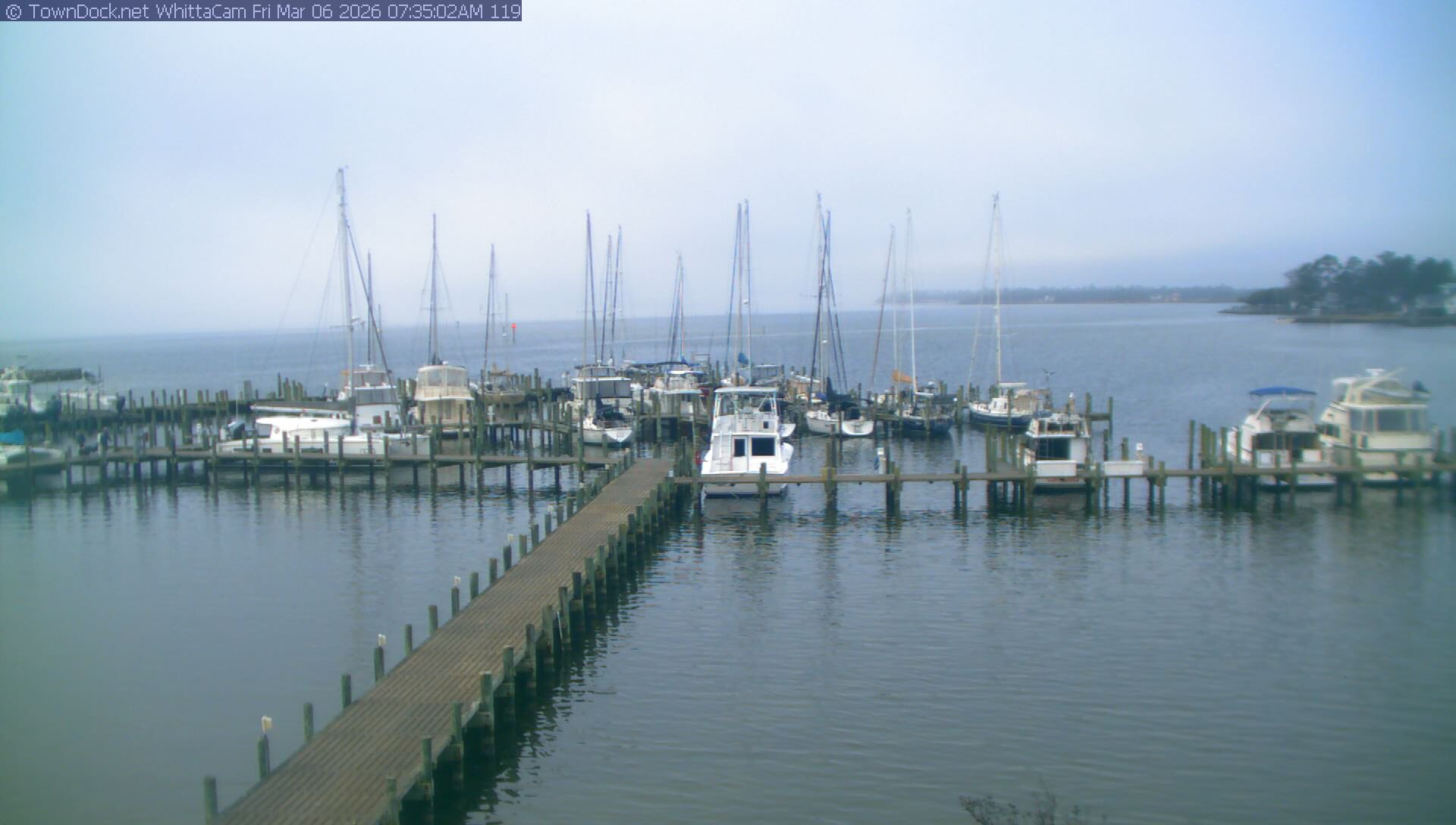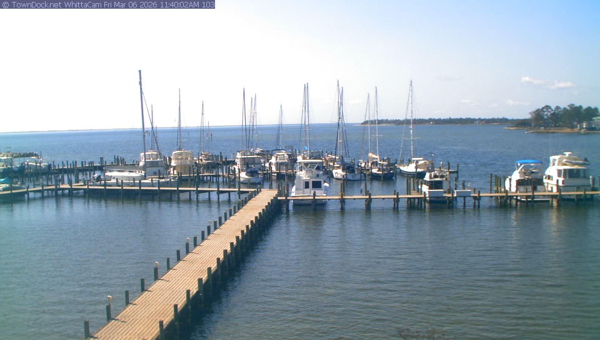 shows Whittaker Pointe Marina and the Whittaker Creek Channel entrance, with the Neuse River in the background. WhittaCam takes a new picture every five minutes from dawn til just before dusk. Click on the image to see a larger version. Once you see that larger version, you can click (see arrow at right) to go back in time and see recent photos. Harbor Cam currently takes photos from 6:30am to 5:30pm.
