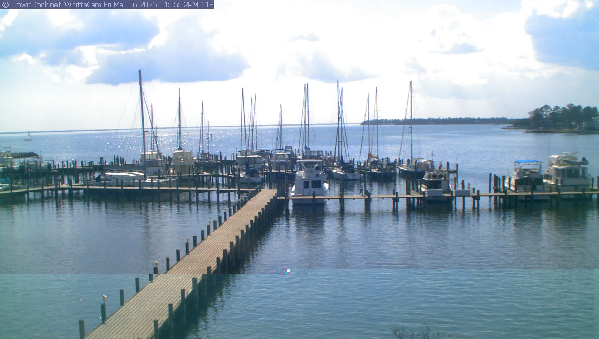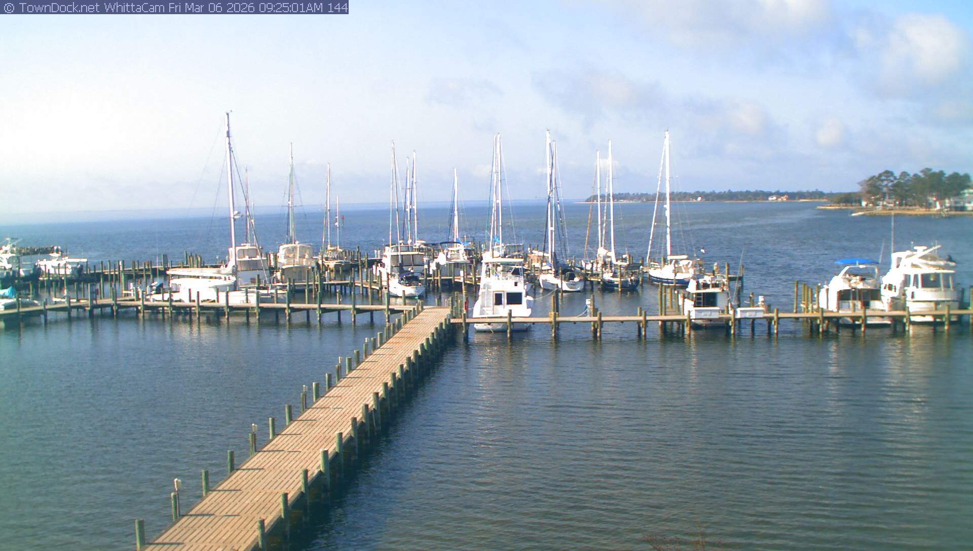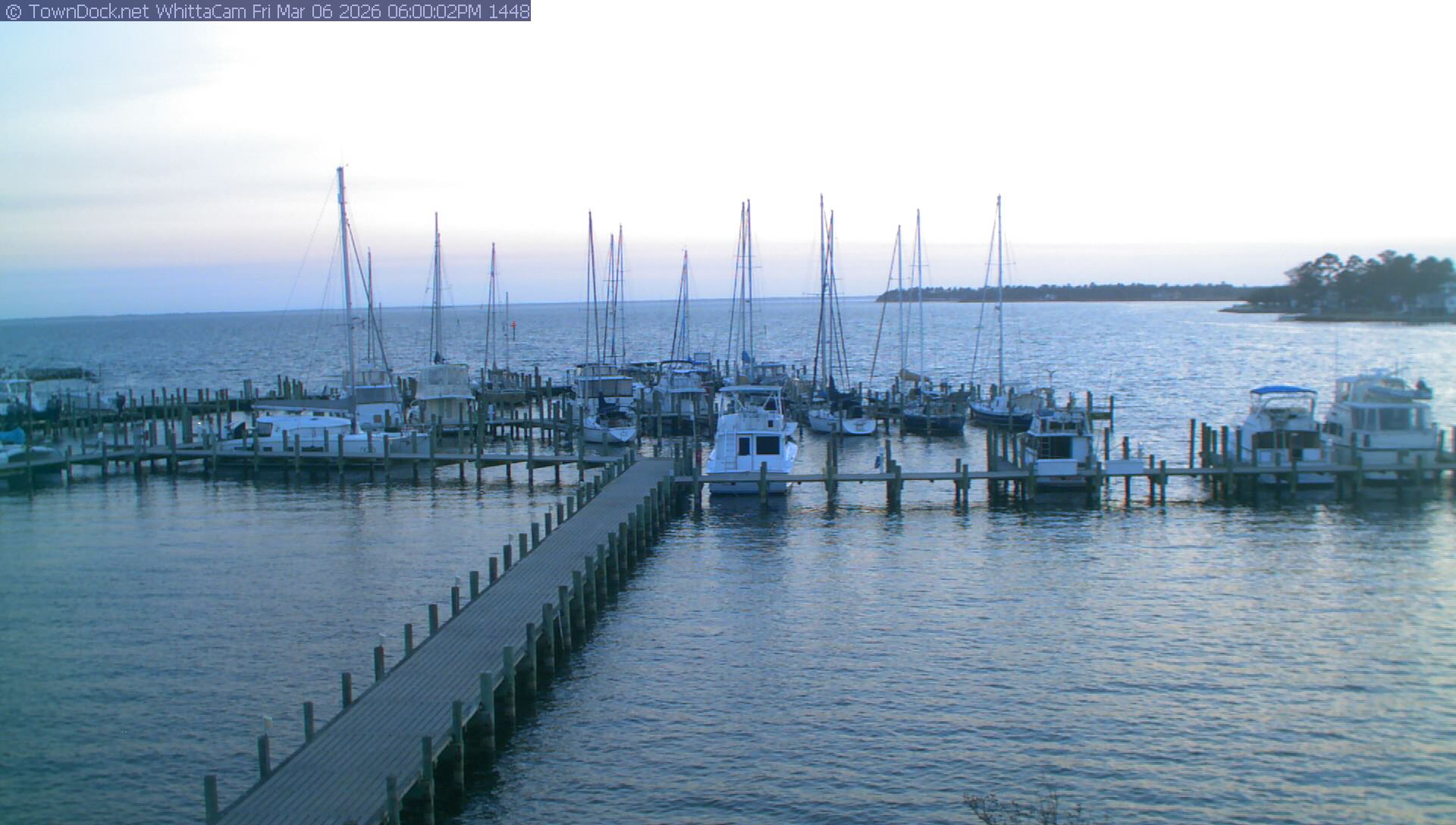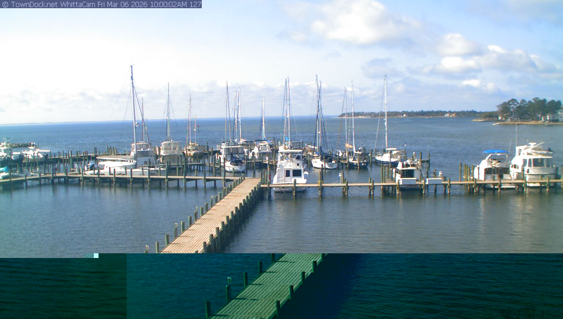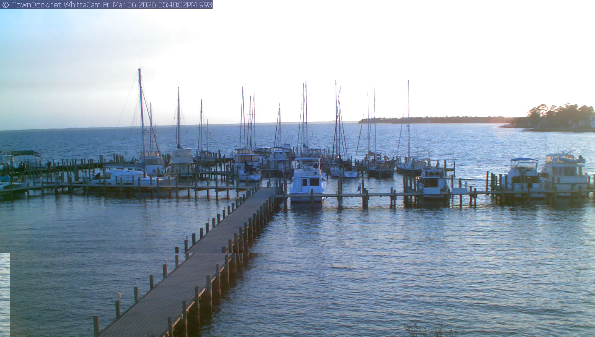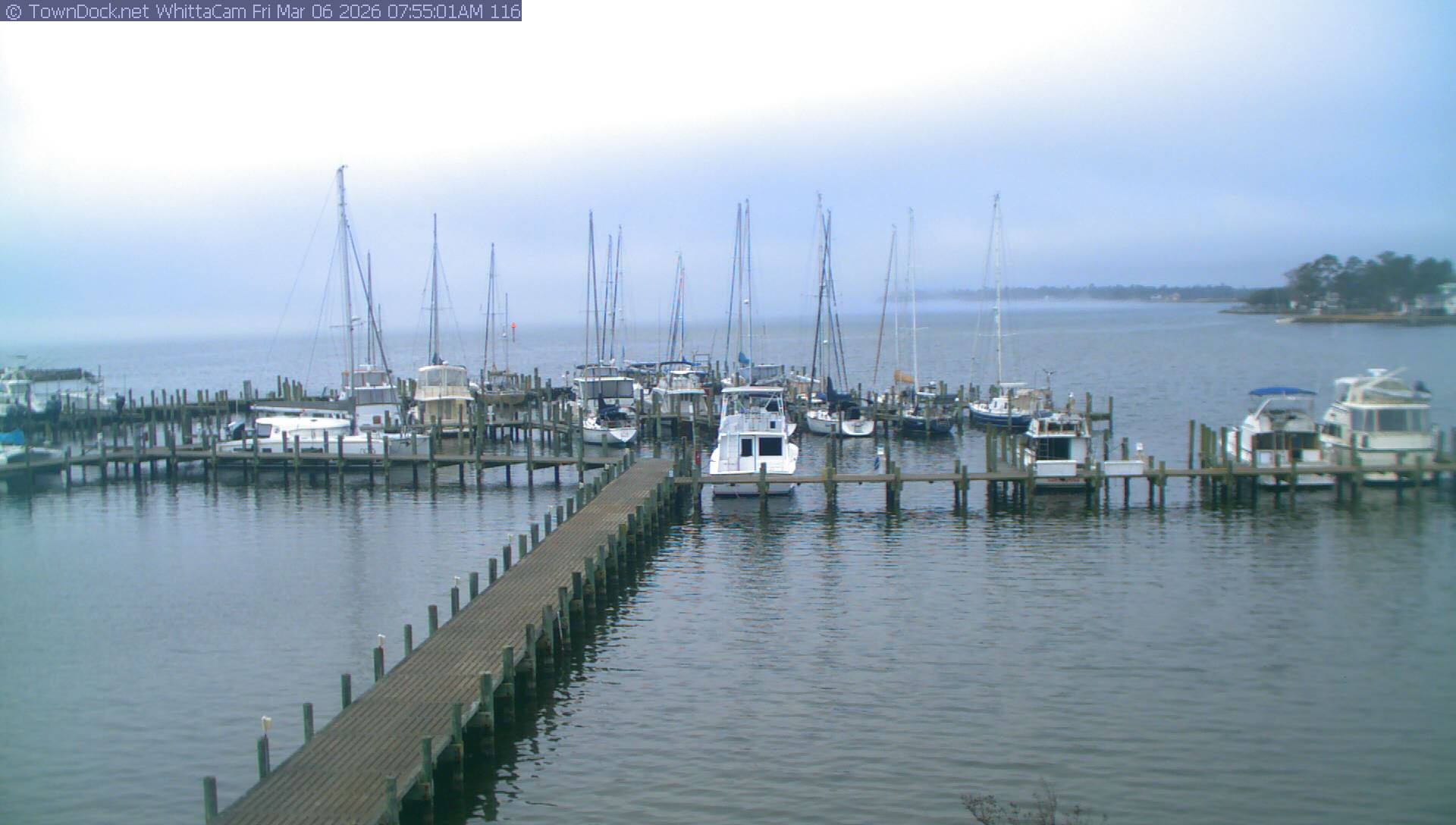 shows Whittaker Pointe Marina and the Whittaker Creek Channel entrance, with the Neuse River in the background. WhittaCam takes a new picture every five minutes from dawn til just before dusk. Click on the image to see a larger version. Once you see that larger version, you can click (see arrow at right) to go back in time and see recent photos. Harbor Cam currently takes photos from 6:30am to 5:30pm.