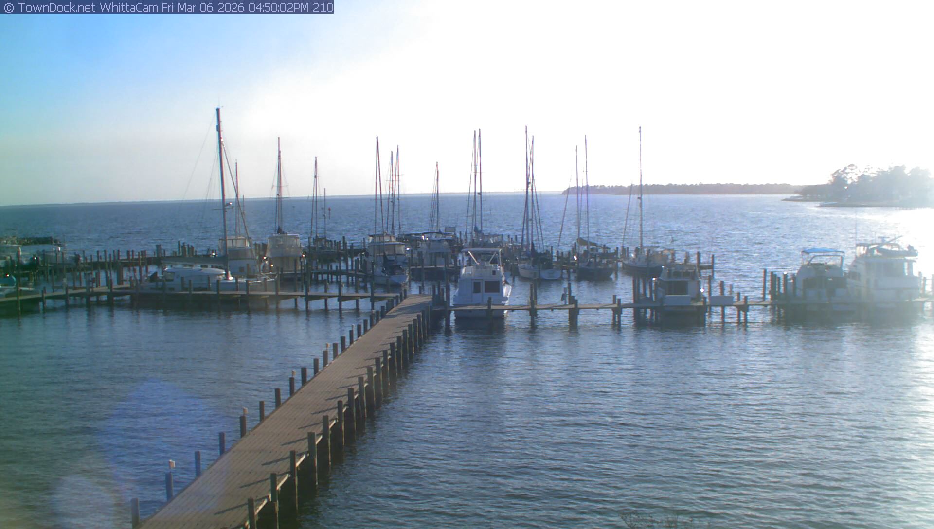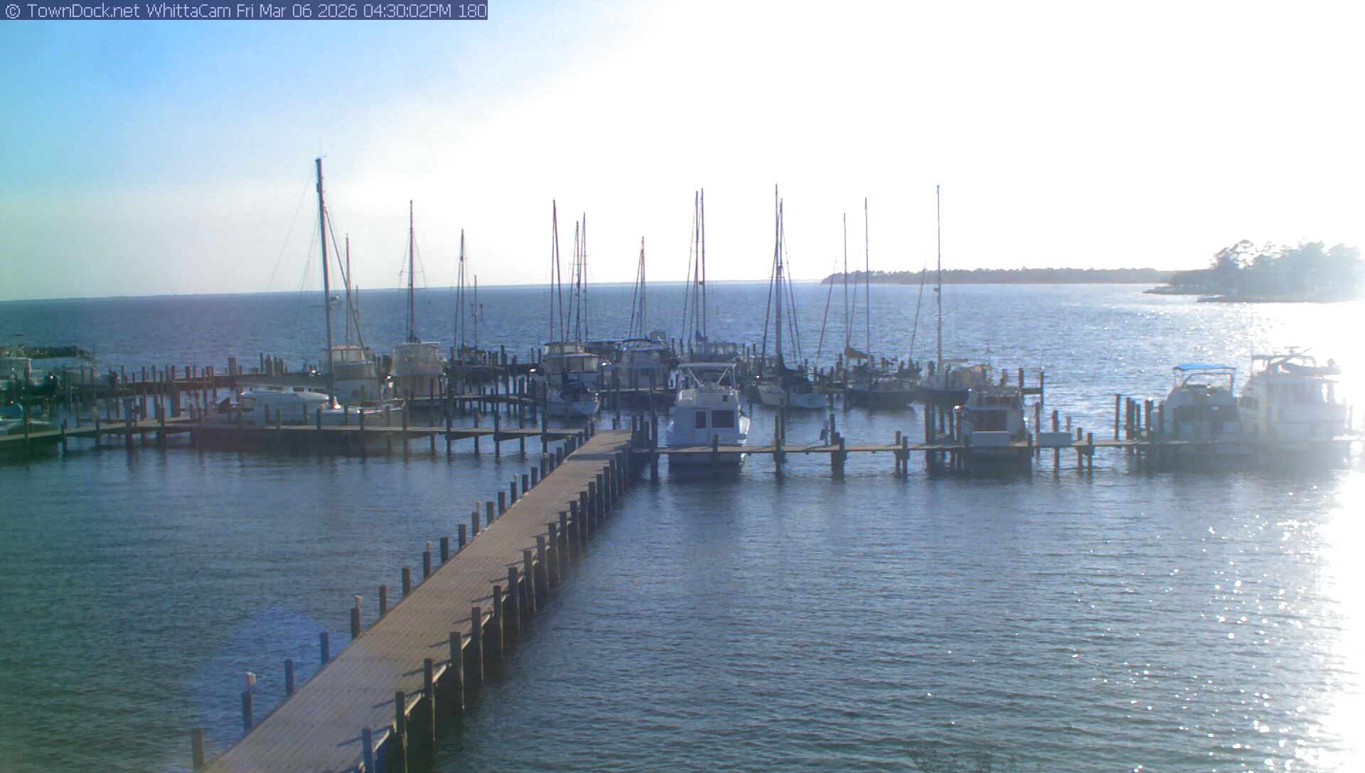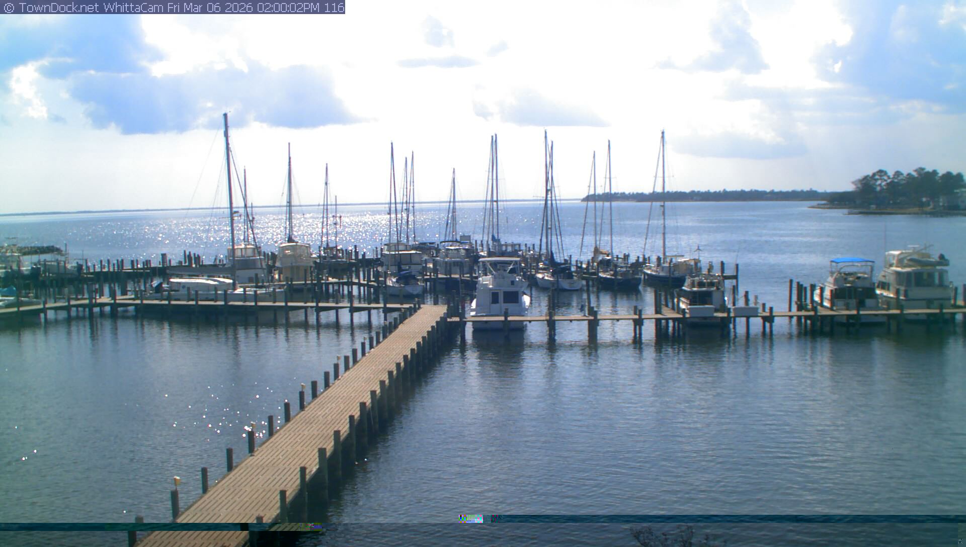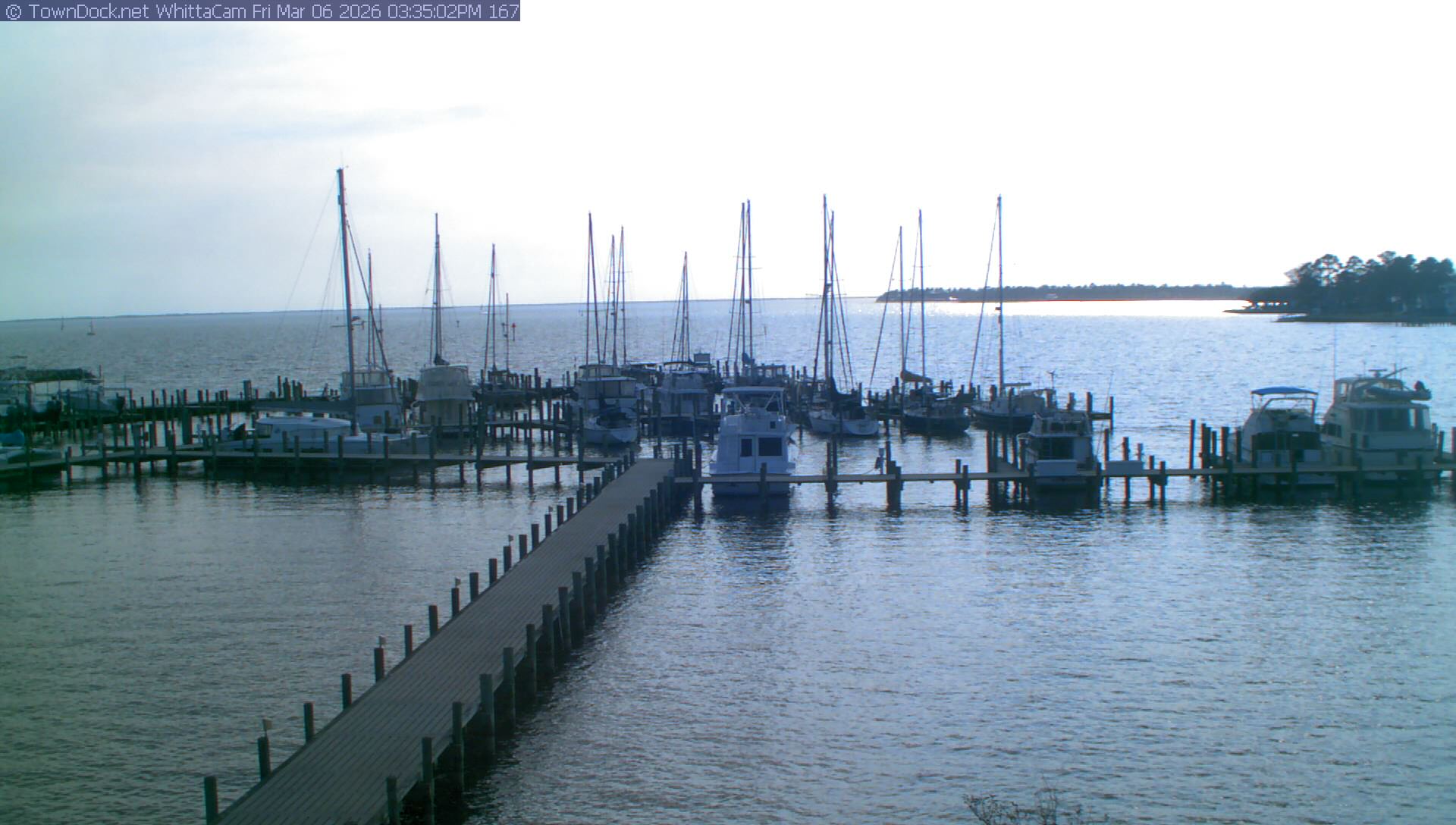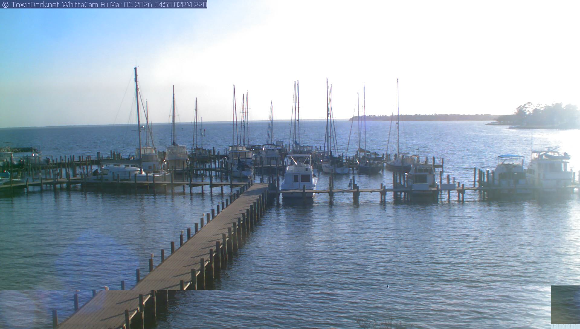 shows Whittaker Pointe Marina and the Whittaker Creek Channel entrance, with the Neuse River in the background. WhittaCam takes a new picture every five minutes from dawn til just before dusk. Click on the image to see a larger version. Once you see that larger version, you can click (see arrow at right) to go back in time and see recent photos. Harbor Cam currently takes photos from 6:30am to 5:30pm.