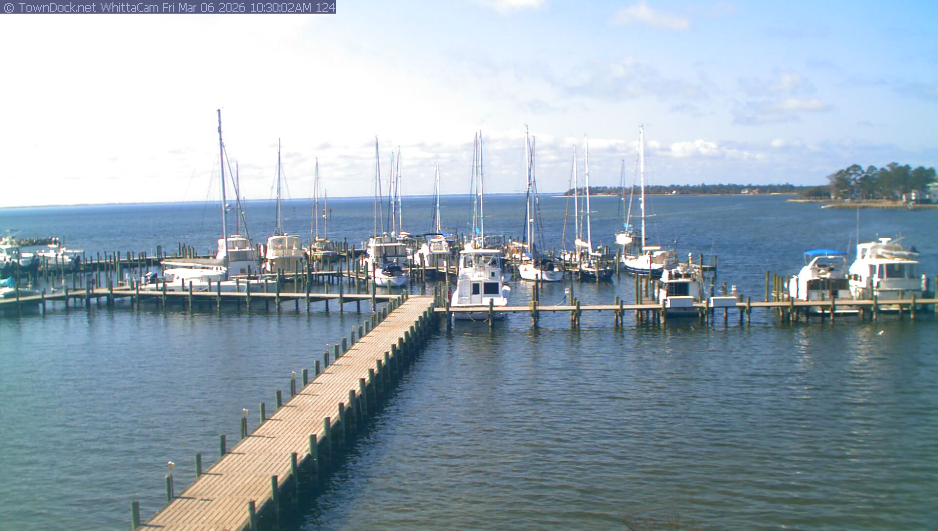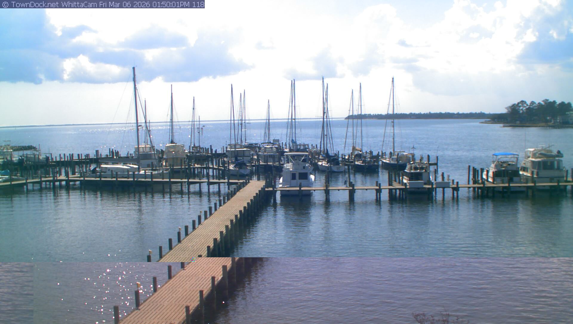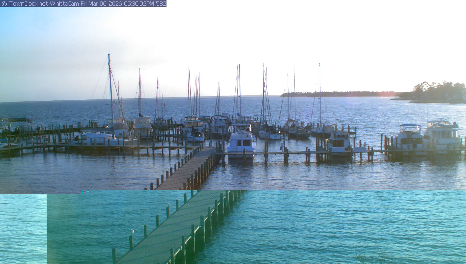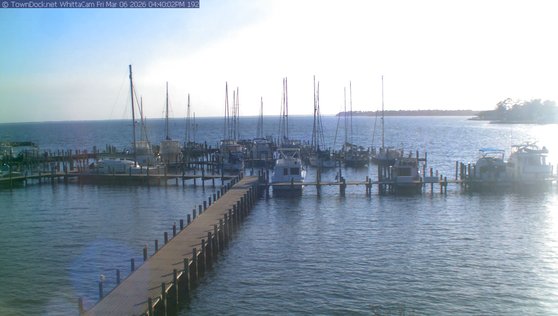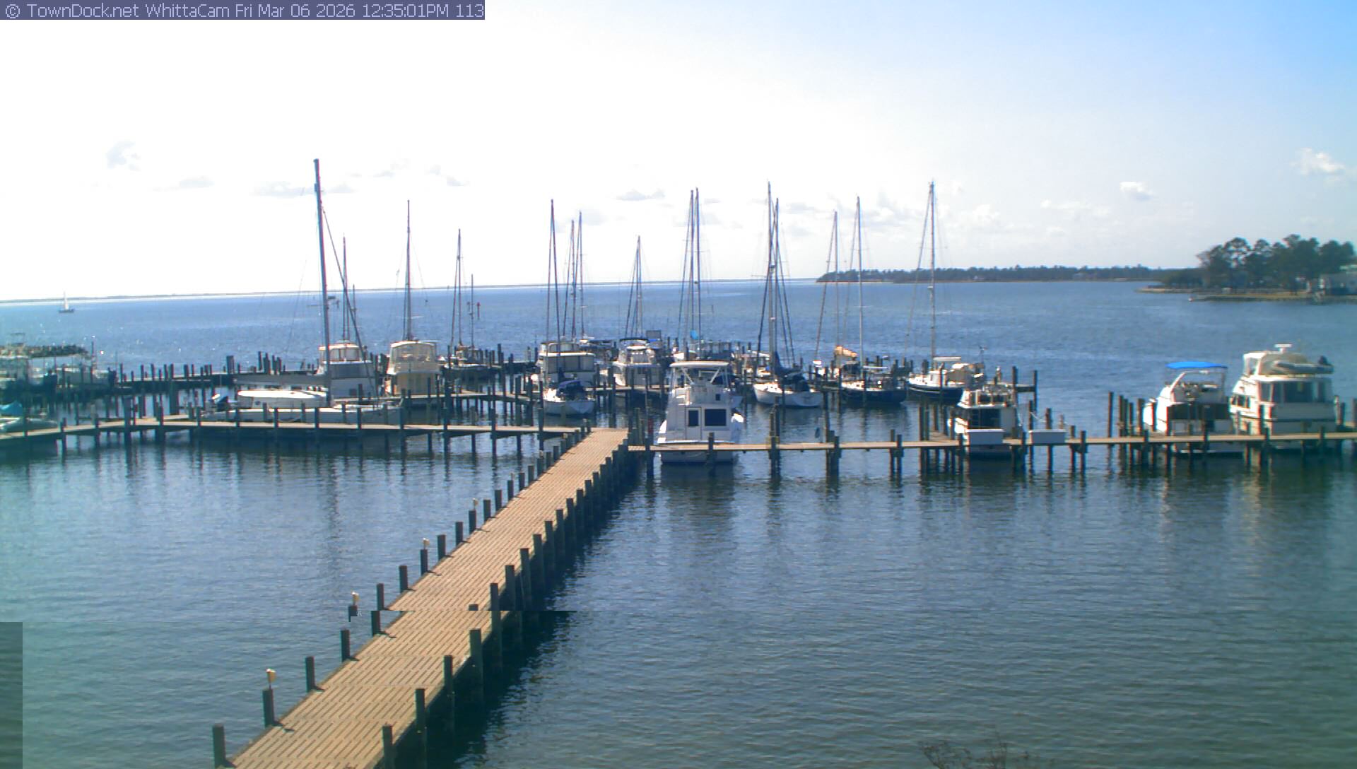 shows Whittaker Pointe Marina and the Whittaker Creek Channel entrance, with the Neuse River in the background. WhittaCam takes a new picture every five minutes from dawn til just before dusk. Click on the image to see a larger version. Once you see that larger version, you can click (see arrow at right) to go back in time and see recent photos. Harbor Cam currently takes photos from 6:30am to 5:30pm.