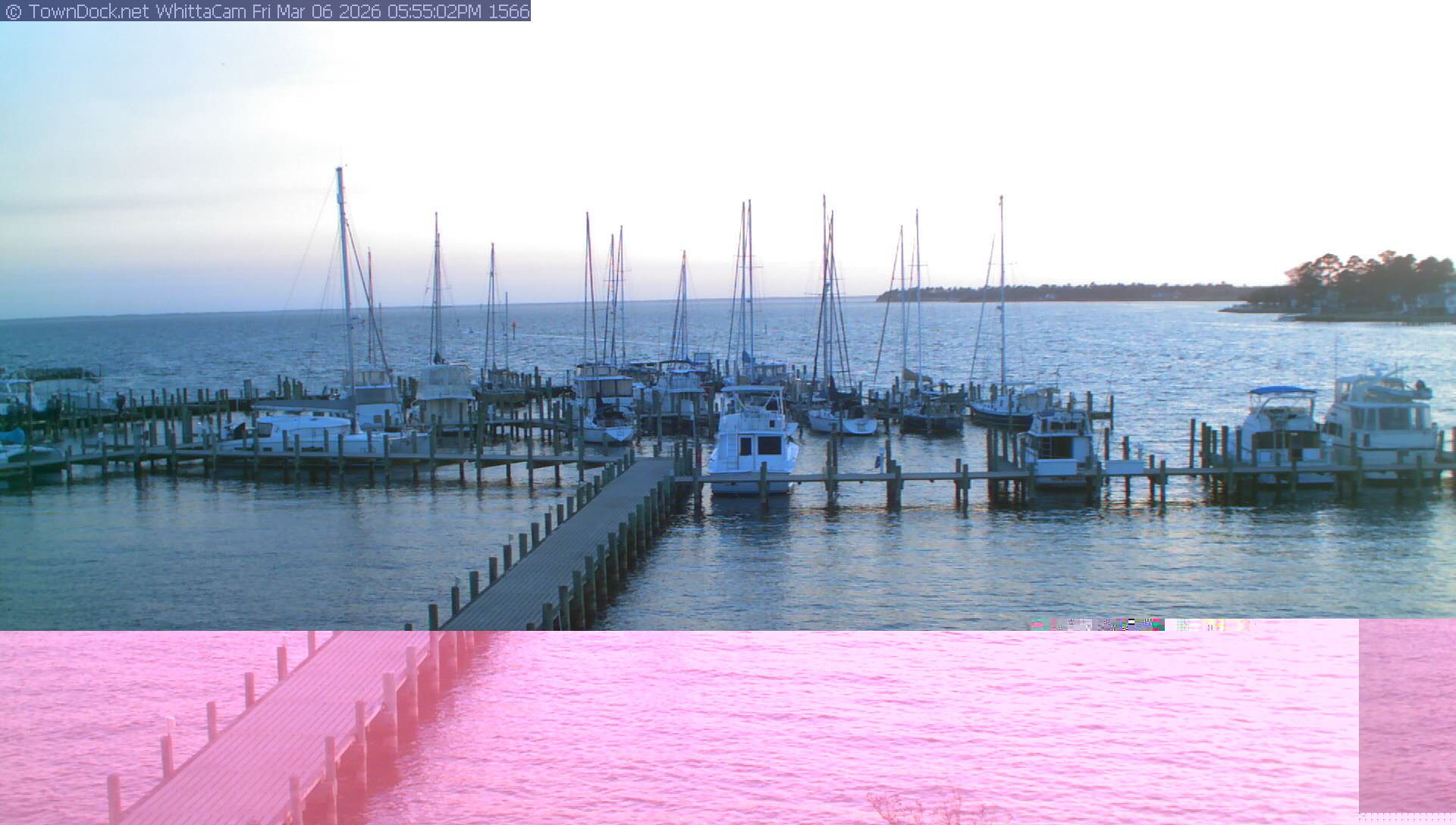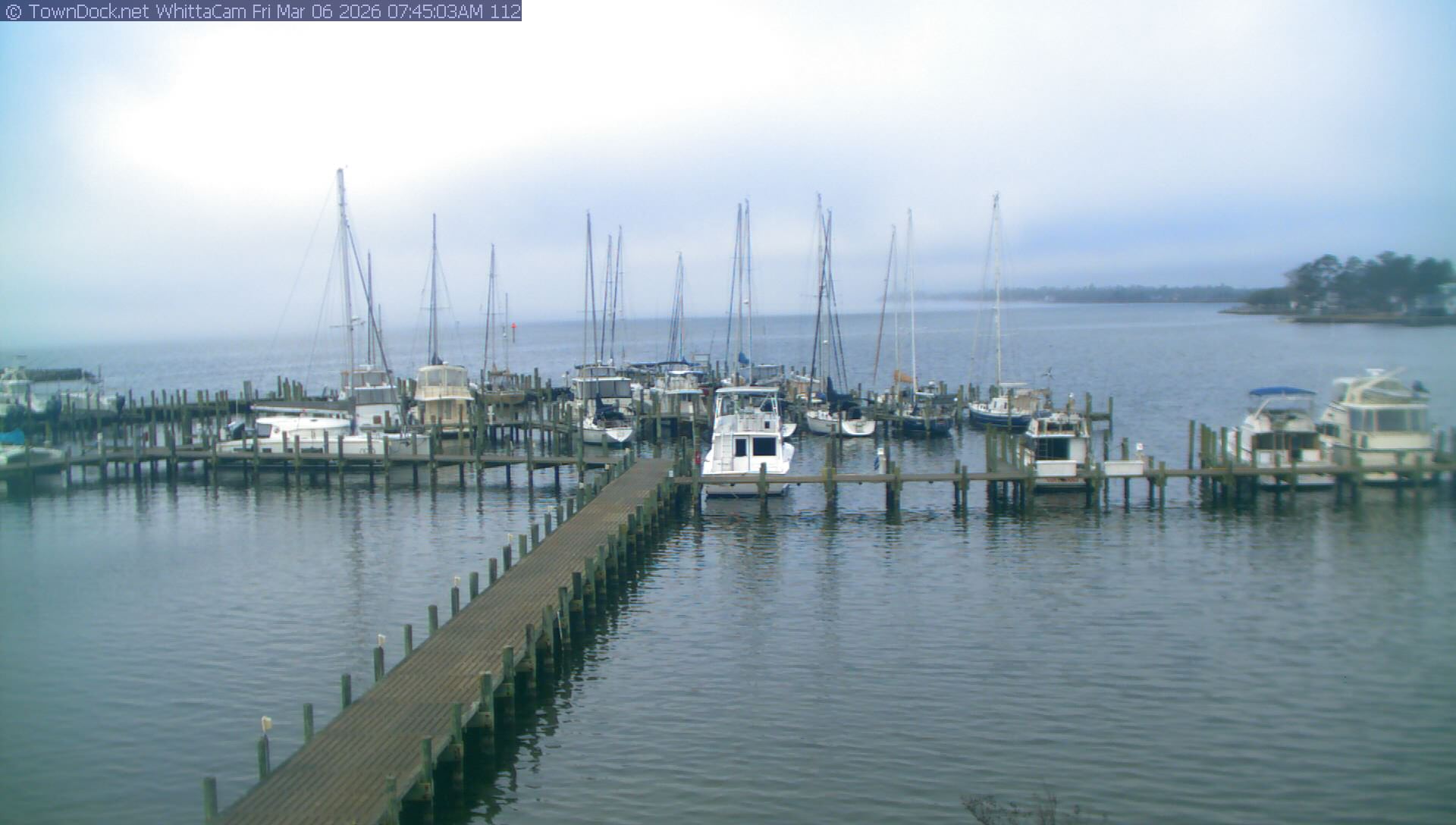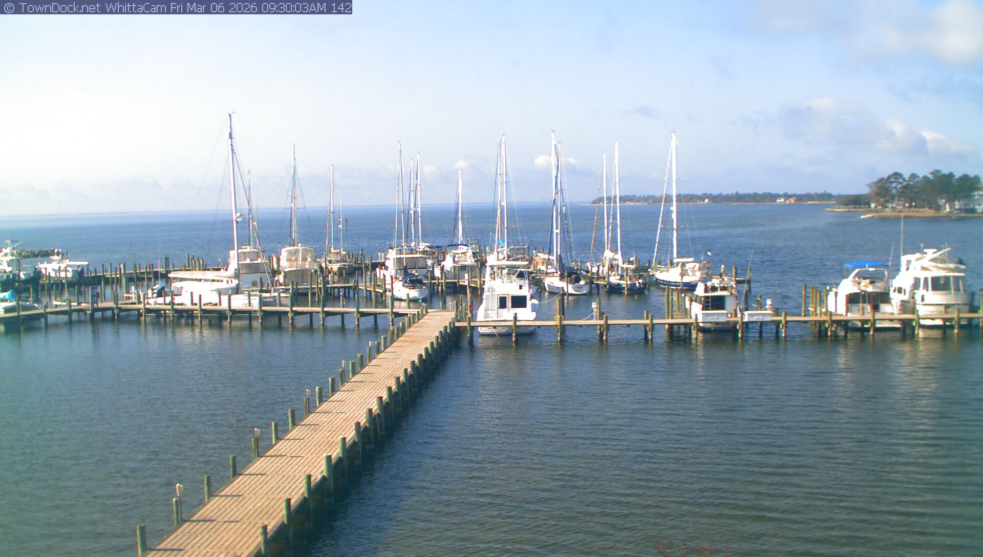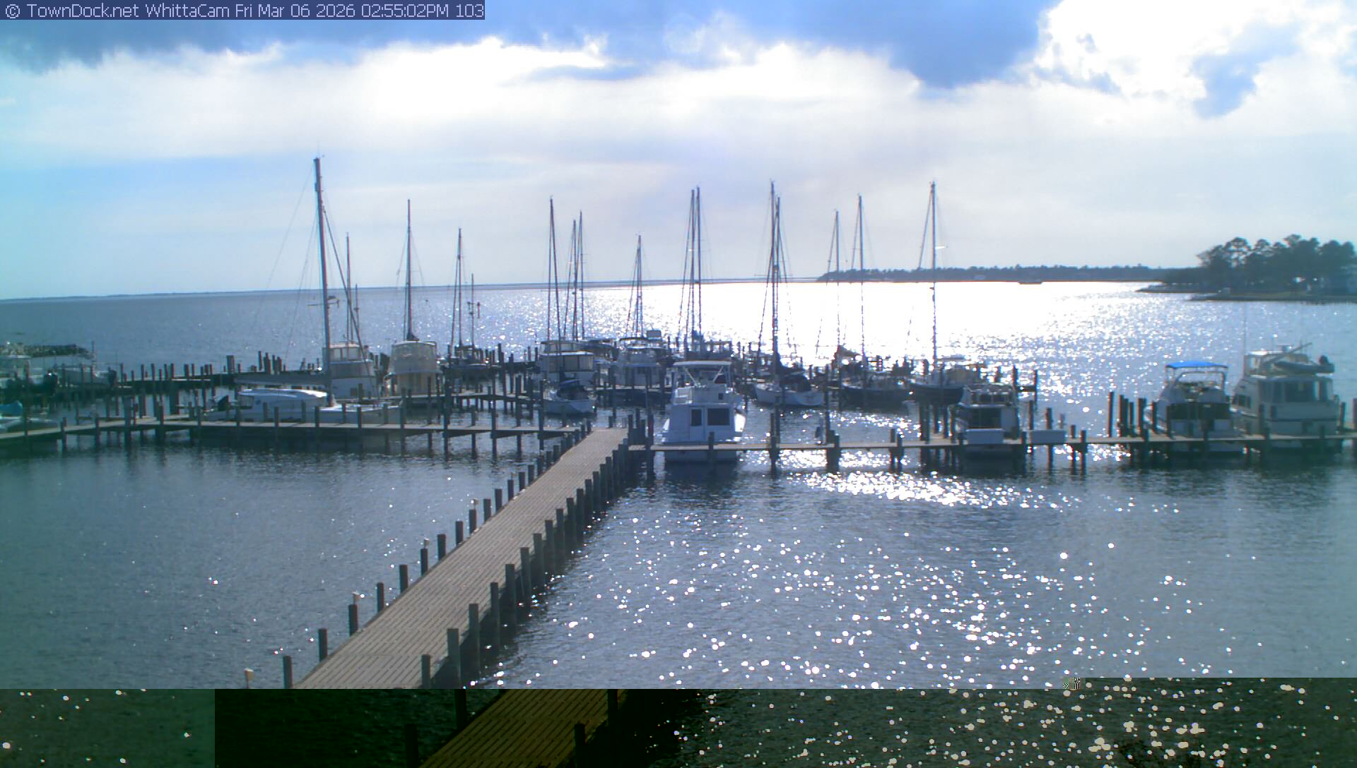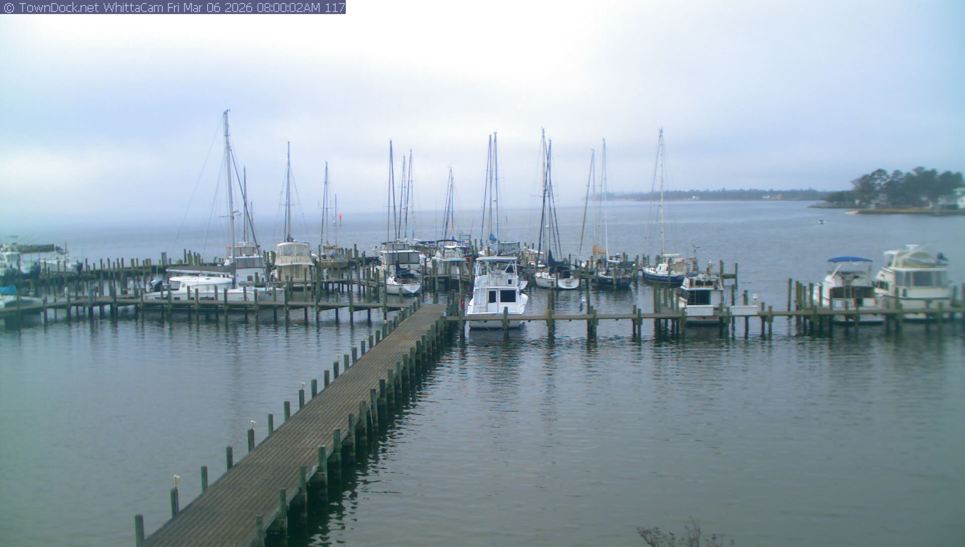 shows Whittaker Pointe Marina and the Whittaker Creek Channel entrance, with the Neuse River in the background. WhittaCam takes a new picture every five minutes from dawn til just before dusk. Click on the image to see a larger version. Once you see that larger version, you can click (see arrow at right) to go back in time and see recent photos. Harbor Cam currently takes photos from 6:30am to 5:30pm.