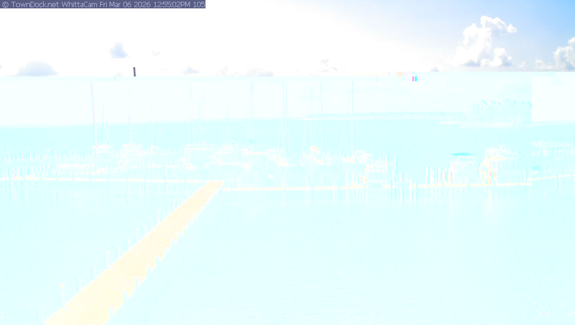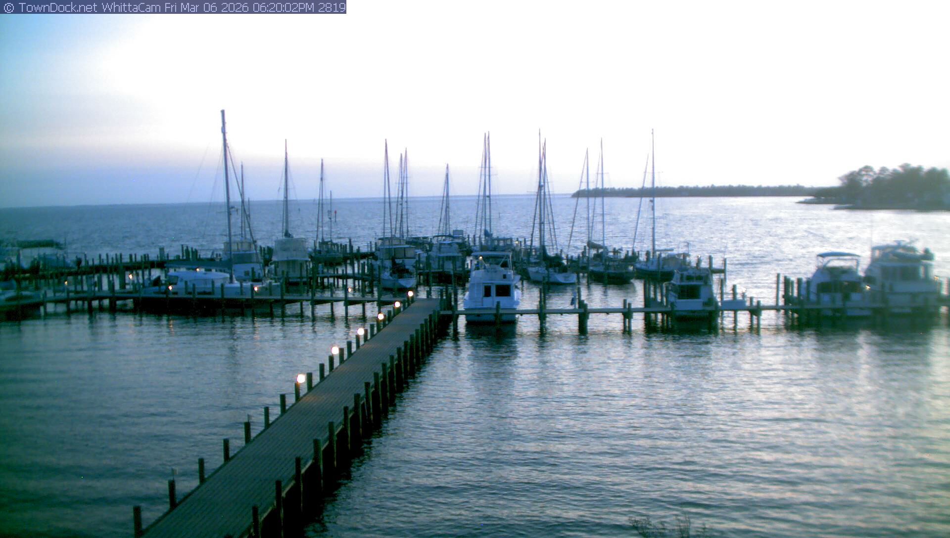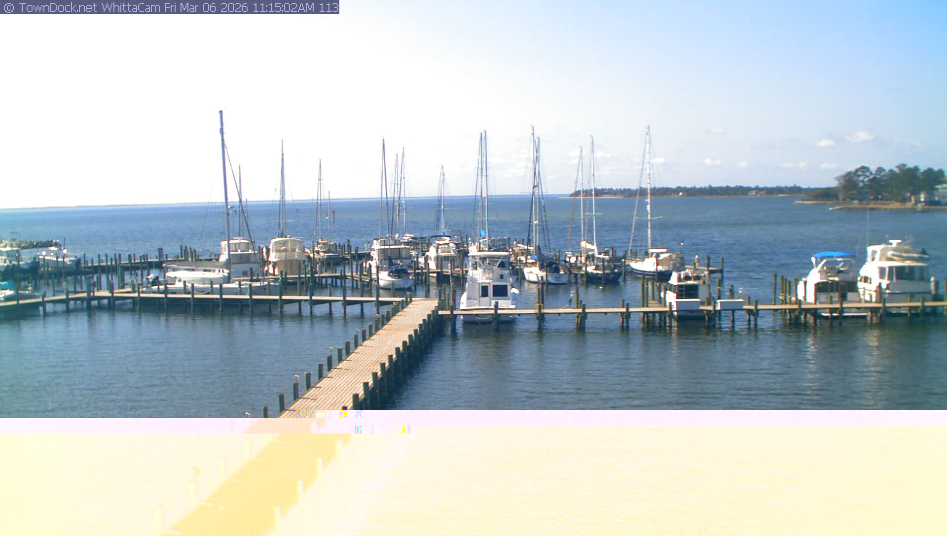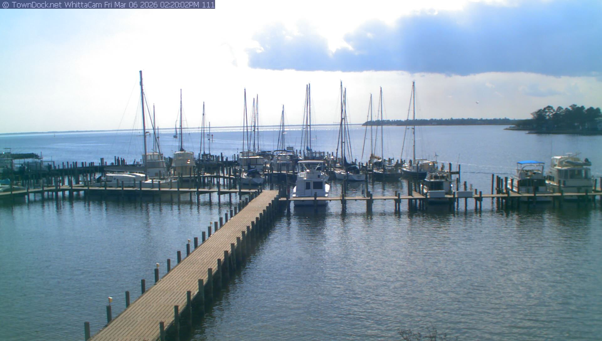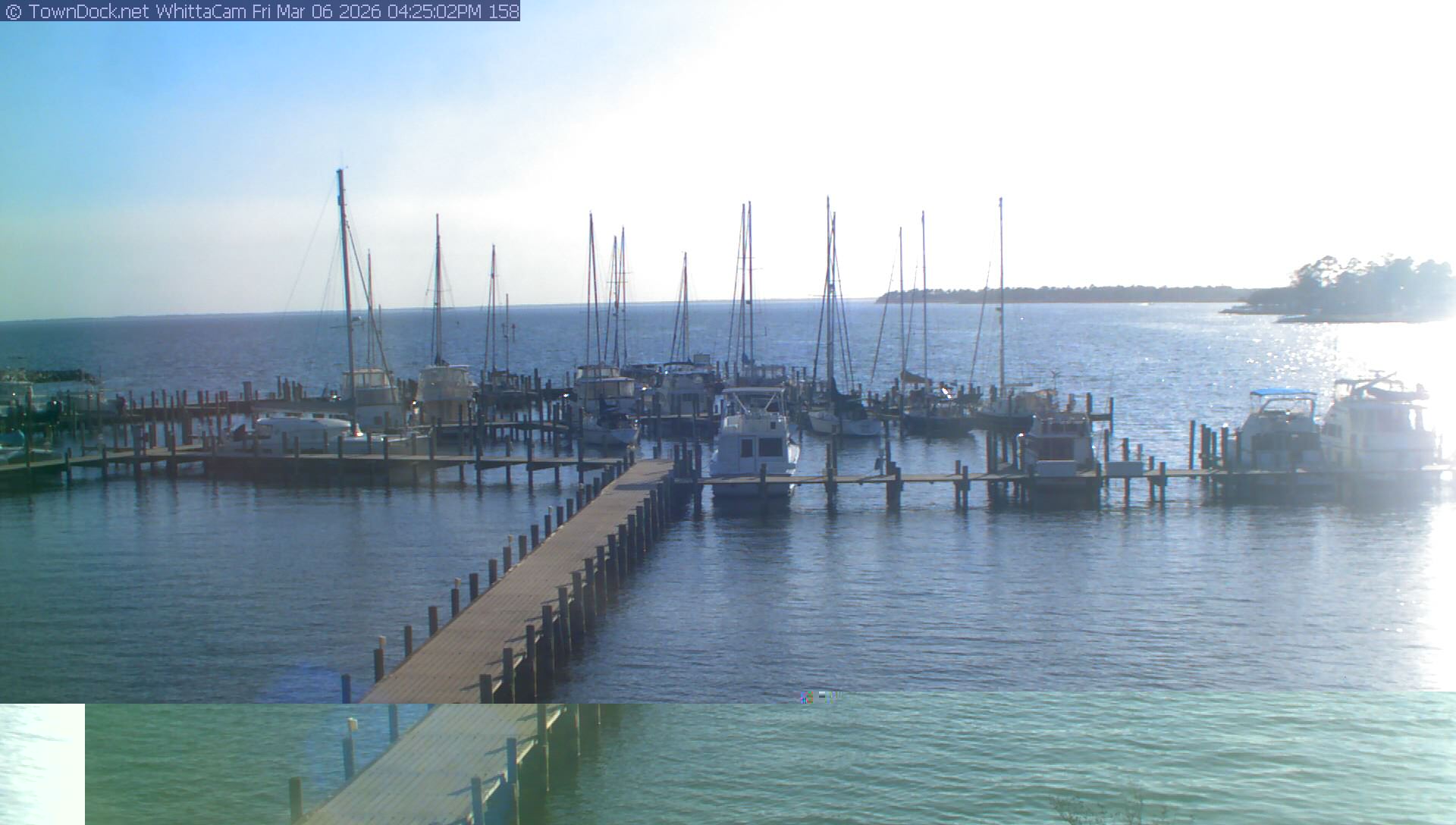 shows Whittaker Pointe Marina and the Whittaker Creek Channel entrance, with the Neuse River in the background. WhittaCam takes a new picture every five minutes from dawn til just before dusk. Click on the image to see a larger version. Once you see that larger version, you can click (see arrow at right) to go back in time and see recent photos. Harbor Cam currently takes photos from 6:30am to 5:30pm.