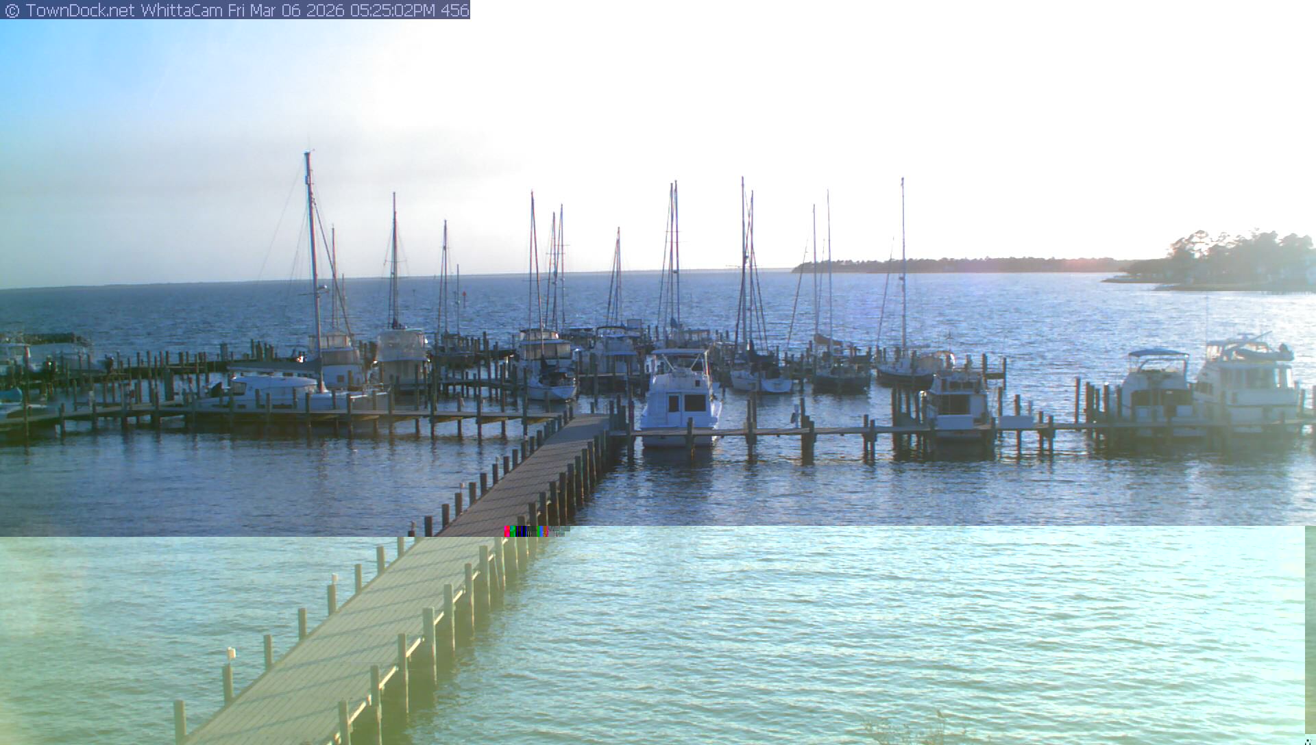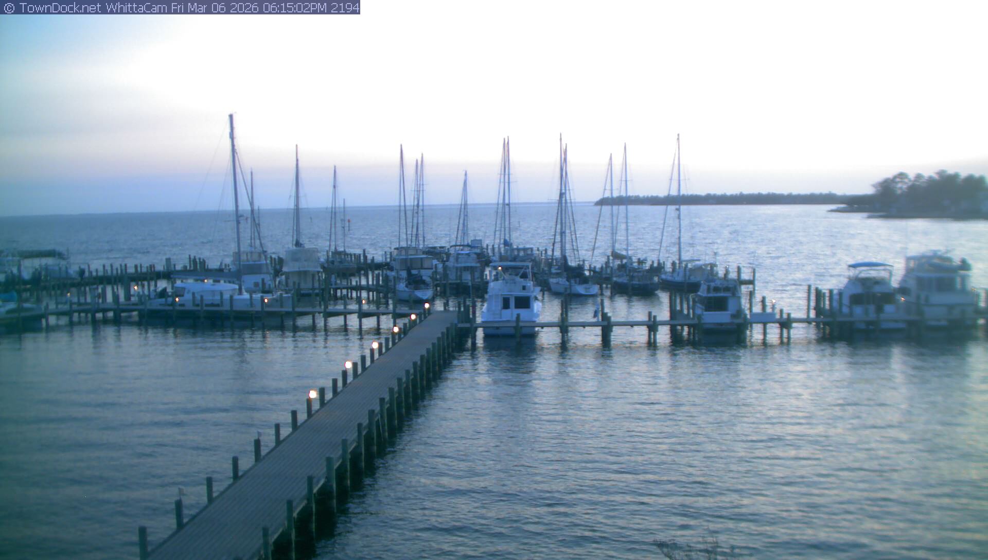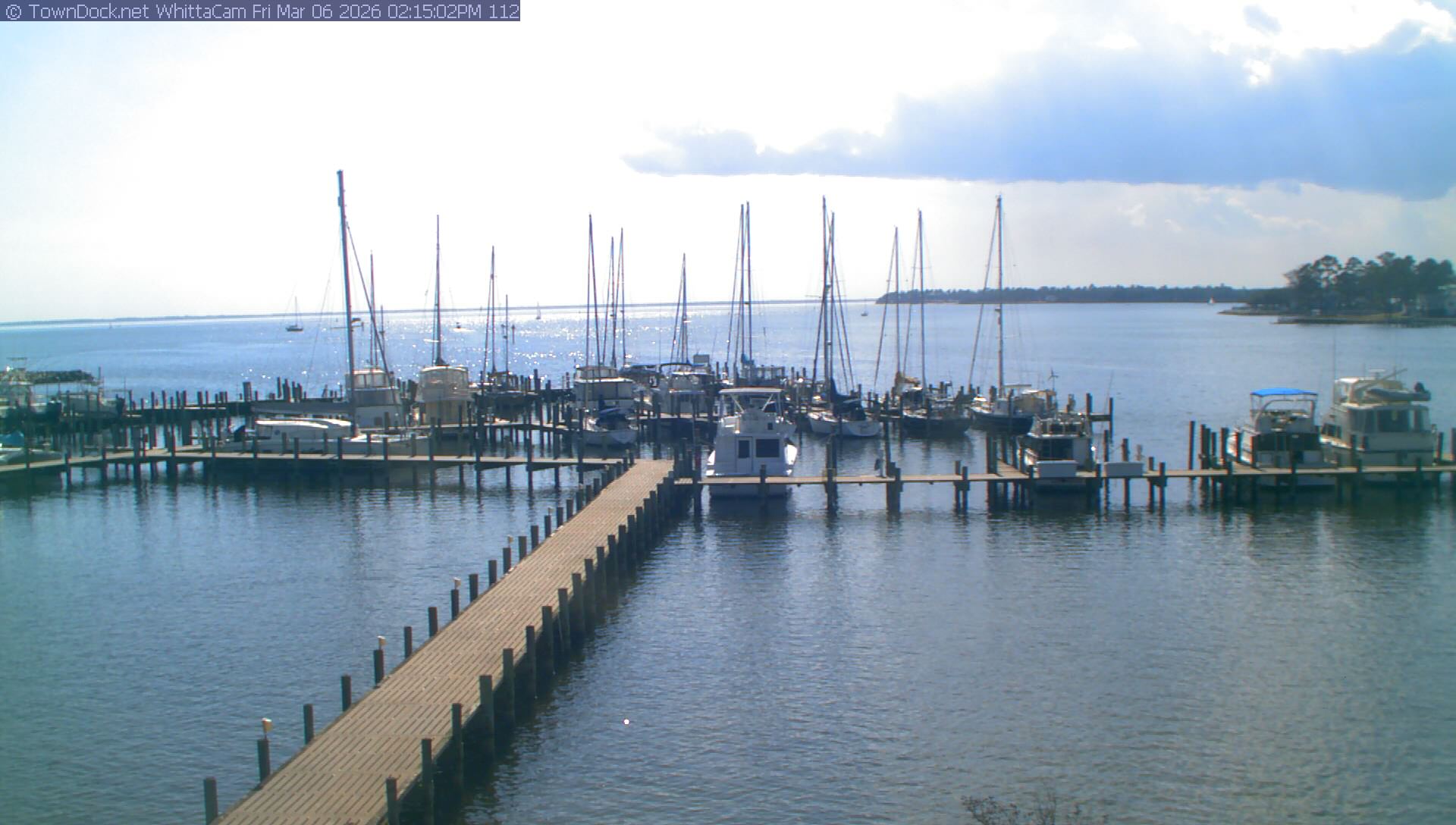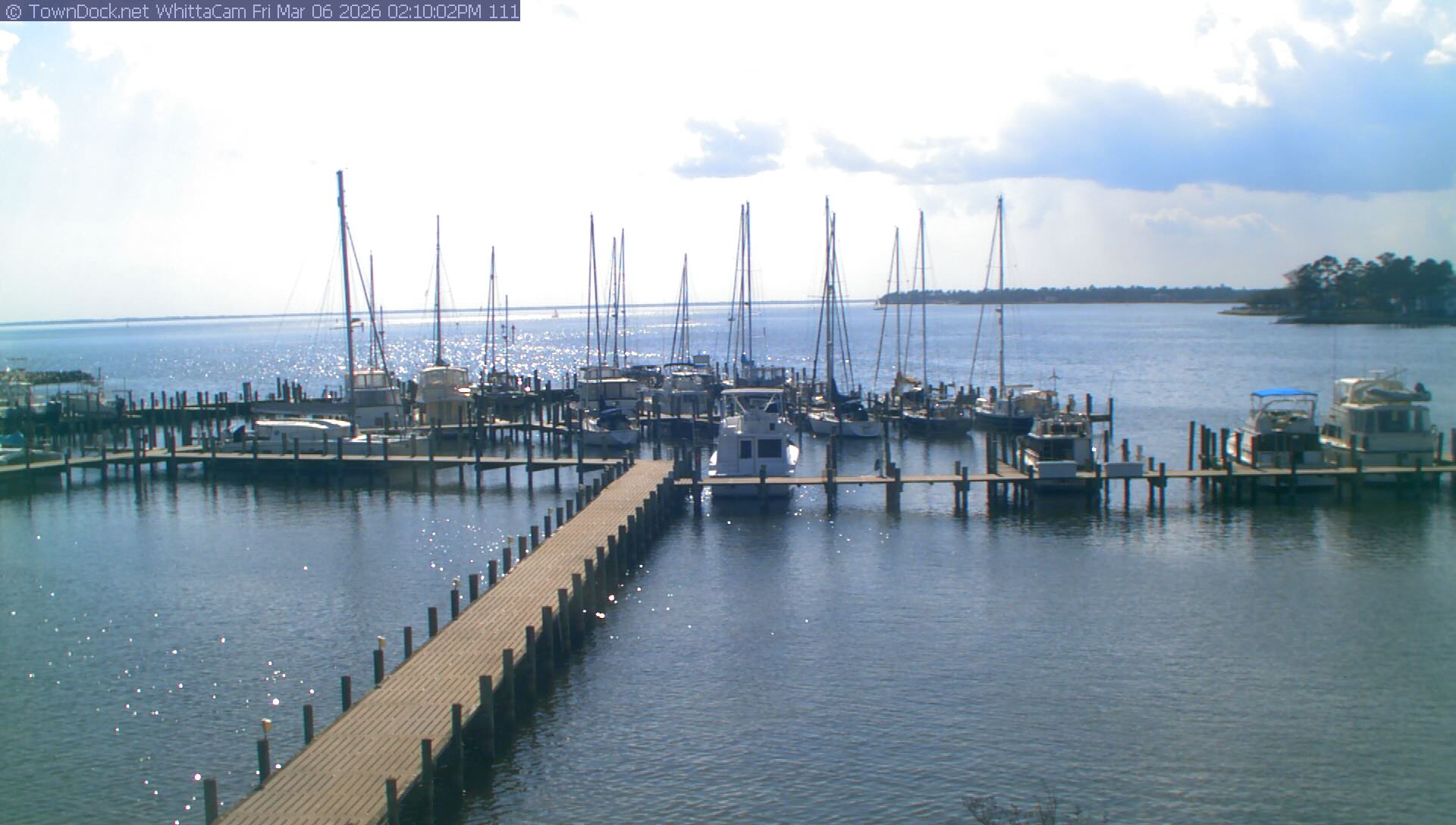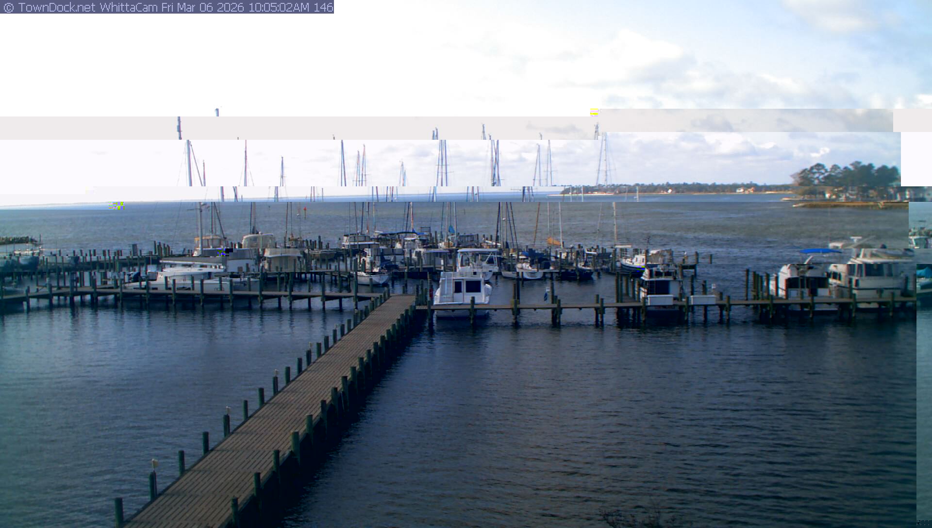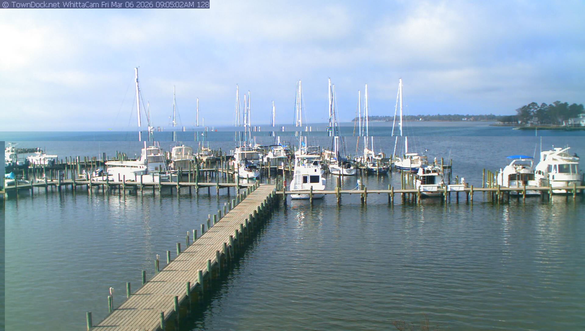 shows Whittaker Pointe Marina and the Whittaker Creek Channel entrance, with the Neuse River in the background. WhittaCam takes a new picture every five minutes from dawn til just before dusk. Click on the image to see a larger version. Once you see that larger version, you can click (see arrow at right) to go back in time and see recent photos. Harbor Cam currently takes photos from 6:30am to 5:30pm.