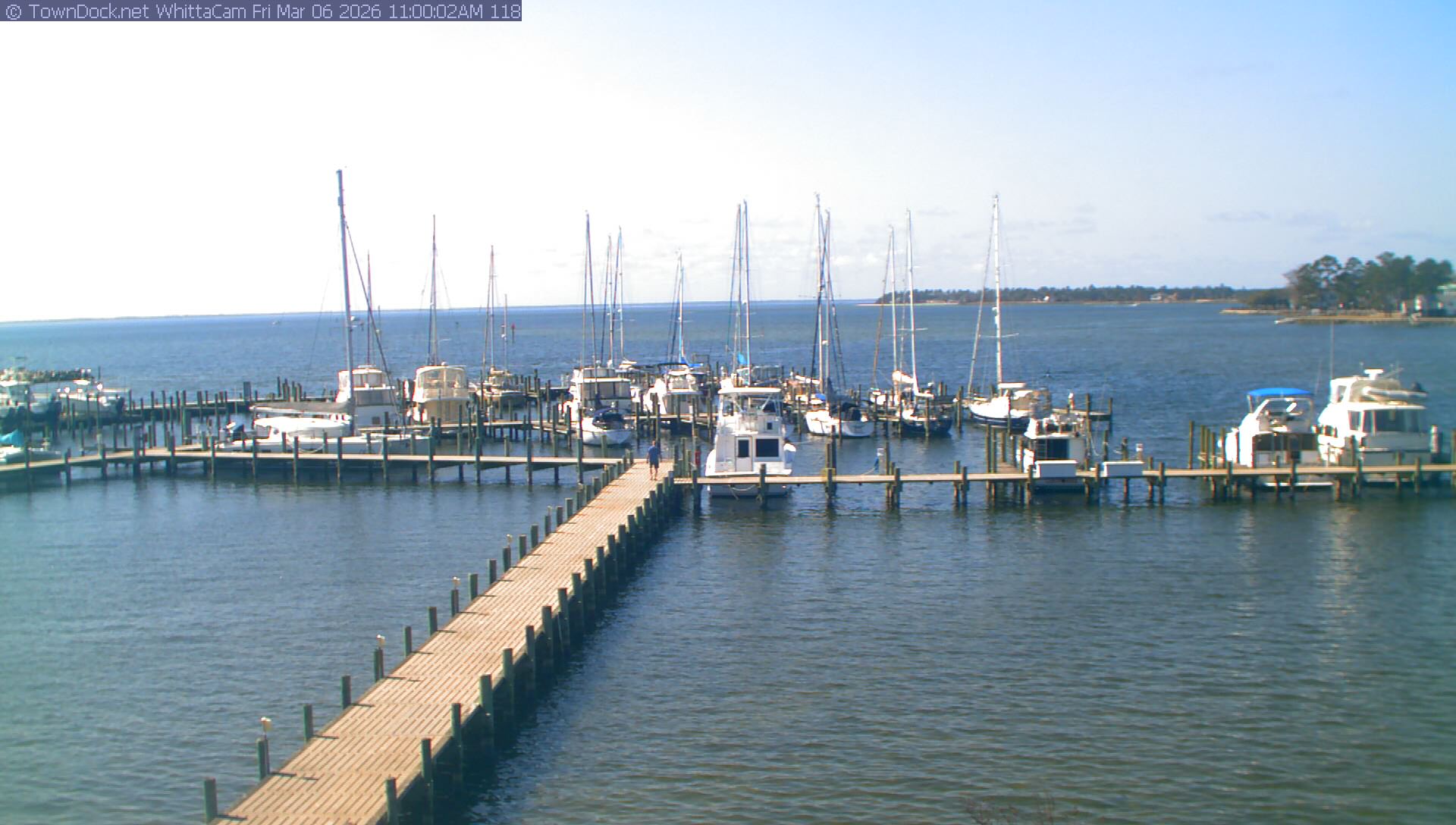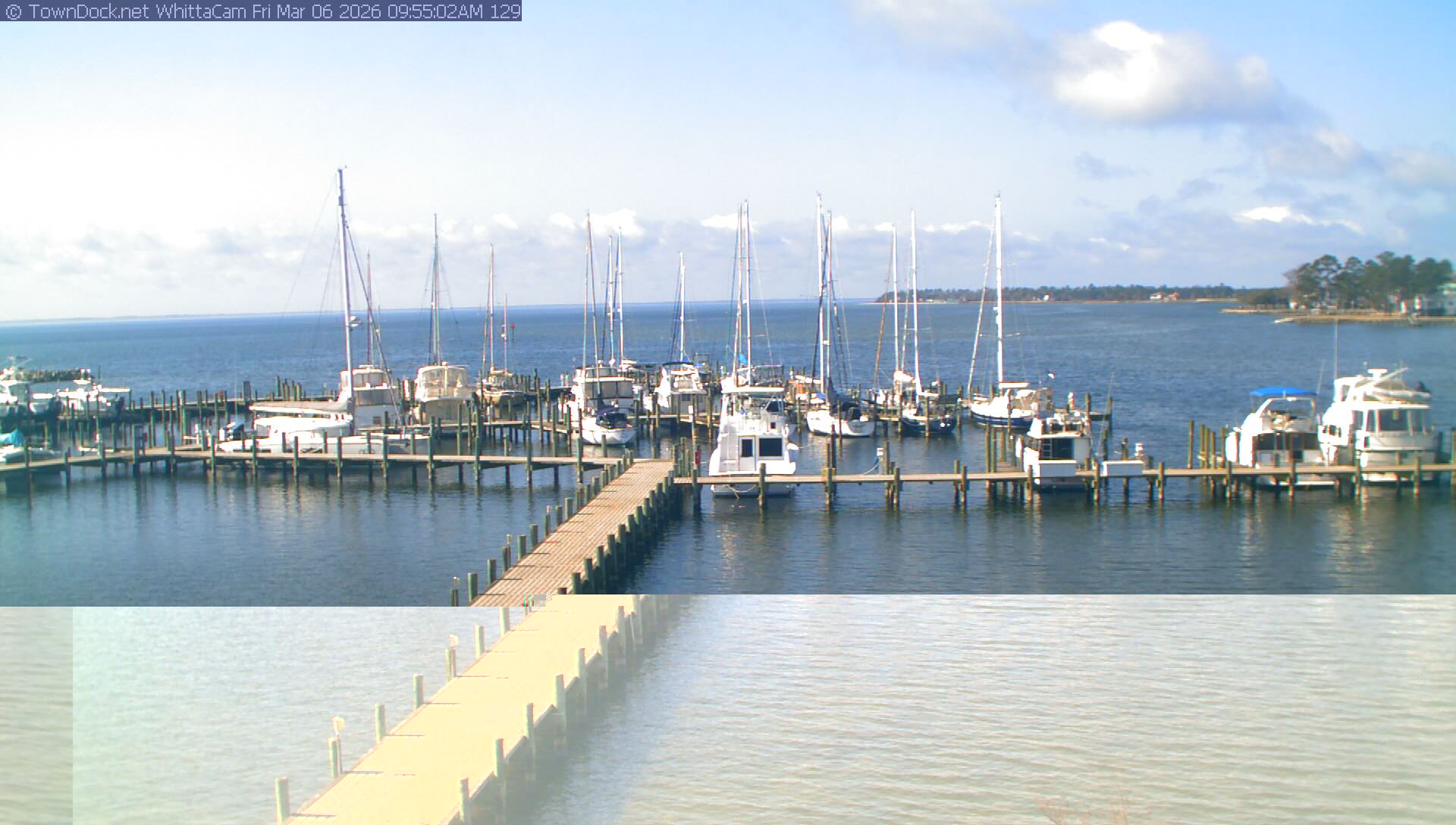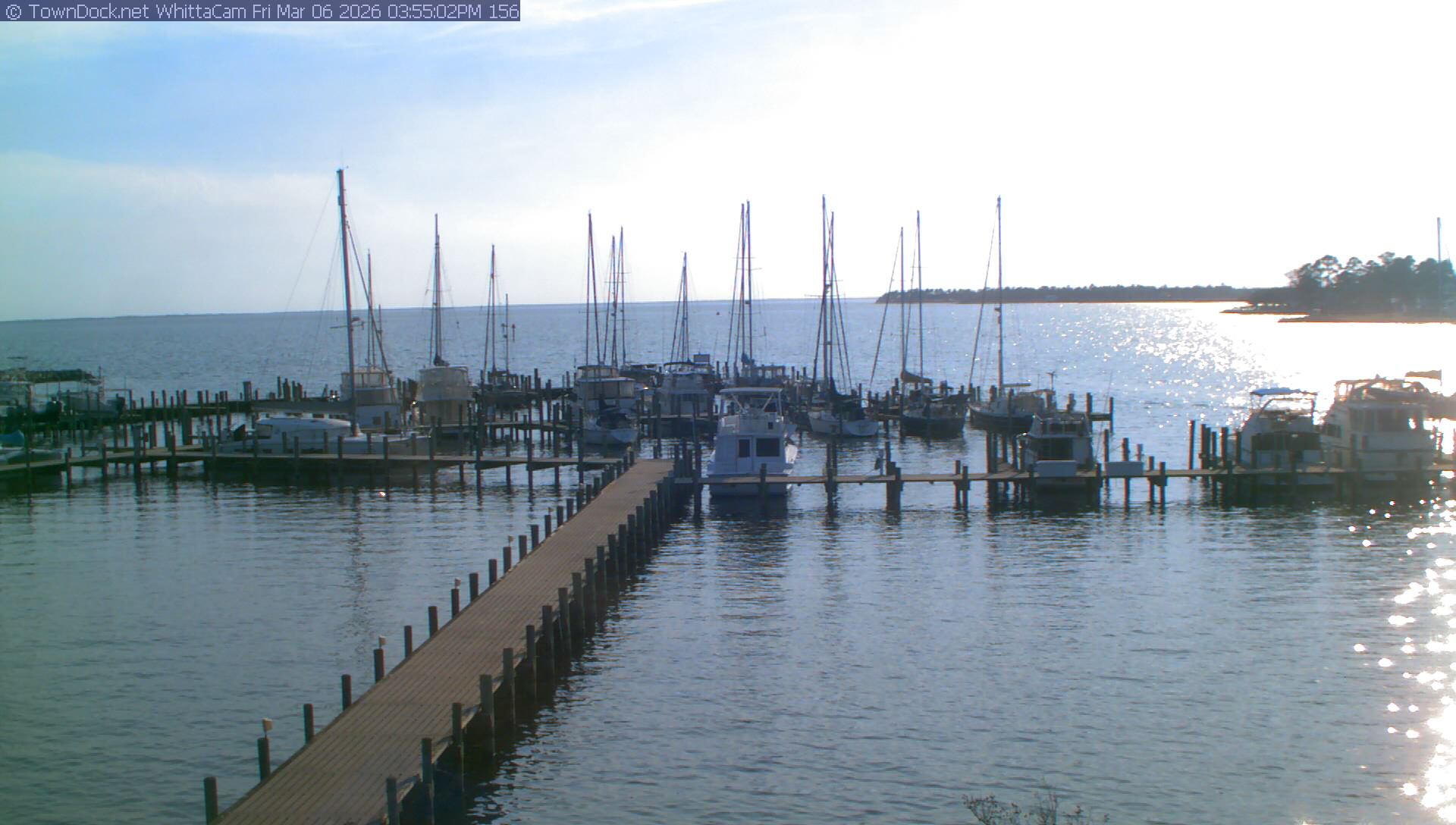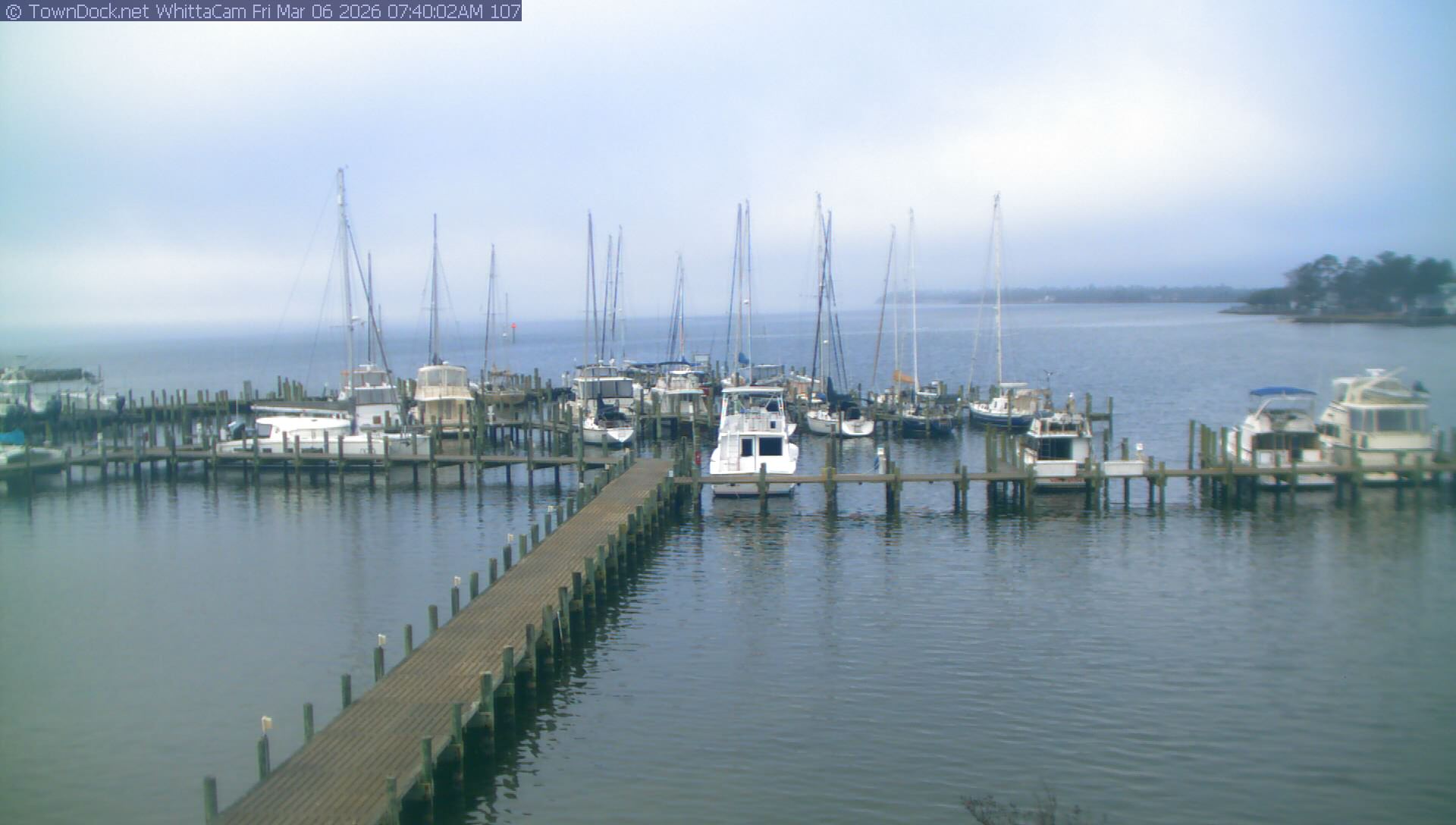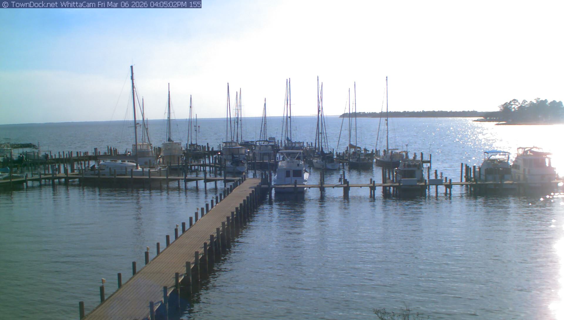 shows Whittaker Pointe Marina and the Whittaker Creek Channel entrance, with the Neuse River in the background. WhittaCam takes a new picture every five minutes from dawn til just before dusk. Click on the image to see a larger version. Once you see that larger version, you can click (see arrow at right) to go back in time and see recent photos. Harbor Cam currently takes photos from 6:30am to 5:30pm.