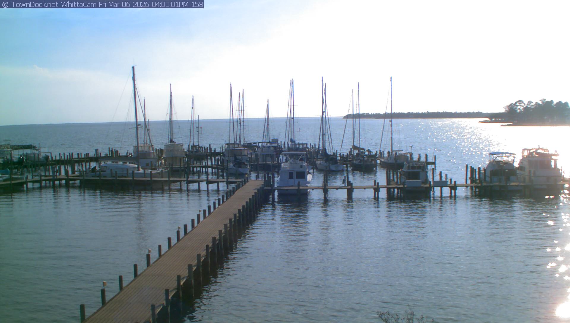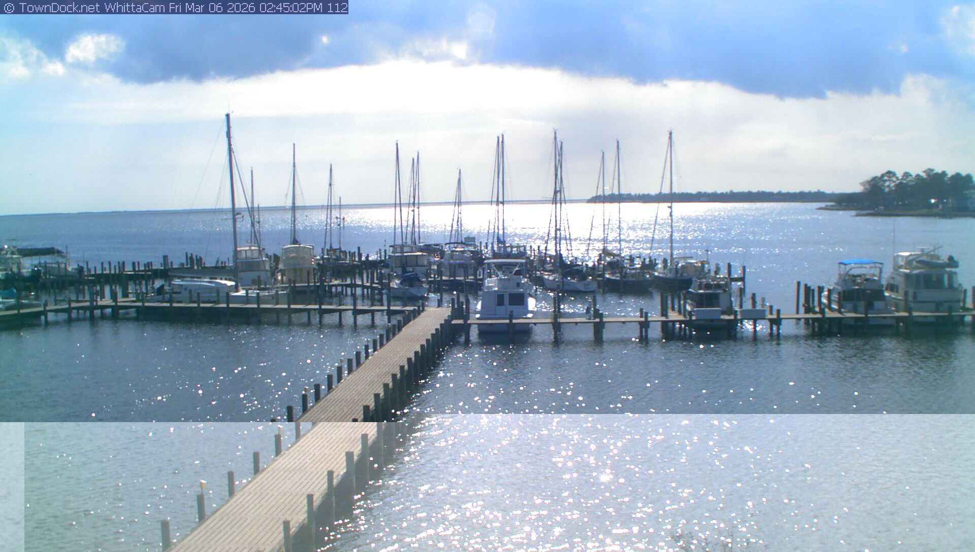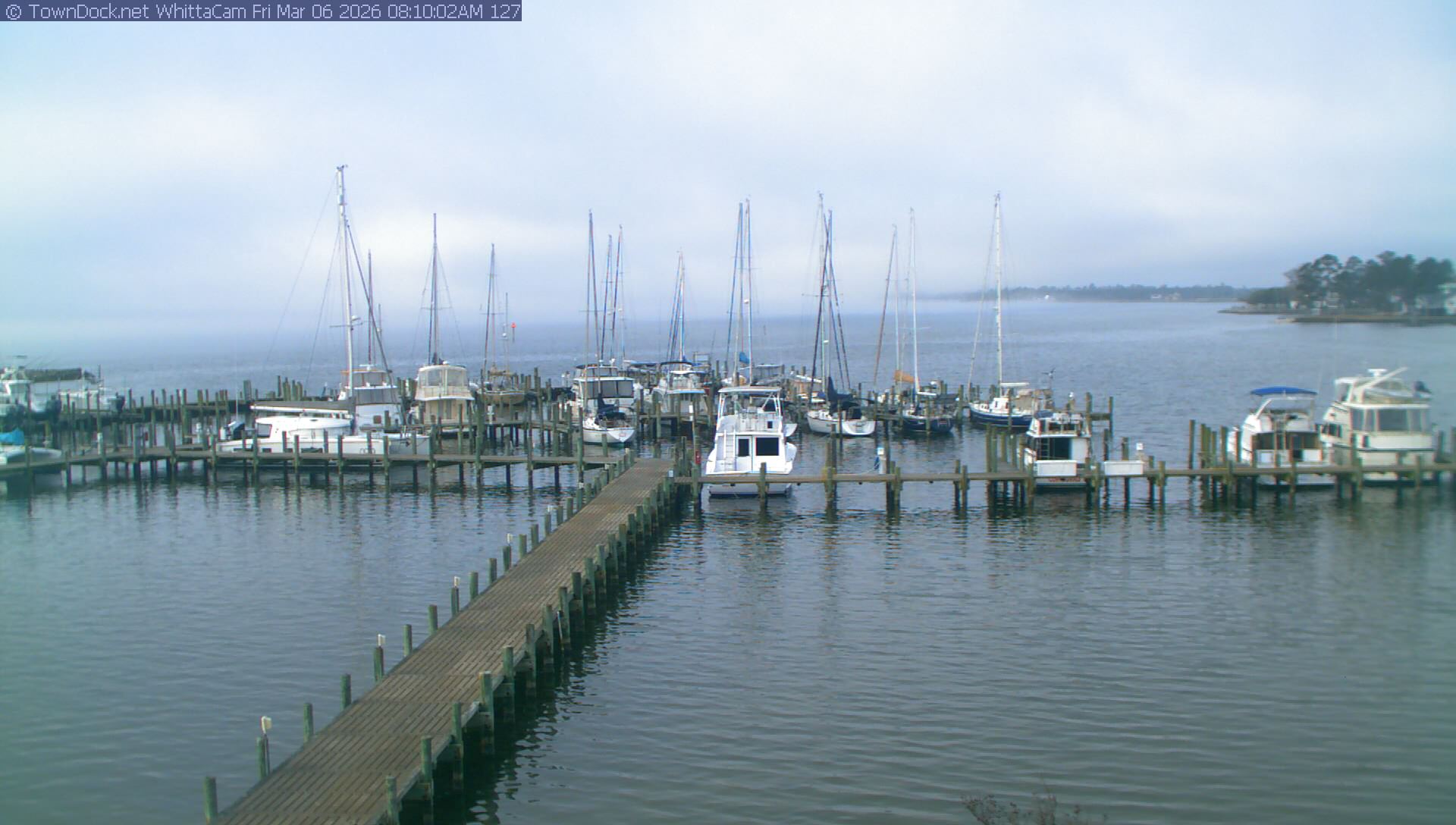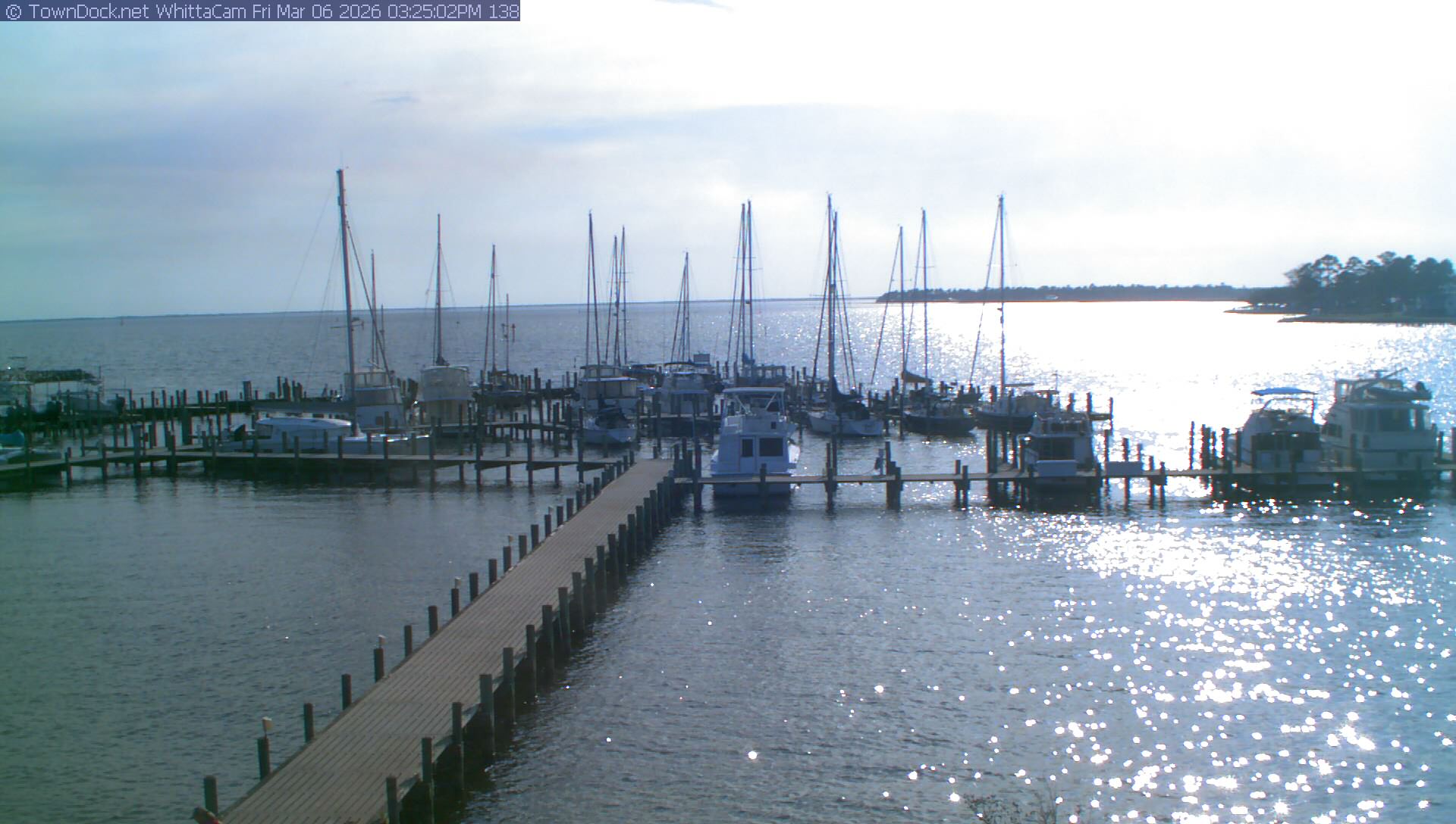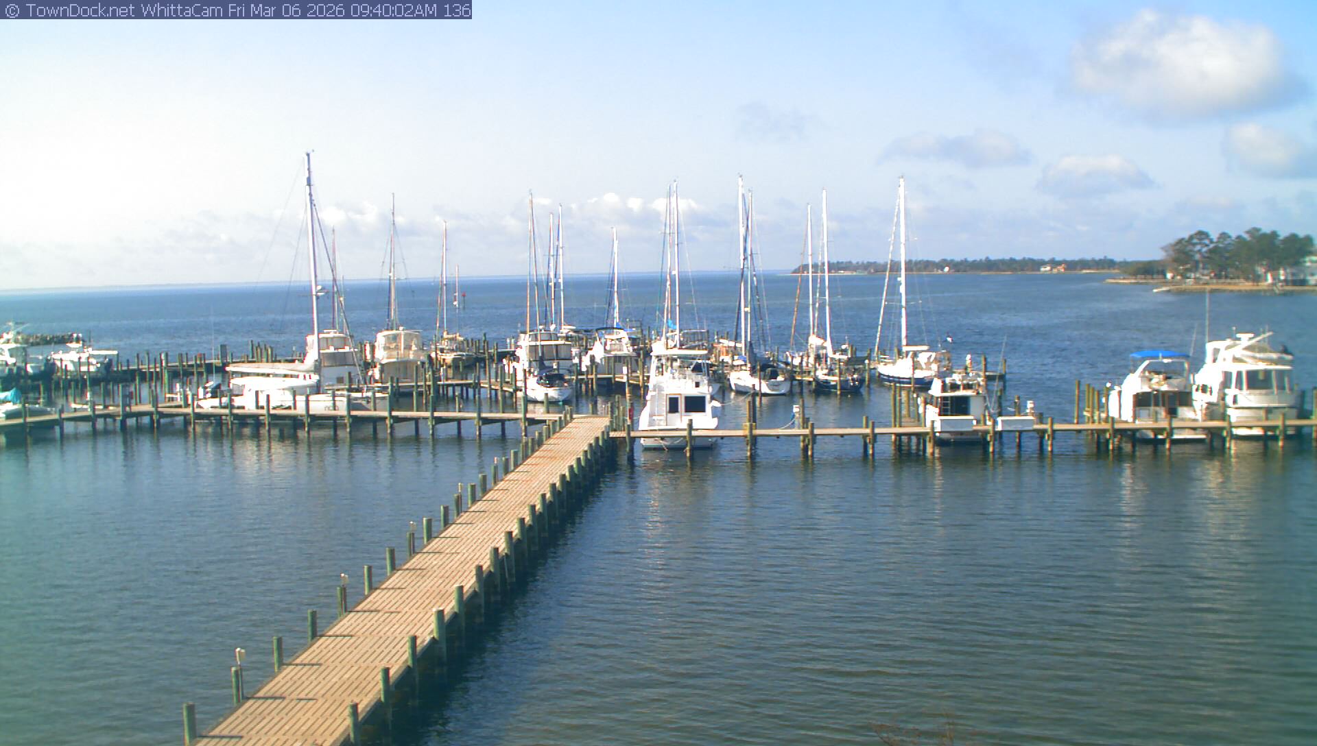 shows Whittaker Pointe Marina and the Whittaker Creek Channel entrance, with the Neuse River in the background. WhittaCam takes a new picture every five minutes from dawn til just before dusk. Click on the image to see a larger version. Once you see that larger version, you can click (see arrow at right) to go back in time and see recent photos. Harbor Cam currently takes photos from 6:30am to 5:30pm.