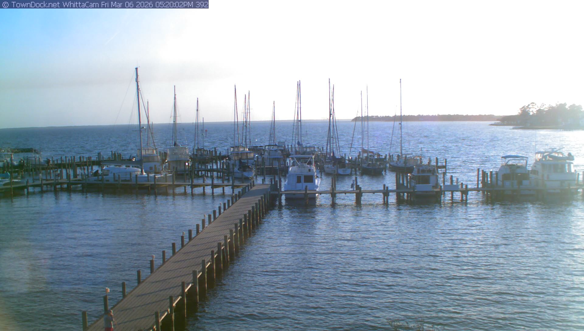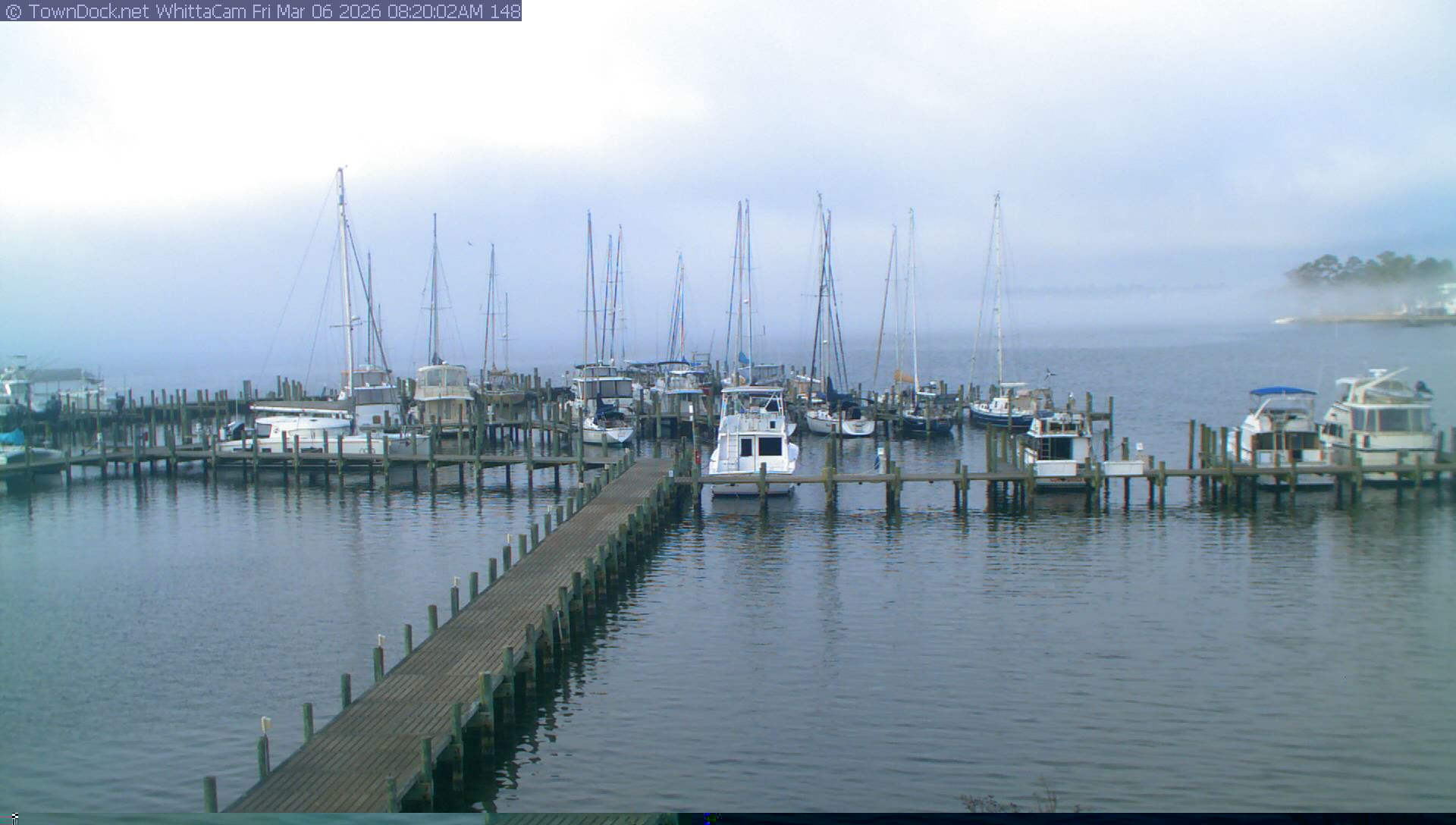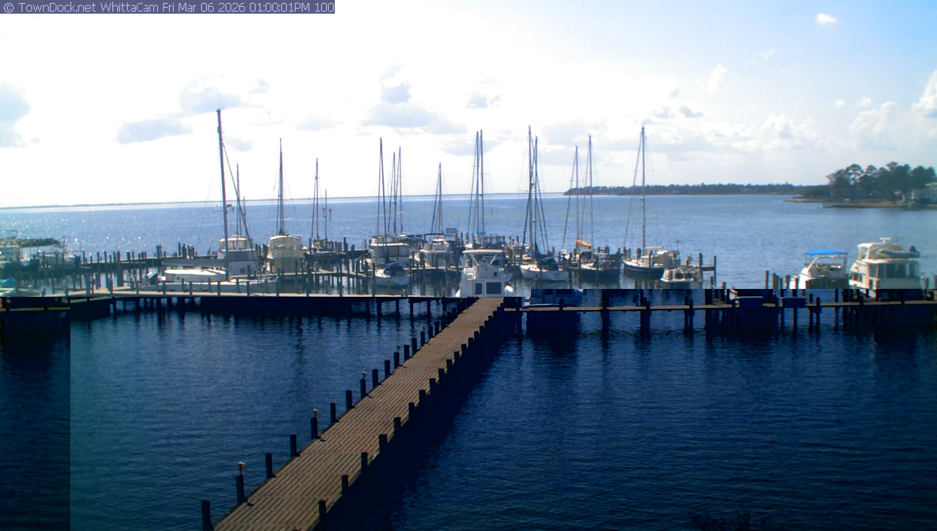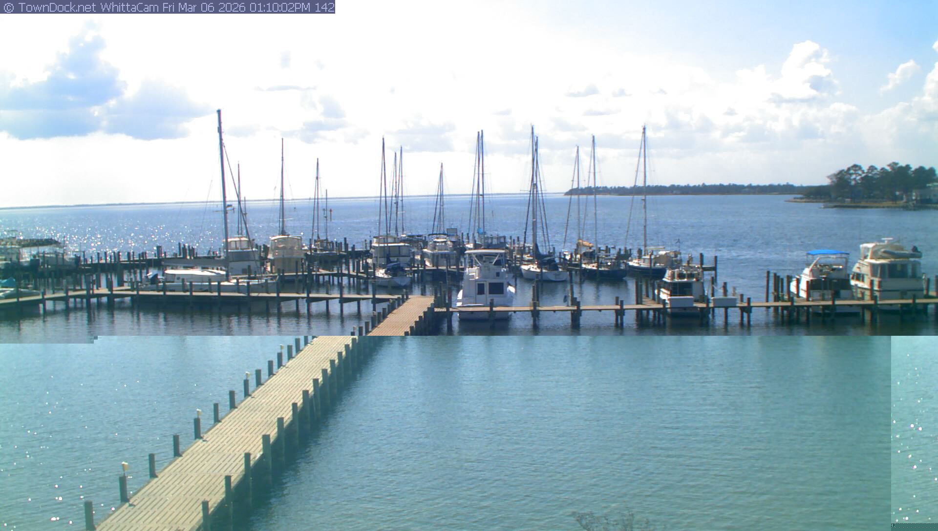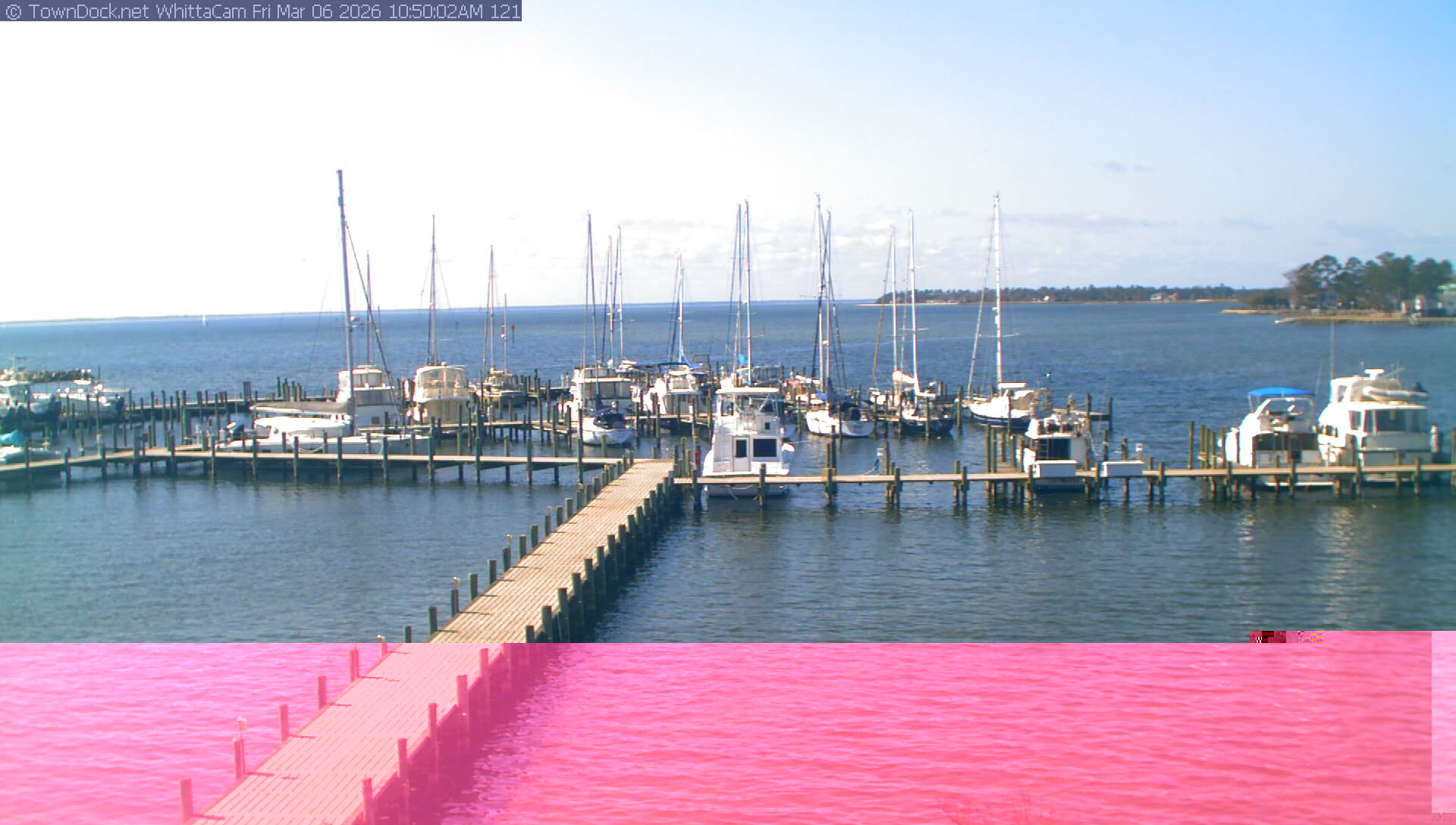 shows Whittaker Pointe Marina and the Whittaker Creek Channel entrance, with the Neuse River in the background. WhittaCam takes a new picture every five minutes from dawn til just before dusk. Click on the image to see a larger version. Once you see that larger version, you can click (see arrow at right) to go back in time and see recent photos. Harbor Cam currently takes photos from 6:30am to 5:30pm.