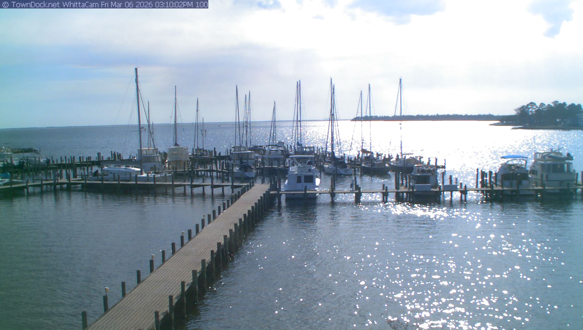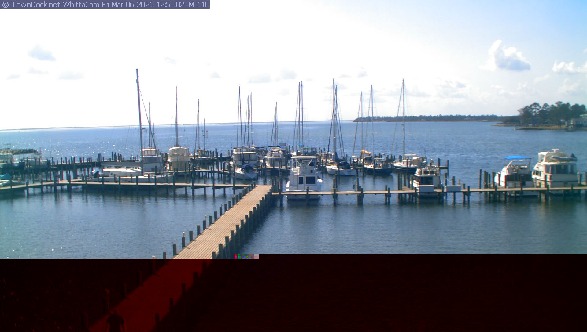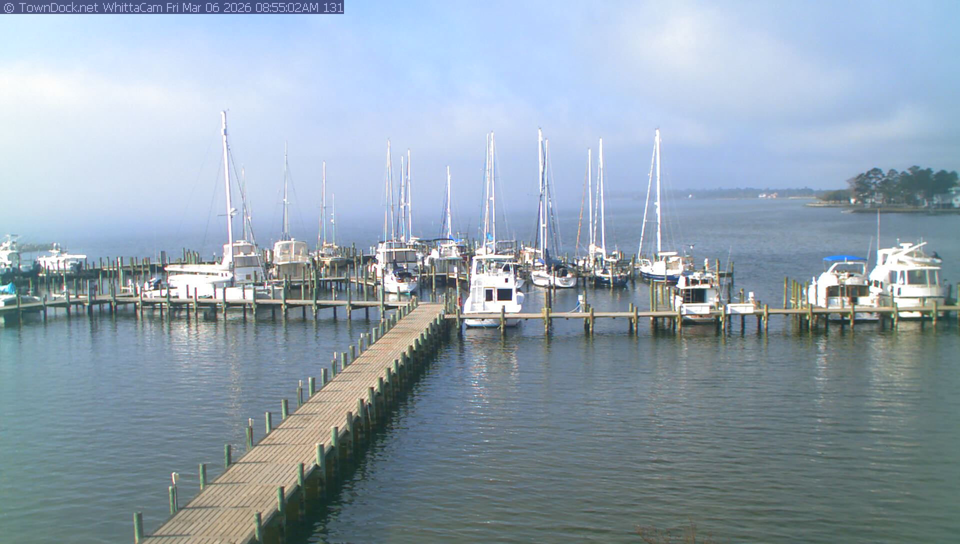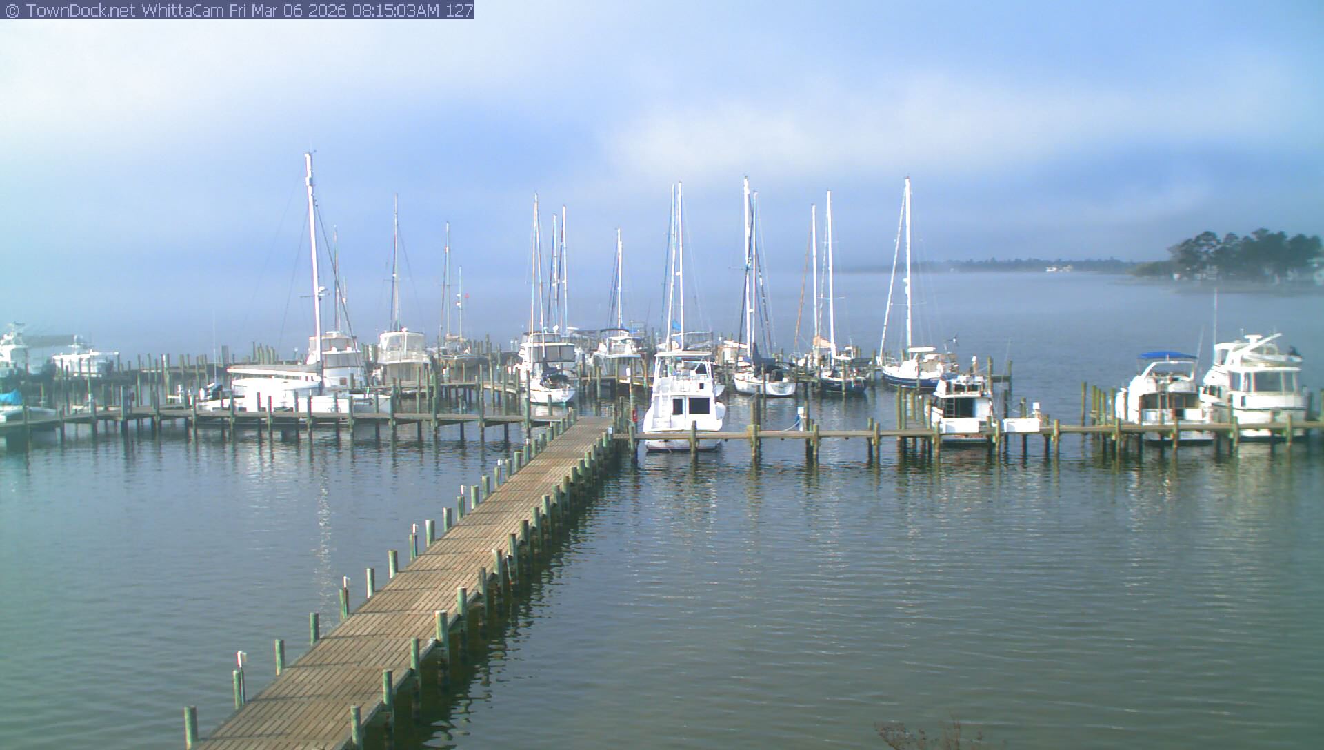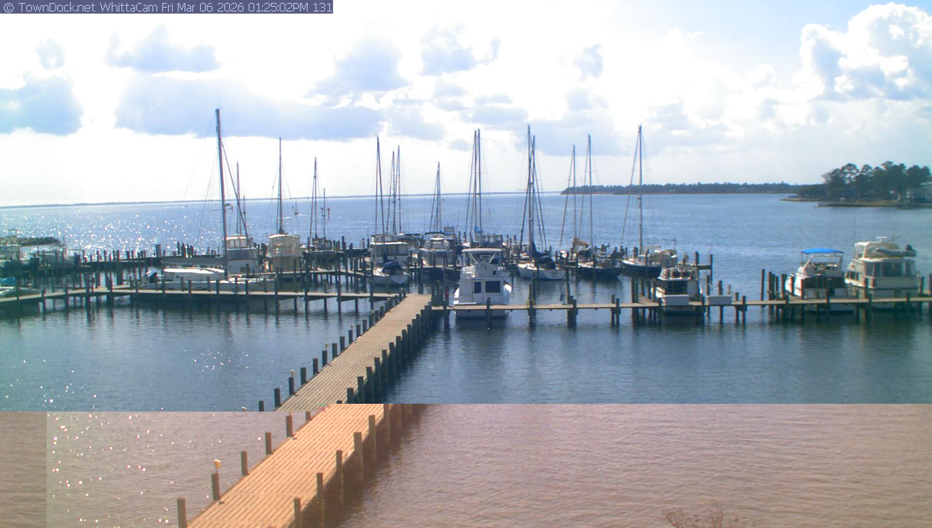 shows Whittaker Pointe Marina and the Whittaker Creek Channel entrance, with the Neuse River in the background. WhittaCam takes a new picture every five minutes from dawn til just before dusk. Click on the image to see a larger version. Once you see that larger version, you can click (see arrow at right) to go back in time and see recent photos. Harbor Cam currently takes photos from 6:30am to 5:30pm.