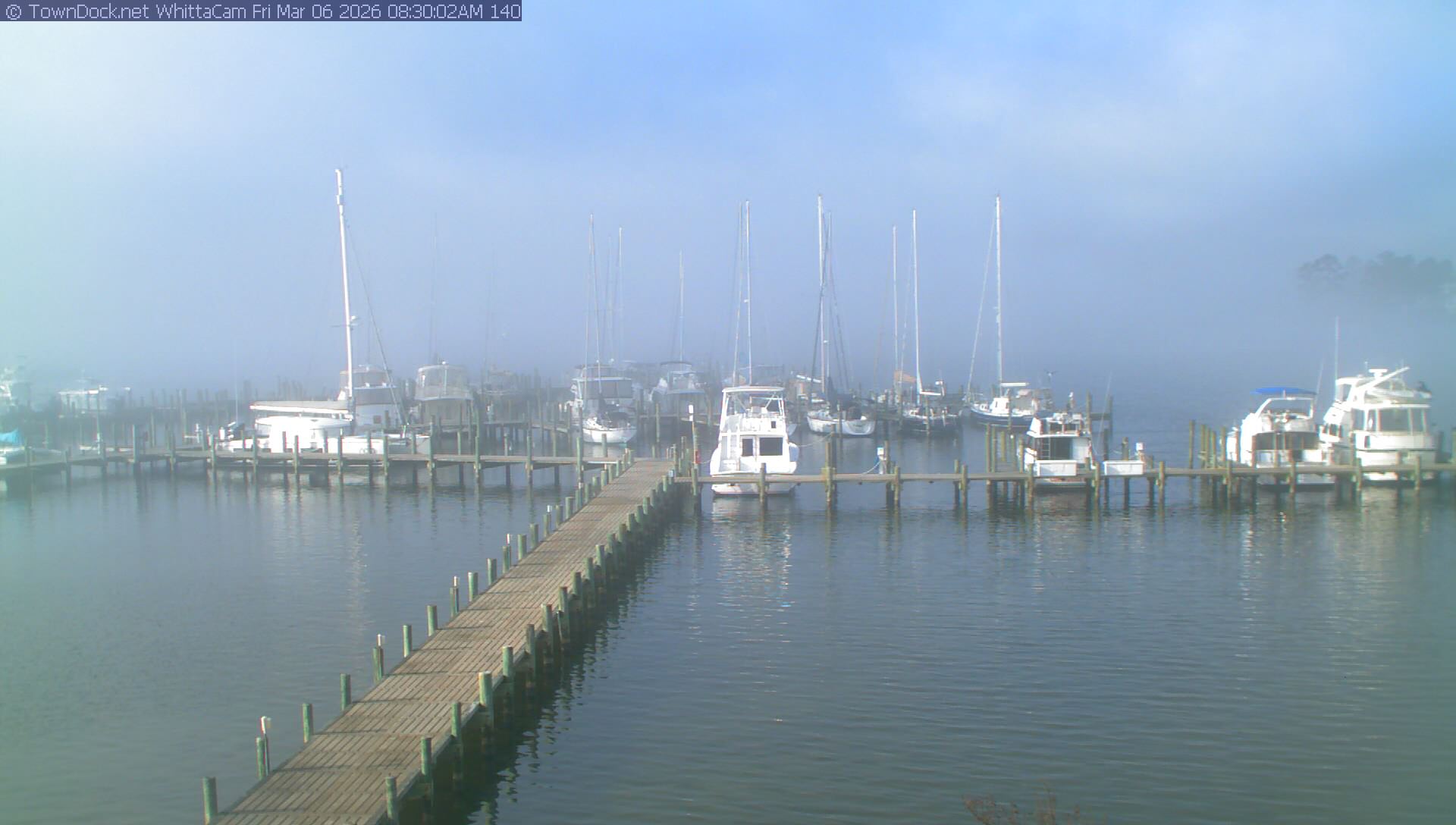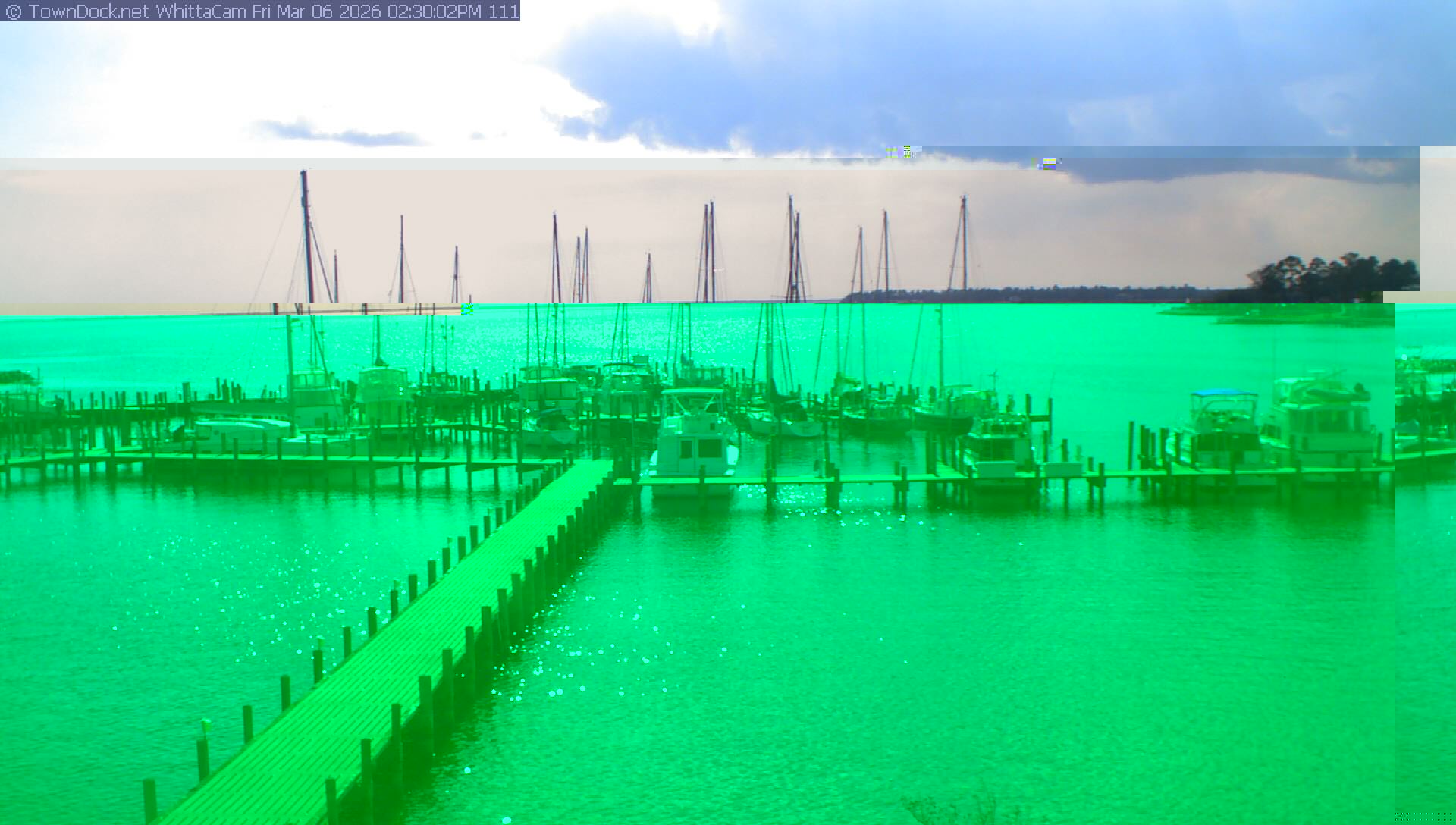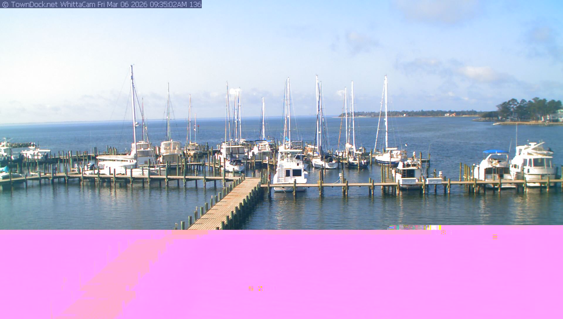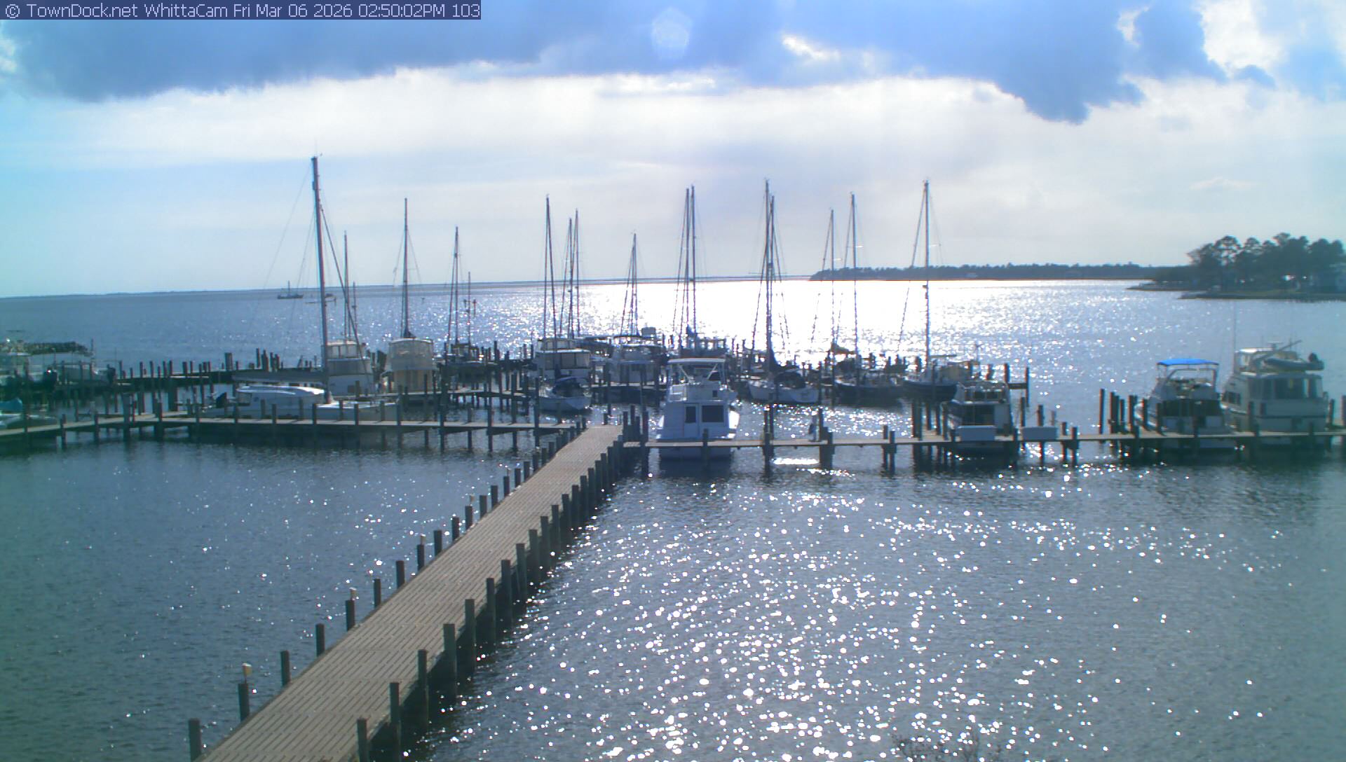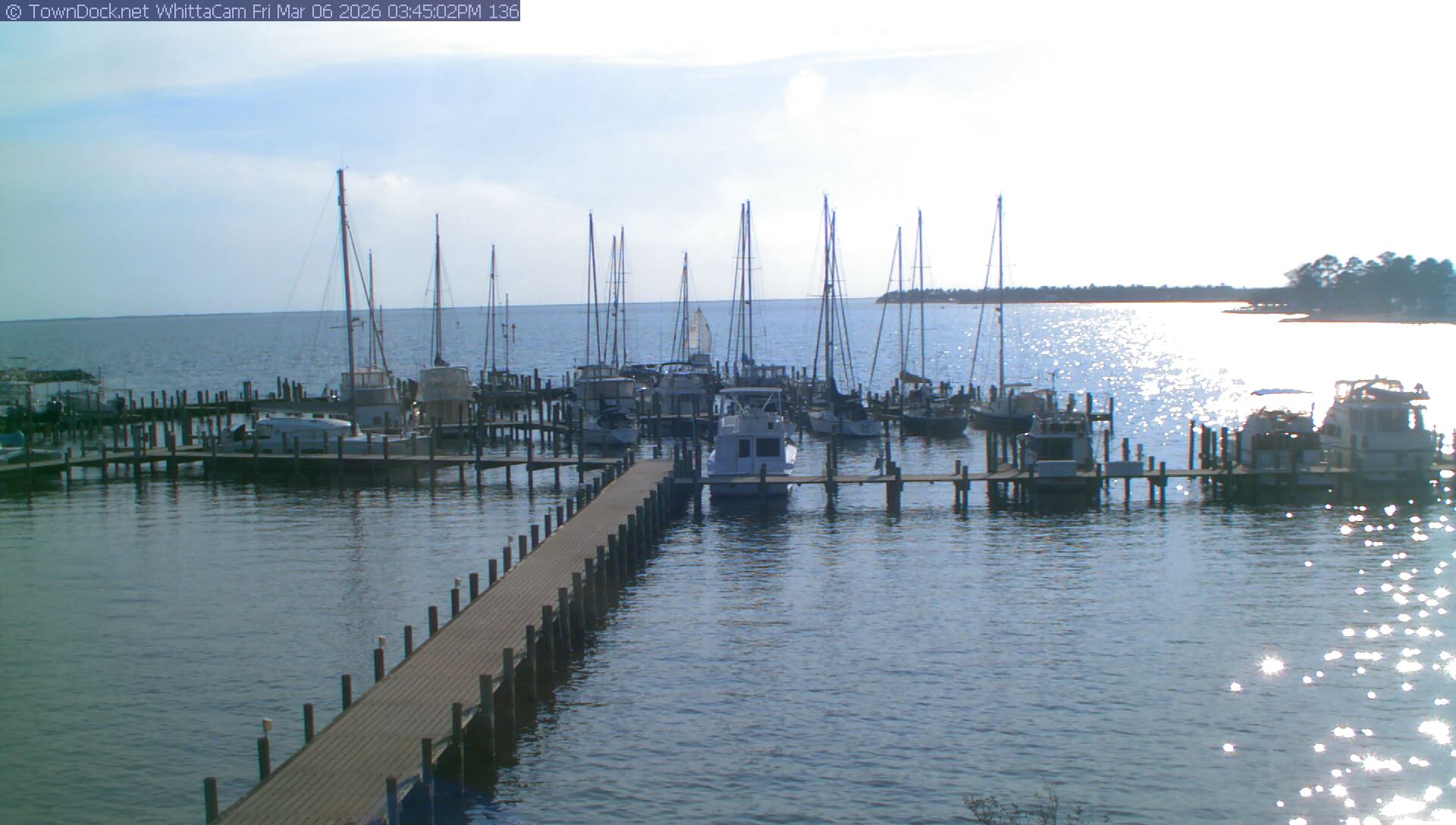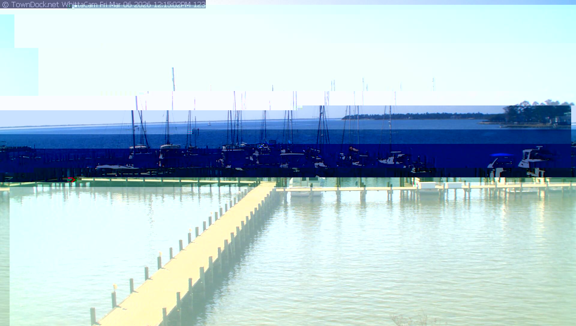shows Whittaker Pointe Marina and the Whittaker Creek Channel entrance, with the Neuse River in the background. WhittaCam takes a new picture every five minutes from dawn til just before dusk. Click on the image to see a larger version. Once you see that larger version, you can click (see arrow at right) to go back in time and see recent photos. Harbor Cam currently takes photos from 6:30am to 5:30pm.