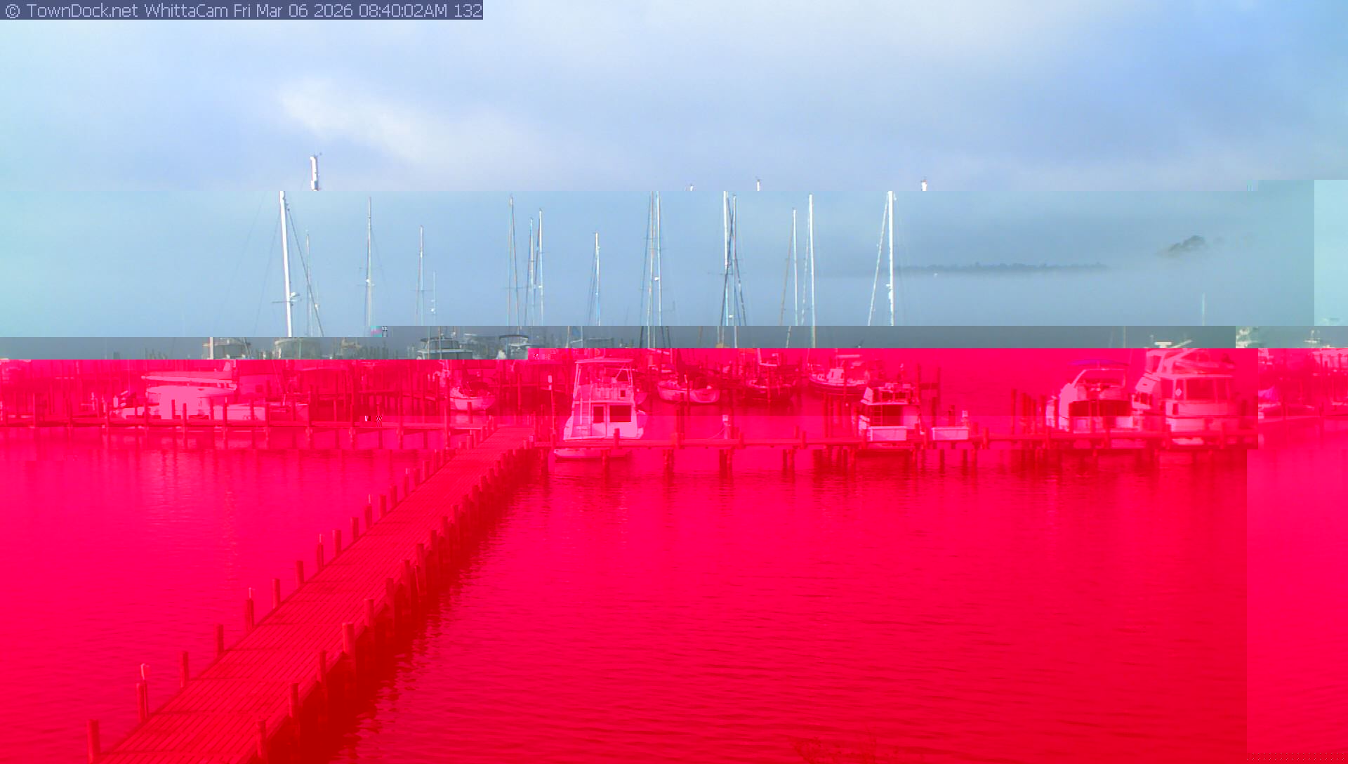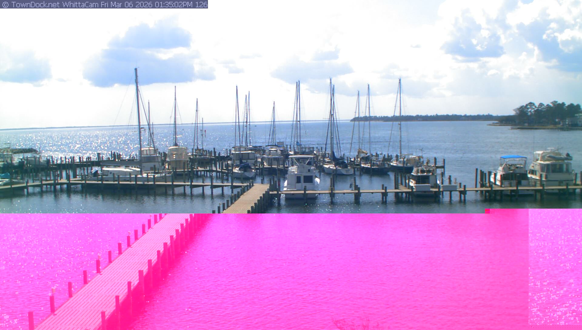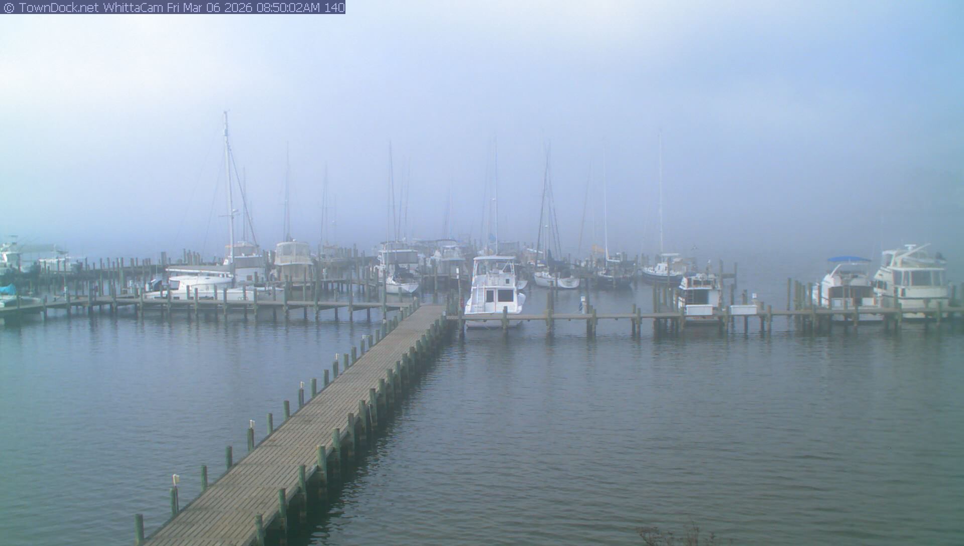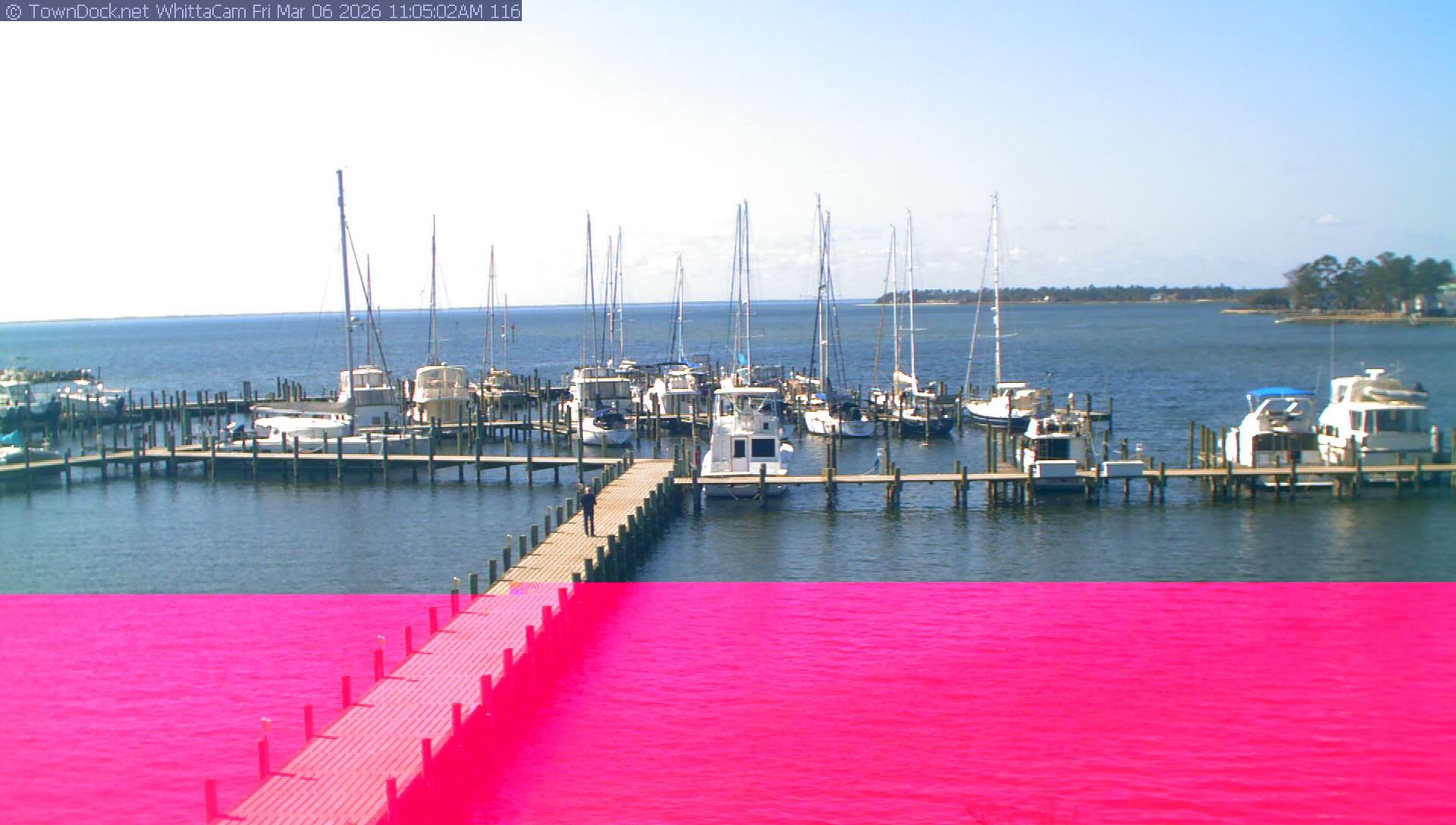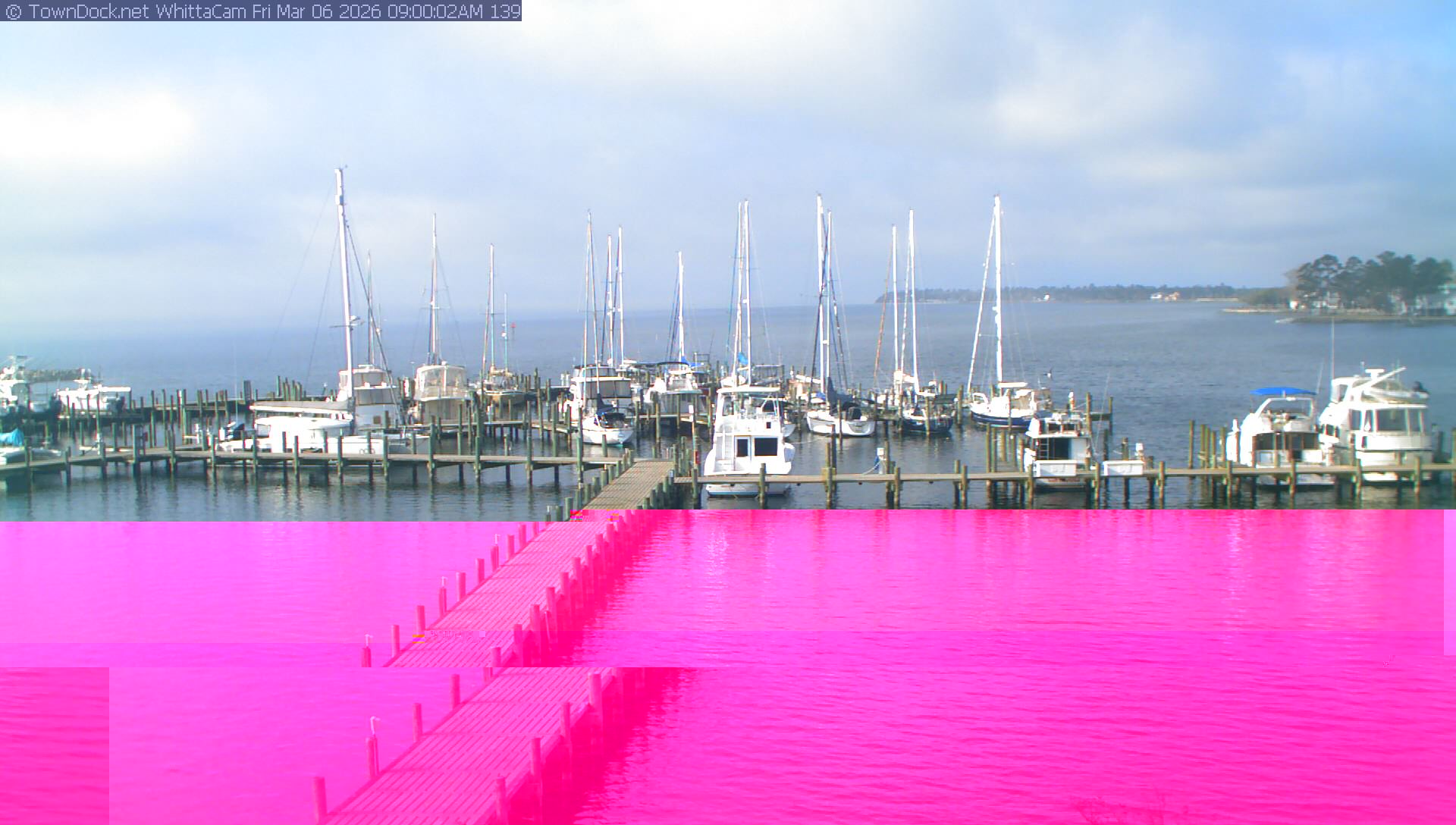 shows Whittaker Pointe Marina and the Whittaker Creek Channel entrance, with the Neuse River in the background. WhittaCam takes a new picture every five minutes from dawn til just before dusk. Click on the image to see a larger version. Once you see that larger version, you can click (see arrow at right) to go back in time and see recent photos. Harbor Cam currently takes photos from 6:30am to 5:30pm.