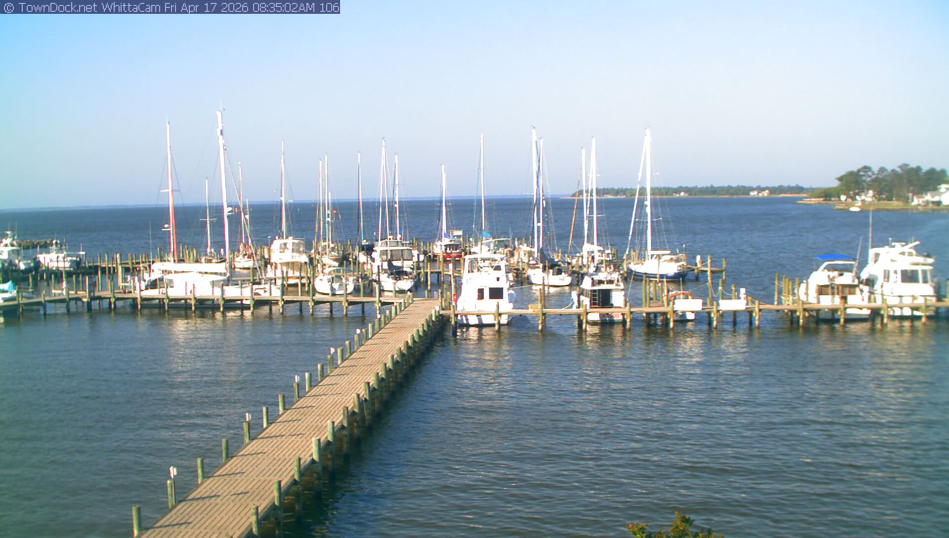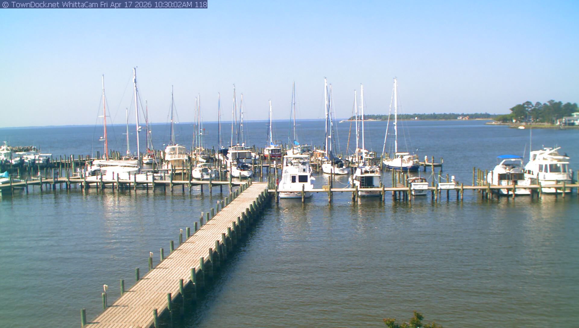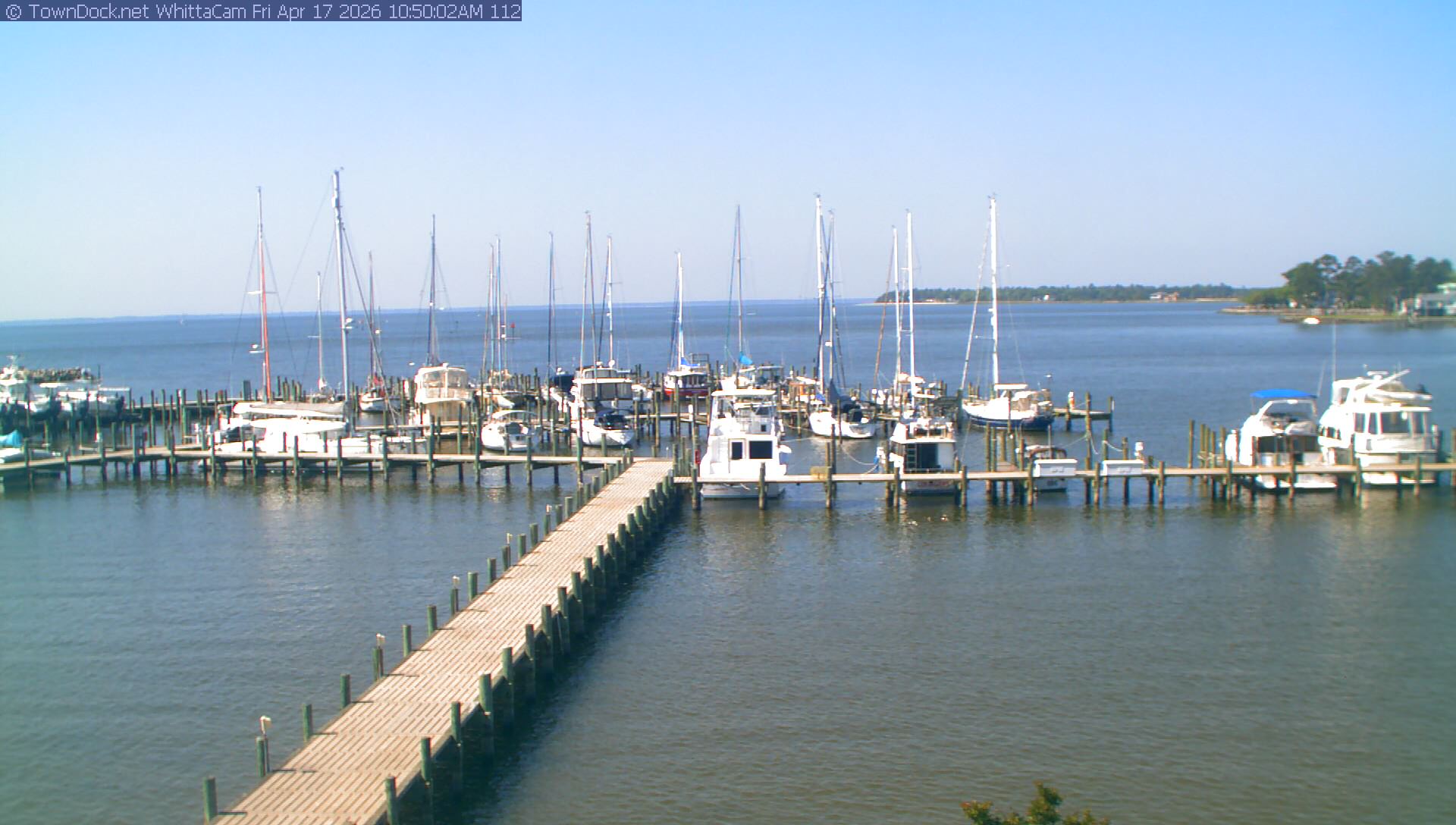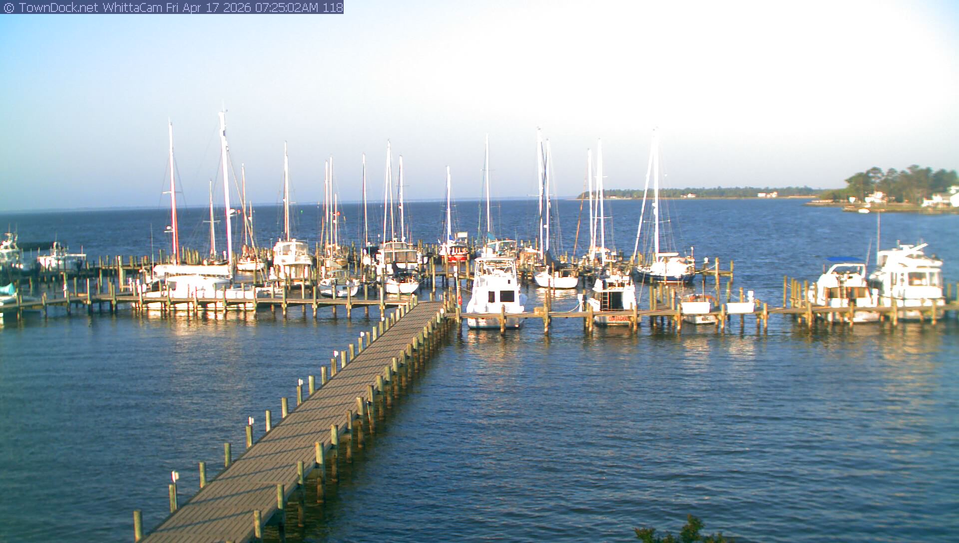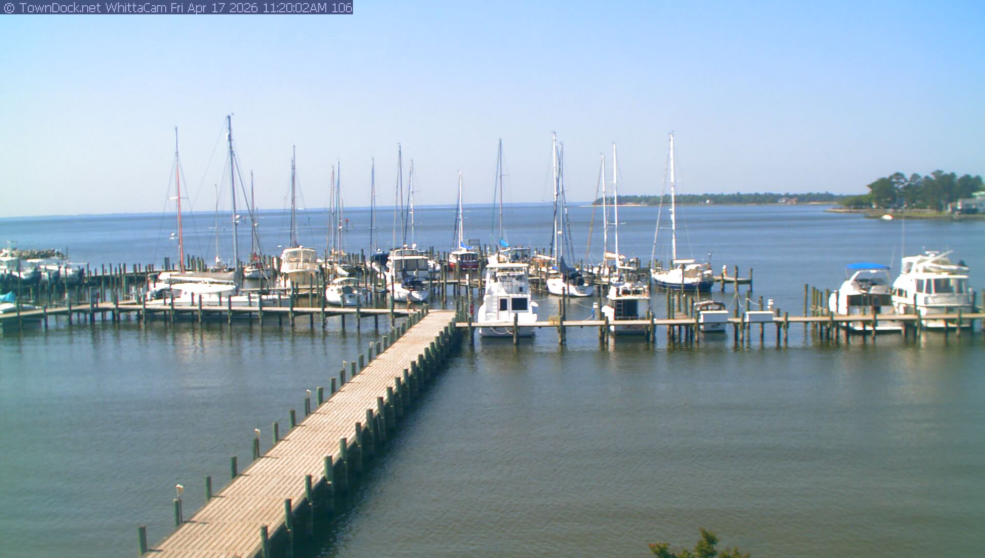 shows Whittaker Pointe Marina and the Whittaker Creek Channel entrance, with the Neuse River in the background. WhittaCam takes a new picture every five minutes from dawn til just before dusk. Click on the image to see a larger version. Once you see that larger version, you can click (see arrow at right) to go back in time and see recent photos. During the month of April, WhittaCam takes photos from 6:00a to 7:30p.