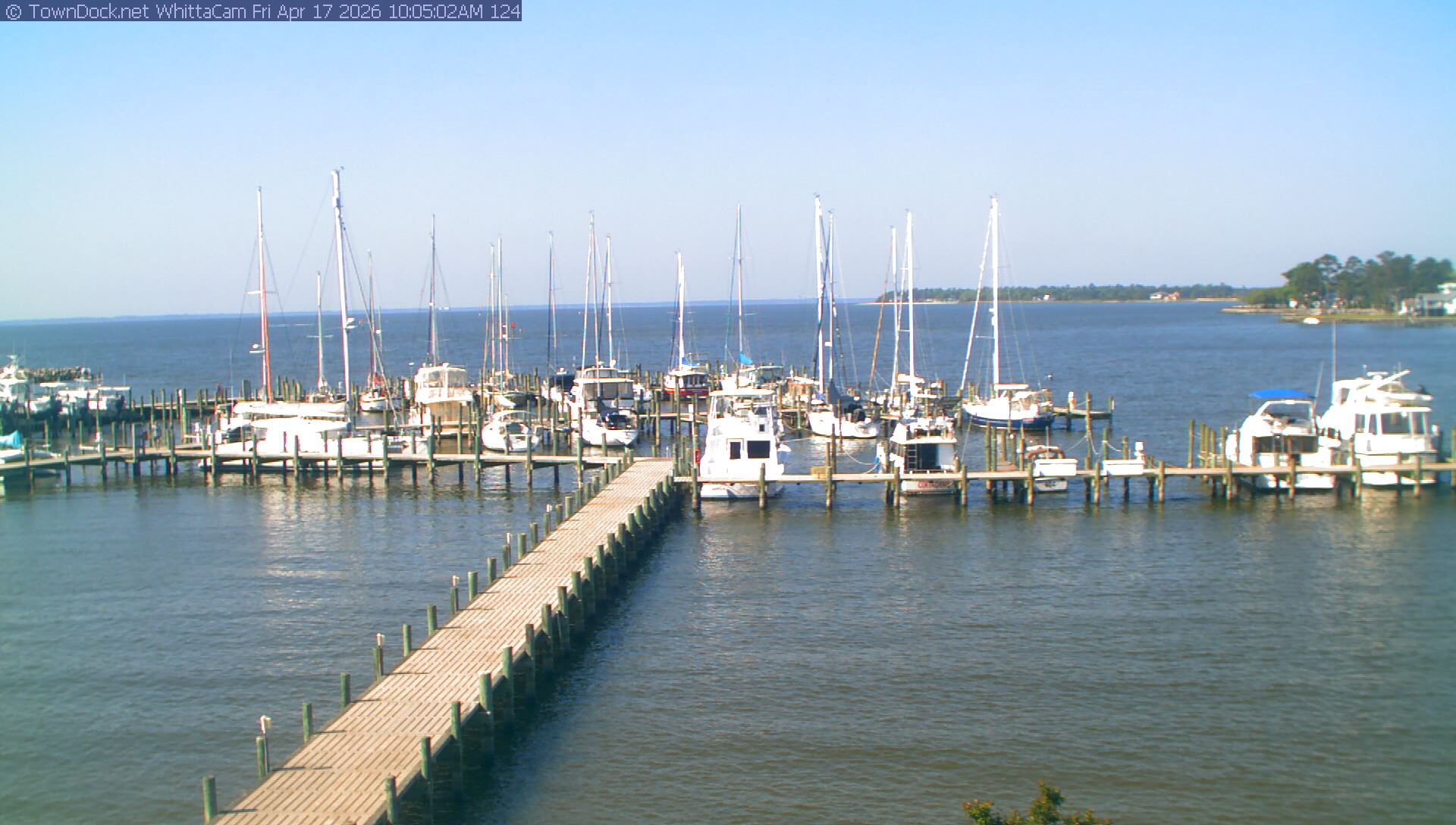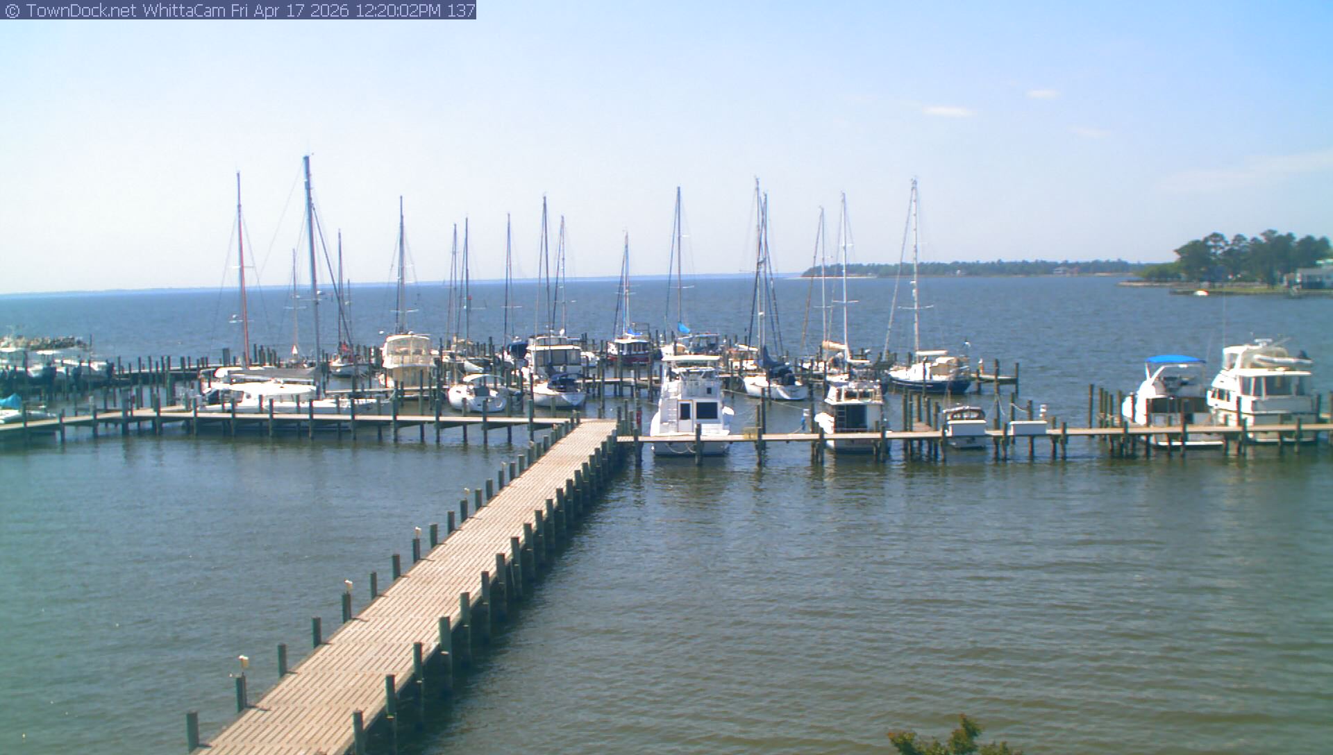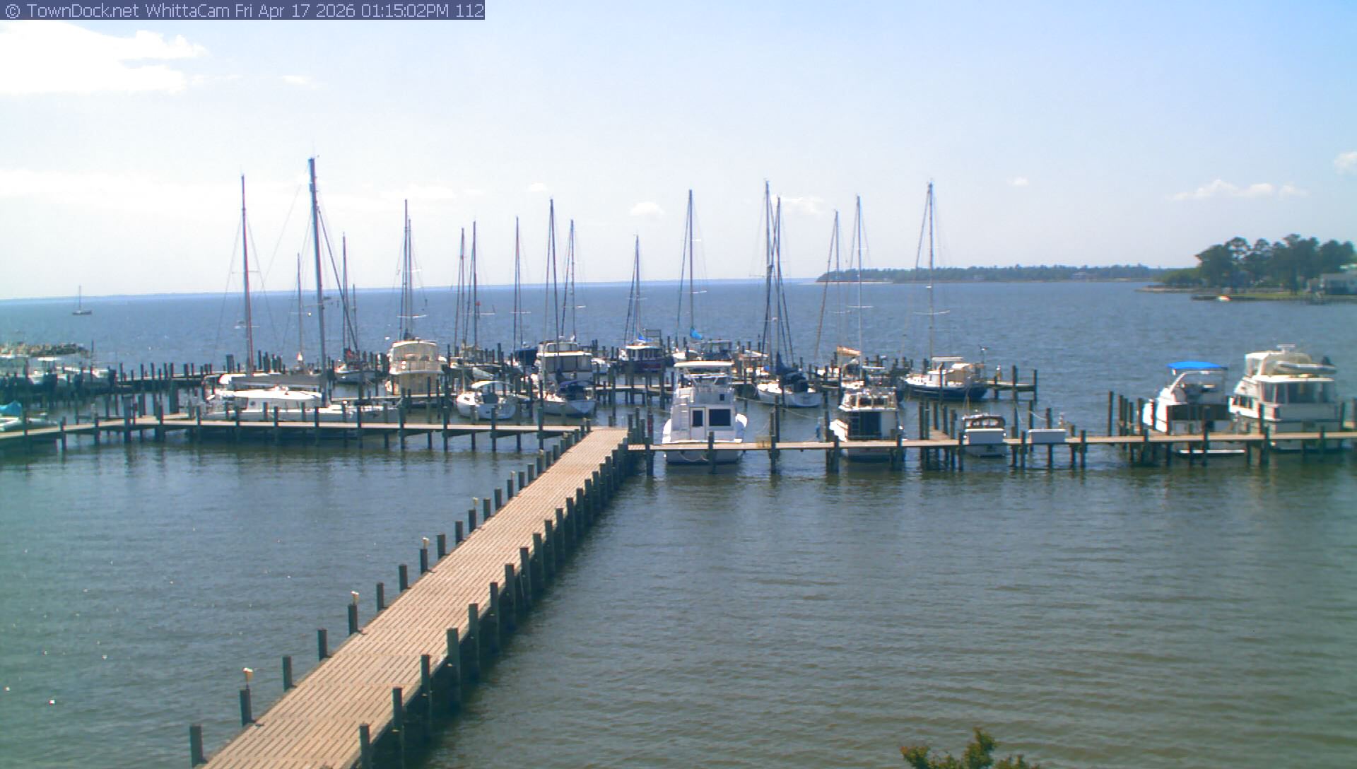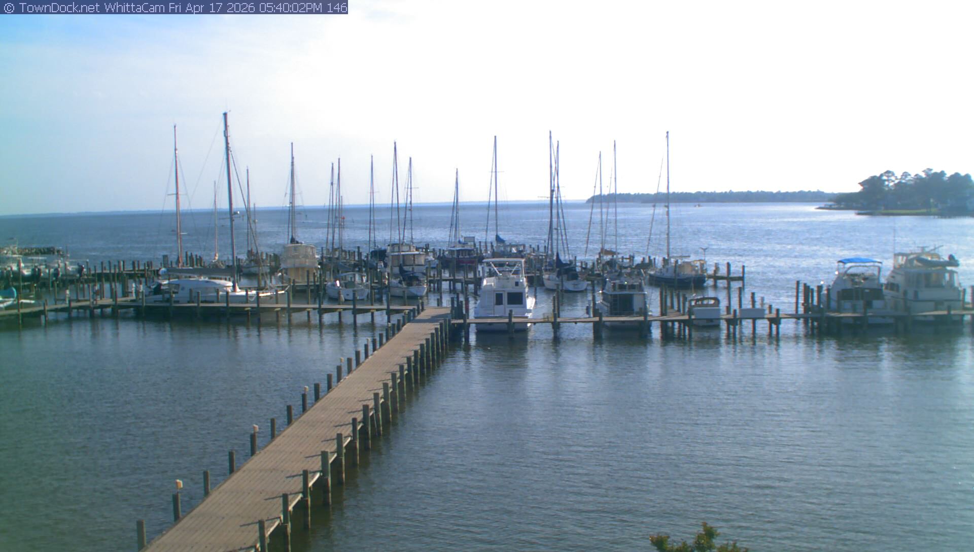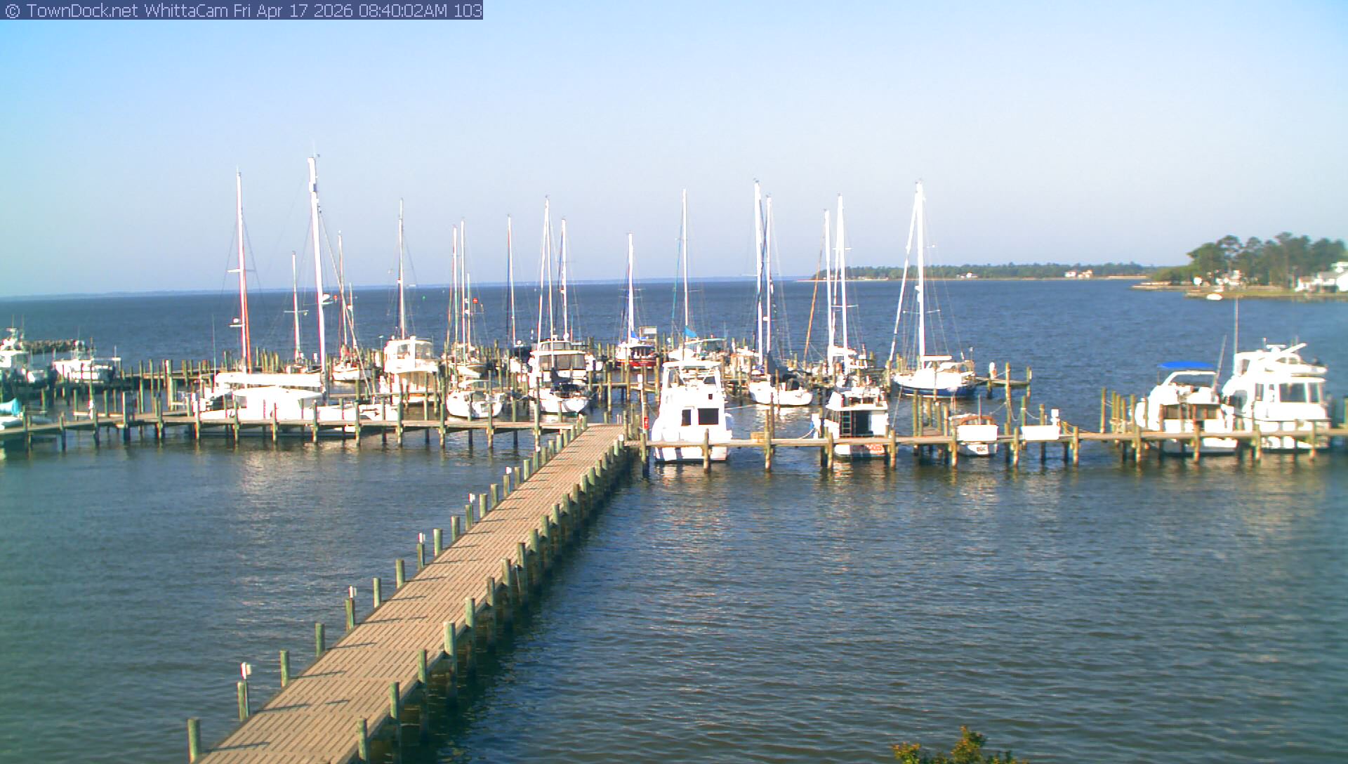 shows Whittaker Pointe Marina and the Whittaker Creek Channel entrance, with the Neuse River in the background. WhittaCam takes a new picture every five minutes from dawn til just before dusk. Click on the image to see a larger version. Once you see that larger version, you can click (see arrow at right) to go back in time and see recent photos. During the month of April, WhittaCam takes photos from 6:00a to 7:30p.