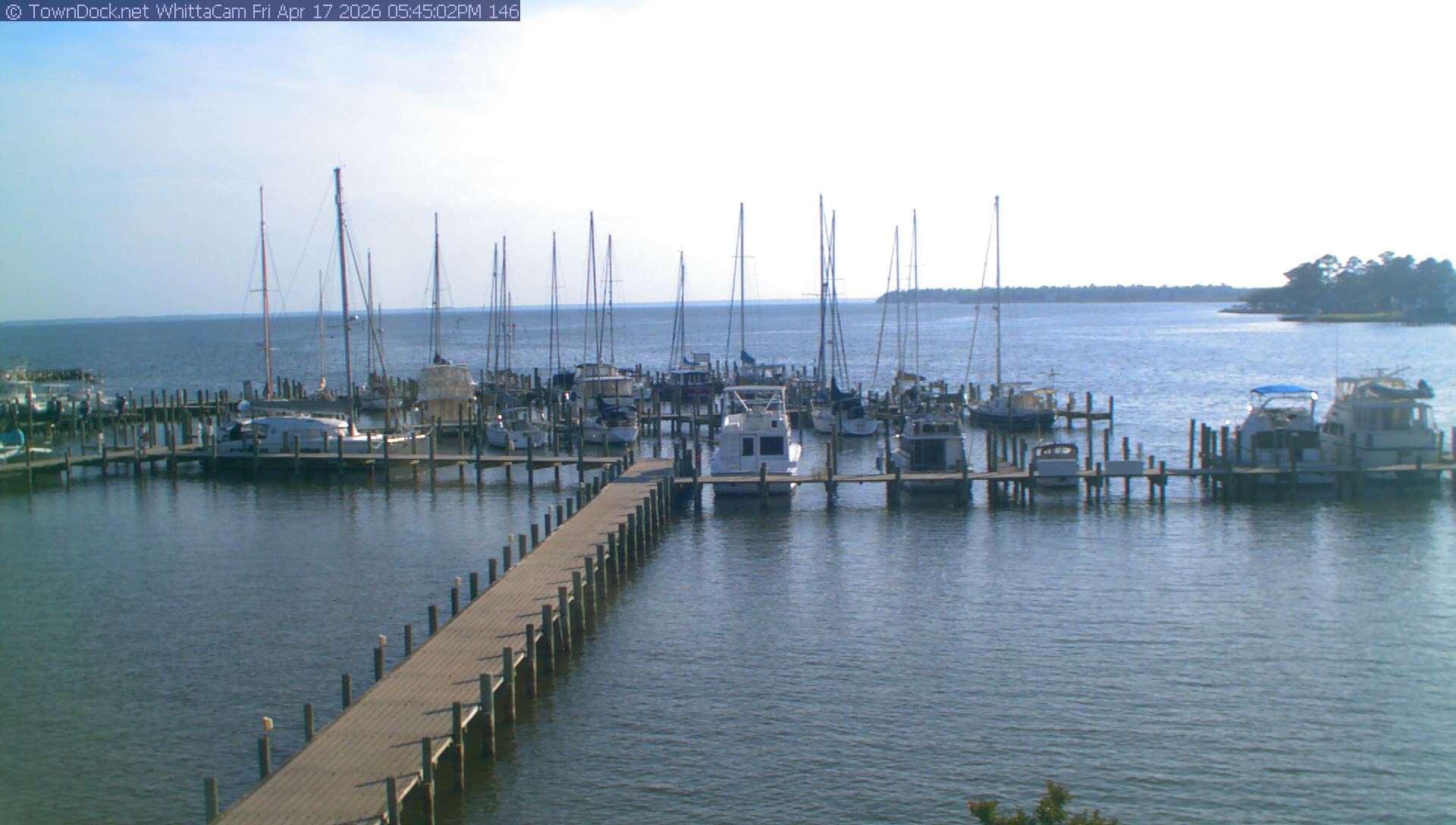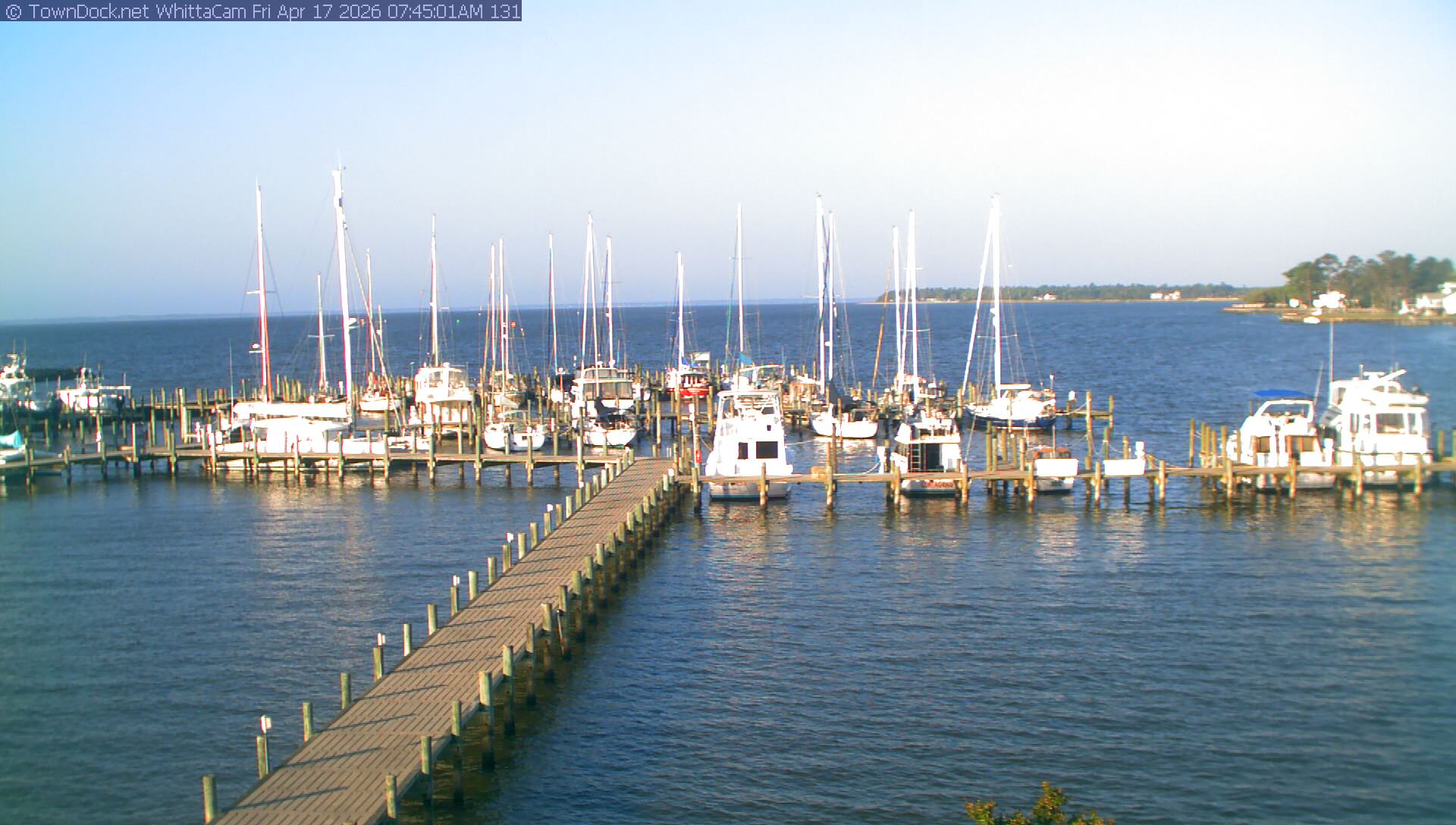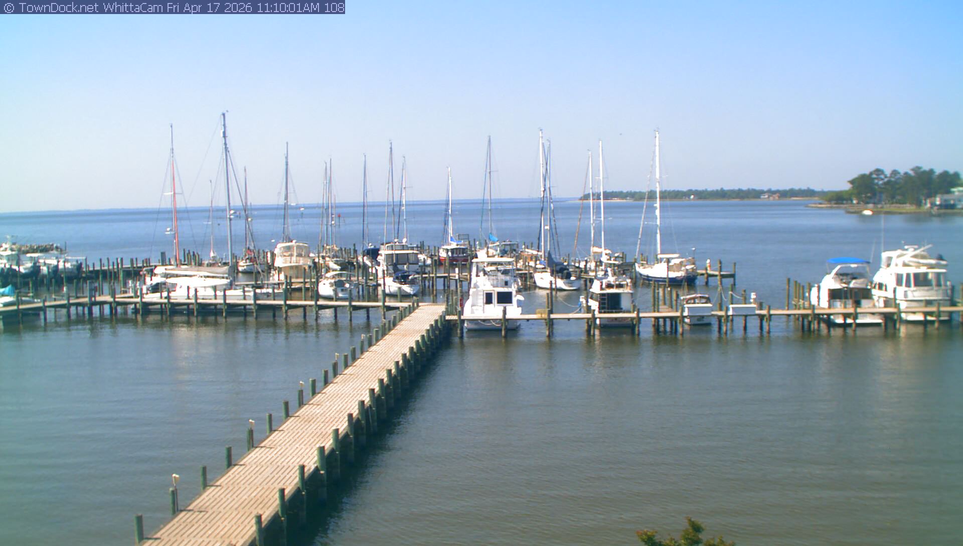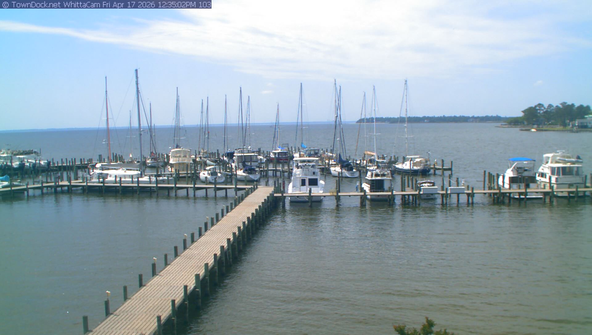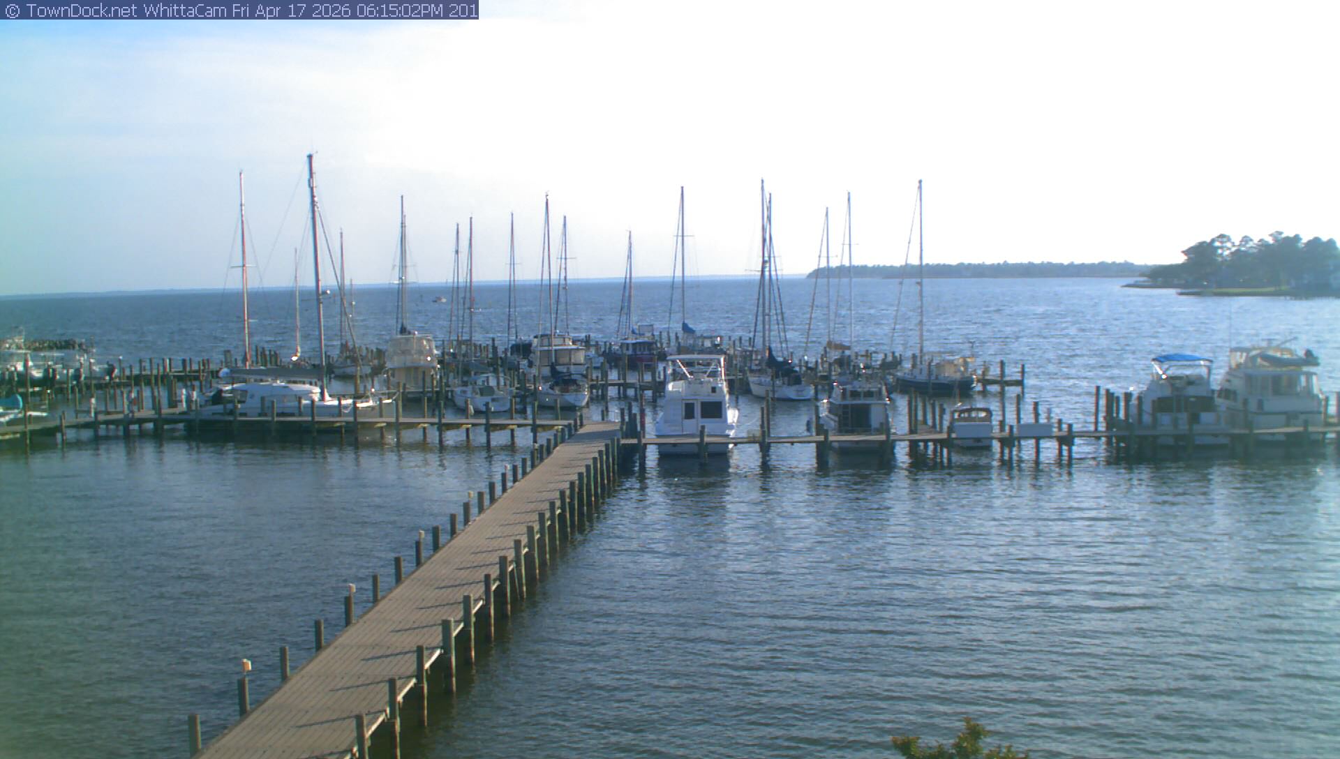 shows Whittaker Pointe Marina and the Whittaker Creek Channel entrance, with the Neuse River in the background. WhittaCam takes a new picture every five minutes from dawn til just before dusk. Click on the image to see a larger version. Once you see that larger version, you can click (see arrow at right) to go back in time and see recent photos. During the month of April, WhittaCam takes photos from 6:00a to 7:30p.