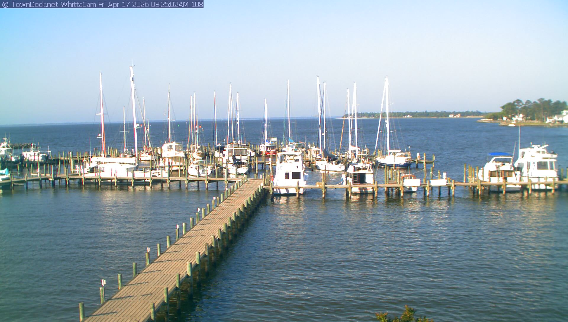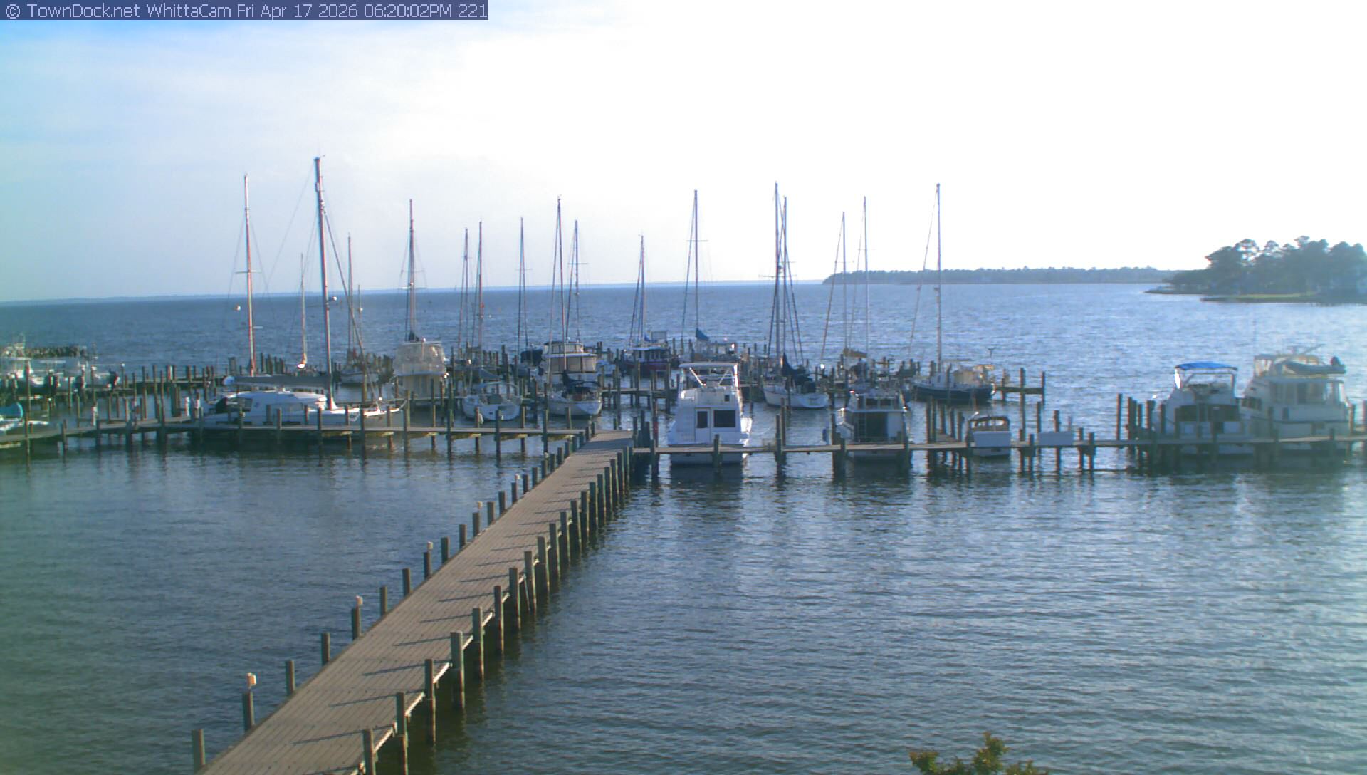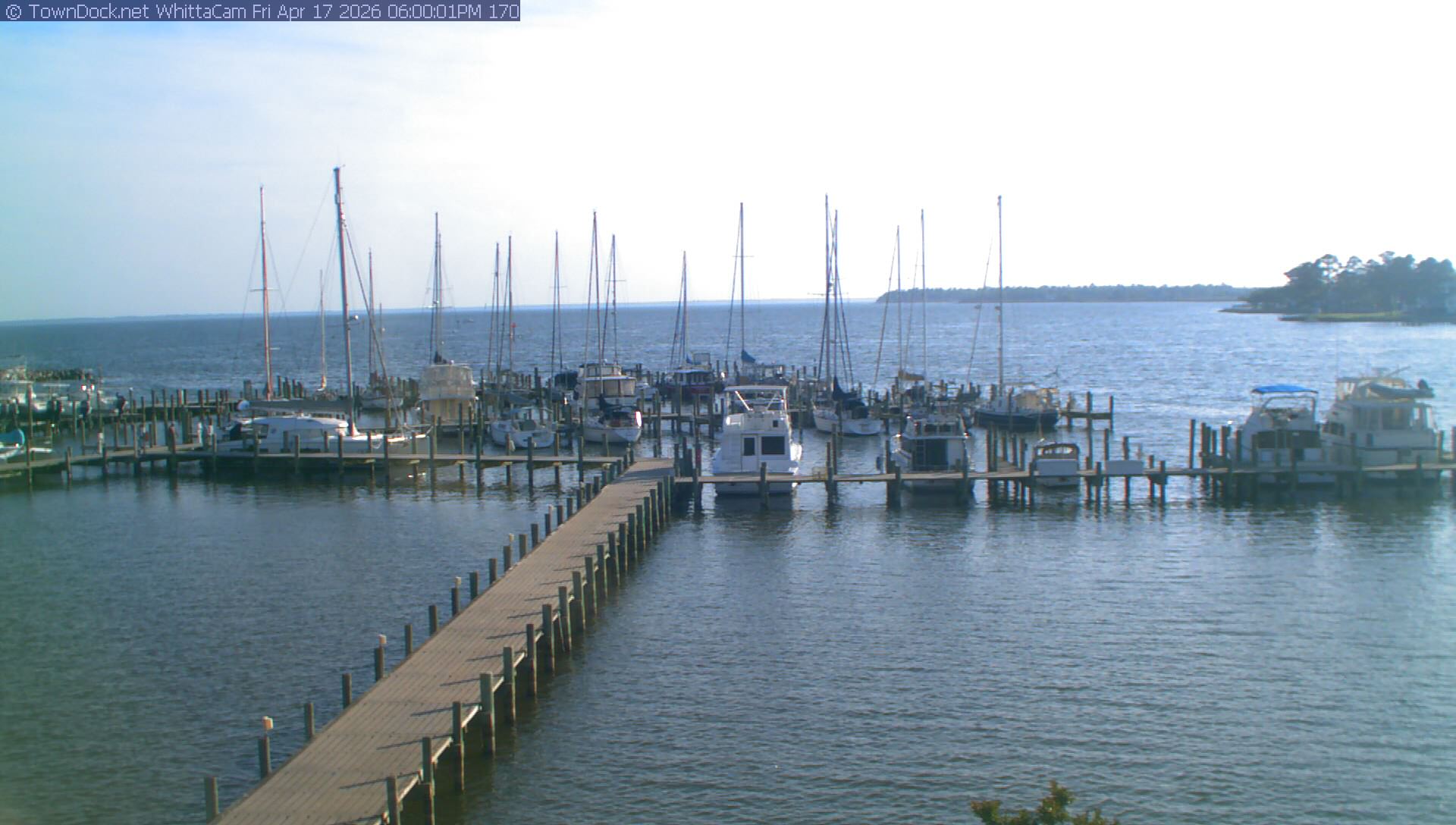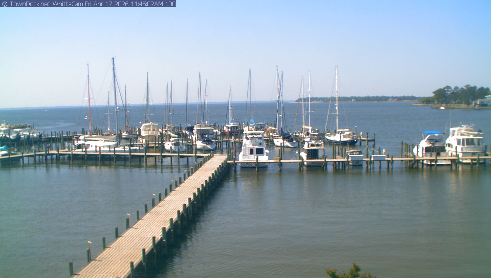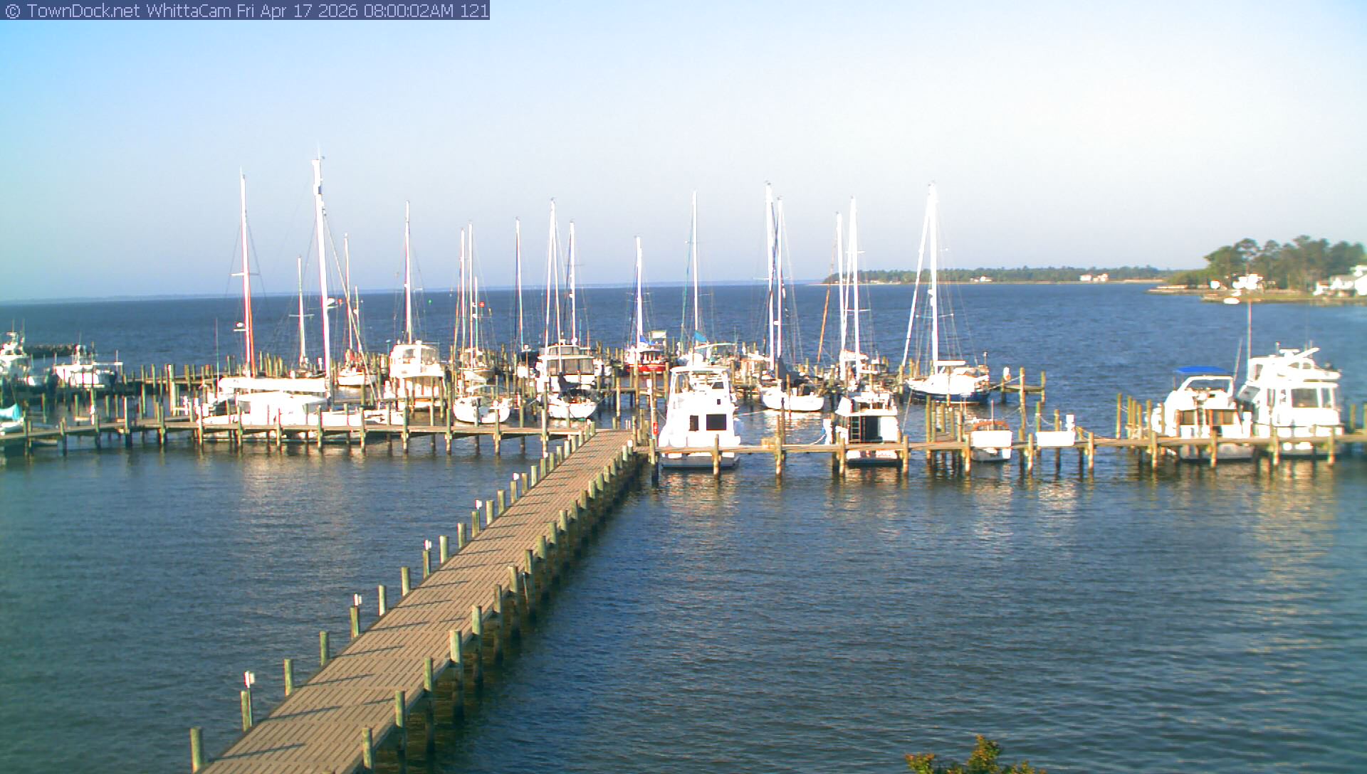 shows Whittaker Pointe Marina and the Whittaker Creek Channel entrance, with the Neuse River in the background. WhittaCam takes a new picture every five minutes from dawn til just before dusk. Click on the image to see a larger version. Once you see that larger version, you can click (see arrow at right) to go back in time and see recent photos. During the month of April, WhittaCam takes photos from 6:00a to 7:30p.