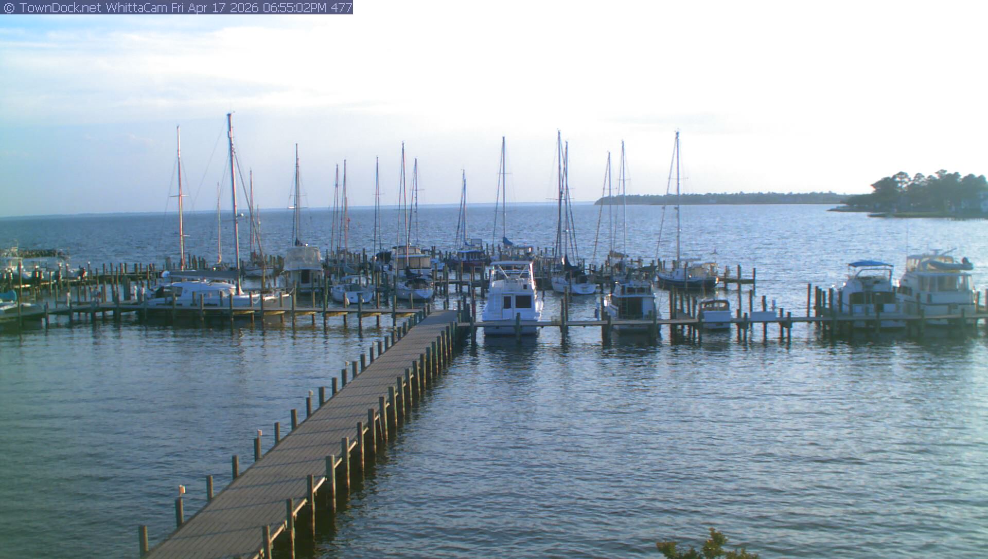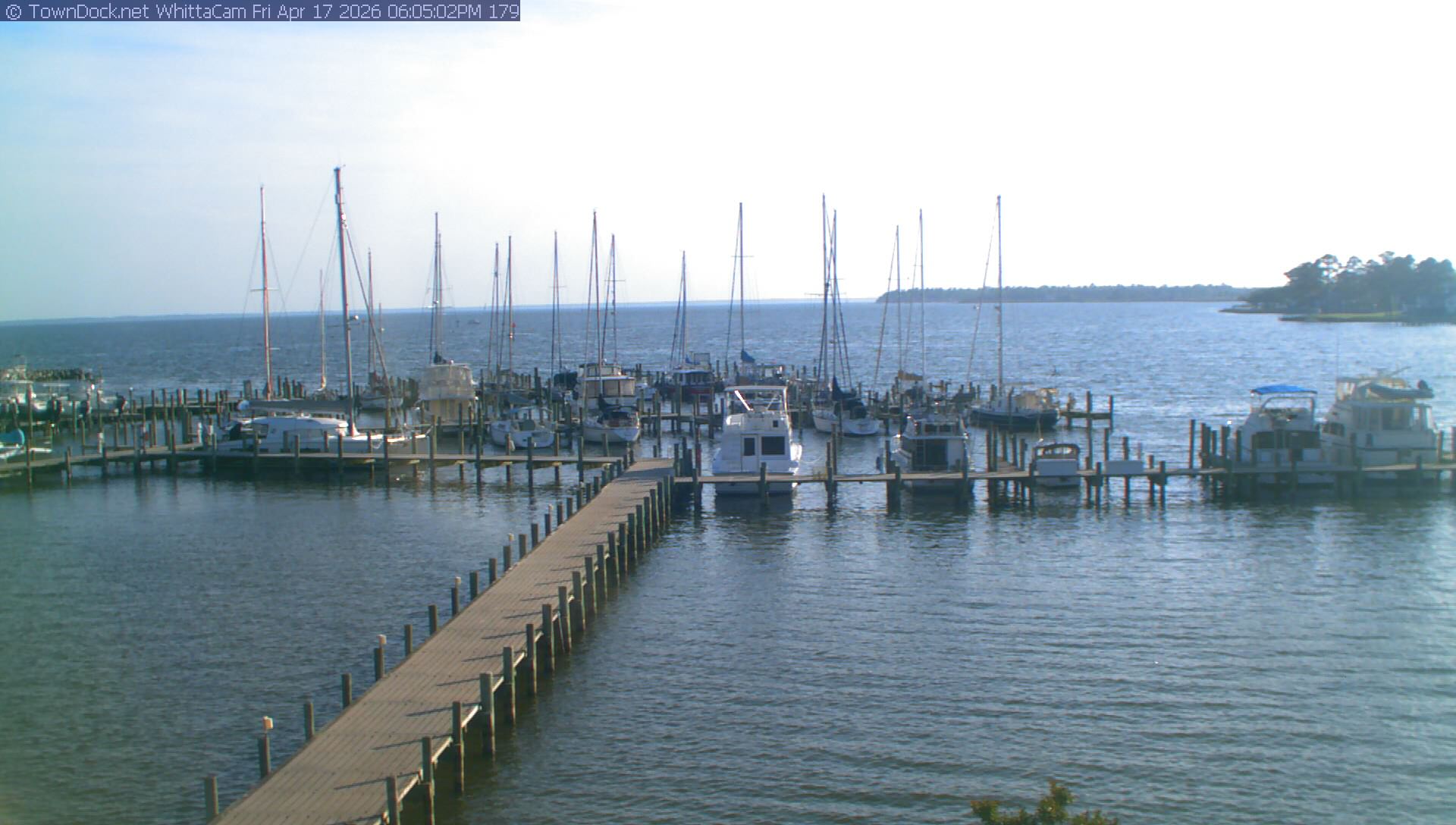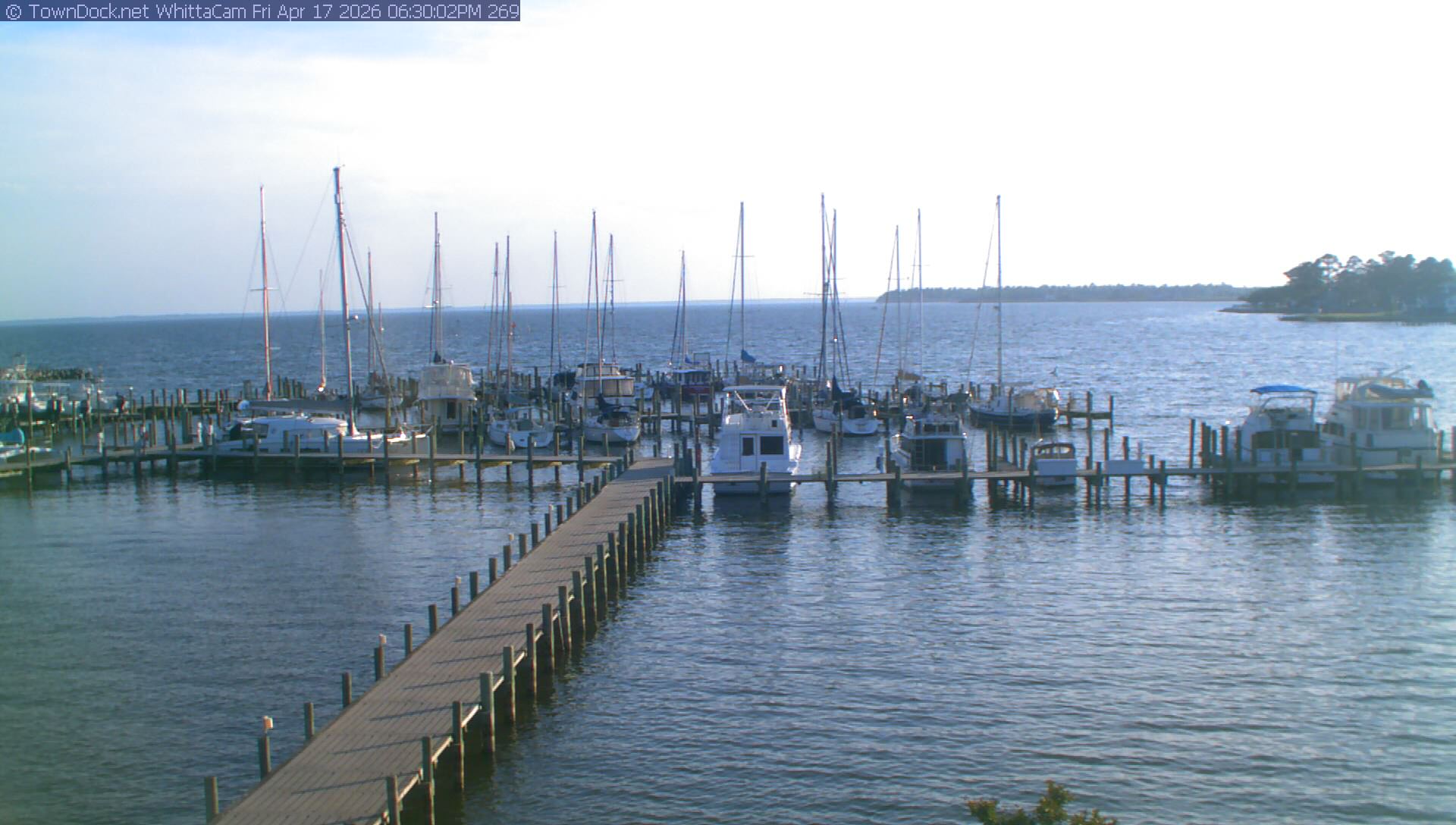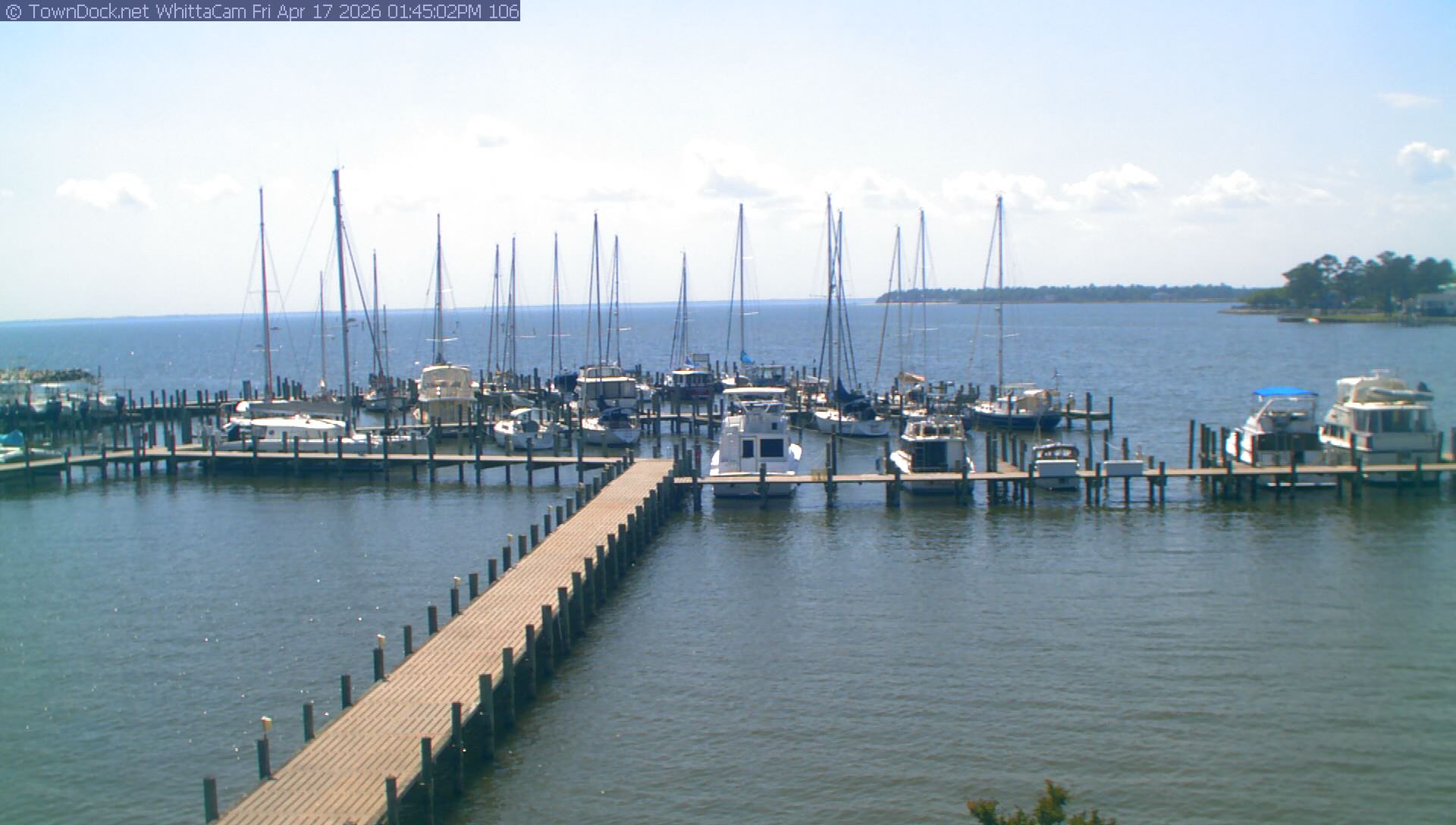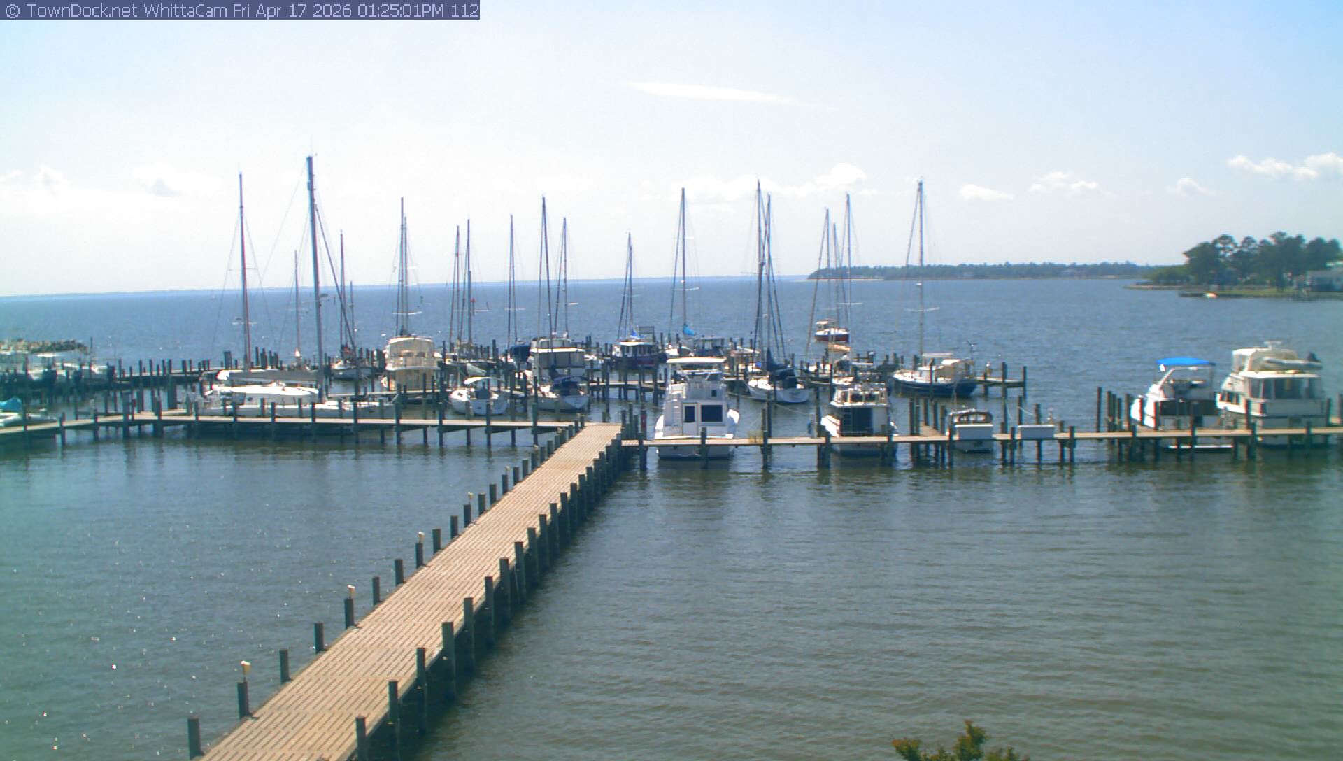shows Whittaker Pointe Marina and the Whittaker Creek Channel entrance, with the Neuse River in the background. WhittaCam takes a new picture every five minutes from dawn til just before dusk. Click on the image to see a larger version. Once you see that larger version, you can click (see arrow at right) to go back in time and see recent photos. During the month of April, WhittaCam takes photos from 6:00a to 7:30p.