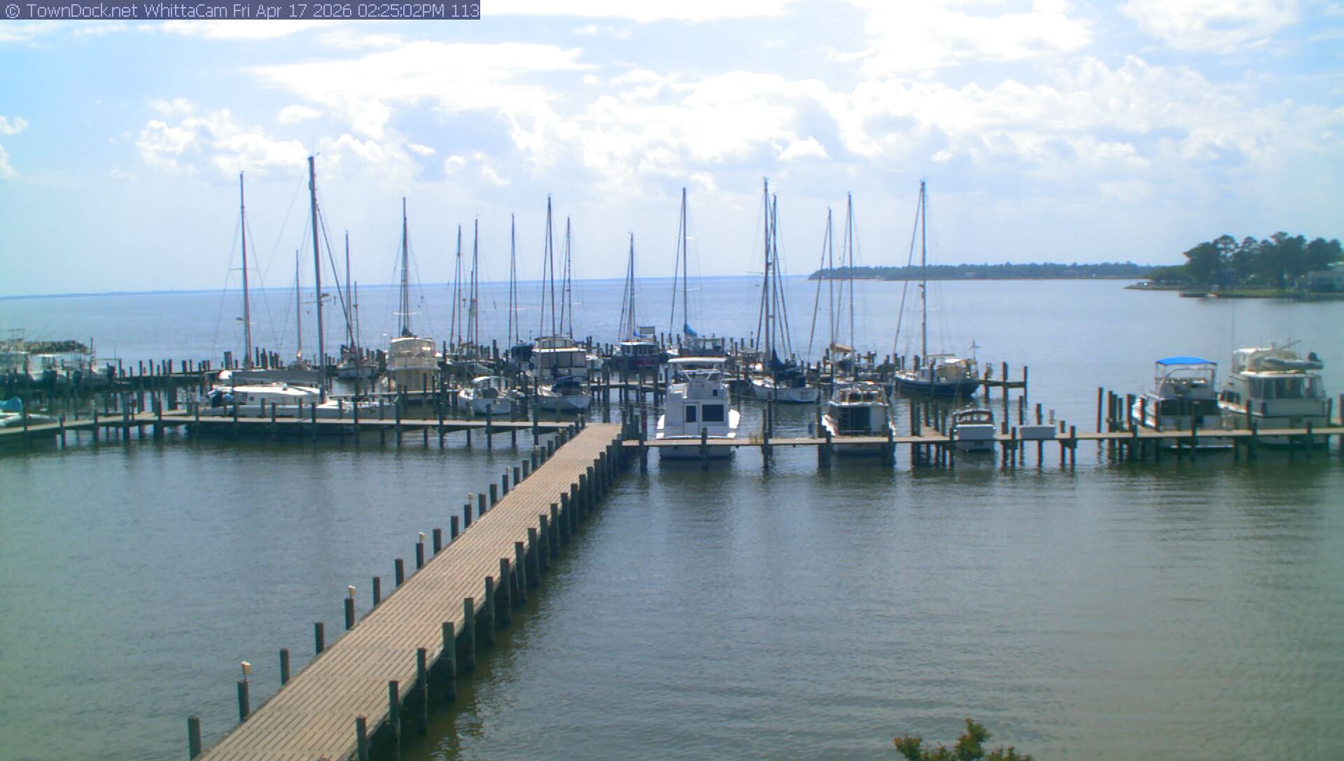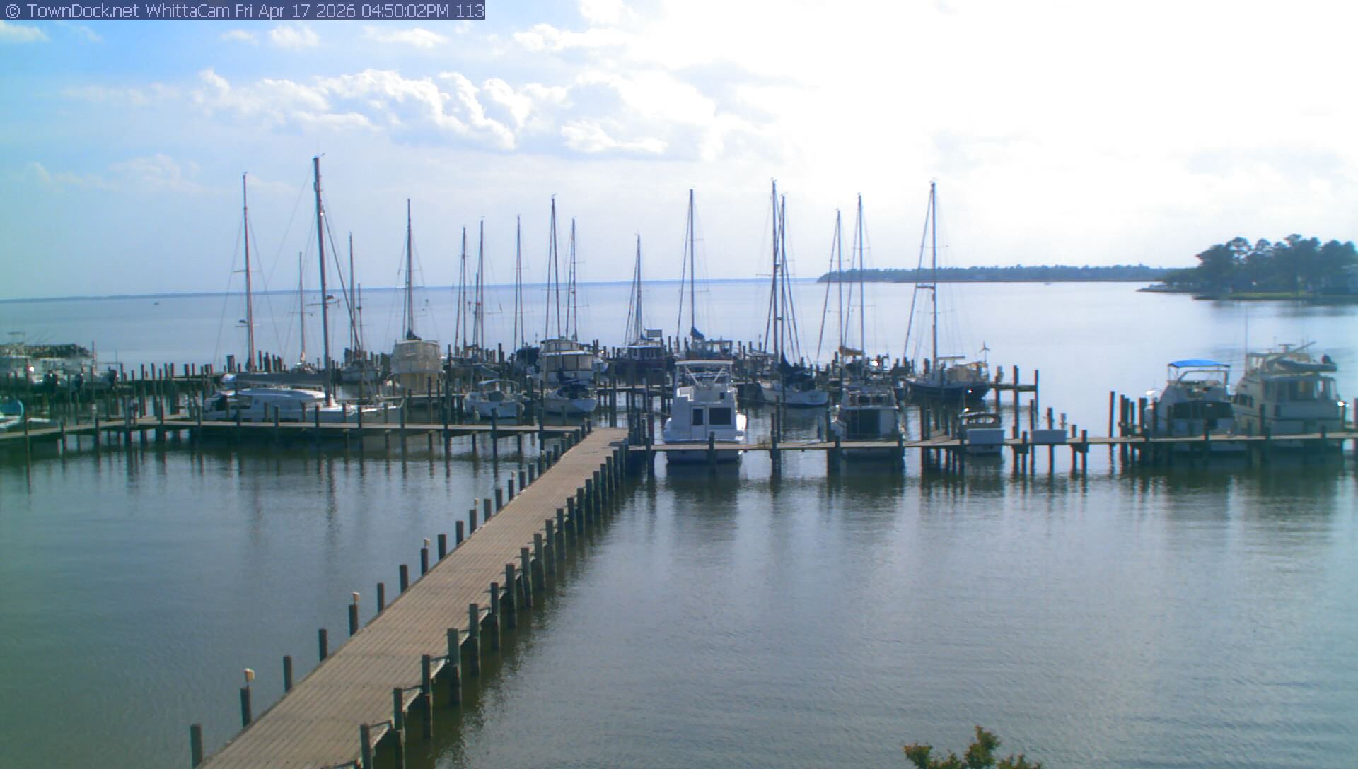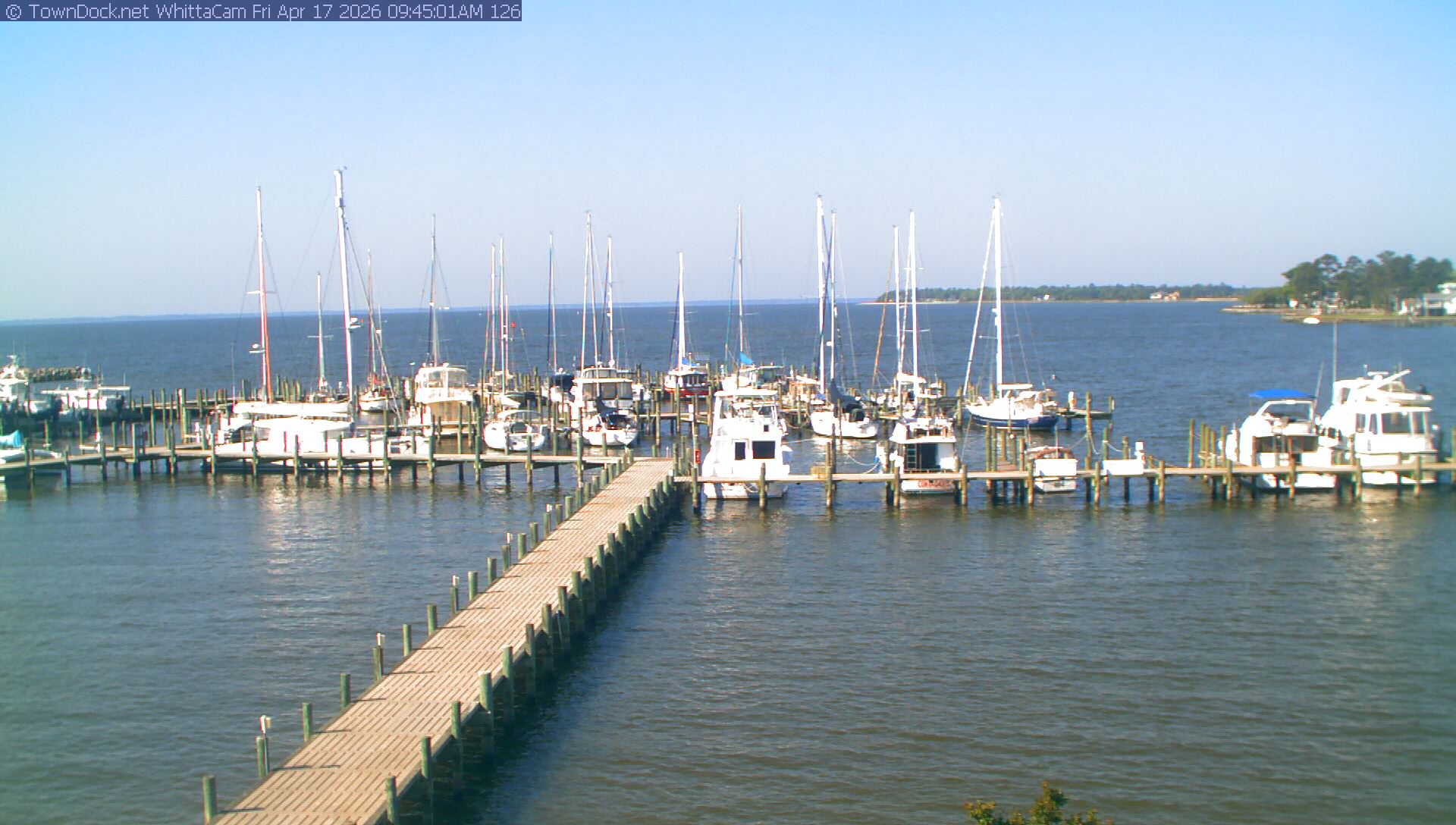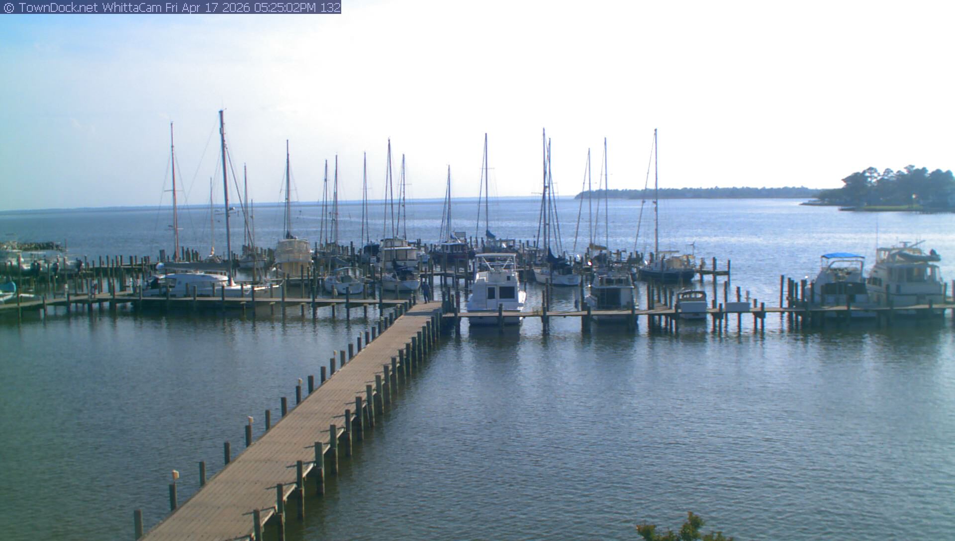 shows Whittaker Pointe Marina and the Whittaker Creek Channel entrance, with the Neuse River in the background. WhittaCam takes a new picture every five minutes from dawn til just before dusk. Click on the image to see a larger version. Once you see that larger version, you can click (see arrow at right) to go back in time and see recent photos. During the month of April, WhittaCam takes photos from 6:00a to 7:30p.