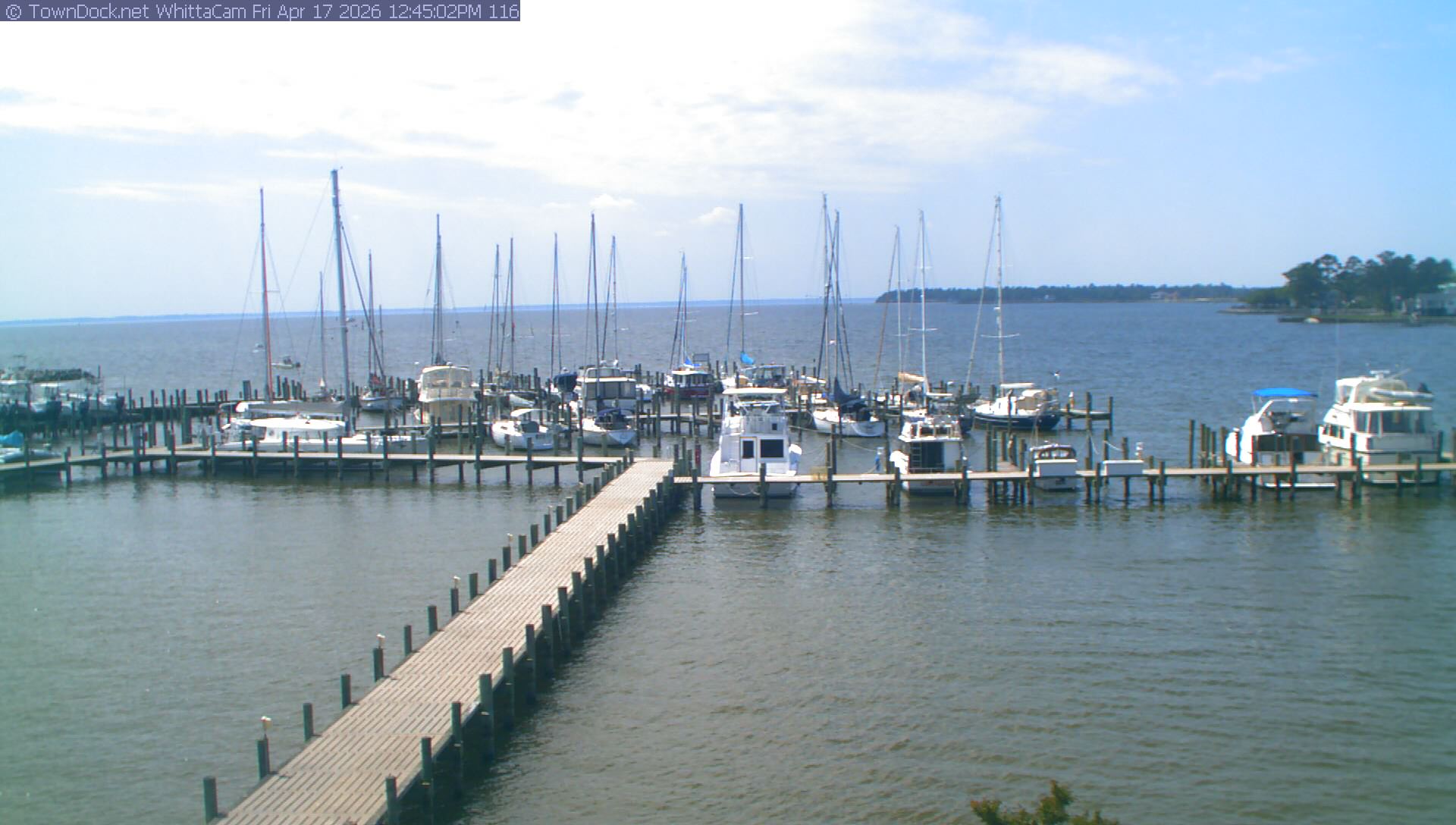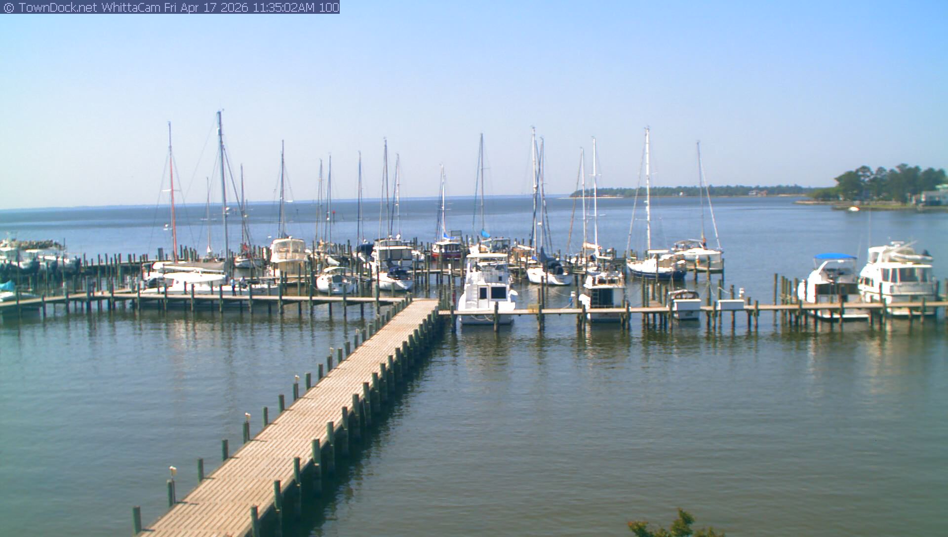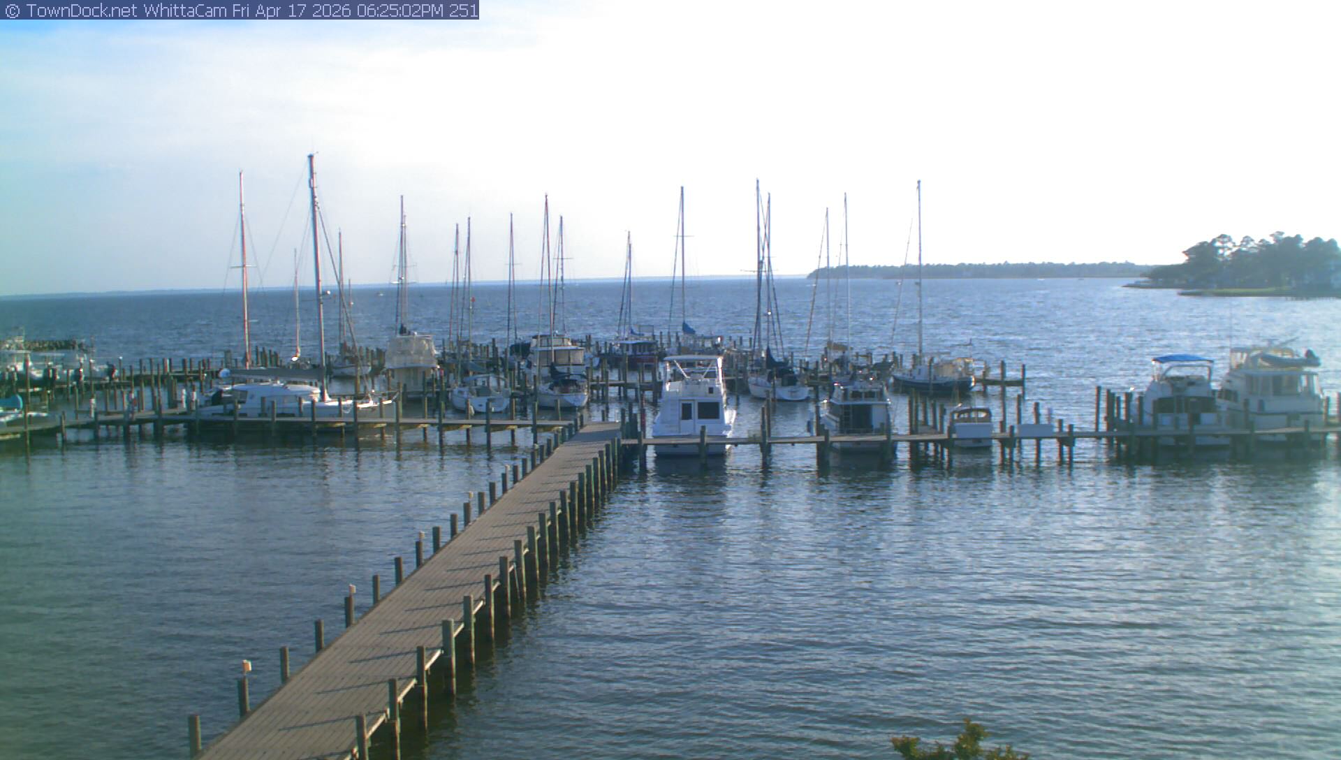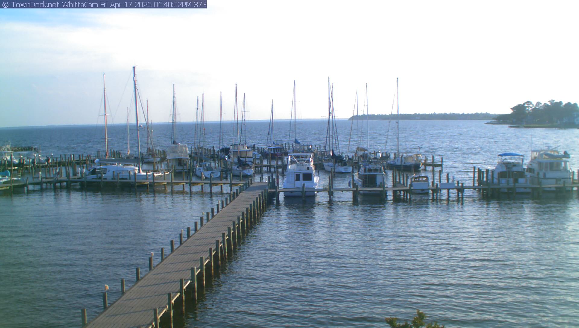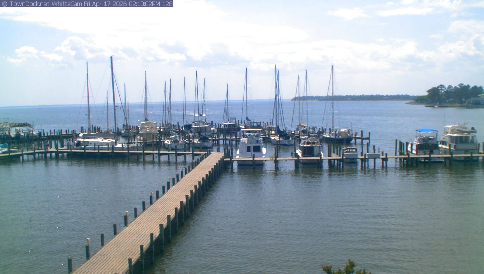 shows Whittaker Pointe Marina and the Whittaker Creek Channel entrance, with the Neuse River in the background. WhittaCam takes a new picture every five minutes from dawn til just before dusk. Click on the image to see a larger version. Once you see that larger version, you can click (see arrow at right) to go back in time and see recent photos. During the month of April, WhittaCam takes photos from 6:00a to 7:30p.