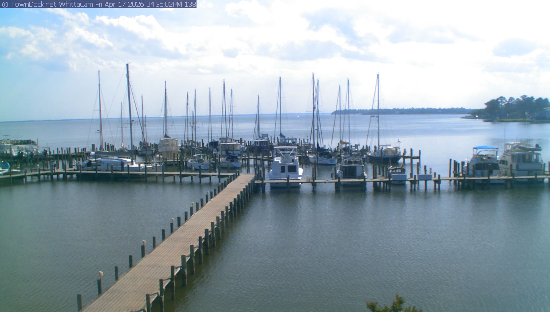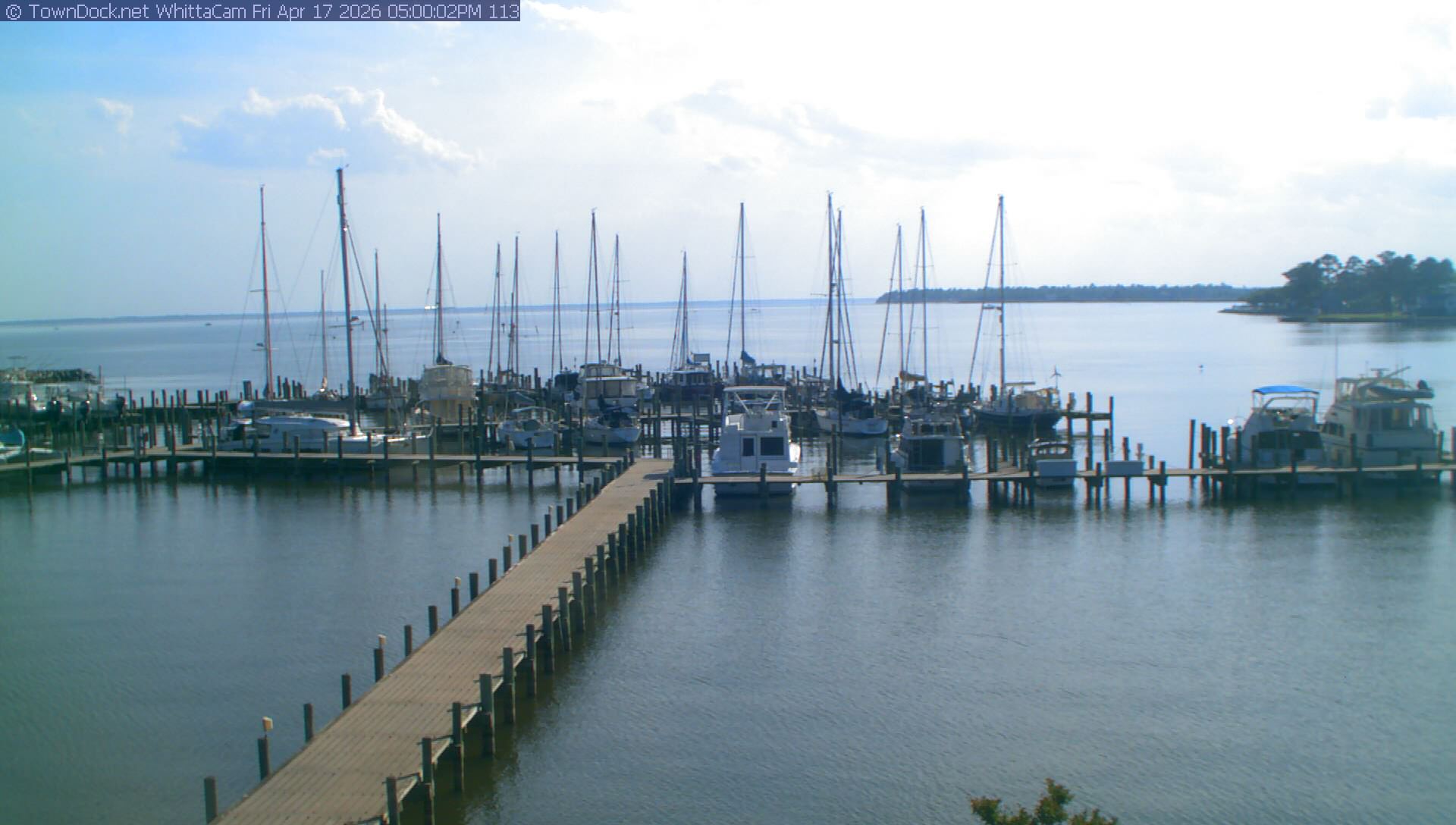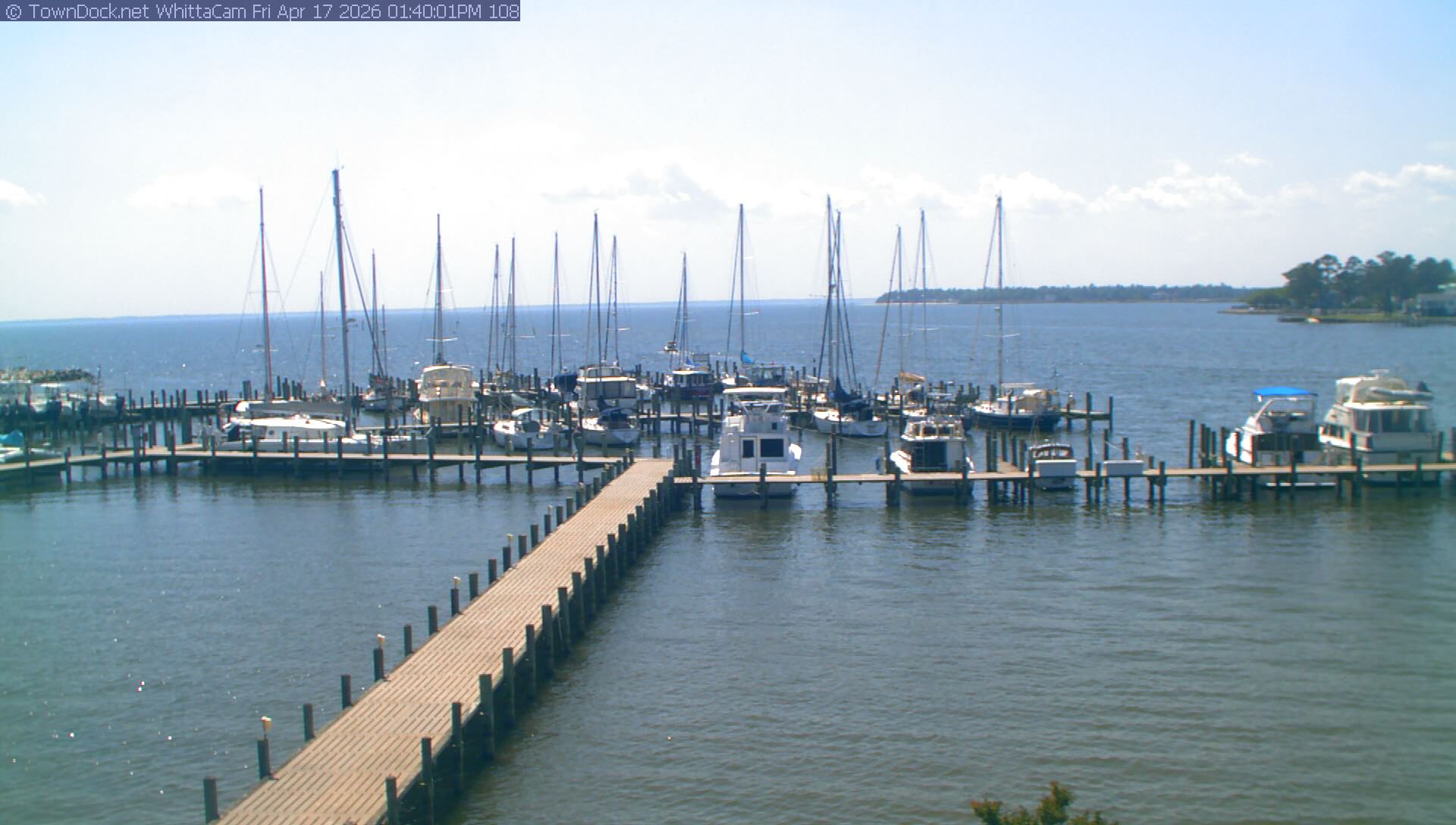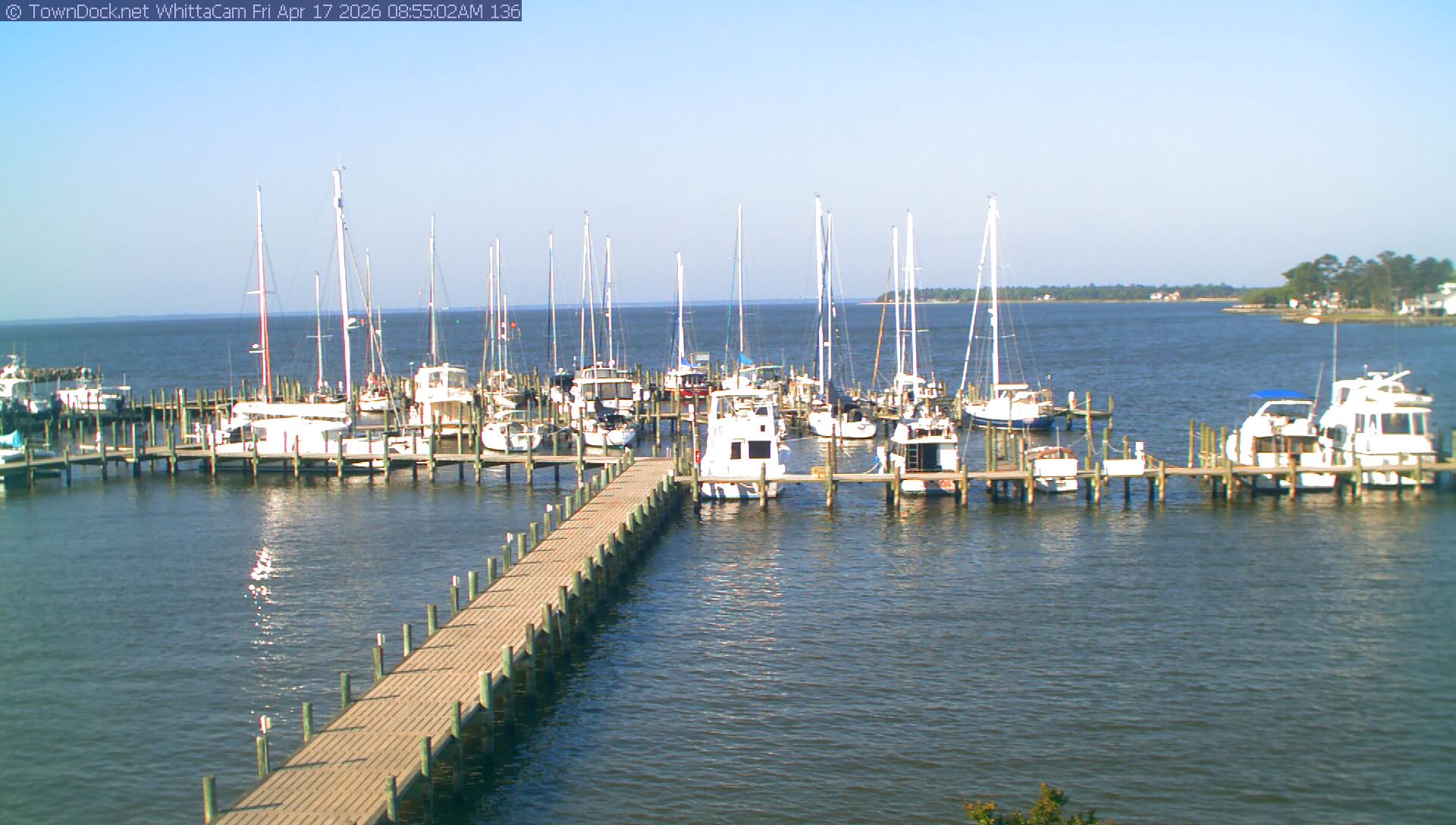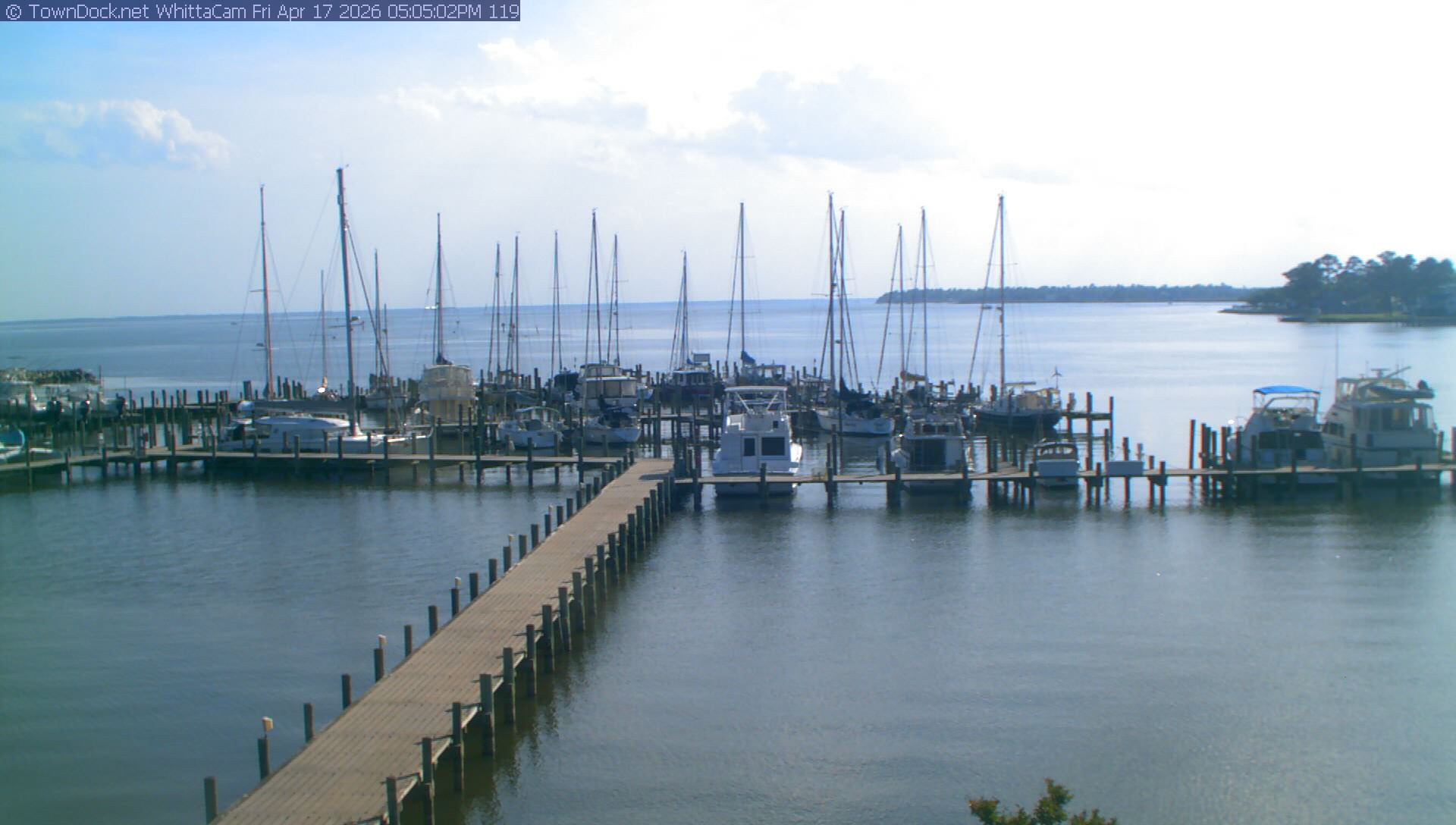shows Whittaker Pointe Marina and the Whittaker Creek Channel entrance, with the Neuse River in the background. WhittaCam takes a new picture every five minutes from dawn til just before dusk. Click on the image to see a larger version. Once you see that larger version, you can click (see arrow at right) to go back in time and see recent photos. During the month of April, WhittaCam takes photos from 6:00a to 7:30p.