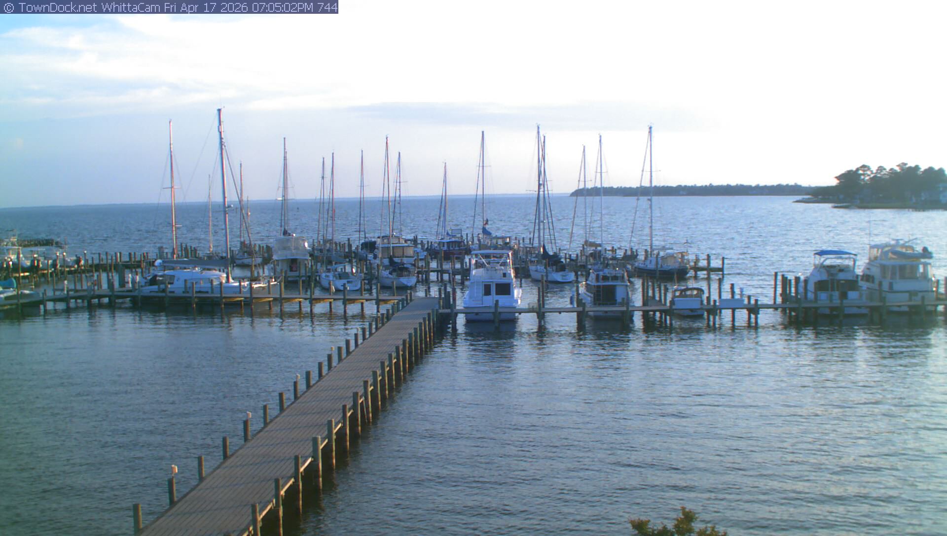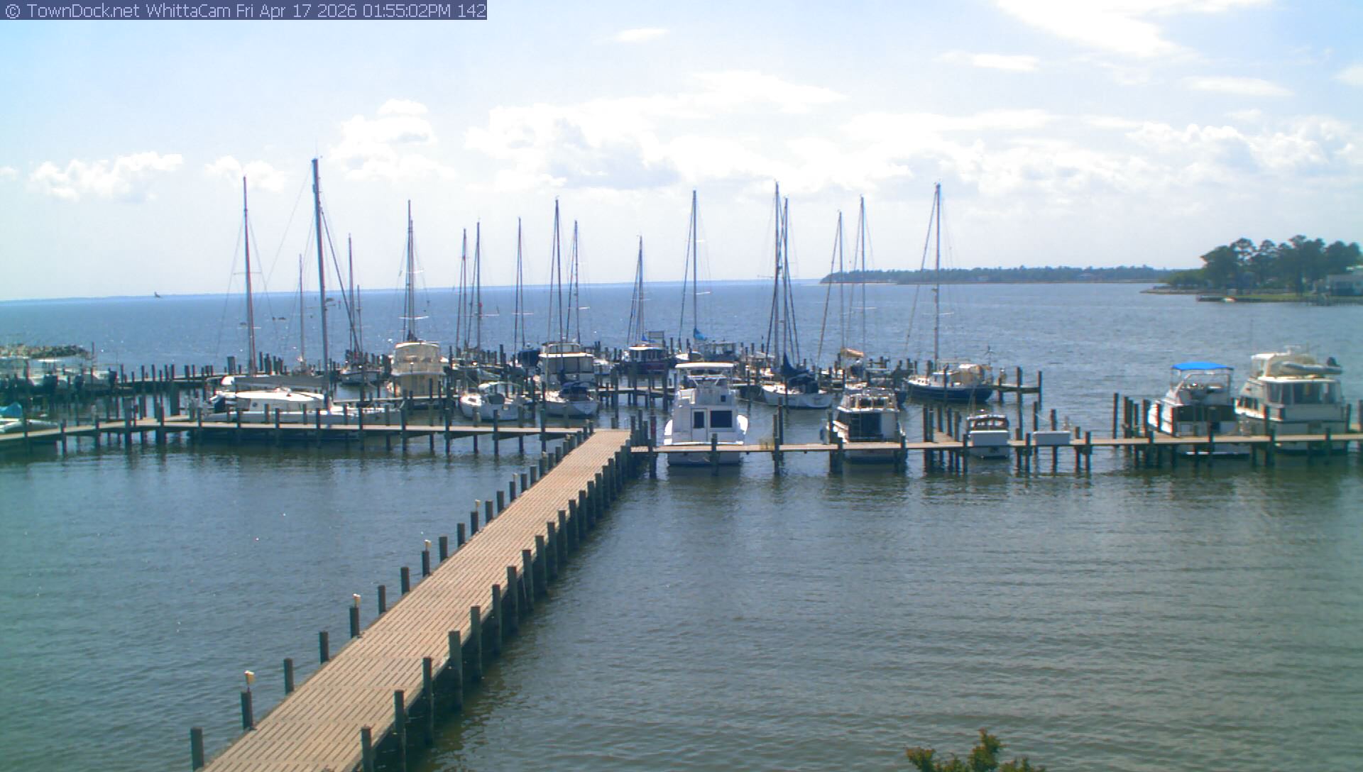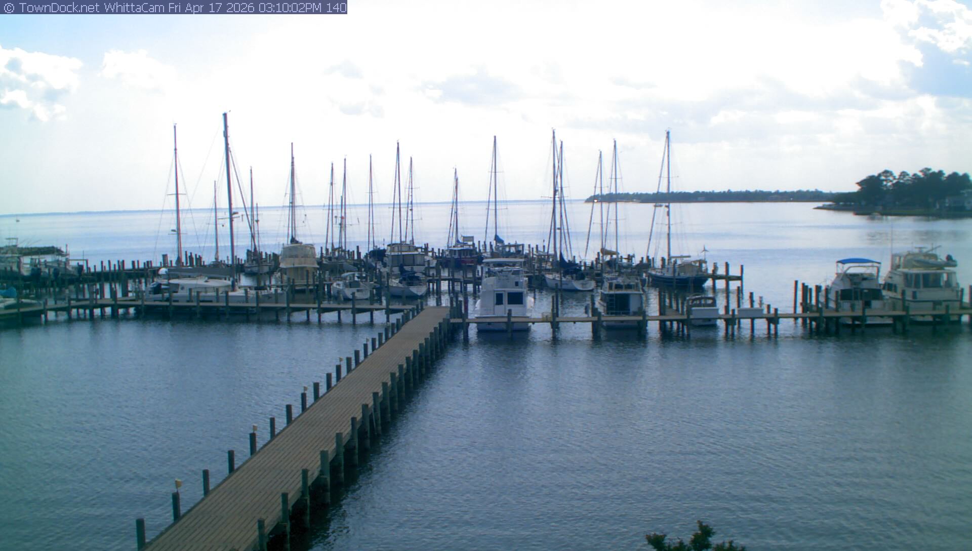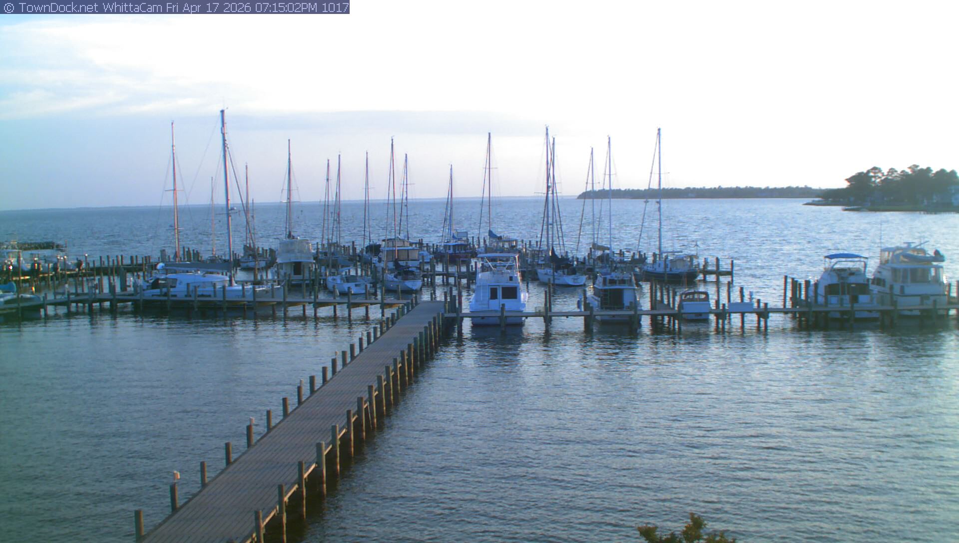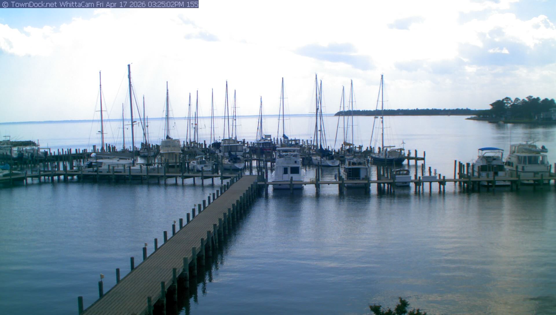 shows Whittaker Pointe Marina and the Whittaker Creek Channel entrance, with the Neuse River in the background. WhittaCam takes a new picture every five minutes from dawn til just before dusk. Click on the image to see a larger version. Once you see that larger version, you can click (see arrow at right) to go back in time and see recent photos. During the month of April, WhittaCam takes photos from 6:00a to 7:30p.