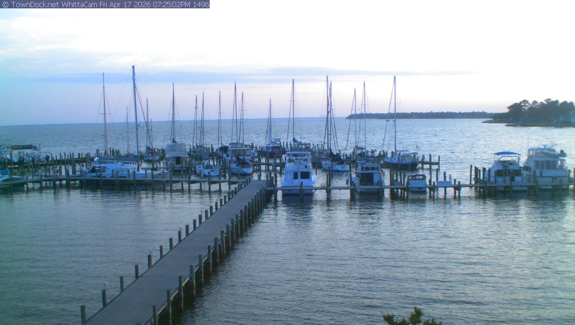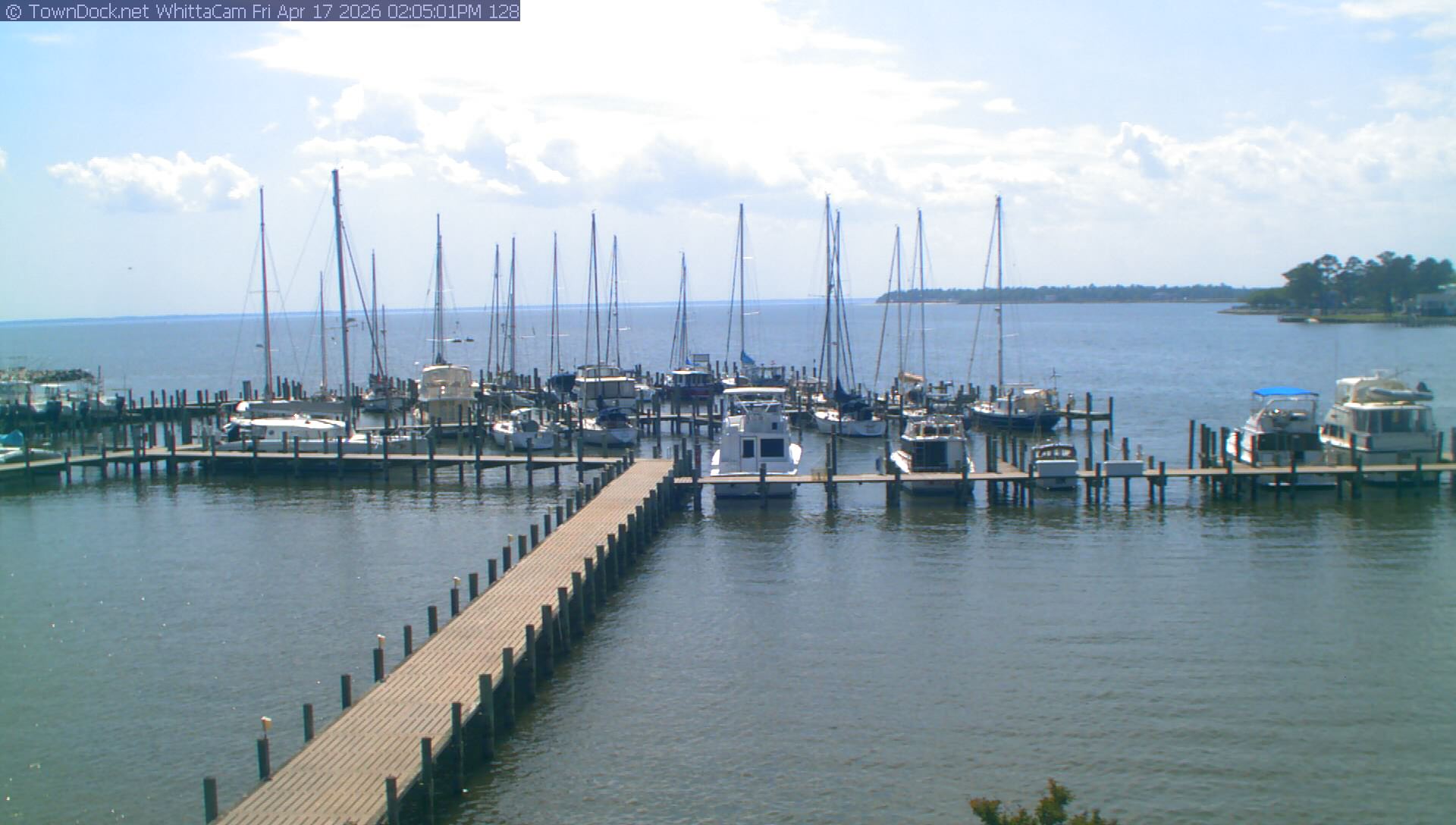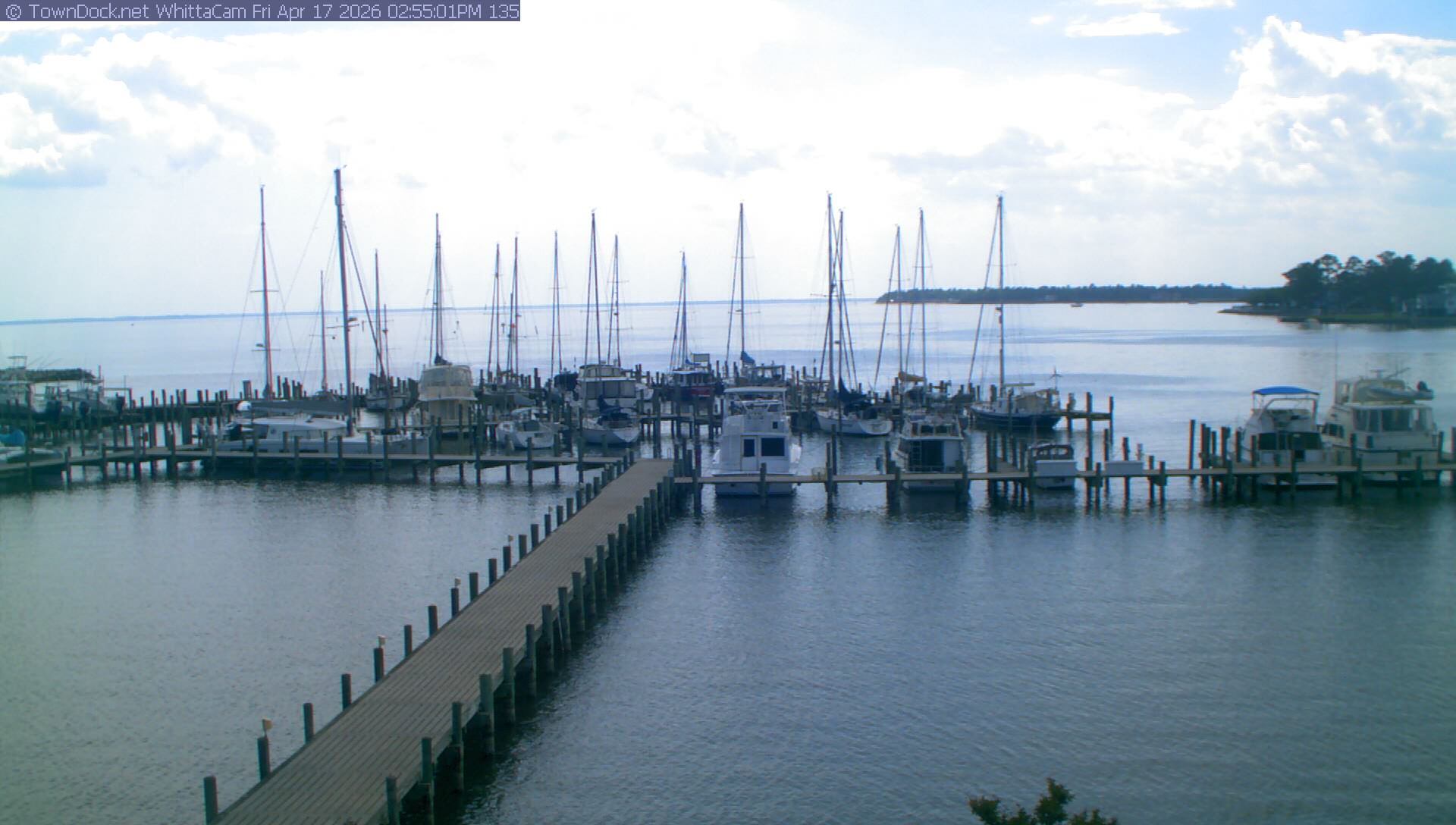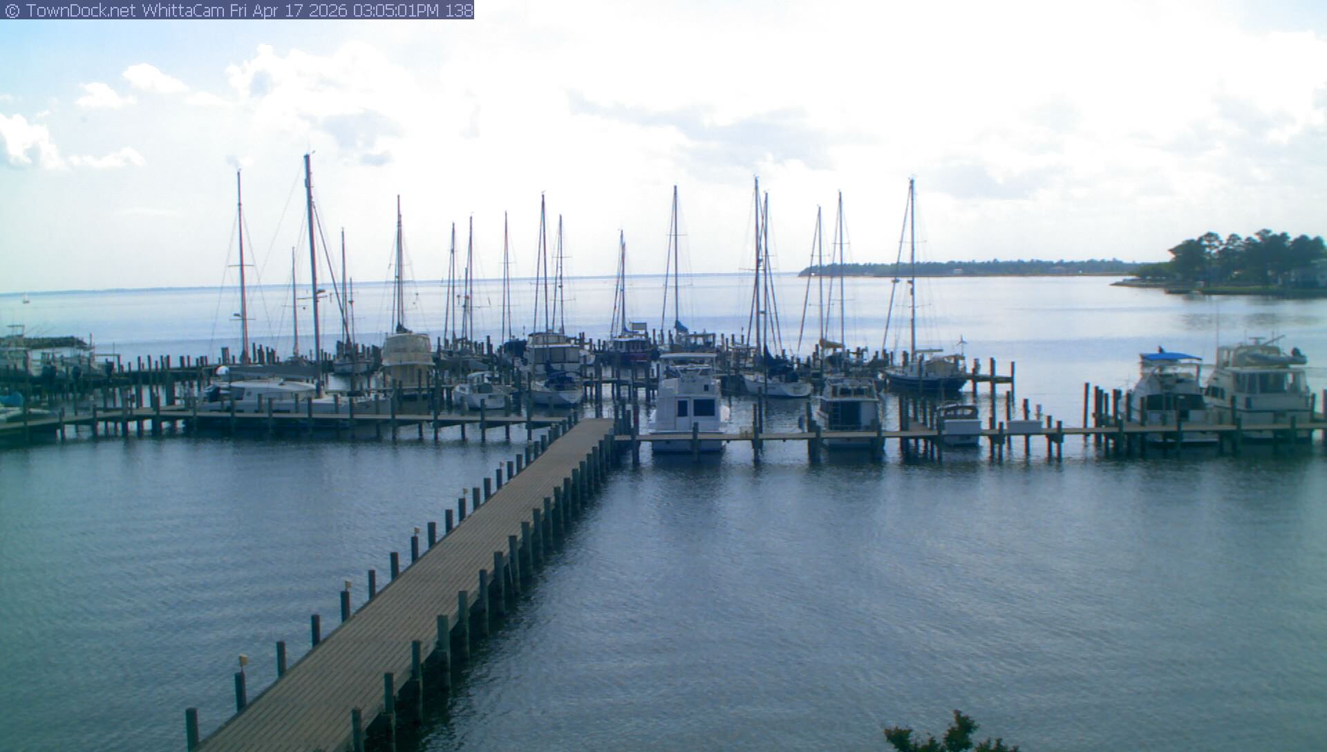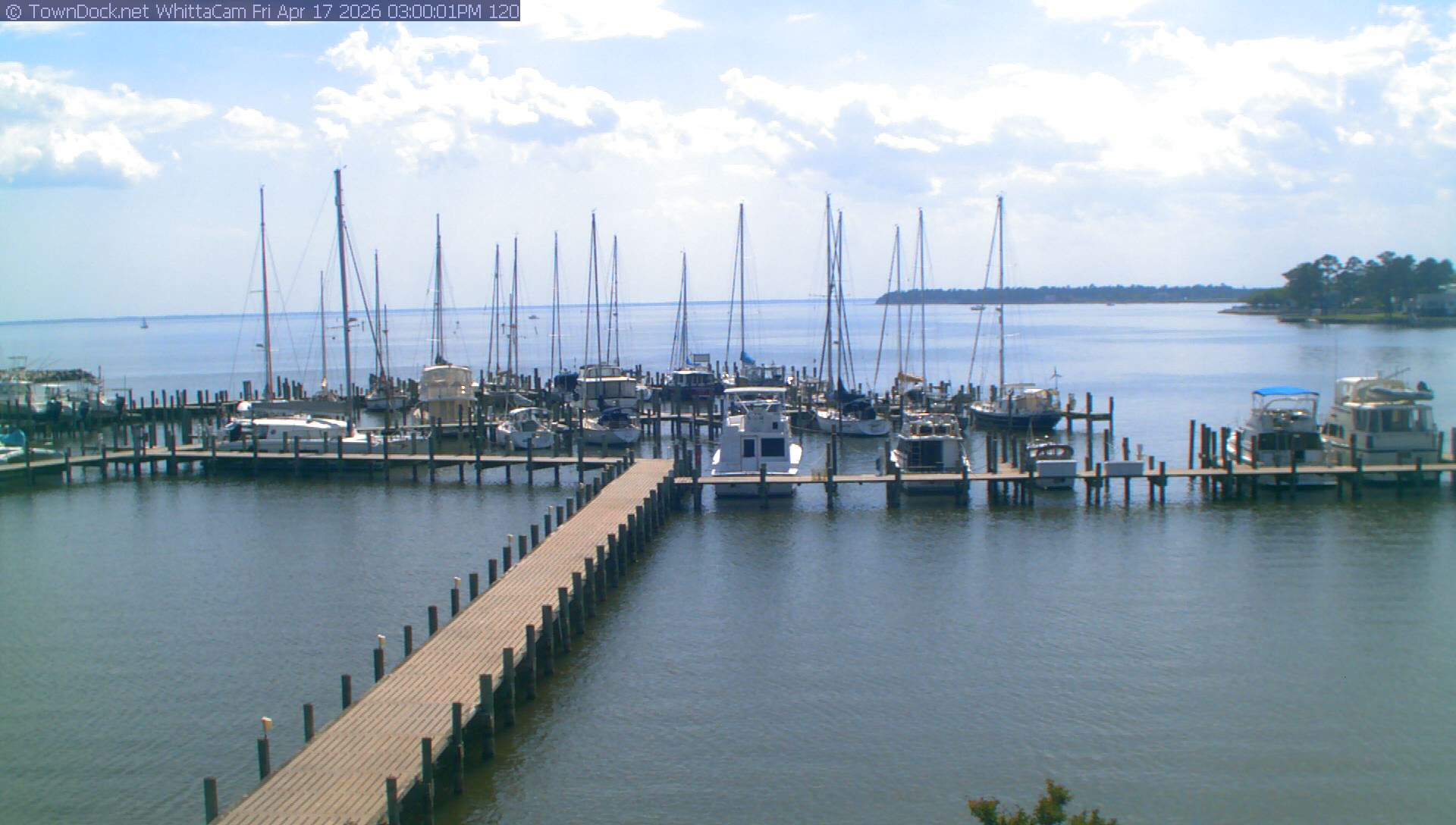 shows Whittaker Pointe Marina and the Whittaker Creek Channel entrance, with the Neuse River in the background. WhittaCam takes a new picture every five minutes from dawn til just before dusk. Click on the image to see a larger version. Once you see that larger version, you can click (see arrow at right) to go back in time and see recent photos. During the month of April, WhittaCam takes photos from 6:00a to 7:30p.