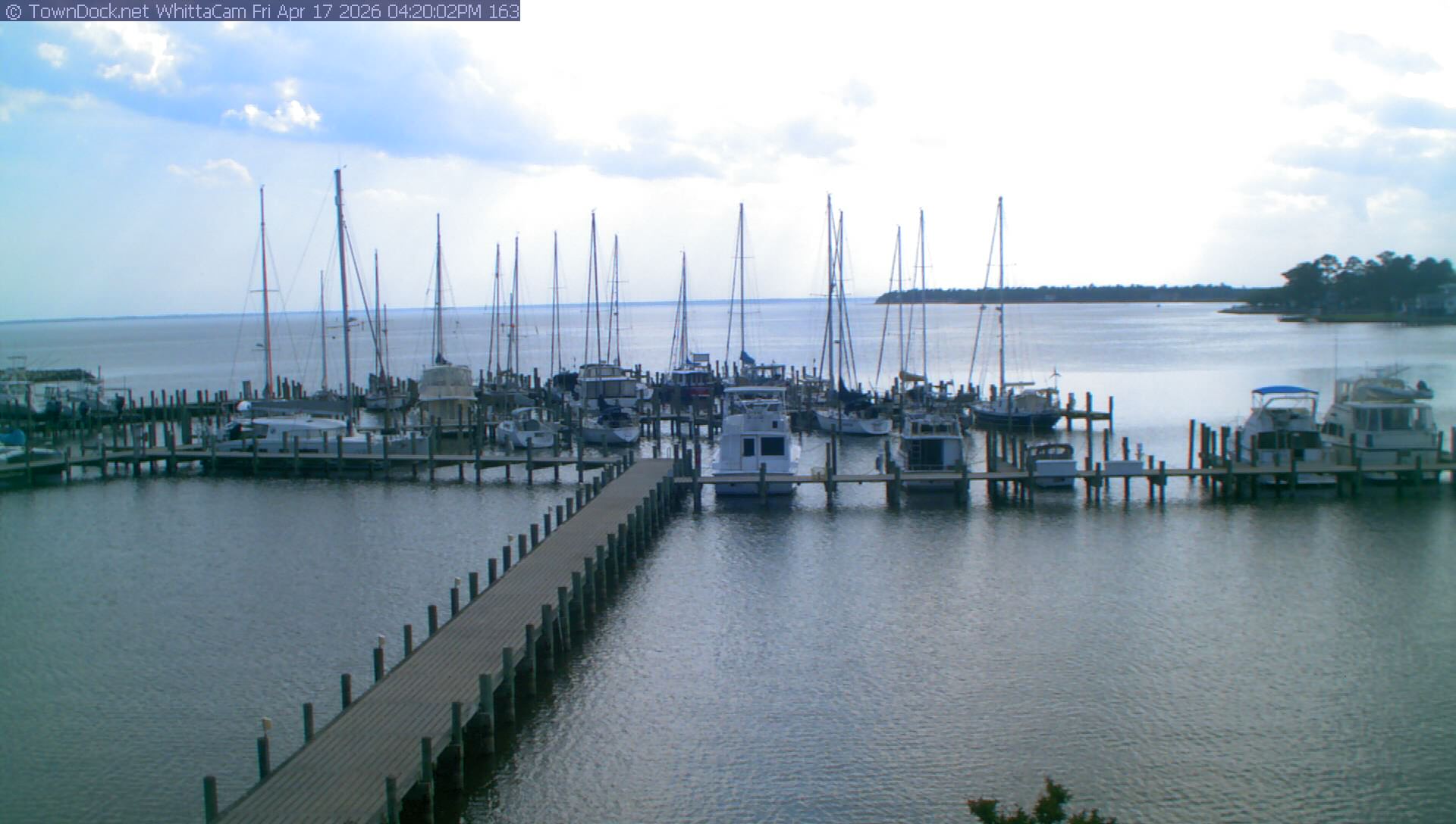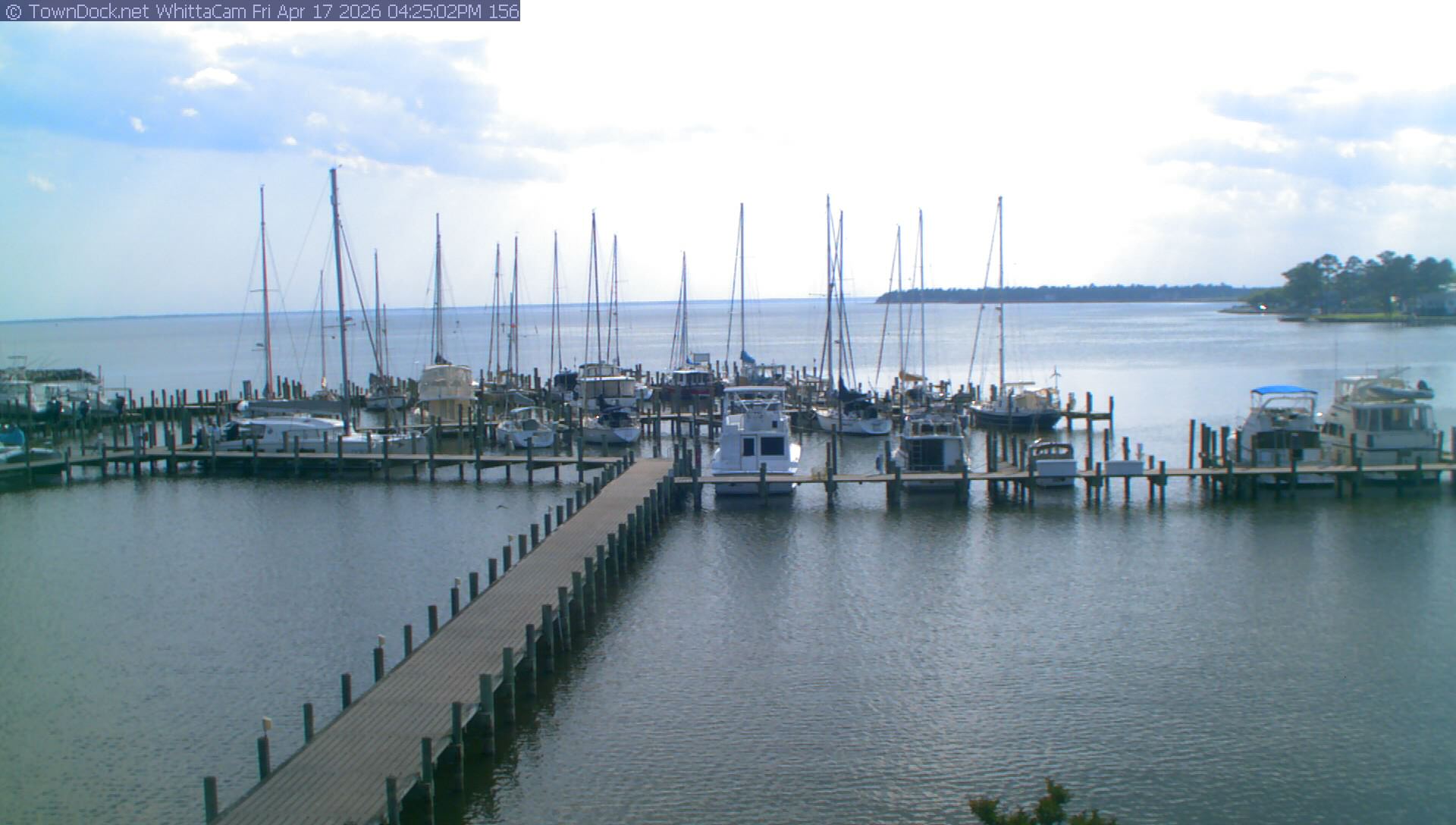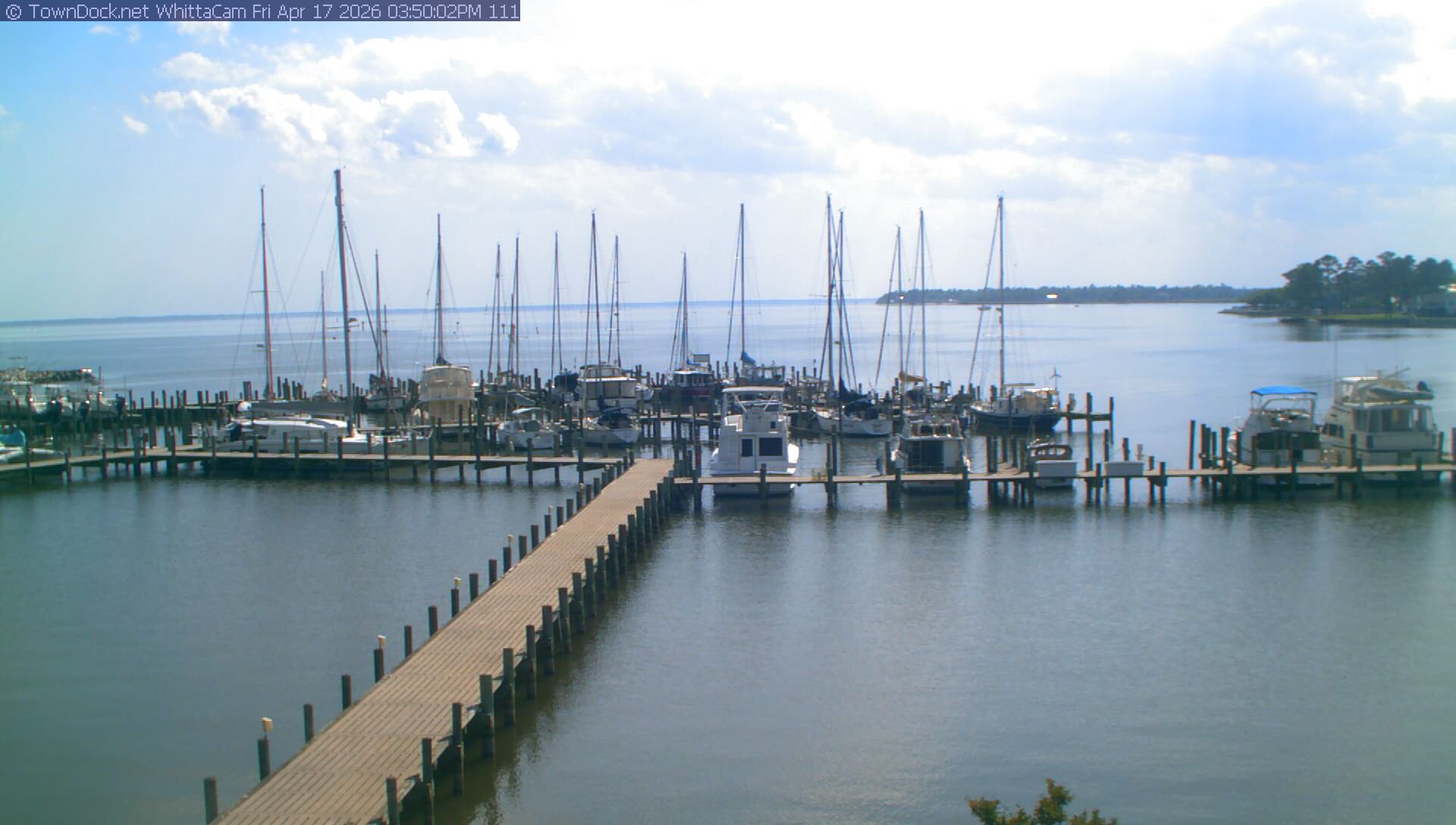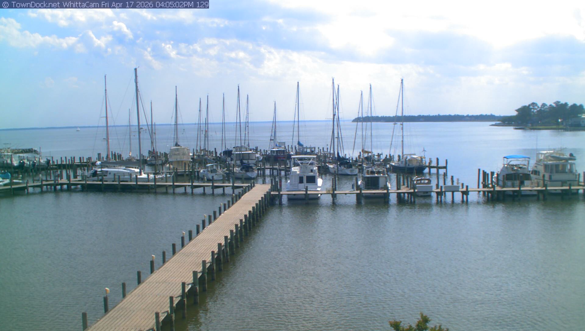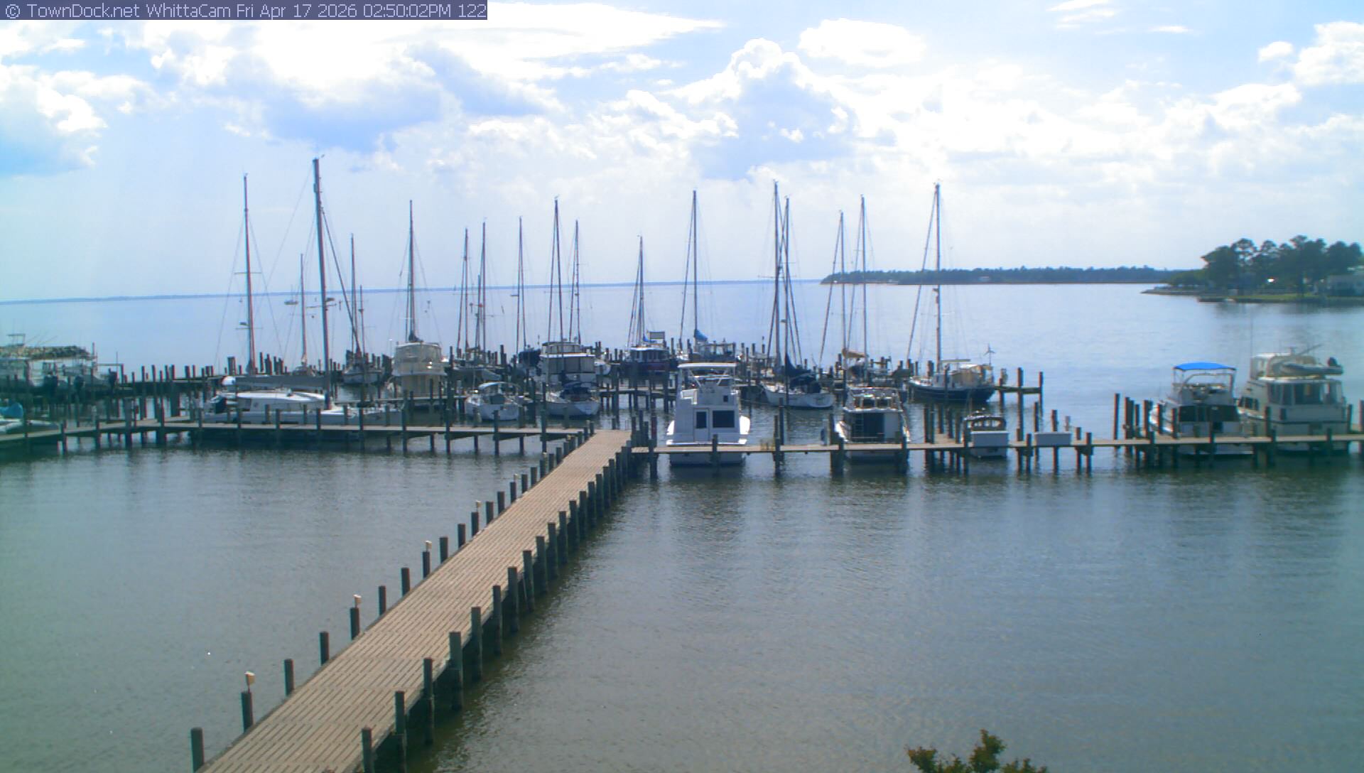 shows Whittaker Pointe Marina and the Whittaker Creek Channel entrance, with the Neuse River in the background. WhittaCam takes a new picture every five minutes from dawn til just before dusk. Click on the image to see a larger version. Once you see that larger version, you can click (see arrow at right) to go back in time and see recent photos. During the month of April, WhittaCam takes photos from 6:00a to 7:30p.