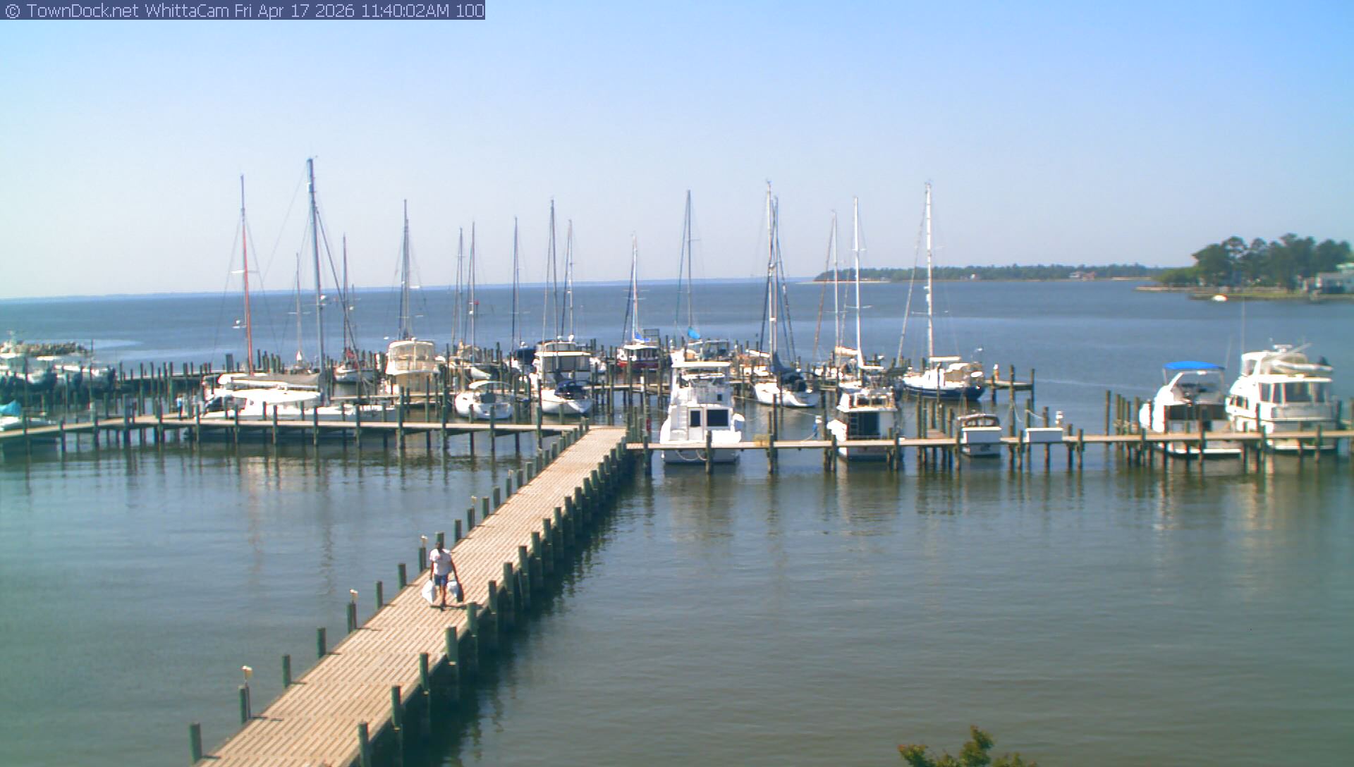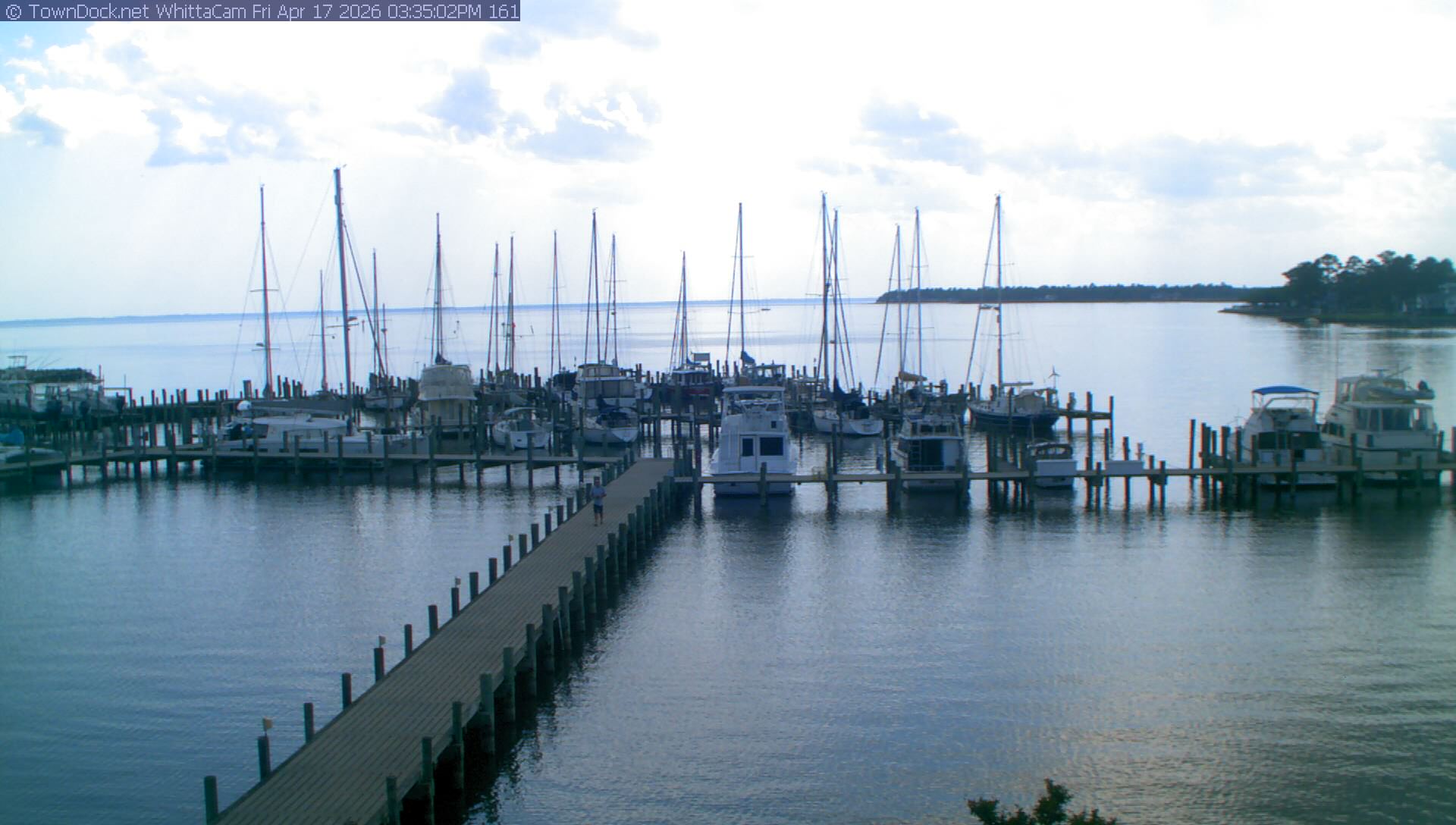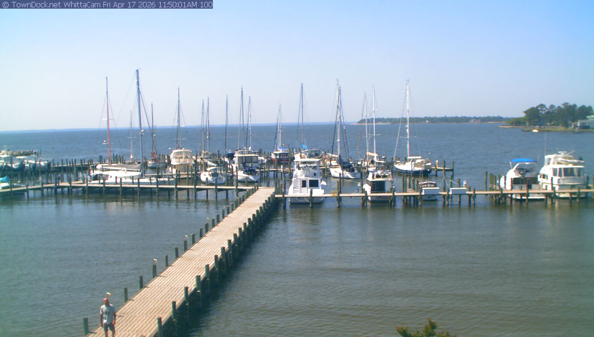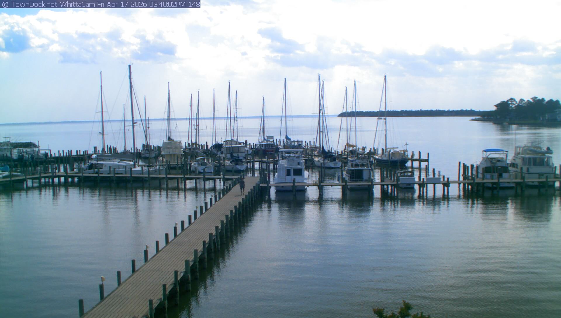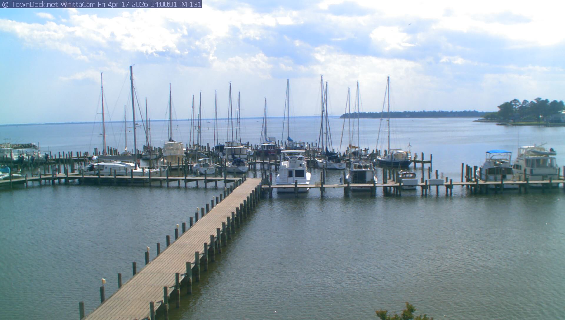 shows Whittaker Pointe Marina and the Whittaker Creek Channel entrance, with the Neuse River in the background. WhittaCam takes a new picture every five minutes from dawn til just before dusk. Click on the image to see a larger version. Once you see that larger version, you can click (see arrow at right) to go back in time and see recent photos. During the month of April, WhittaCam takes photos from 6:00a to 7:30p.
