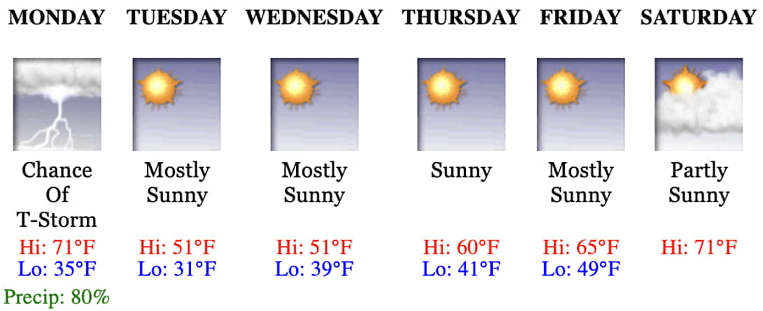 Today sunny & cooler, highs just near 60, Saturday 70.