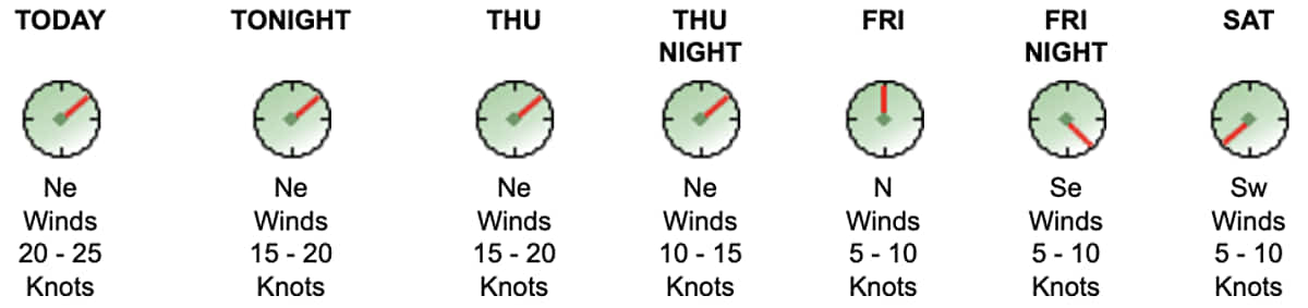 6:25a This morning awakens to northeast winds, with a 20-25 knot forecast on the Neuse. A Small Craft Advisory is in effect through Thursday morning.
